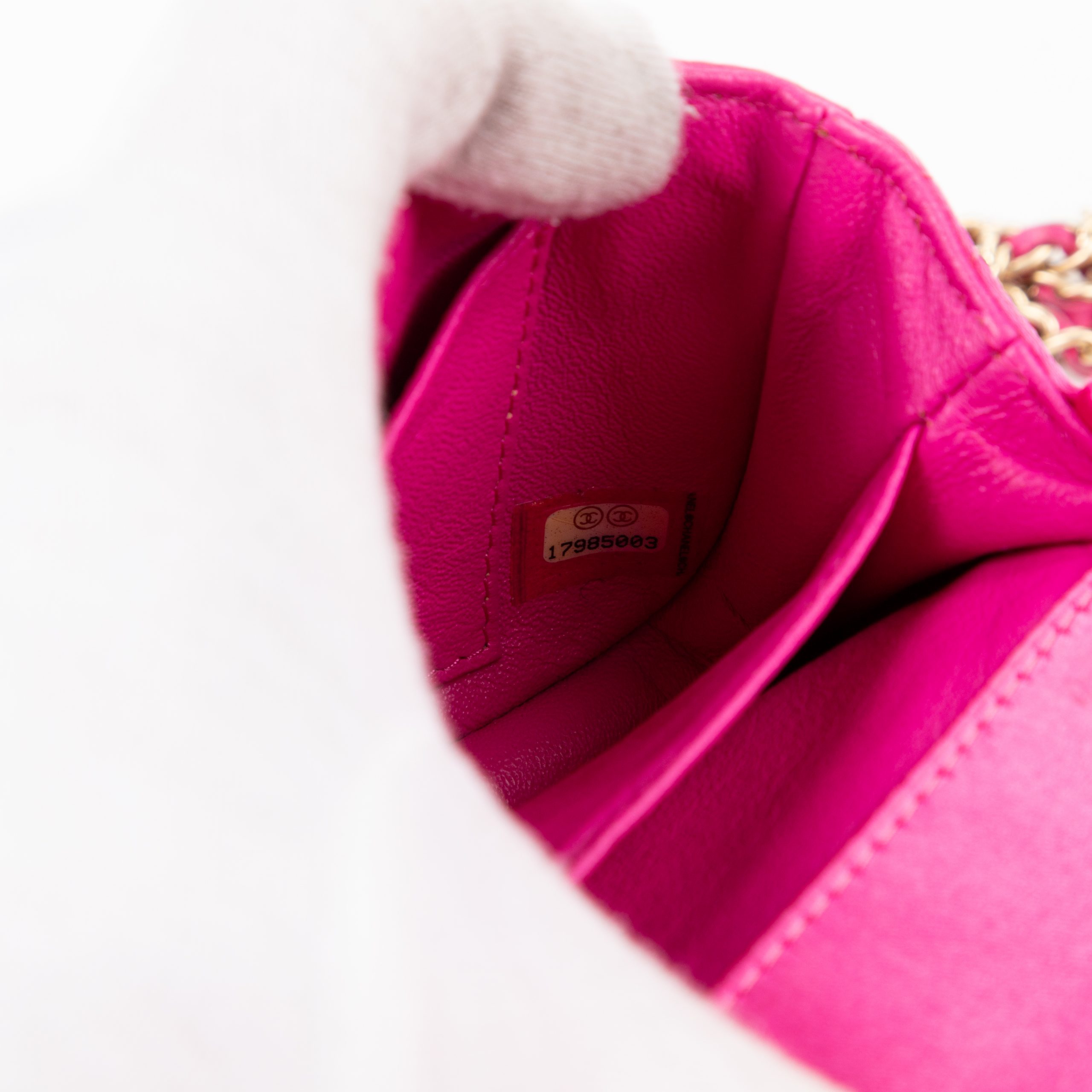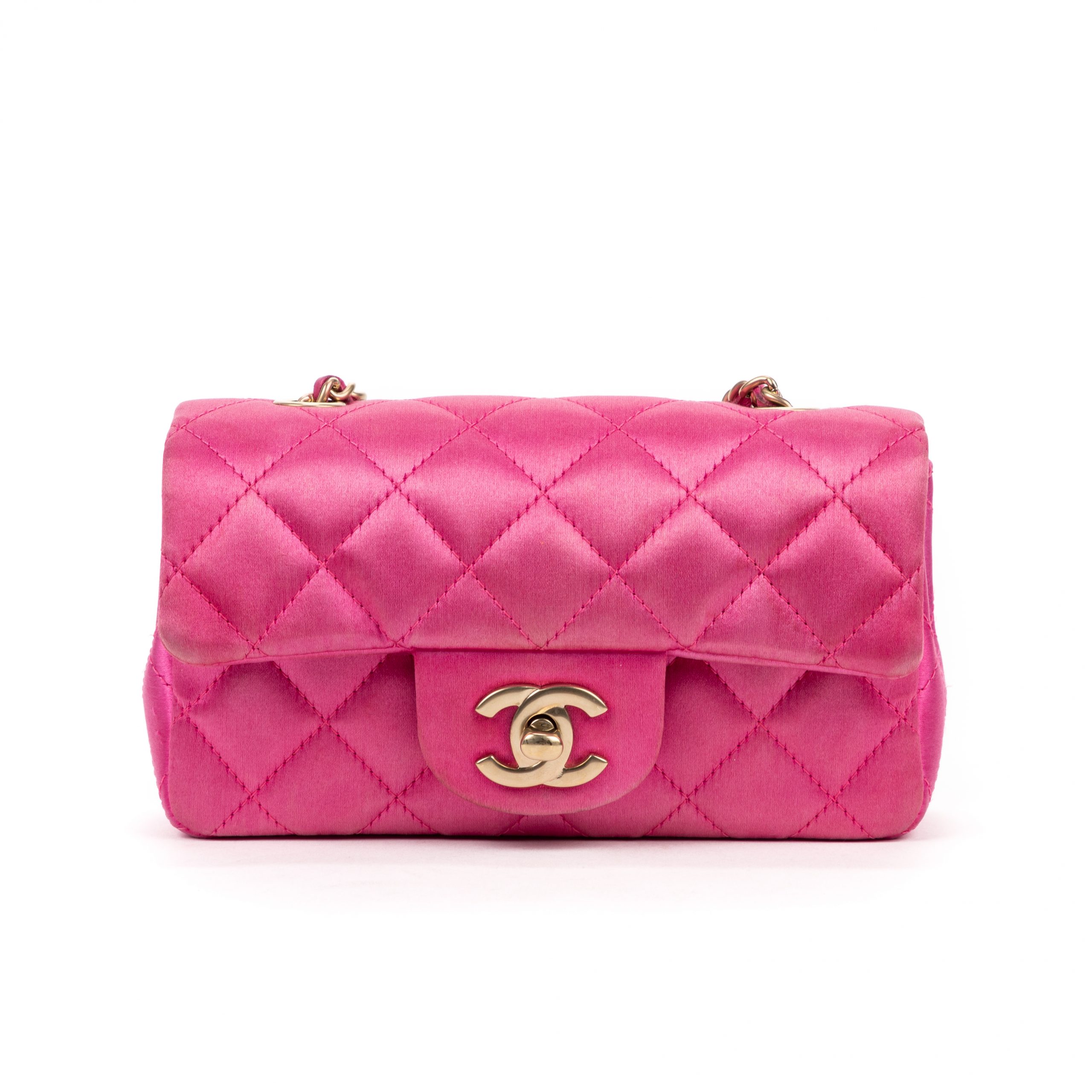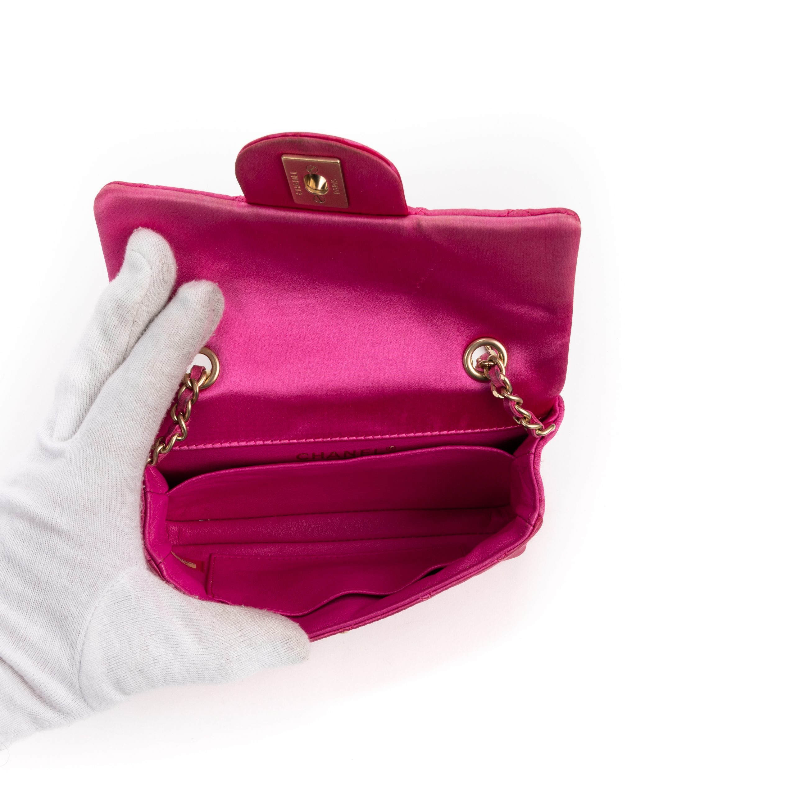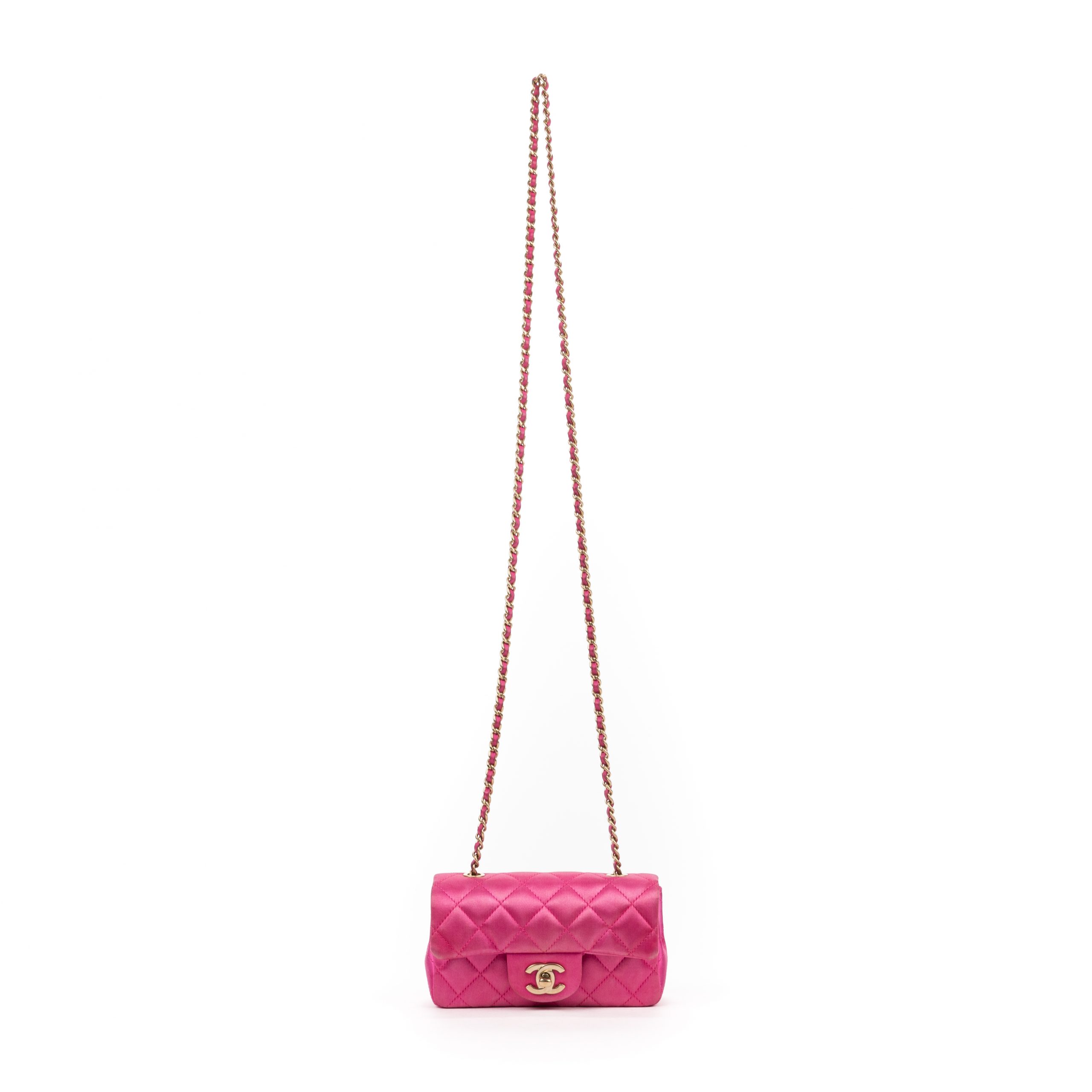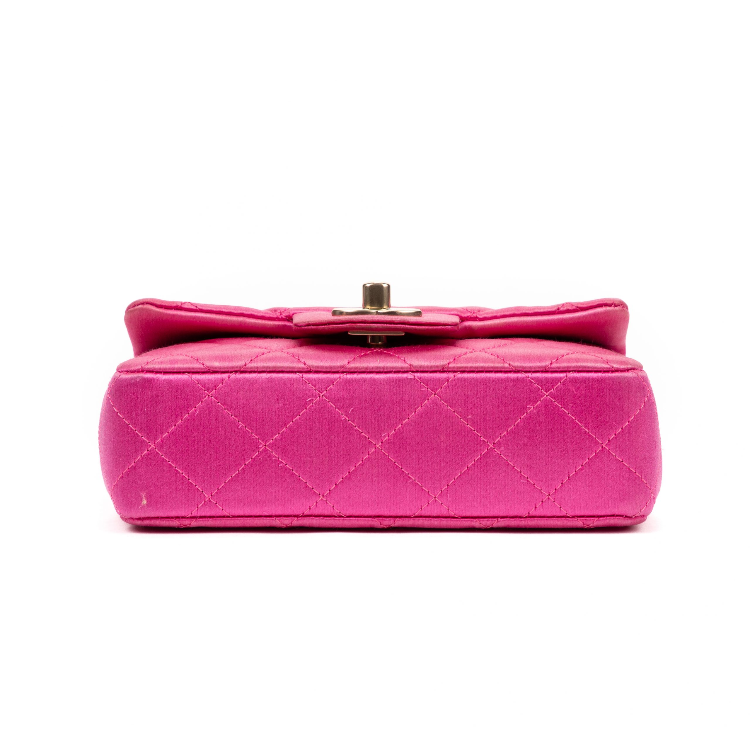 Chanel Shoulder Bag Classic Flap Extra Mini in Pink Satin Canvas and Gold hardware. The product is in Perfect Condition (AA).