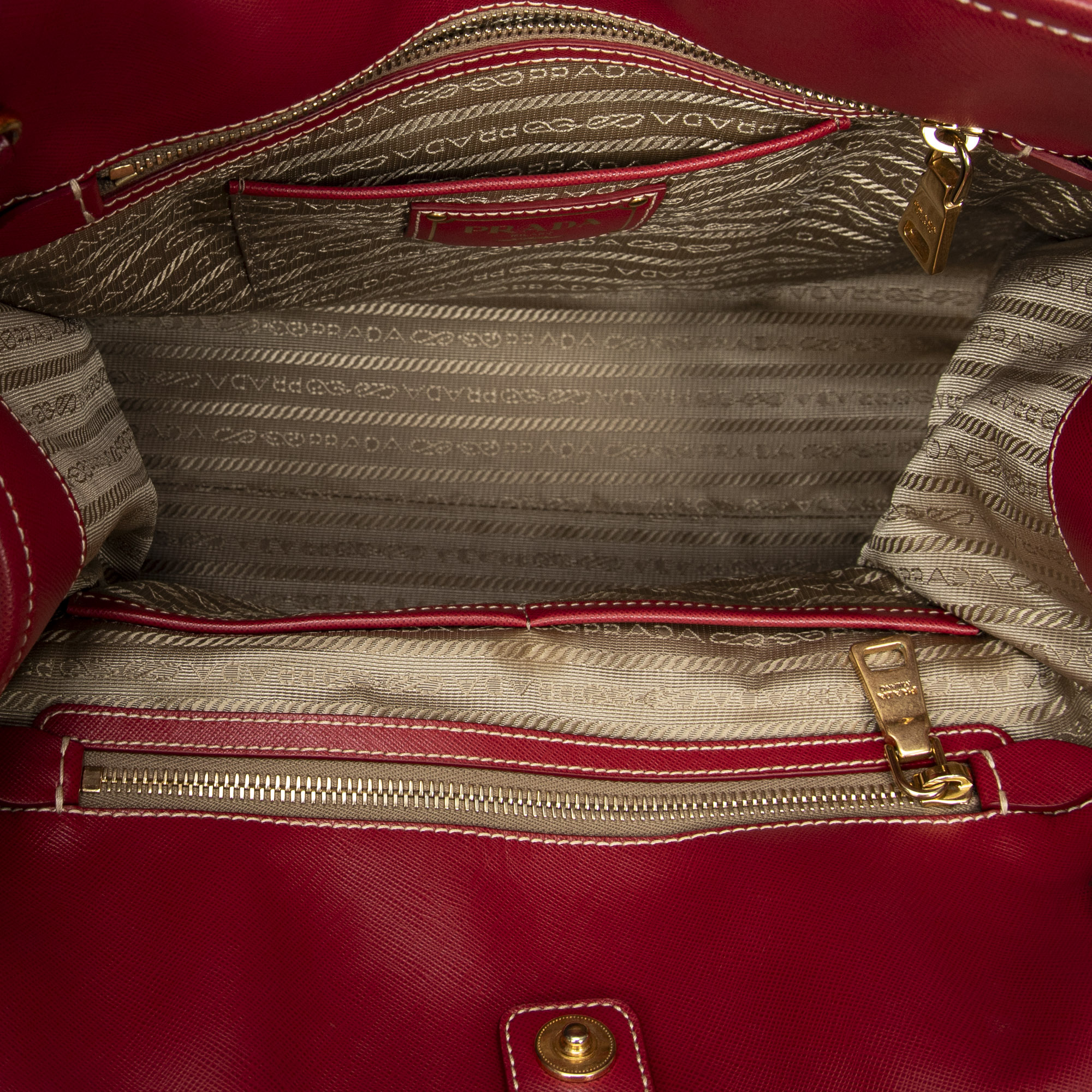 Prada Shoulder Bag Convertible Jacquard Logo Tote in Khaki/Red Jacquard Canvas and Gold hardware. The product is in Excellent Condition (A).
