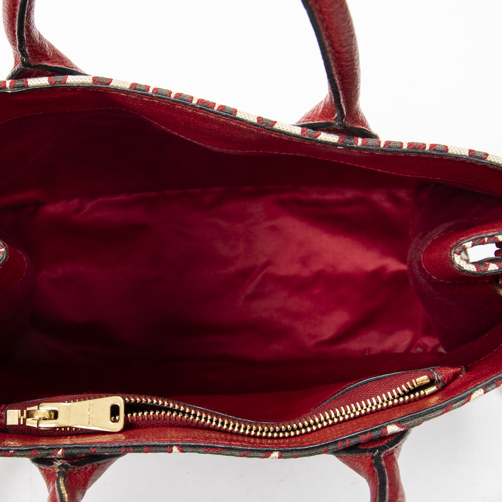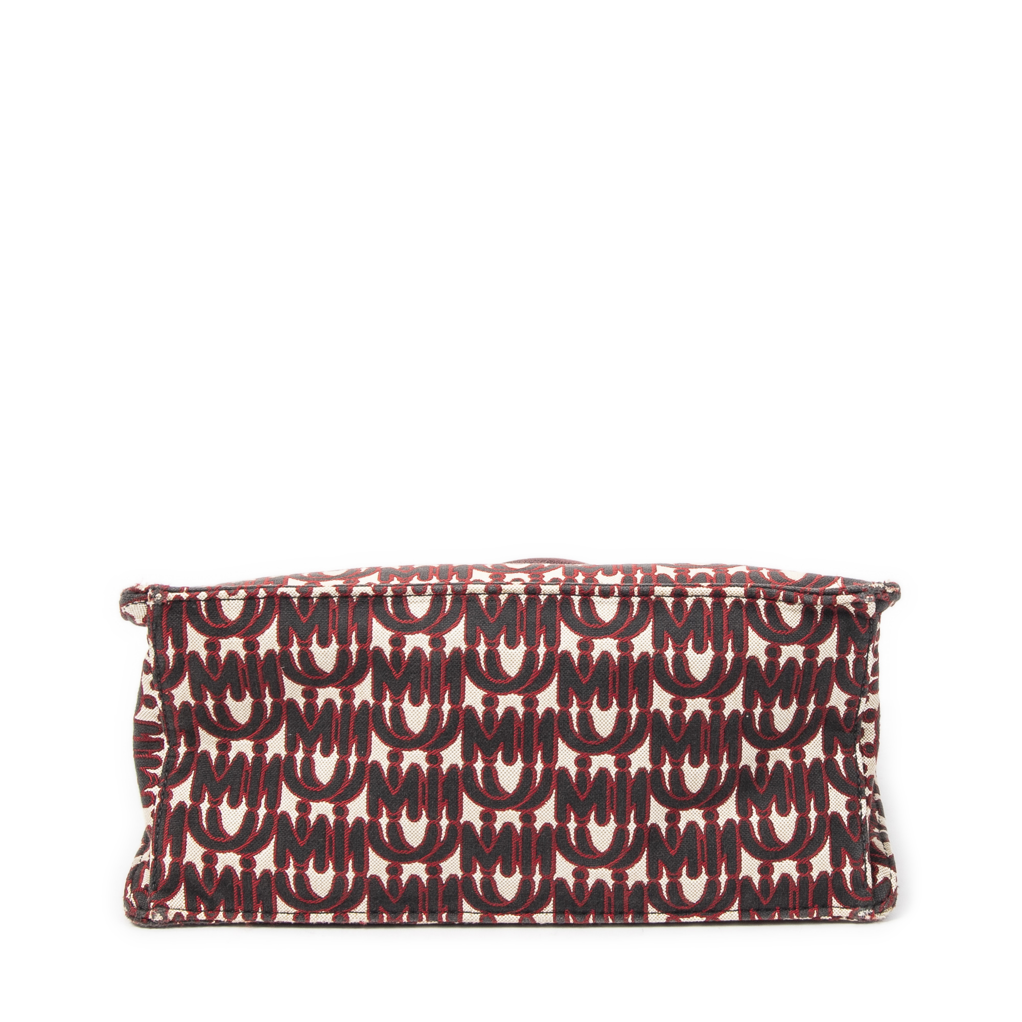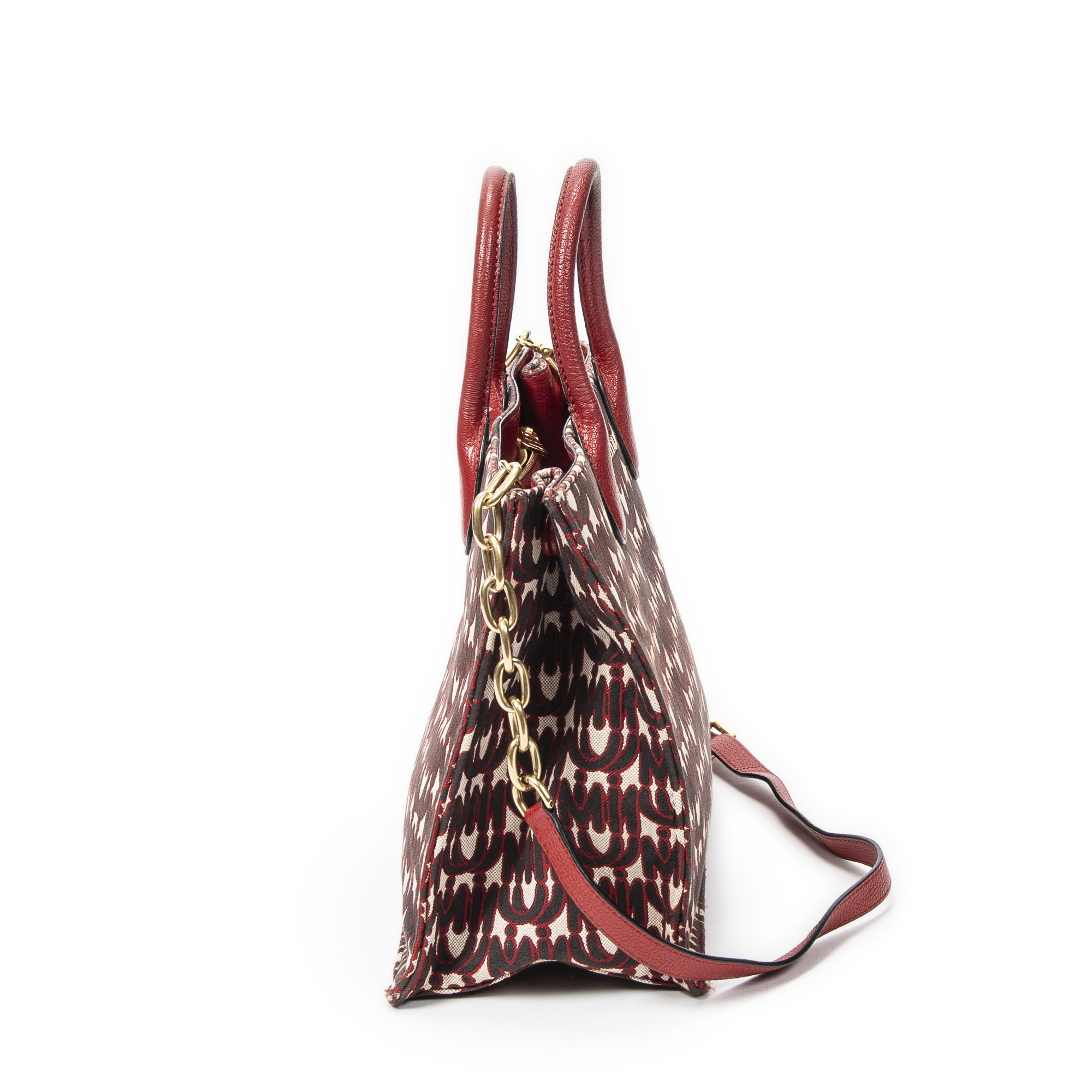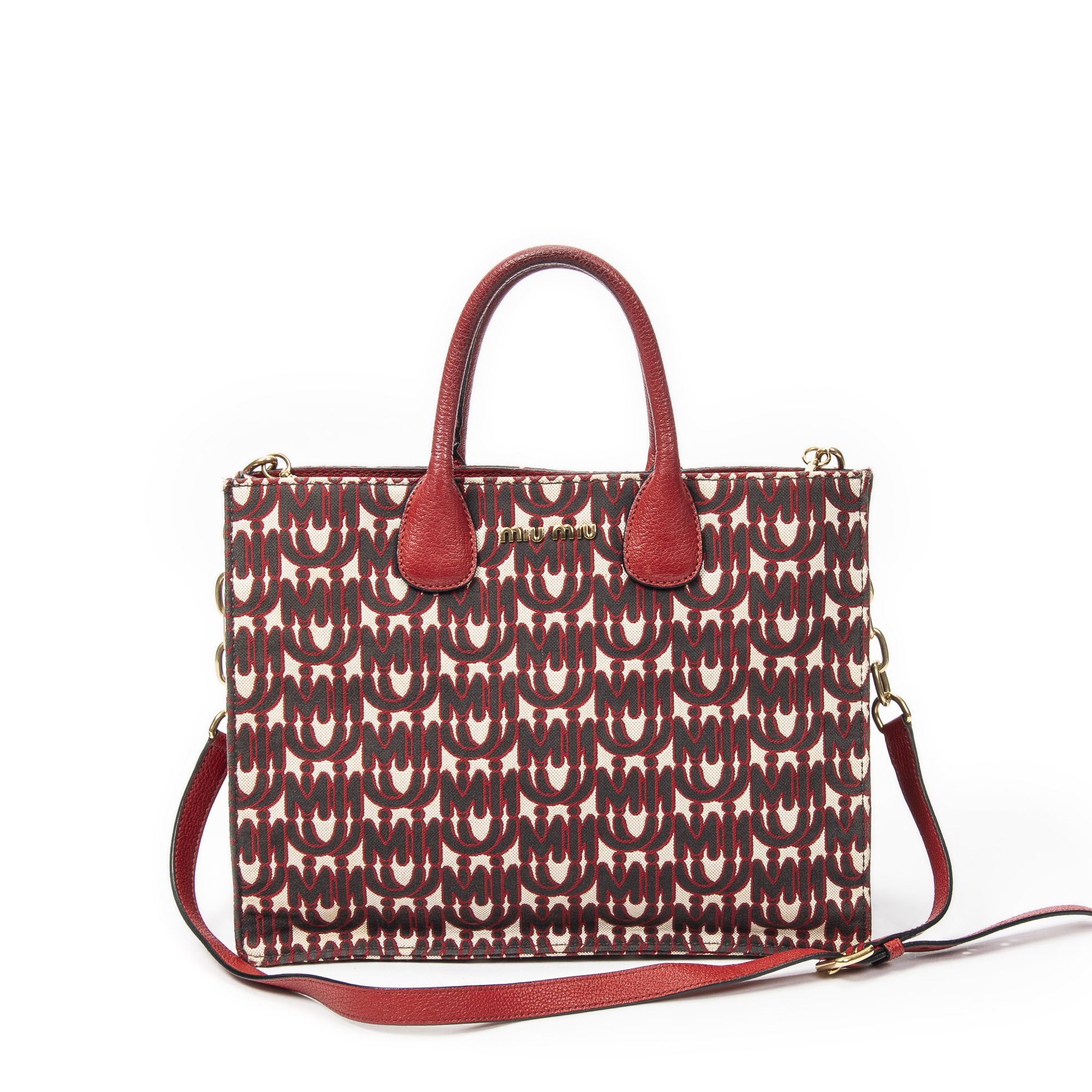 Miu Miu Shoulder Bag Convertible Jacquard Tote in Red Jacquard Logo Canvas and Gold hardware. The product is in Very Good Condition (AB).