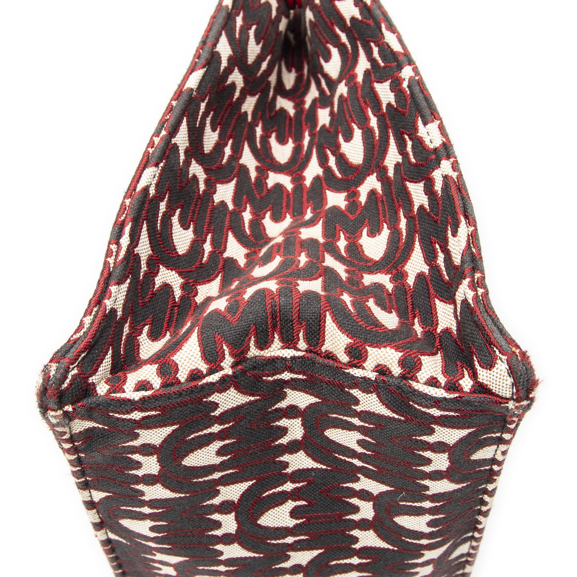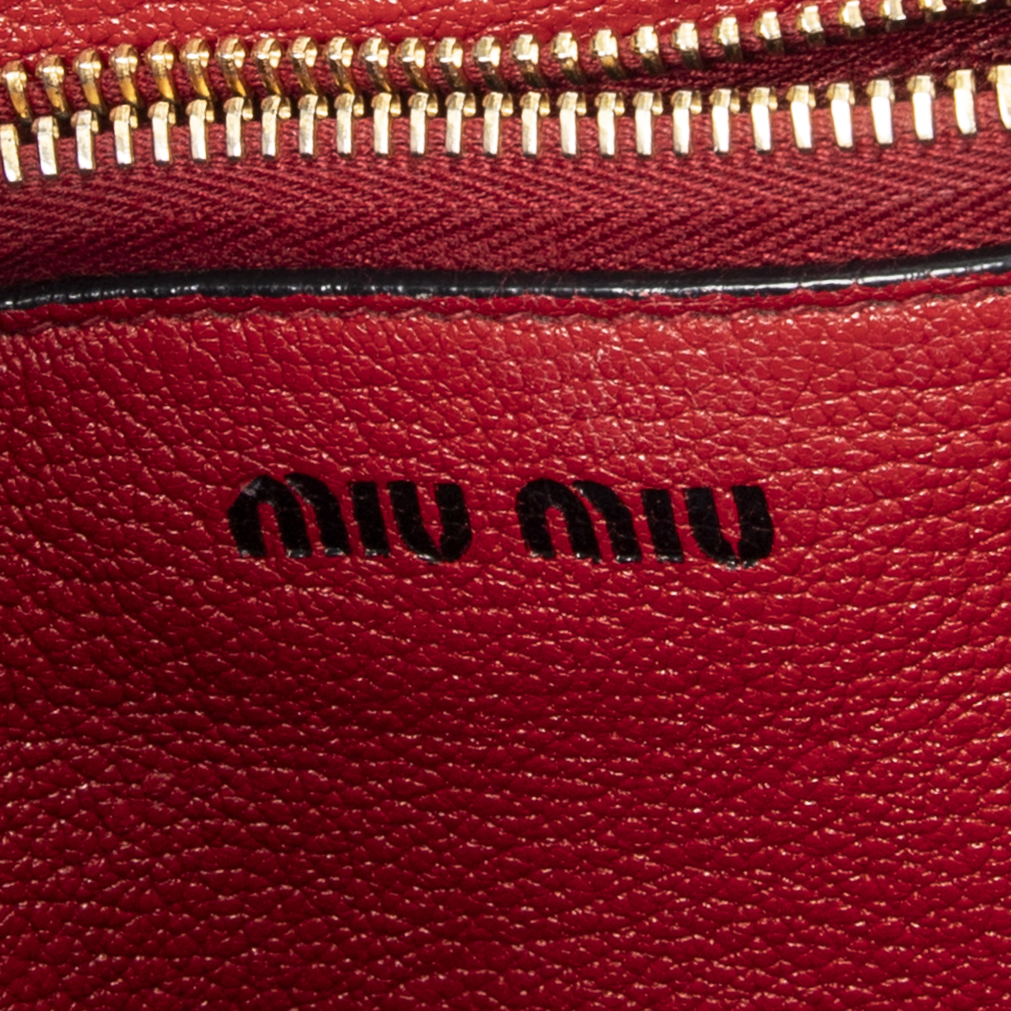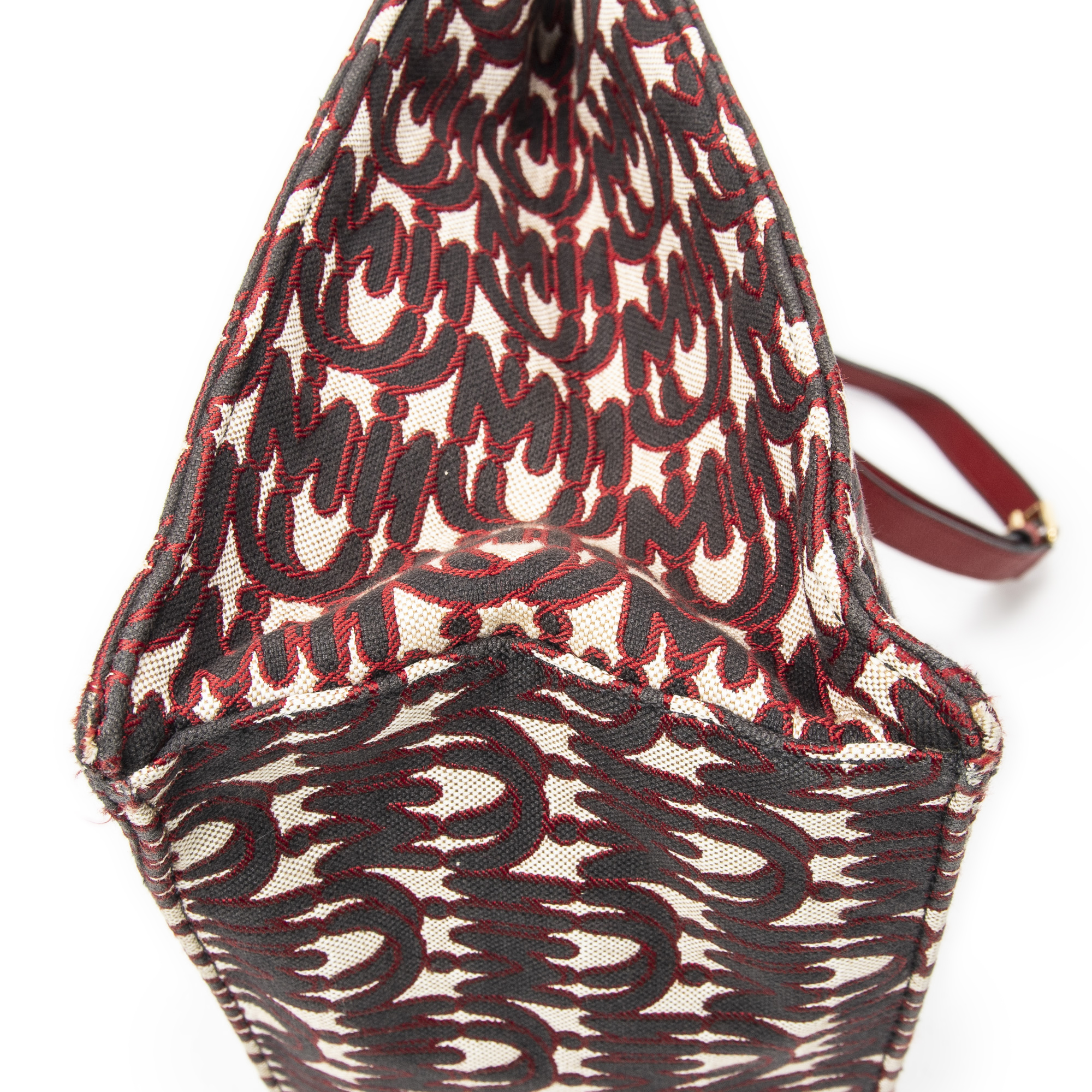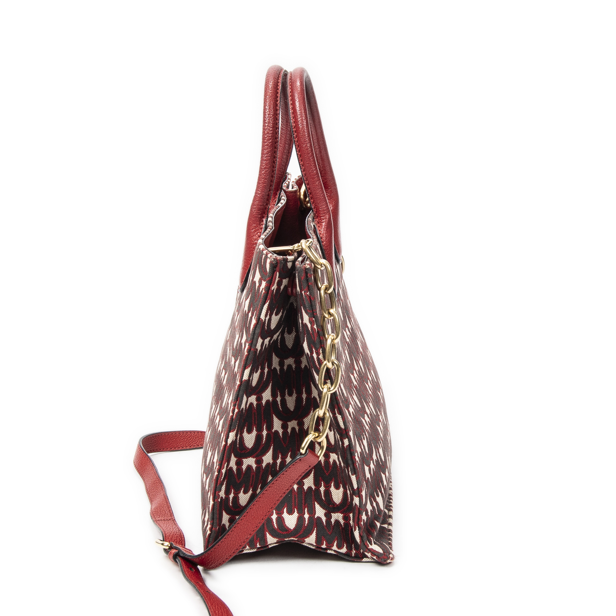 Miu Miu Shoulder Bag Convertible Jacquard Tote in Red Jacquard Logo Canvas and Gold hardware. The product is in Very Good Condition (AB).