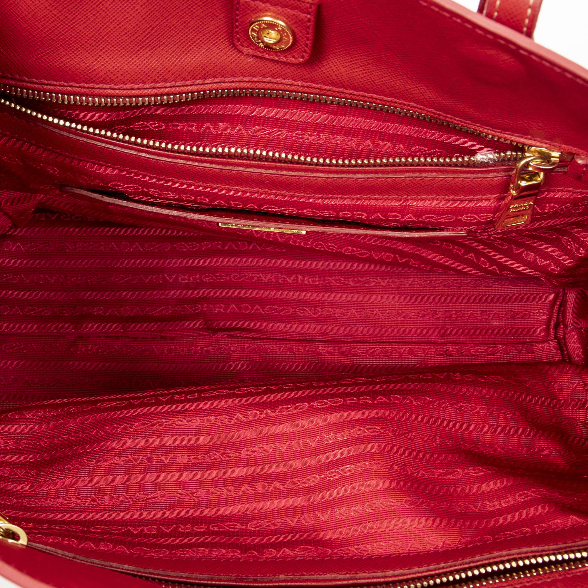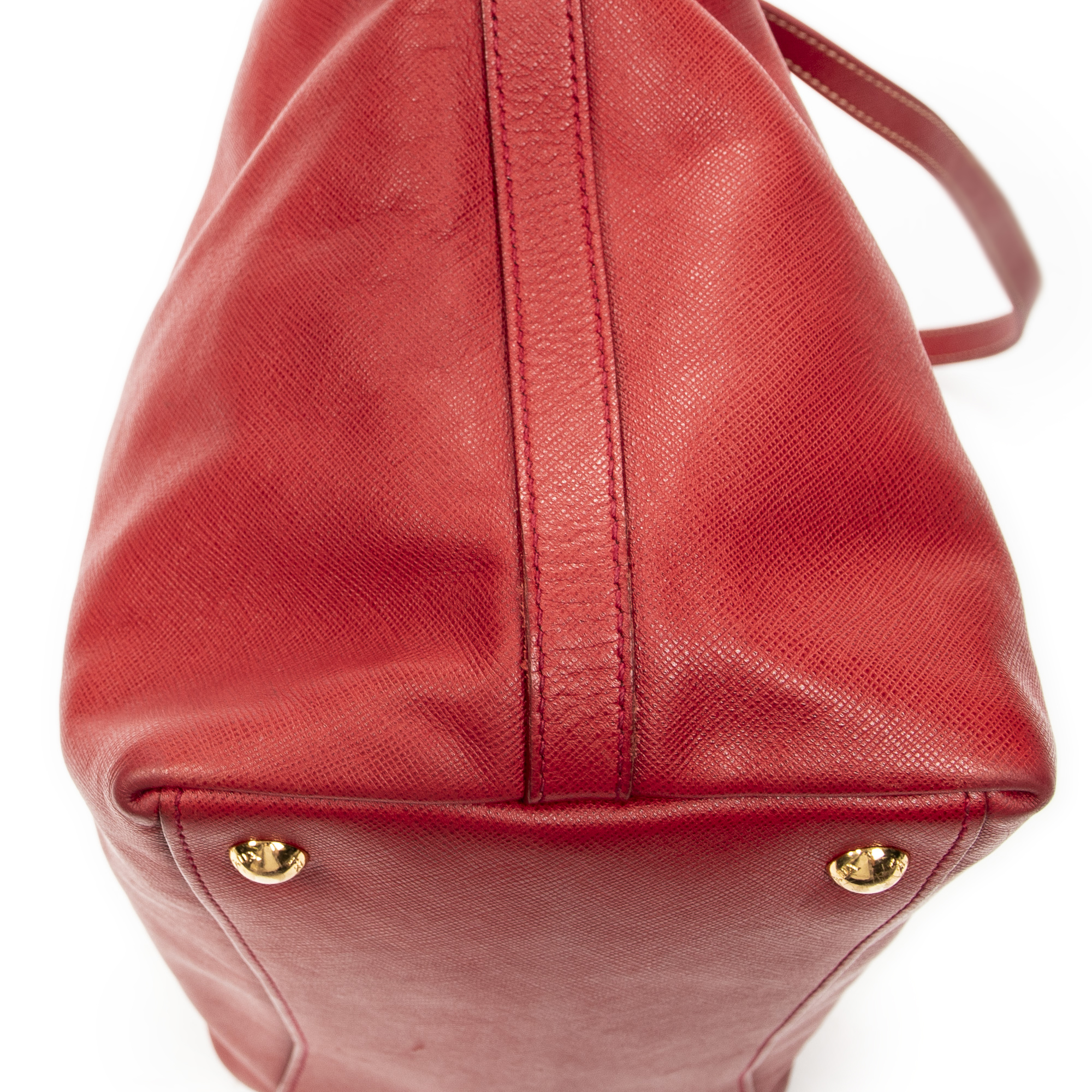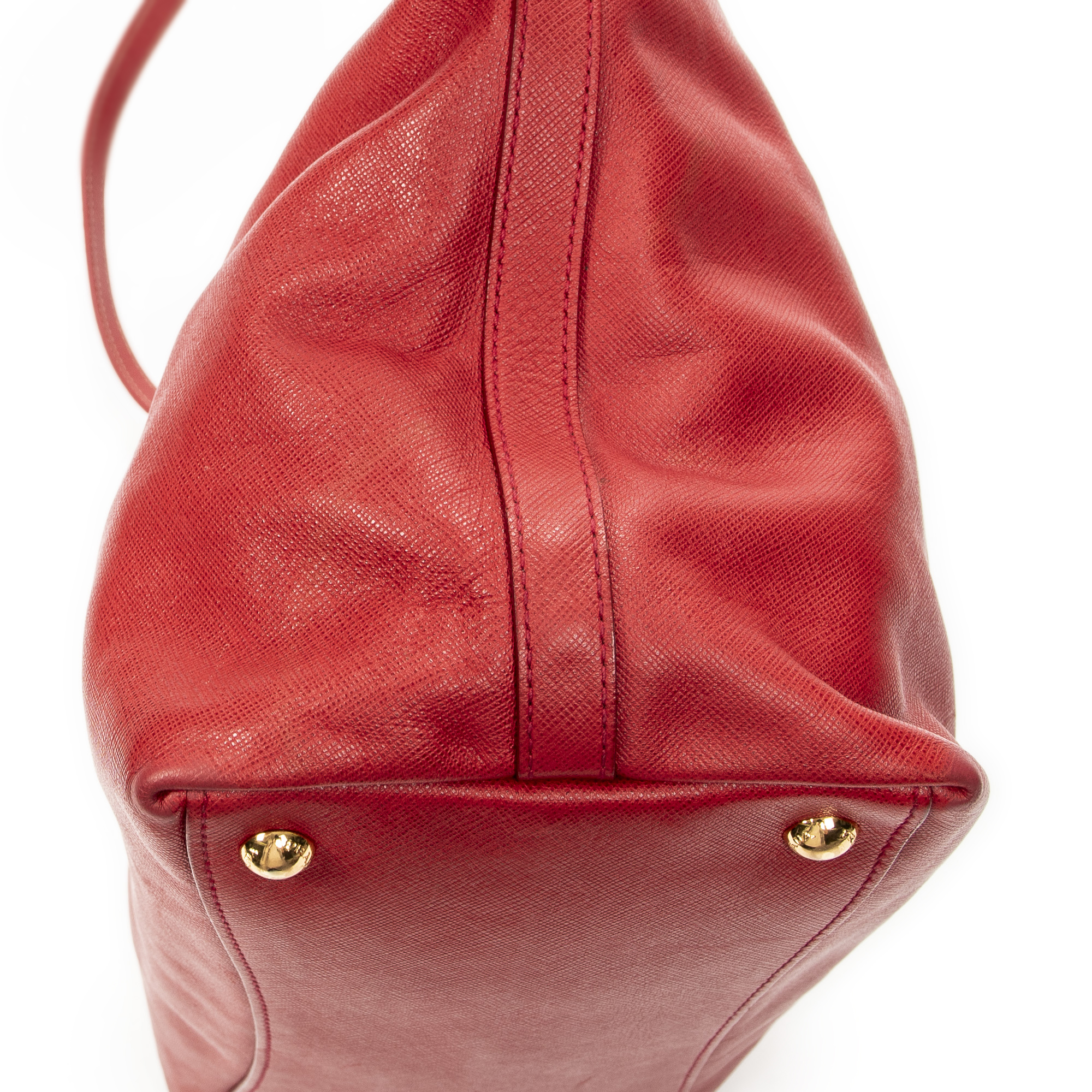 Prada Shoulder Bag Convertible Open Shopping Tote in Red Saffiano Leather and Gold hardware. The product is in Very Good Condition (AB).