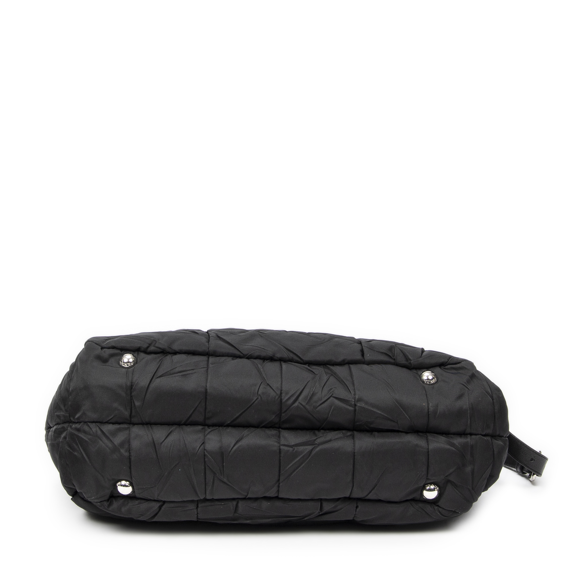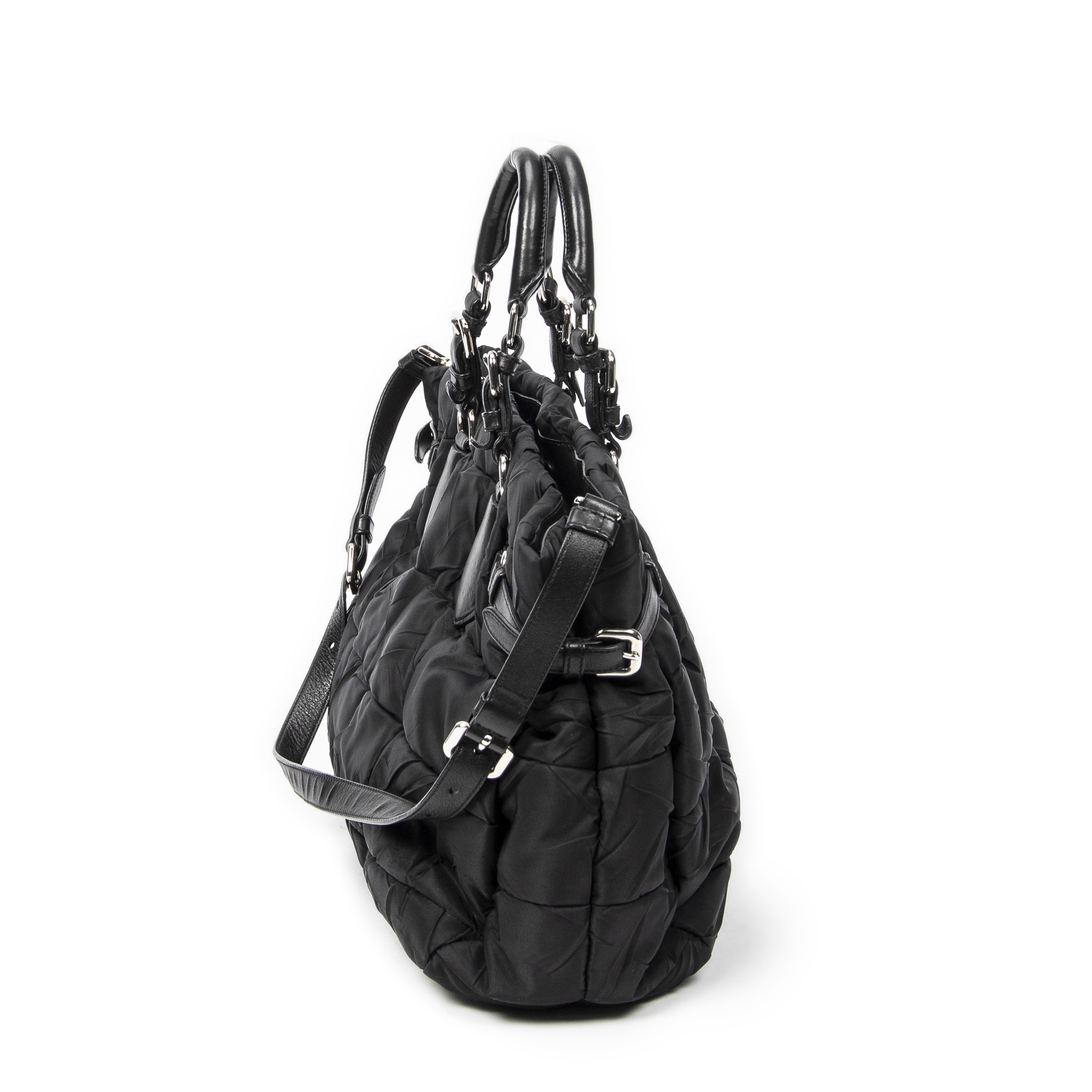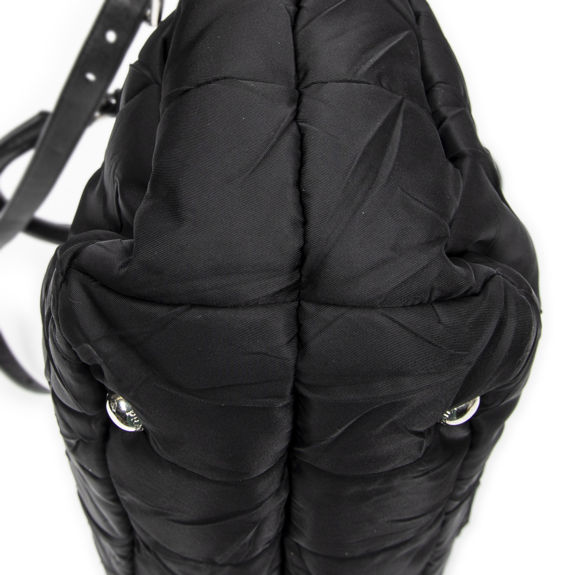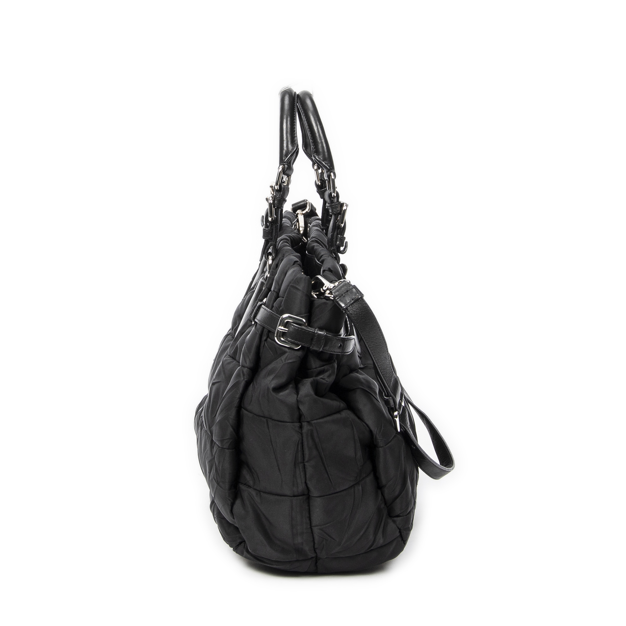 Prada Shoulder Bag Convertible Shopper Tote in Black Quilted Nylon Canvas and Silver hardware. The product is in Excellent Condition (A).