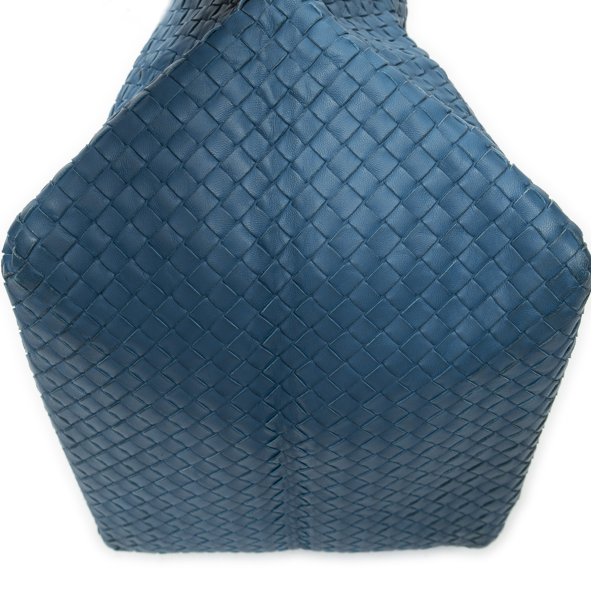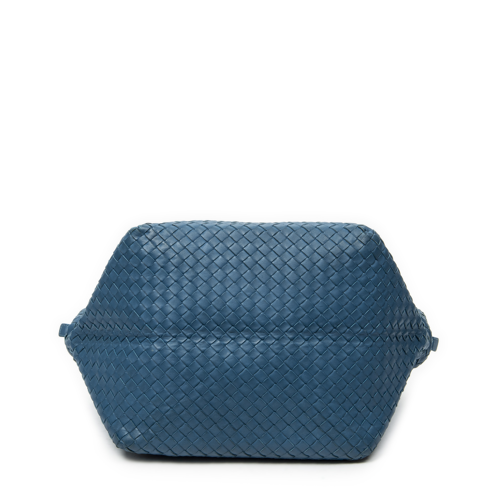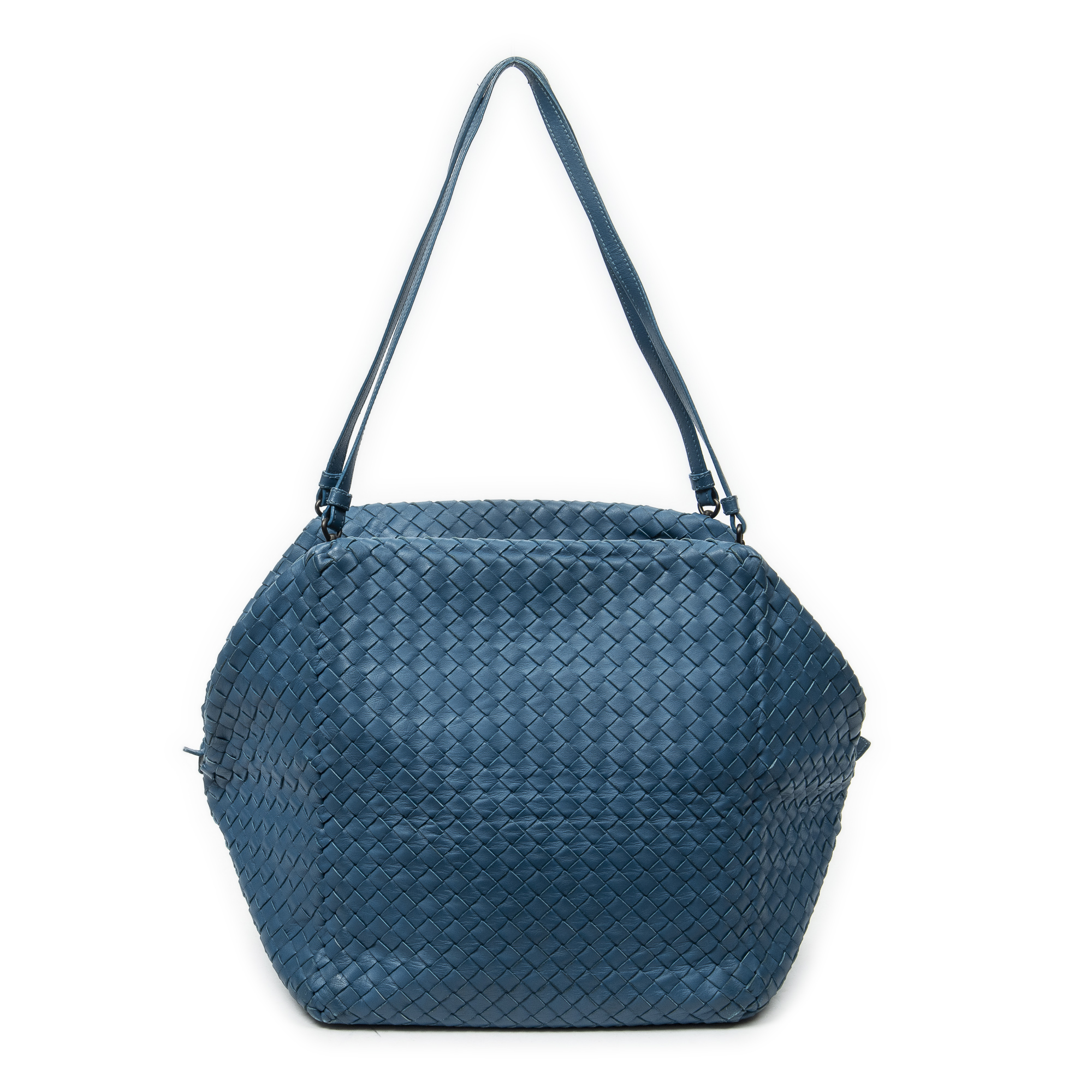 Bottega Veneta Shoulder Bag Cube Shoulder Bag in Blue Intrecciato Leather and Aged Brass hardware. The product is in Very Good Condition (AB).