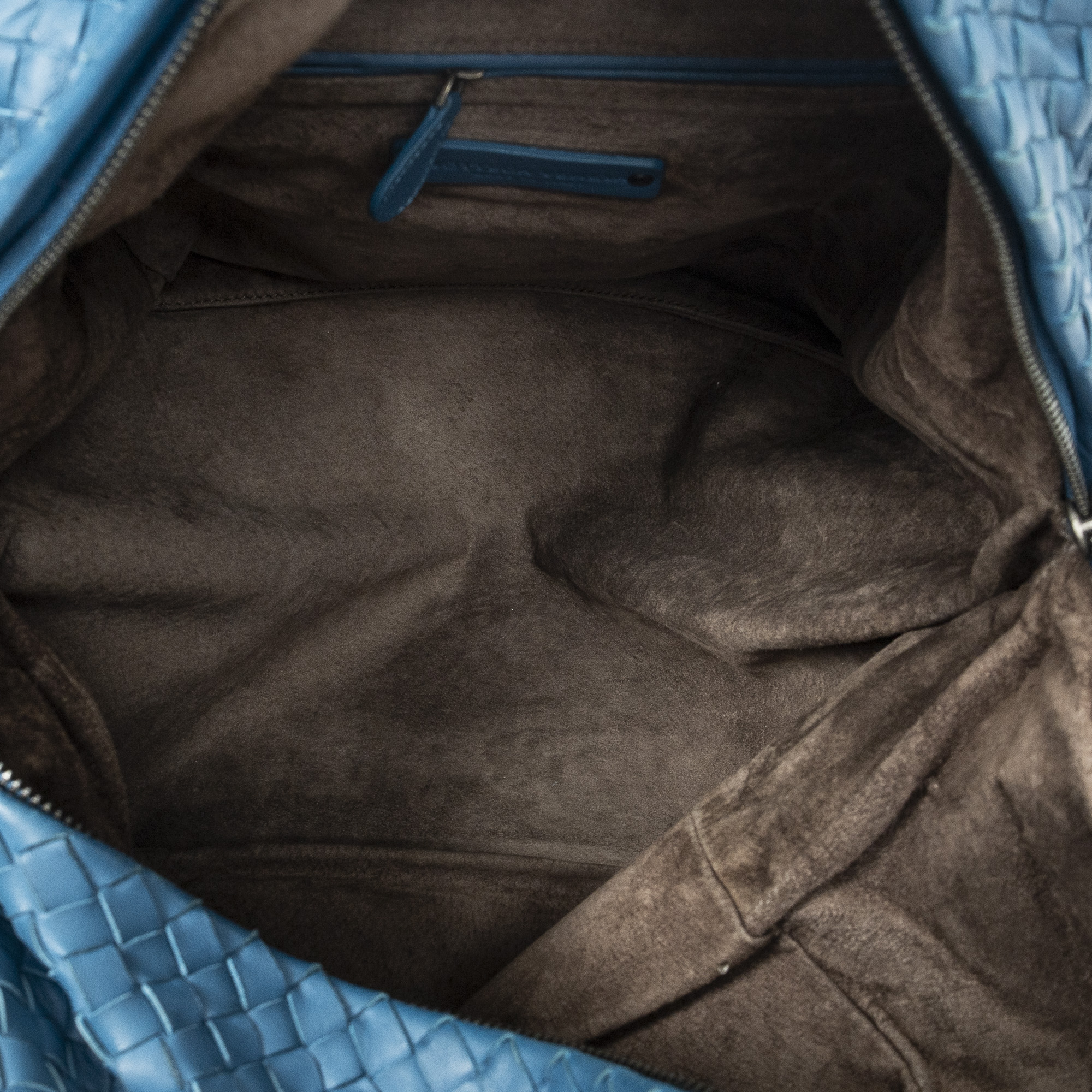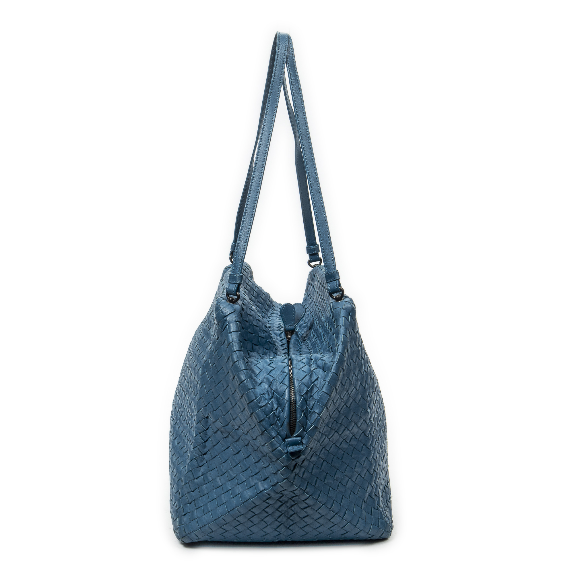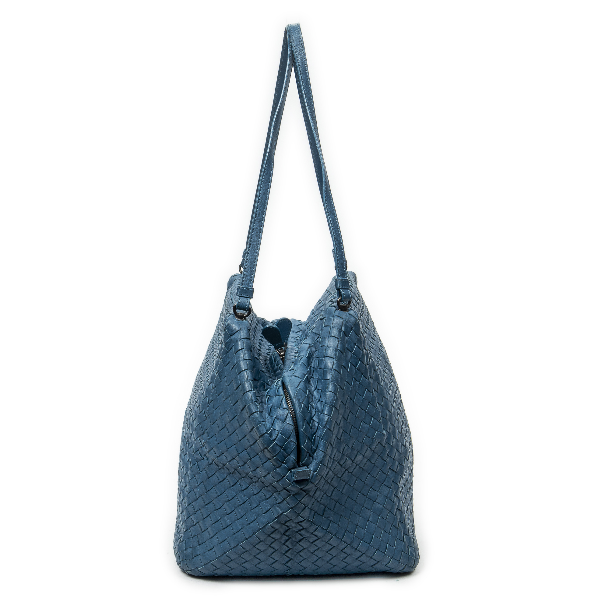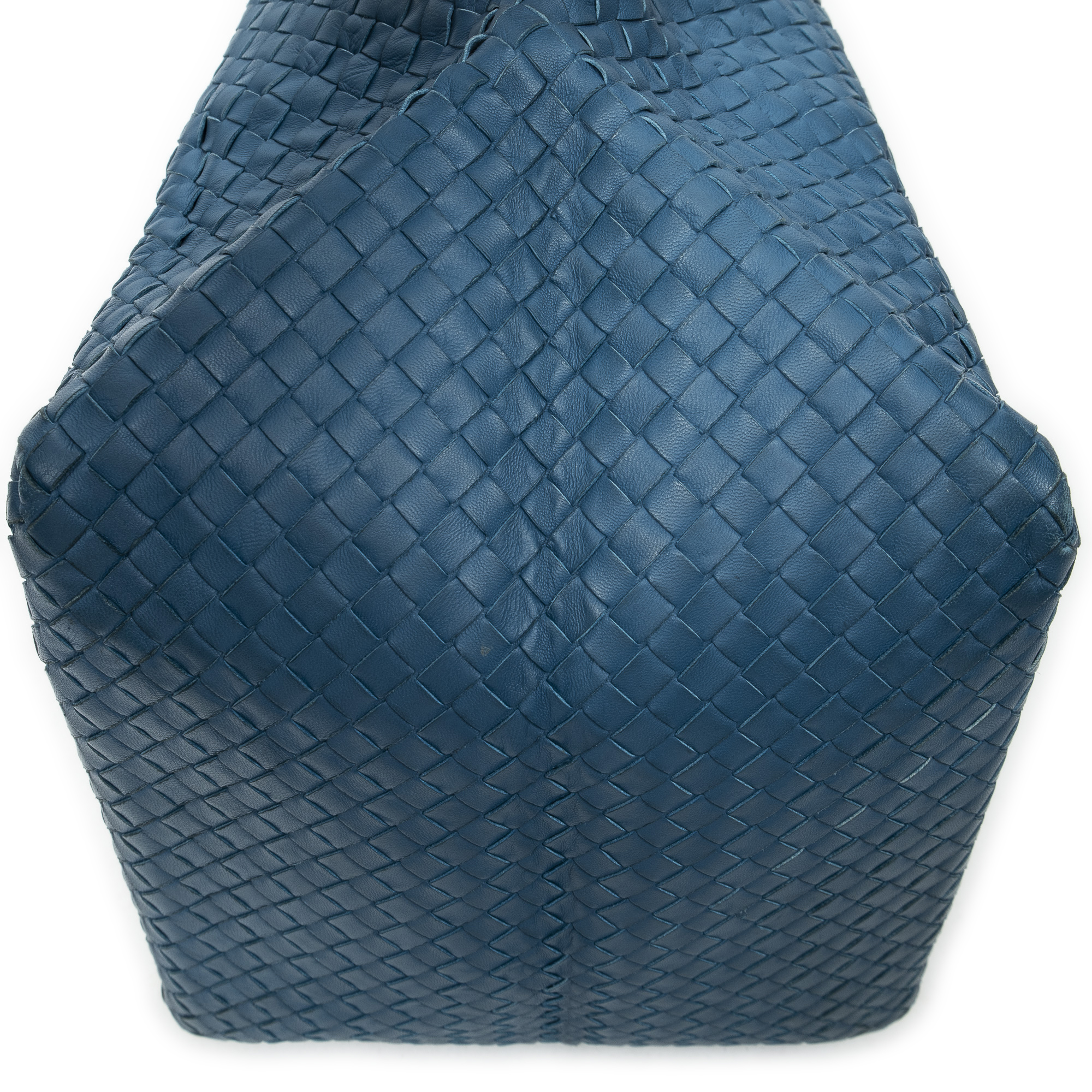 Bottega Veneta Shoulder Bag Cube Shoulder Bag in Blue Intrecciato Leather and Aged Brass hardware. The product is in Very Good Condition (AB).