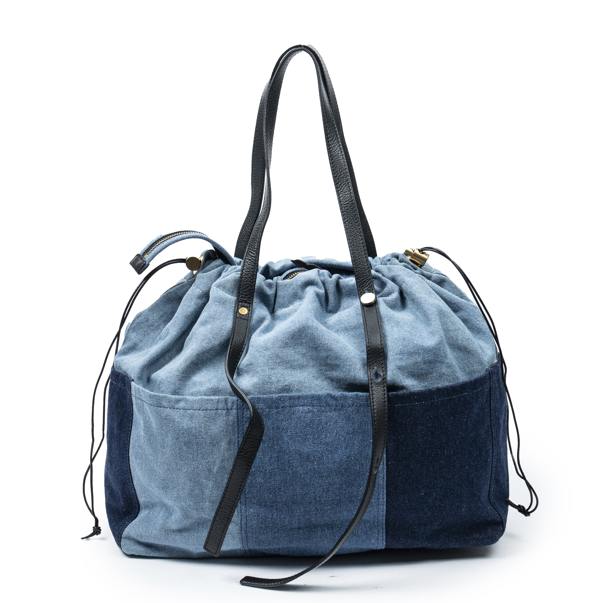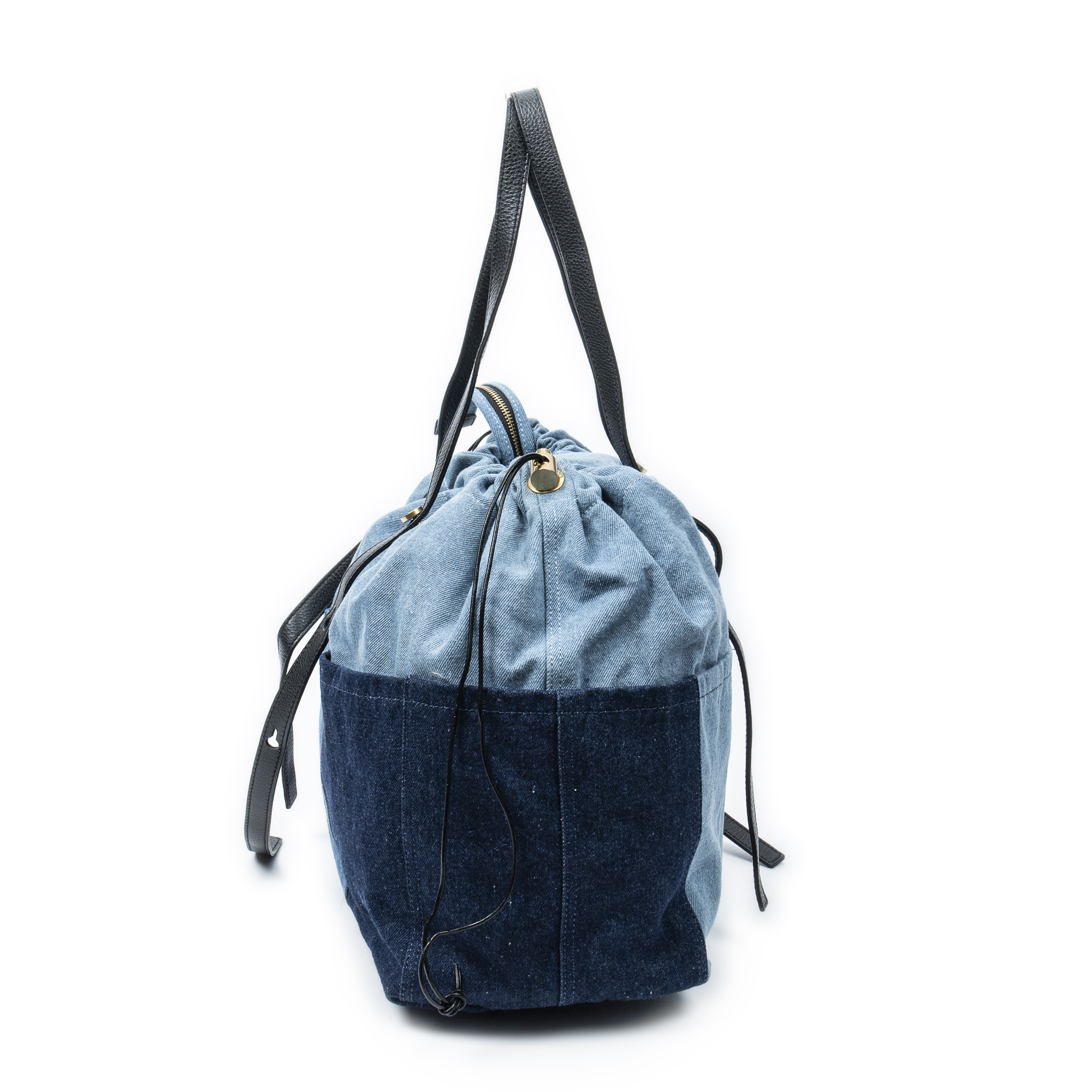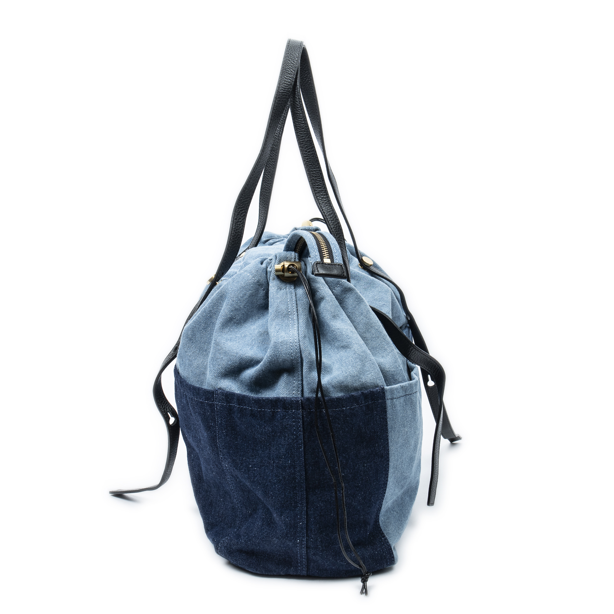 Chloé Shoulder Bag Denim Diaper Bag in Blue/Black Patchwork Denim Canvas and Gold hardware. The product is in Excellent Condition (A).