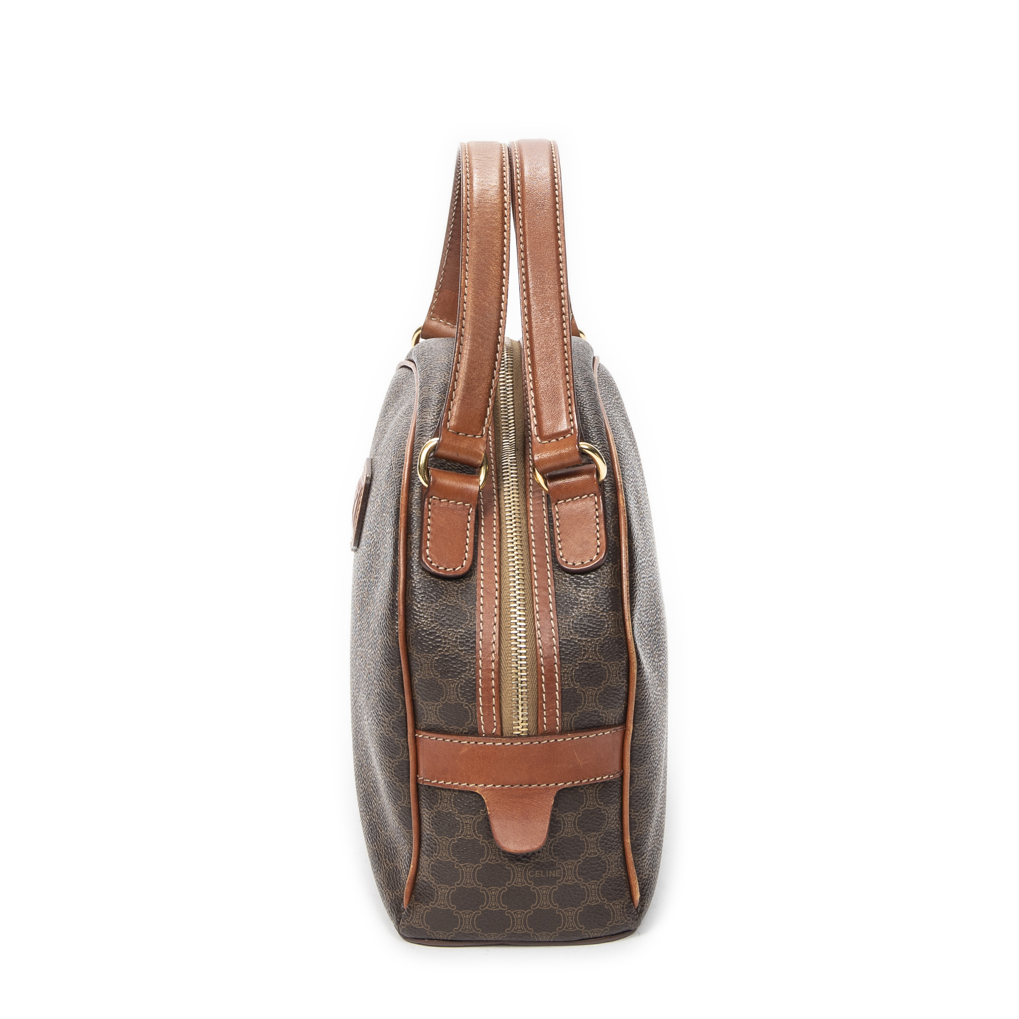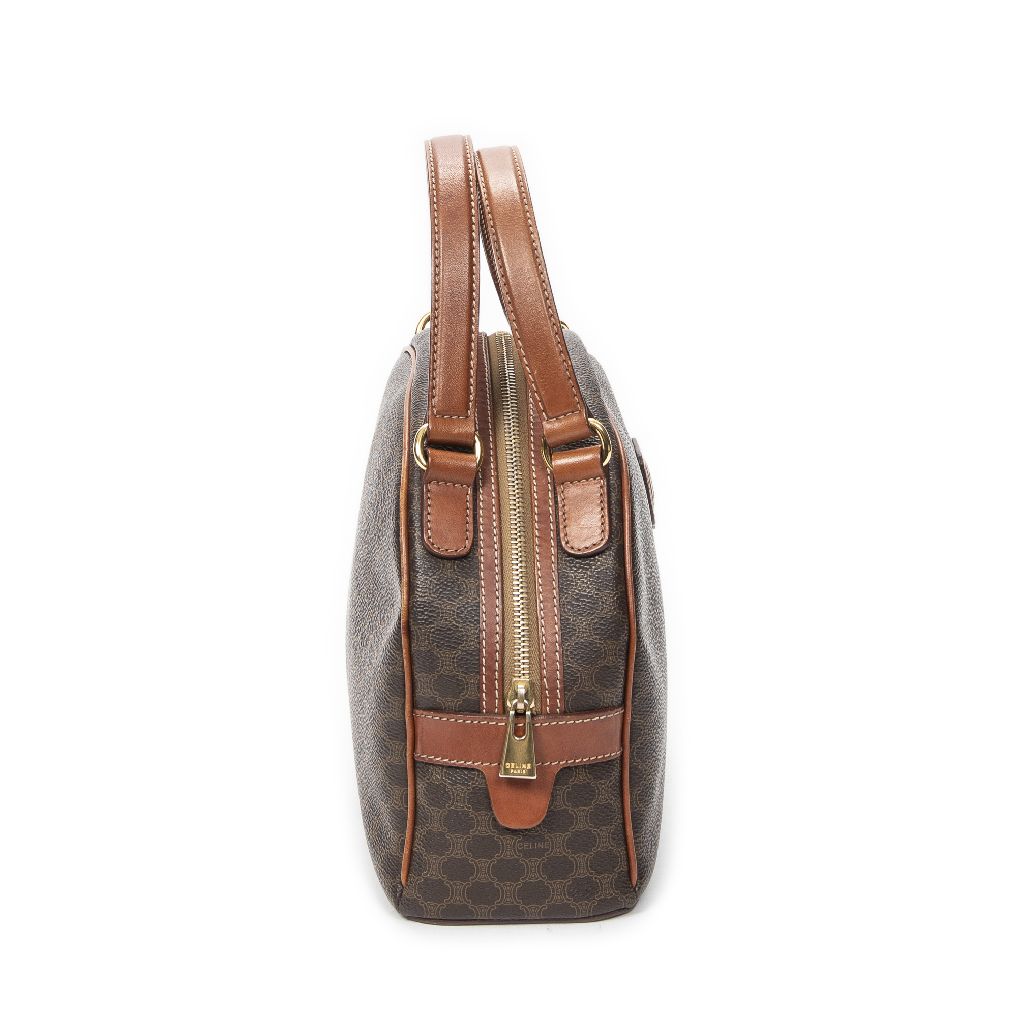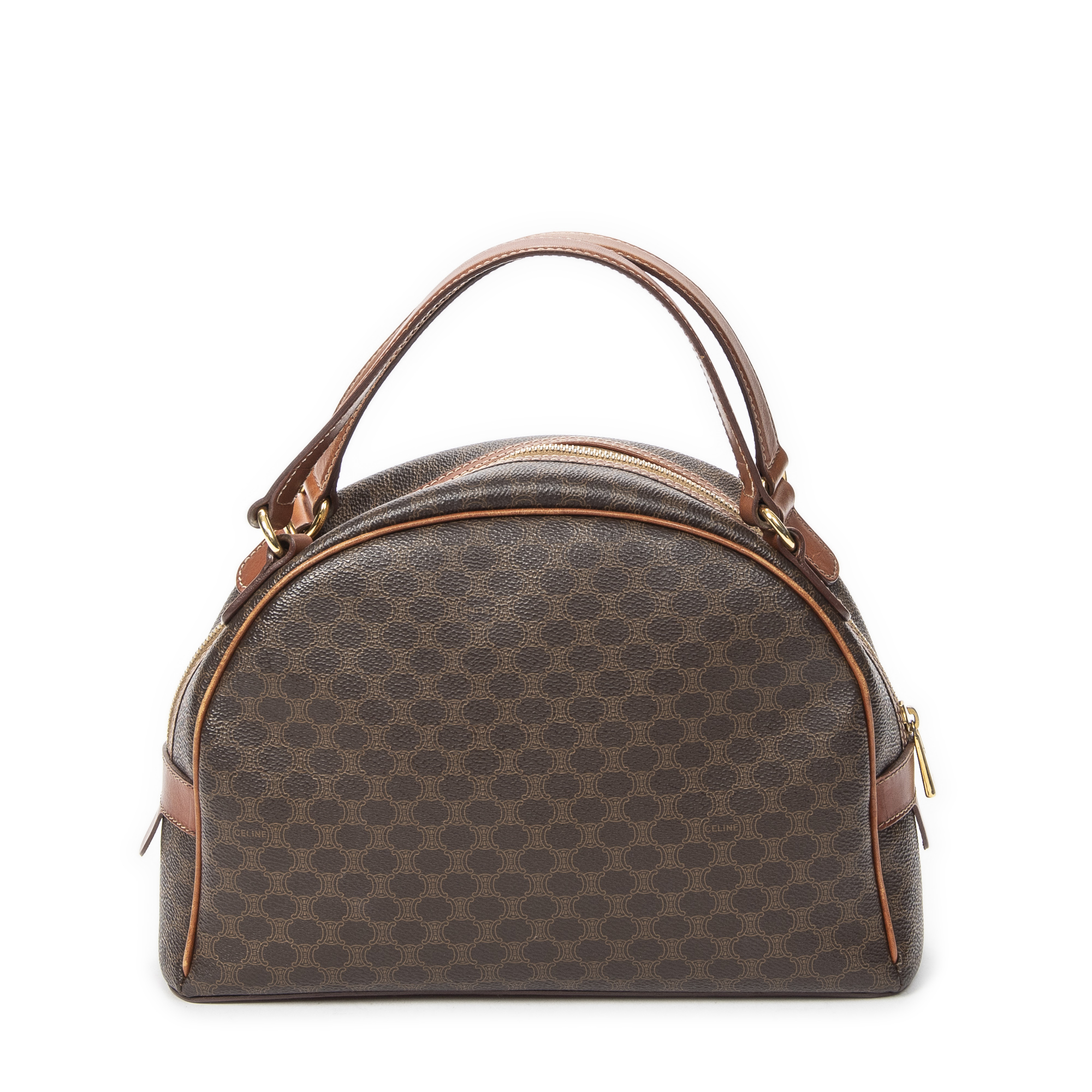 Celine Shoulder Bag Dome Bowler Bag in Brown Macadam Coated Canvas and Gold hardware. The product is in Very Good Condition (AB).