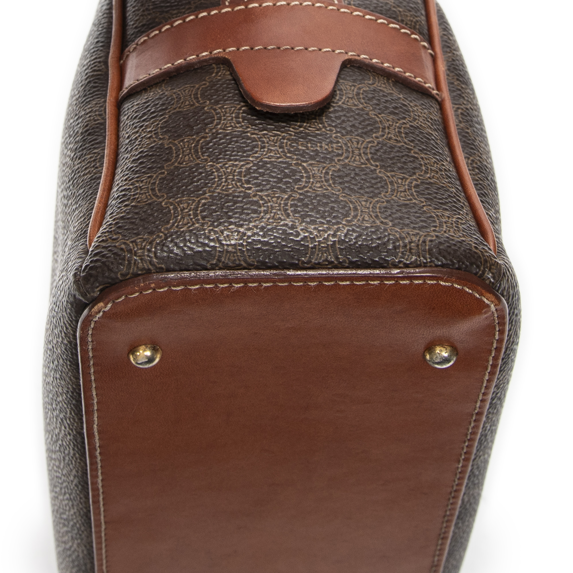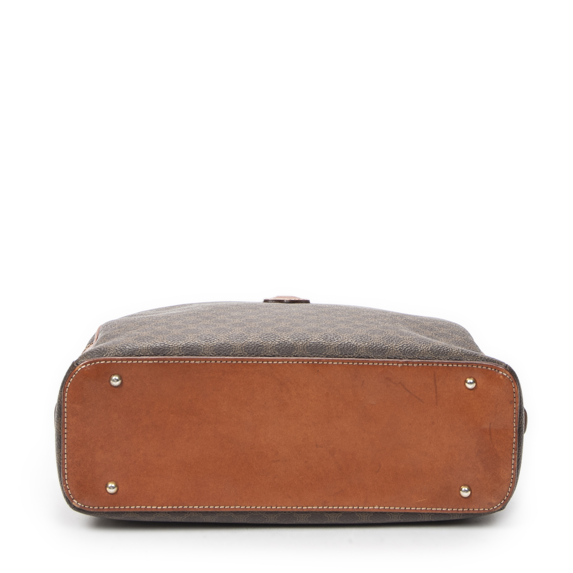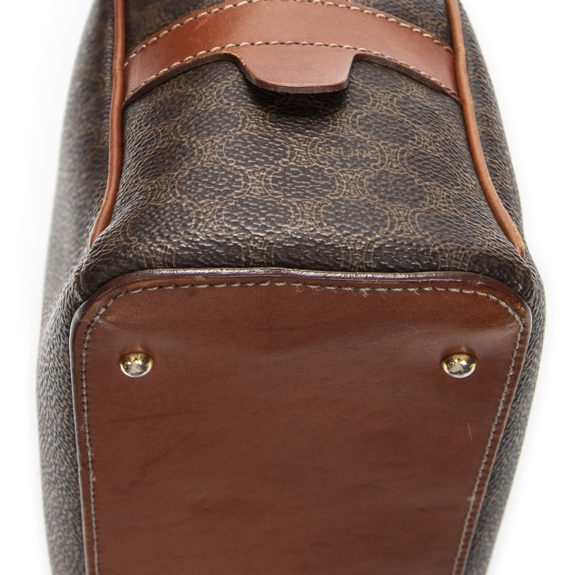 Celine Shoulder Bag Dome Bowler Bag in Brown Macadam Coated Canvas and Gold hardware. The product is in Very Good Condition (AB).