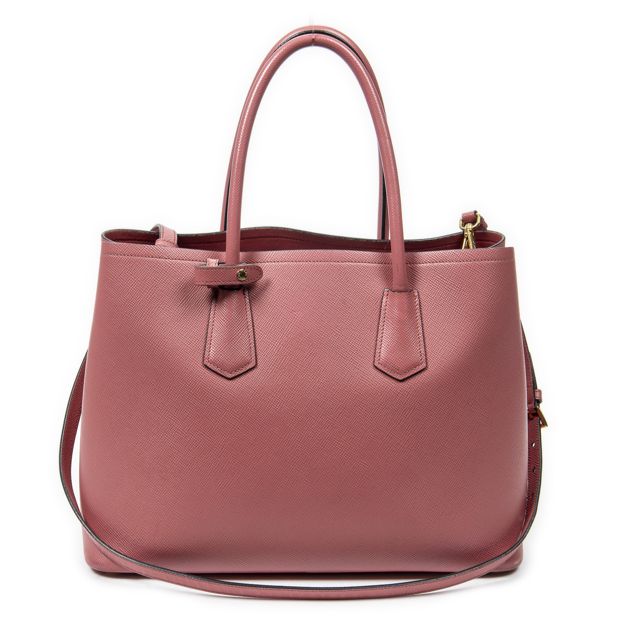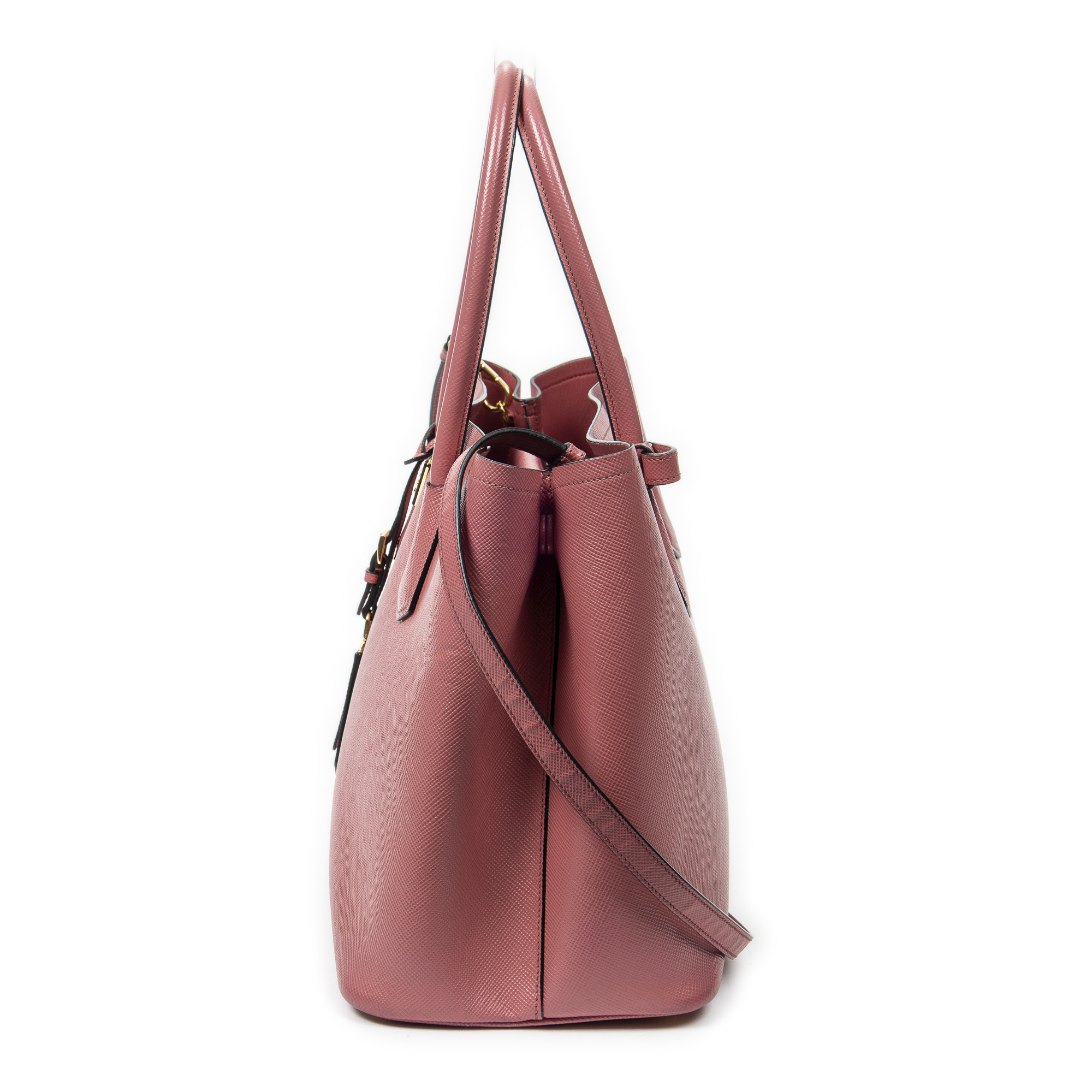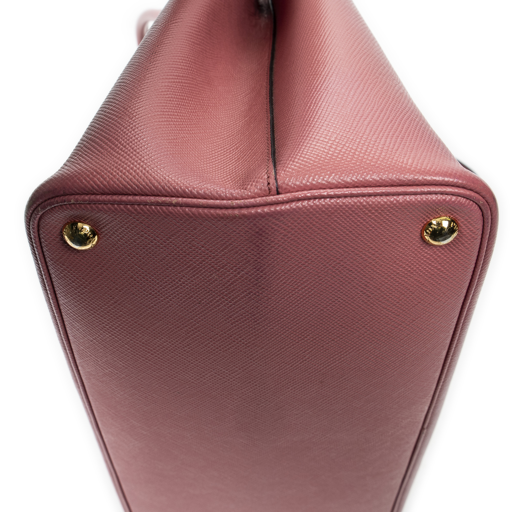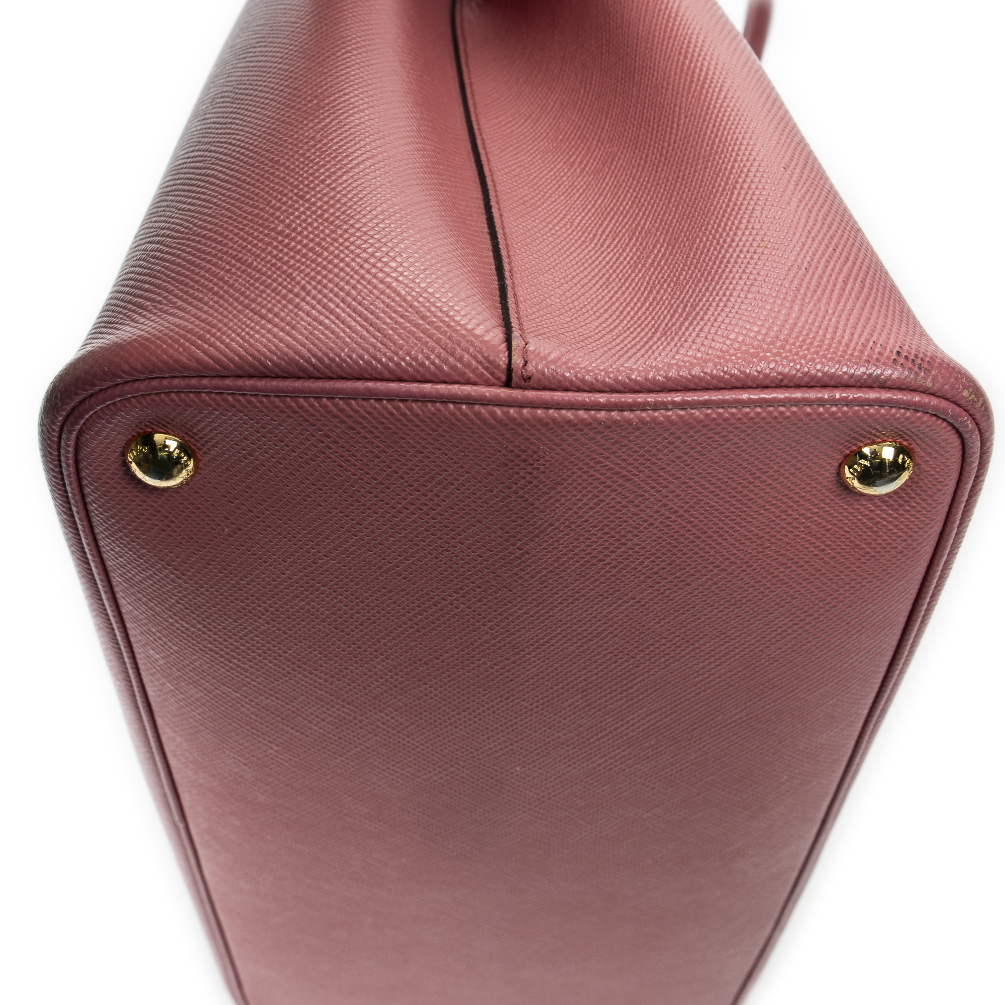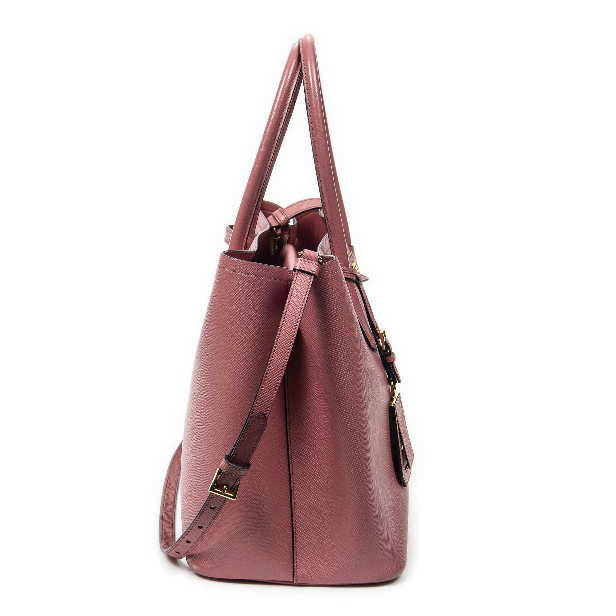 Prada Shoulder Bag Double Handle Tote in Pink Saffiano Leather and Gold hardware. The product is in Very Good Condition (AB).
