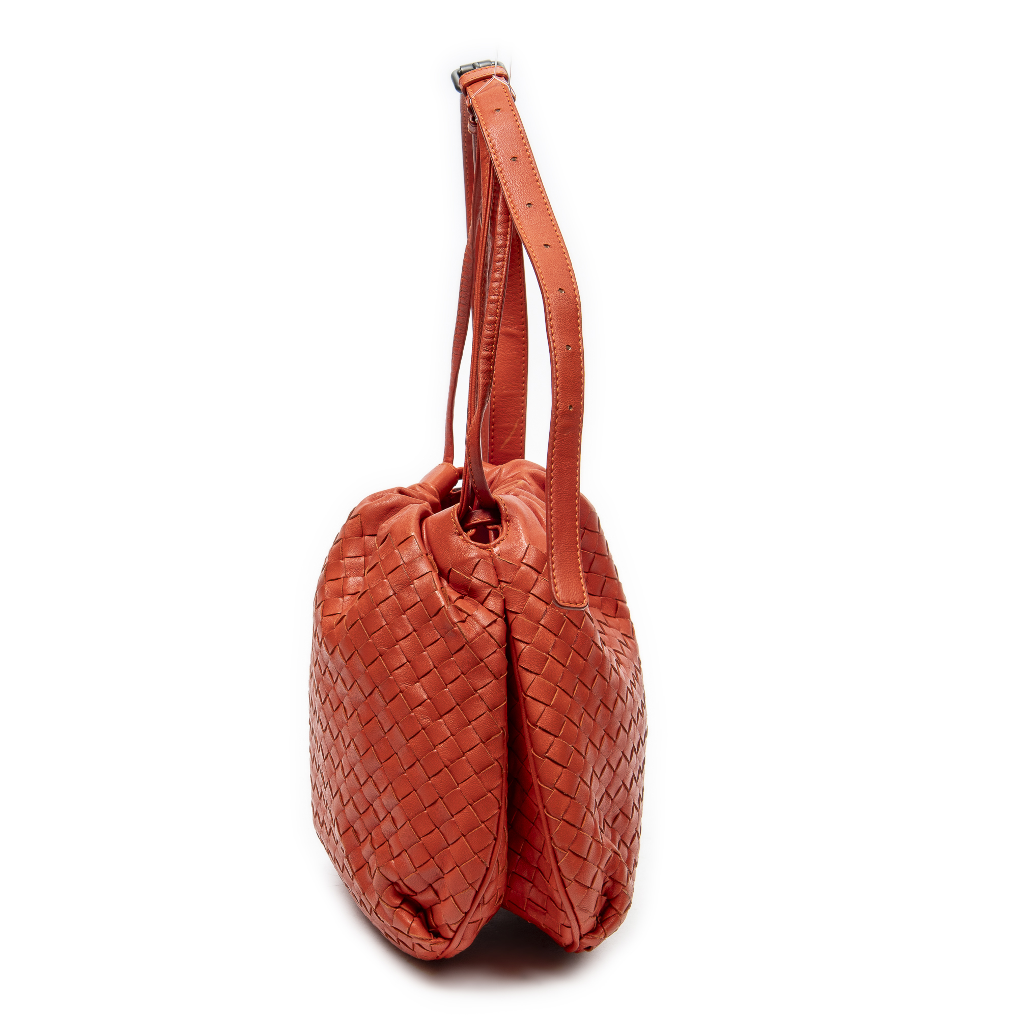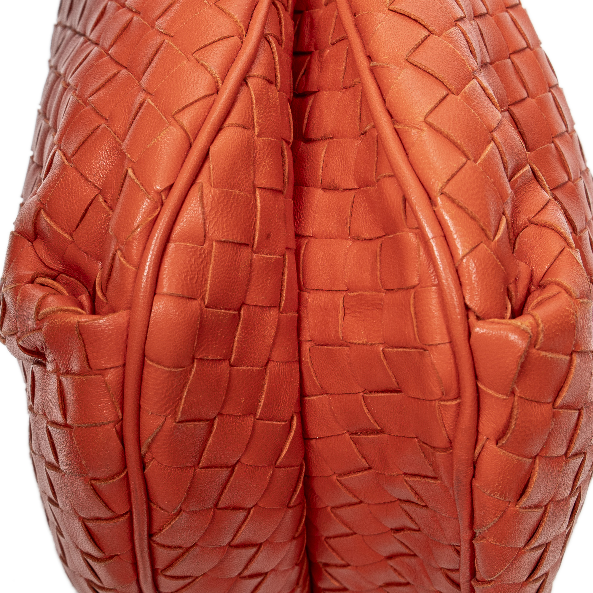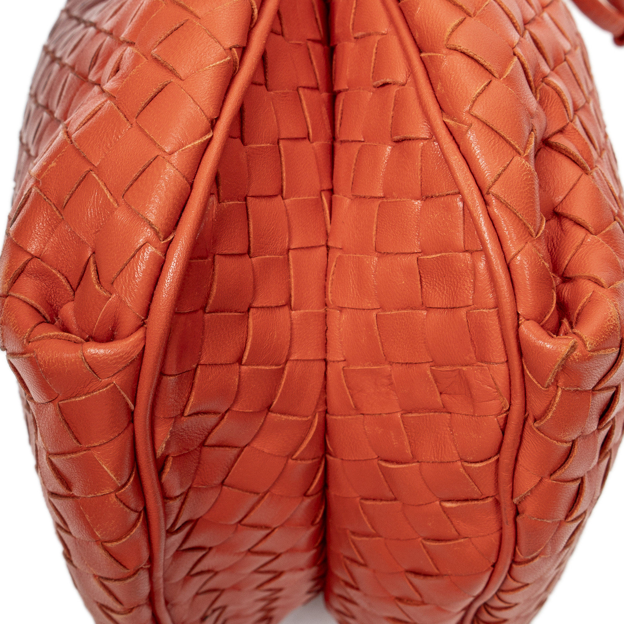 Bottega Veneta Shoulder Bag Drawstring Crossbody in Orange Intrecciato Leather and Silver hardware. The product is in Excellent Condition (A).