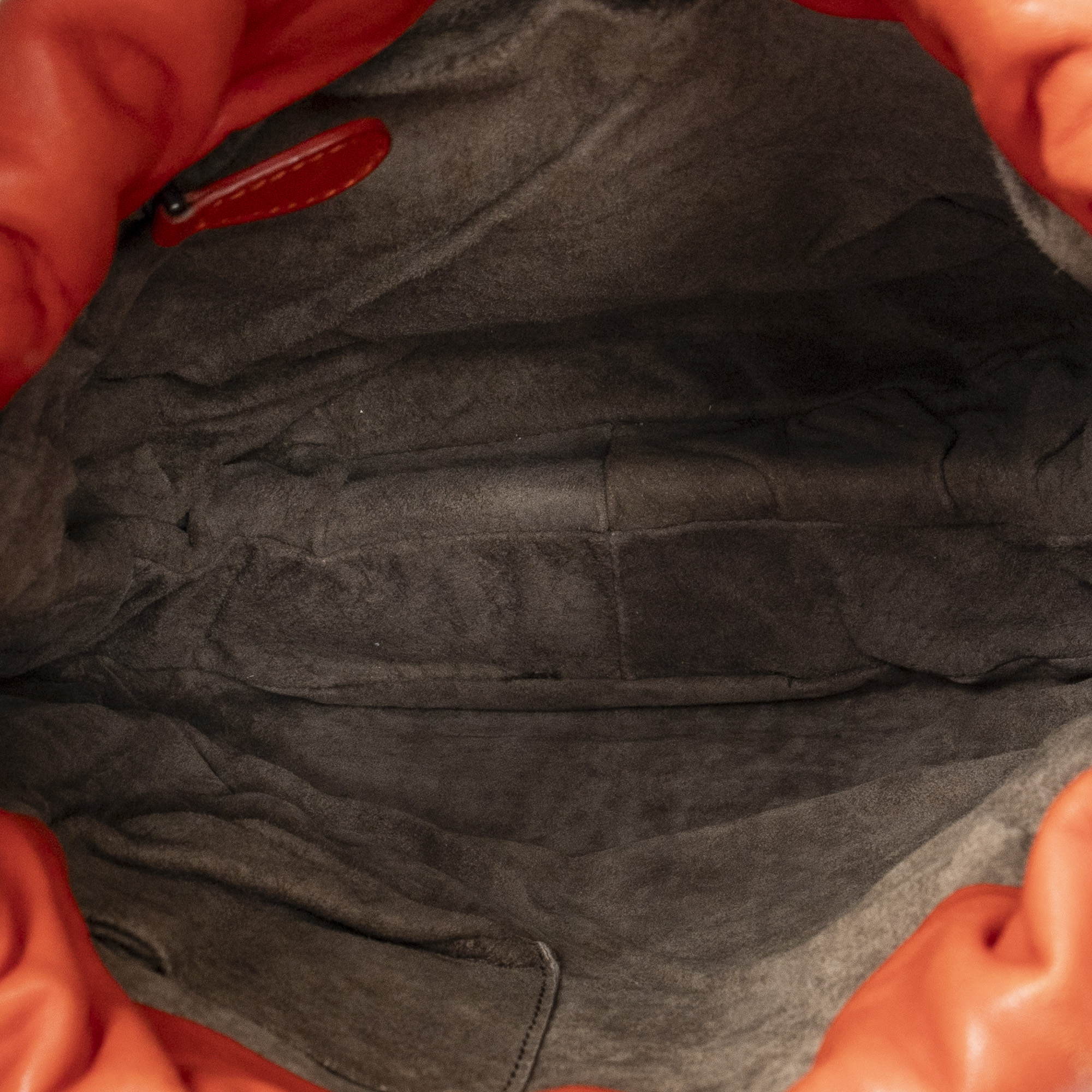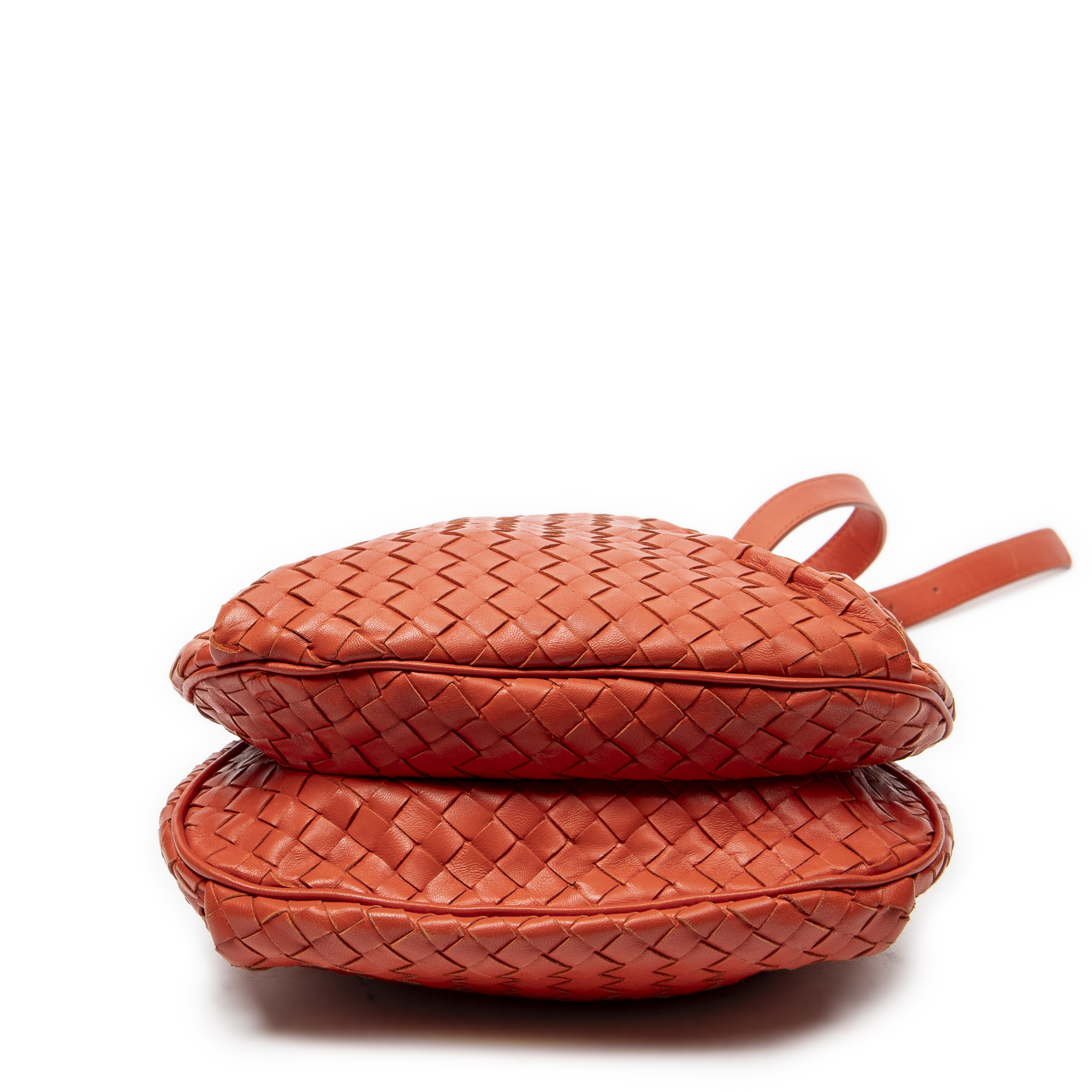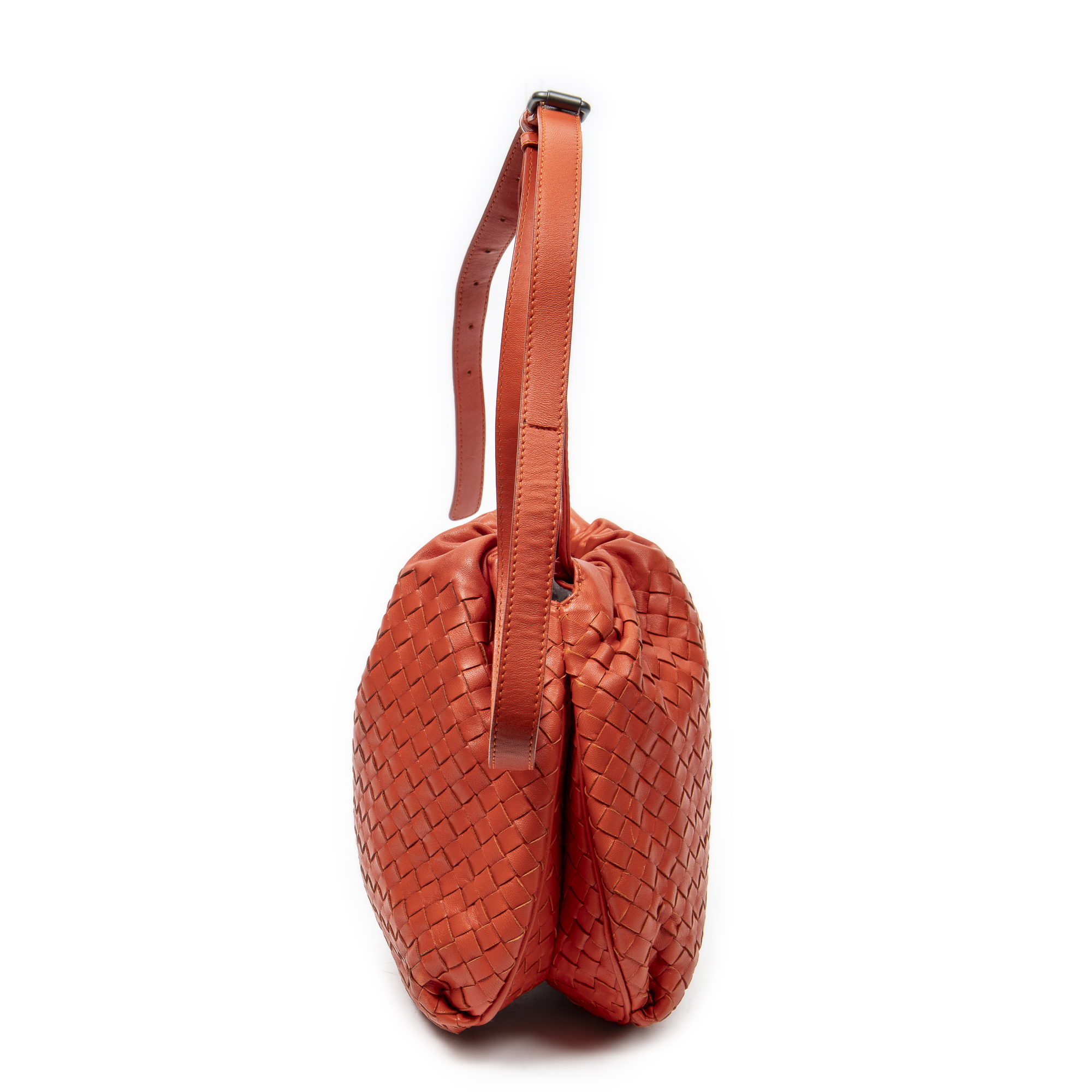 Bottega Veneta Shoulder Bag Drawstring Crossbody in Orange Intrecciato Leather and Silver hardware. The product is in Excellent Condition (A).