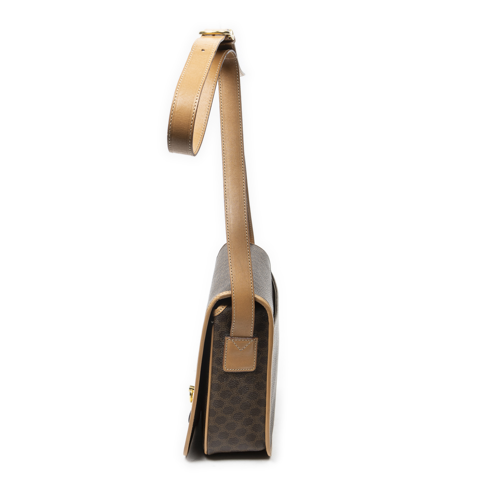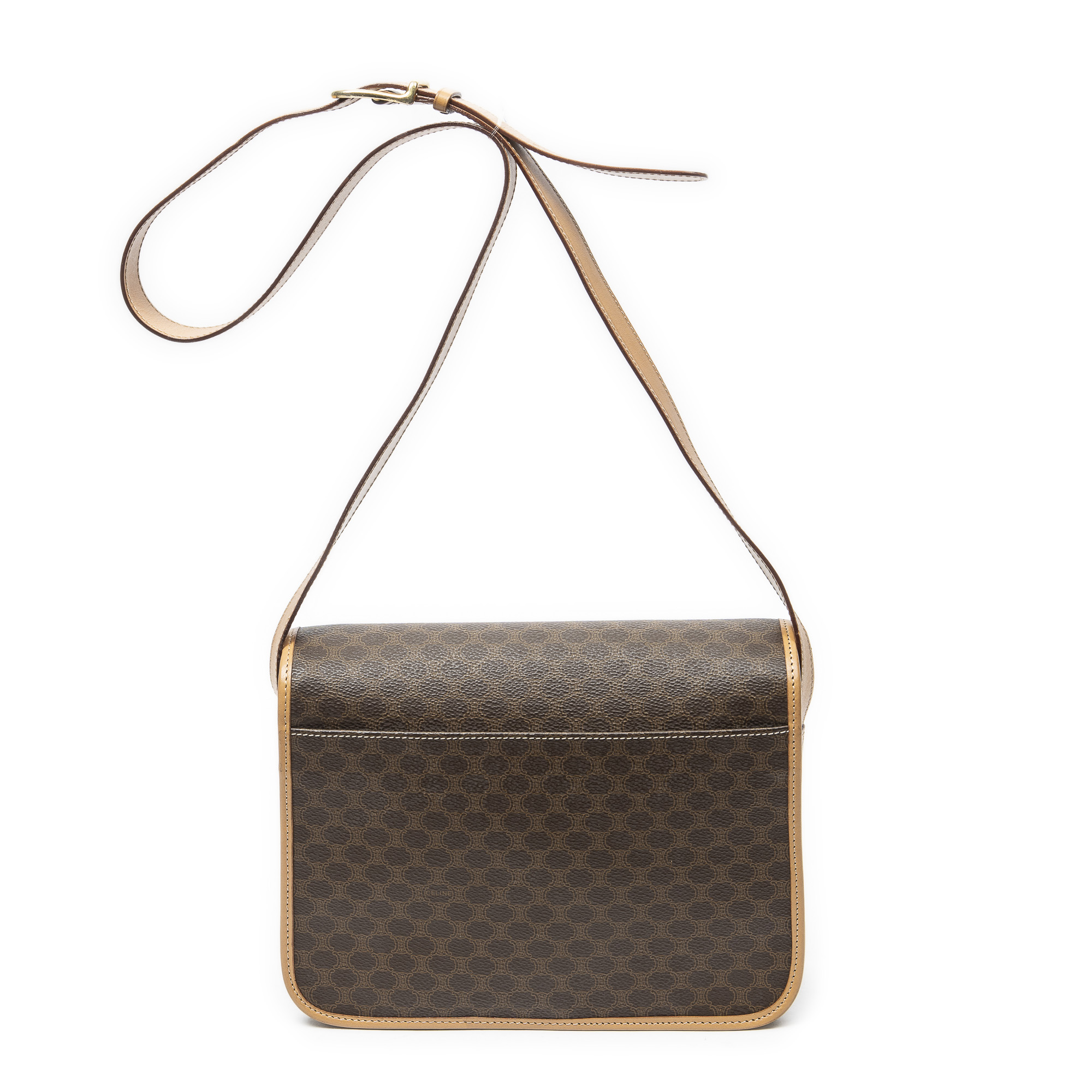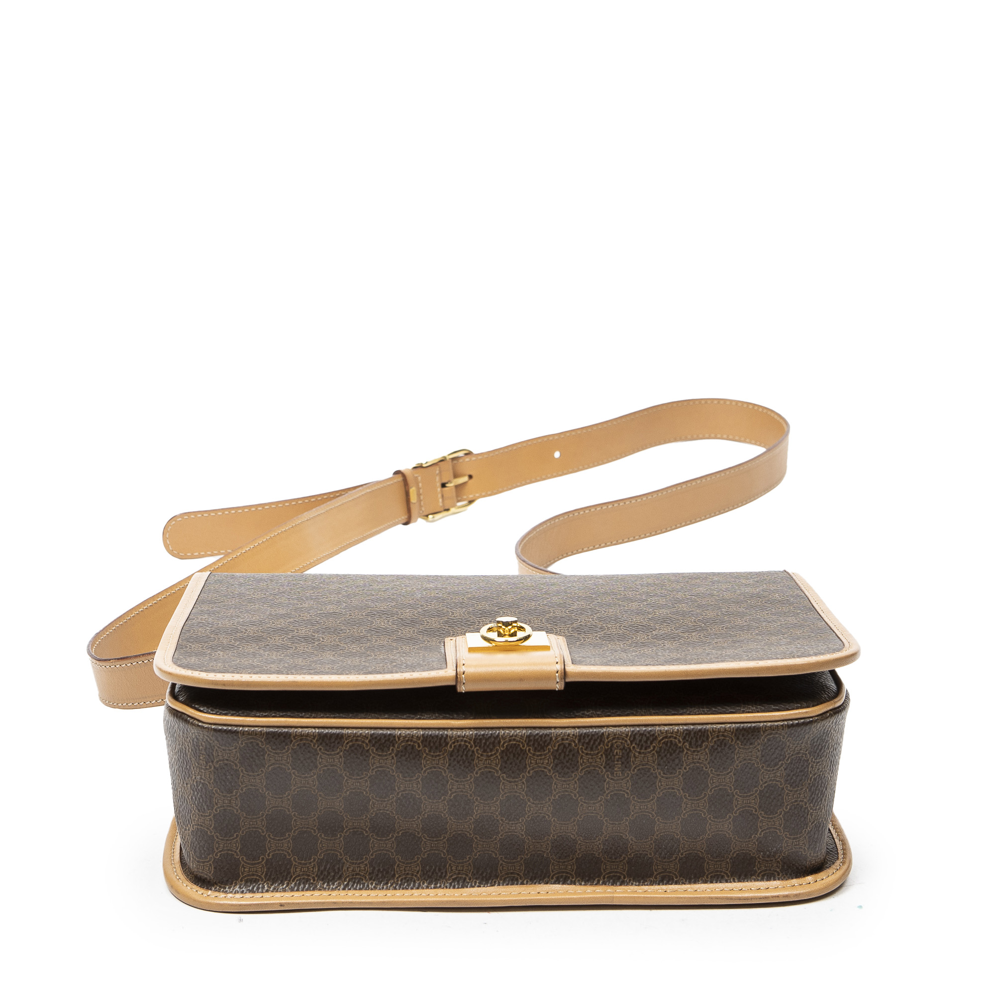 Celine Shoulder Bag Flap Crossbody in Brown/Beige Macadam Coated Canvas and Gold hardware. The product is in Excellent Condition (A).