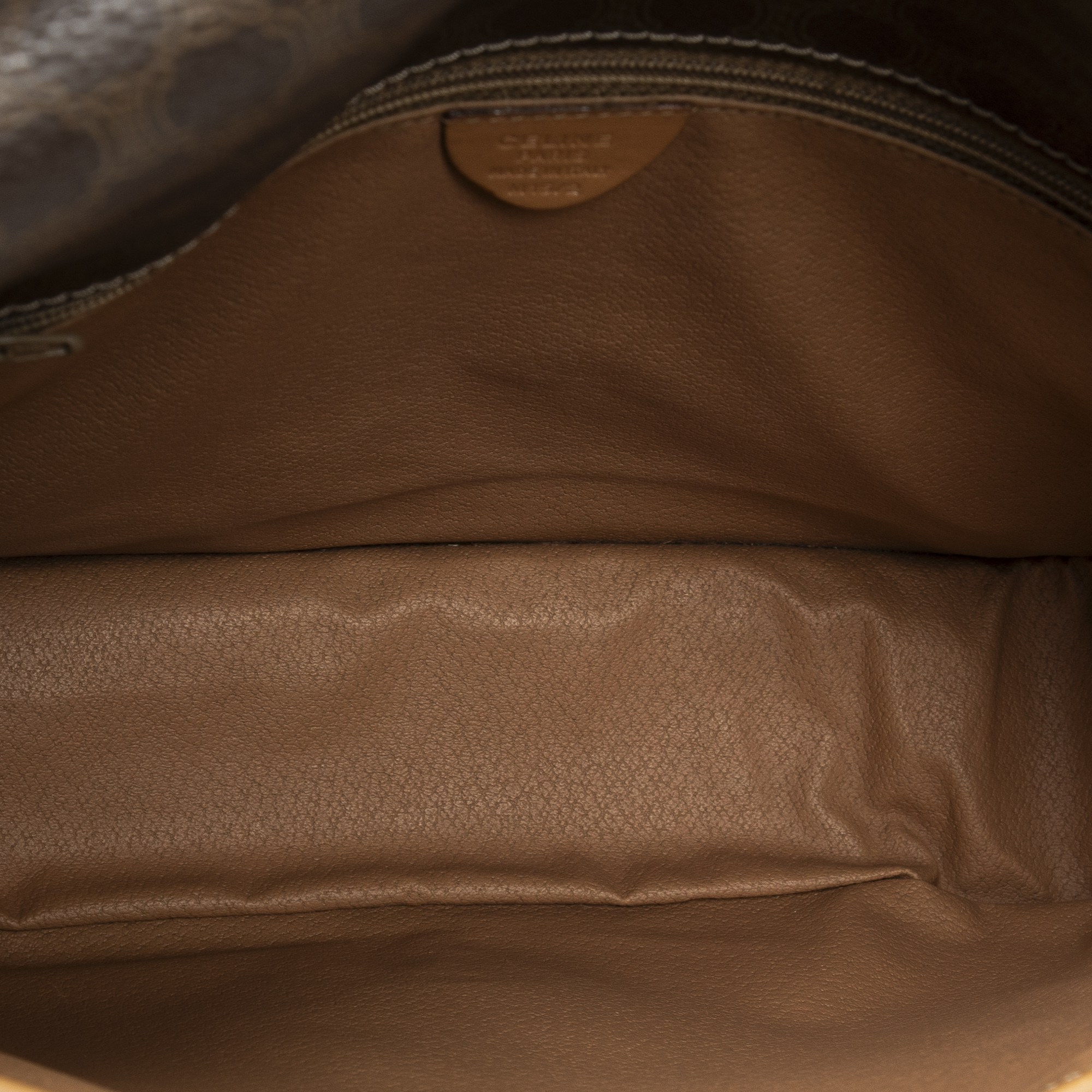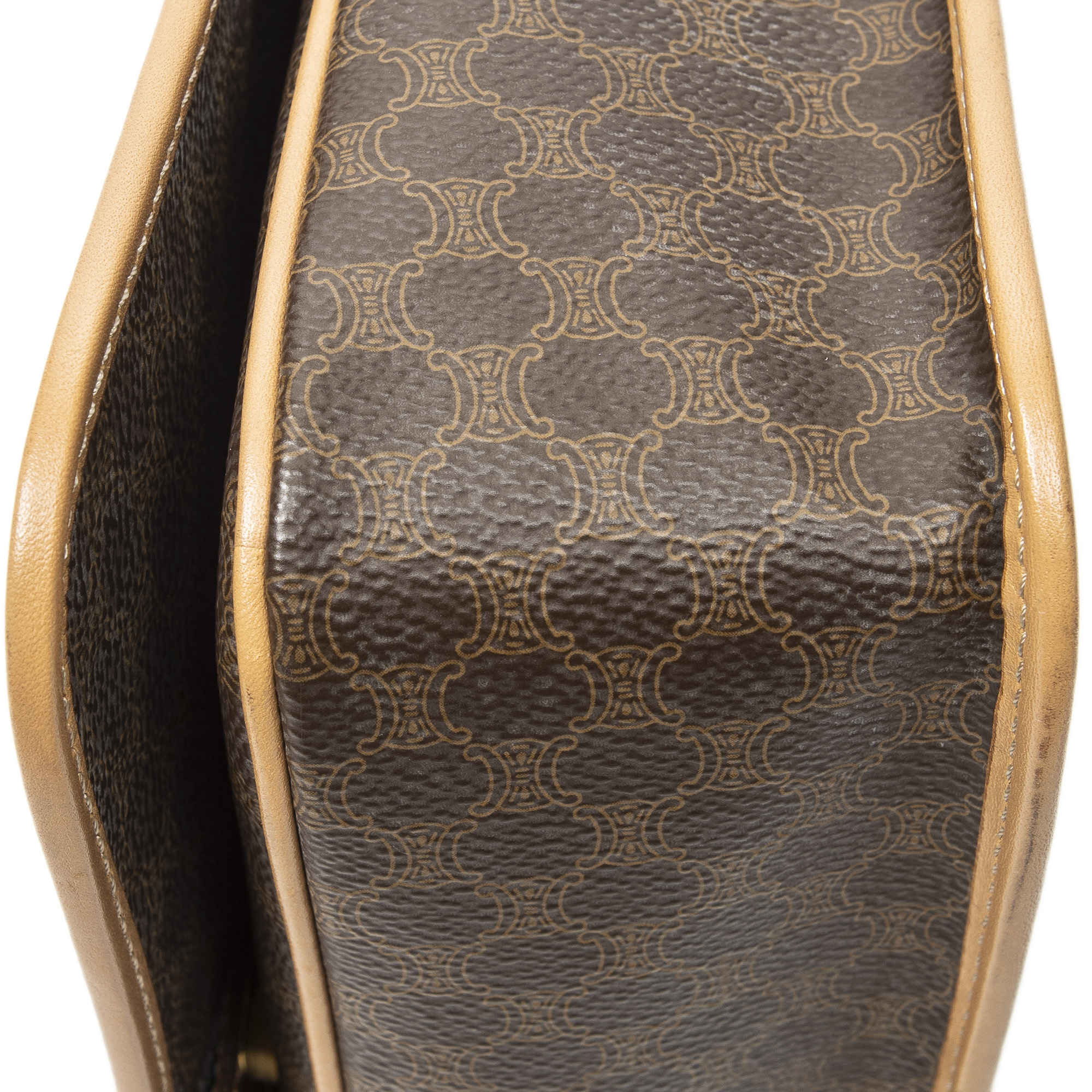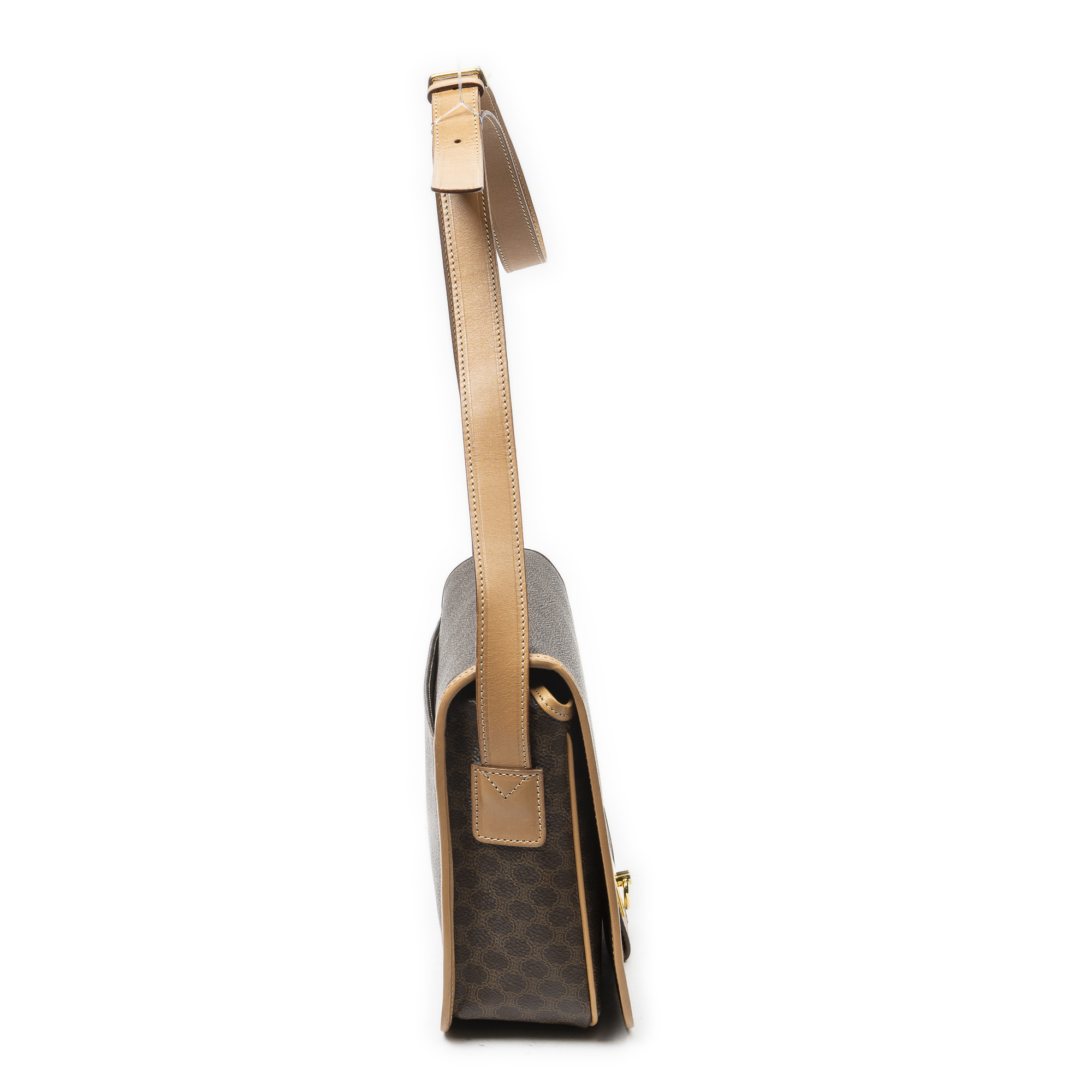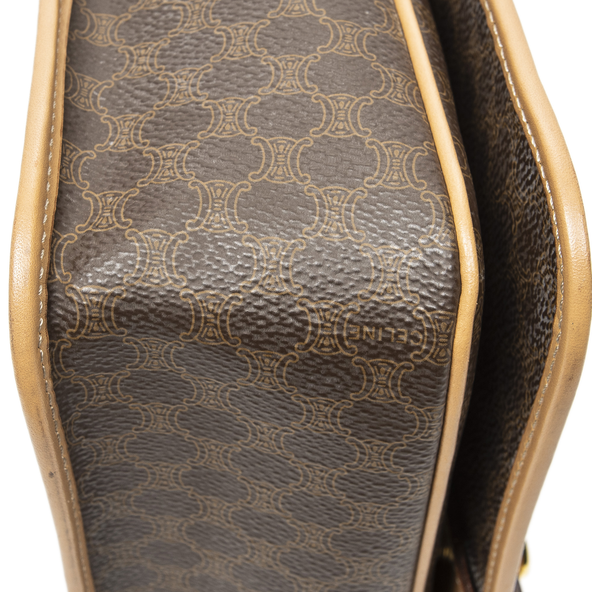 Celine Shoulder Bag Flap Crossbody in Brown/Beige Macadam Coated Canvas and Gold hardware. The product is in Excellent Condition (A).
