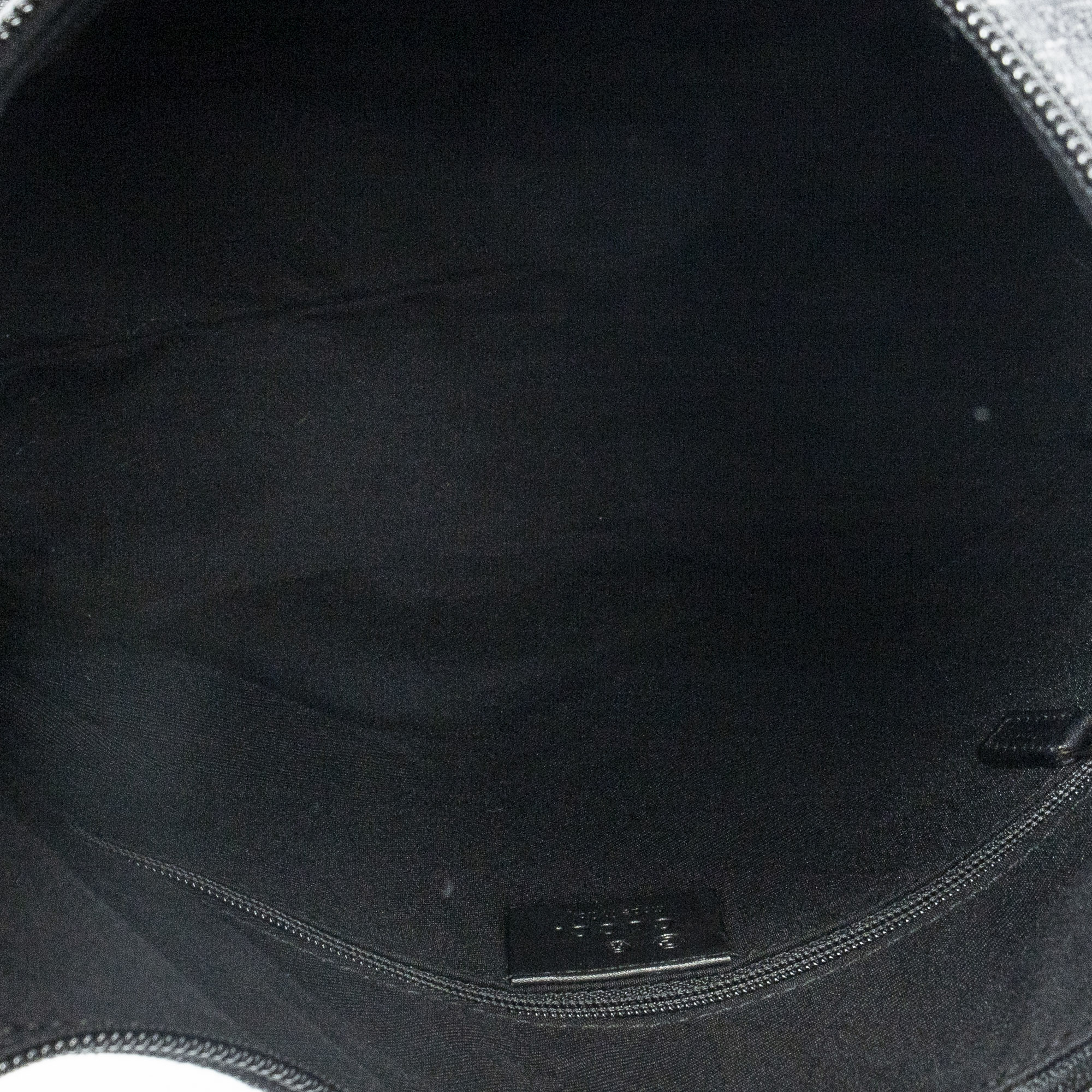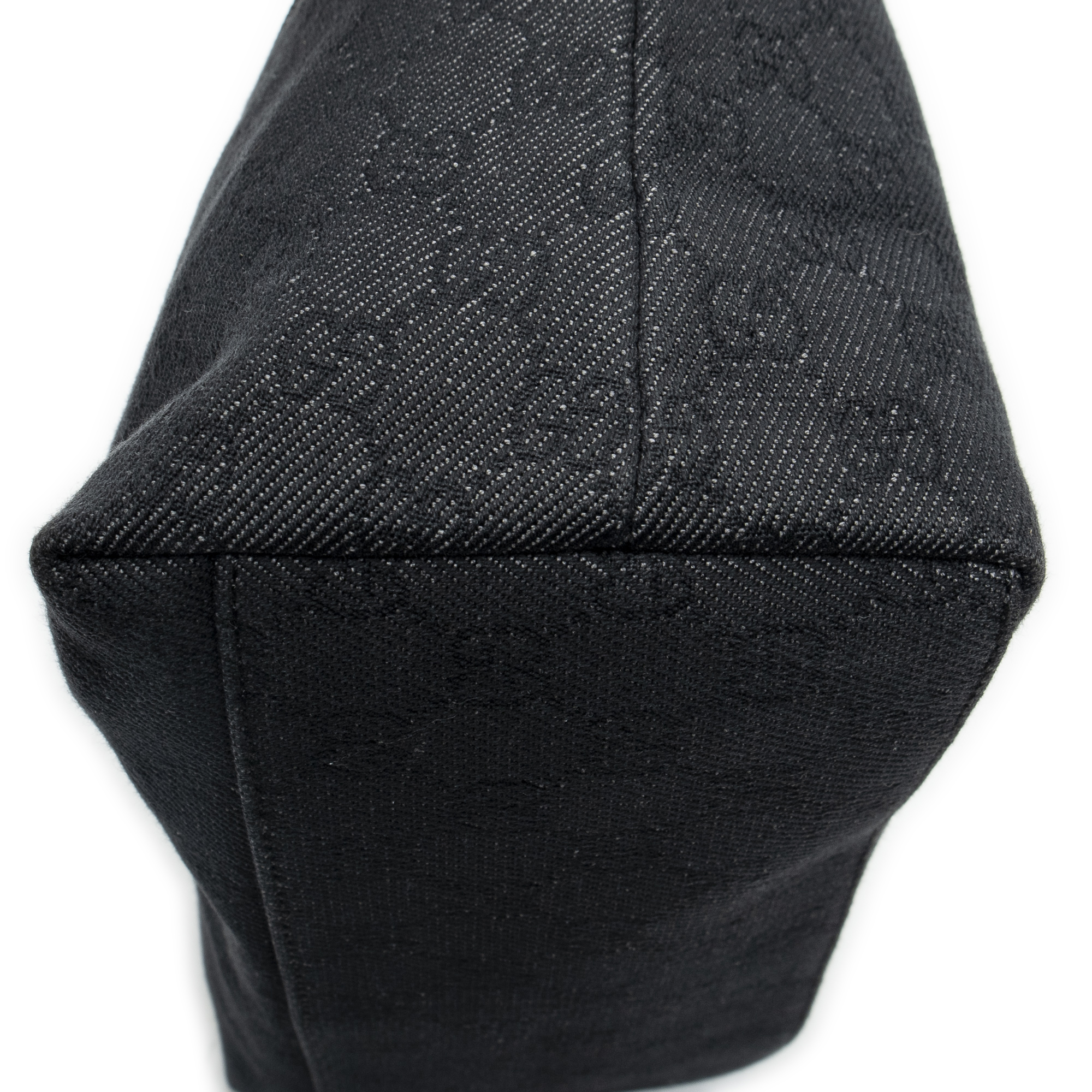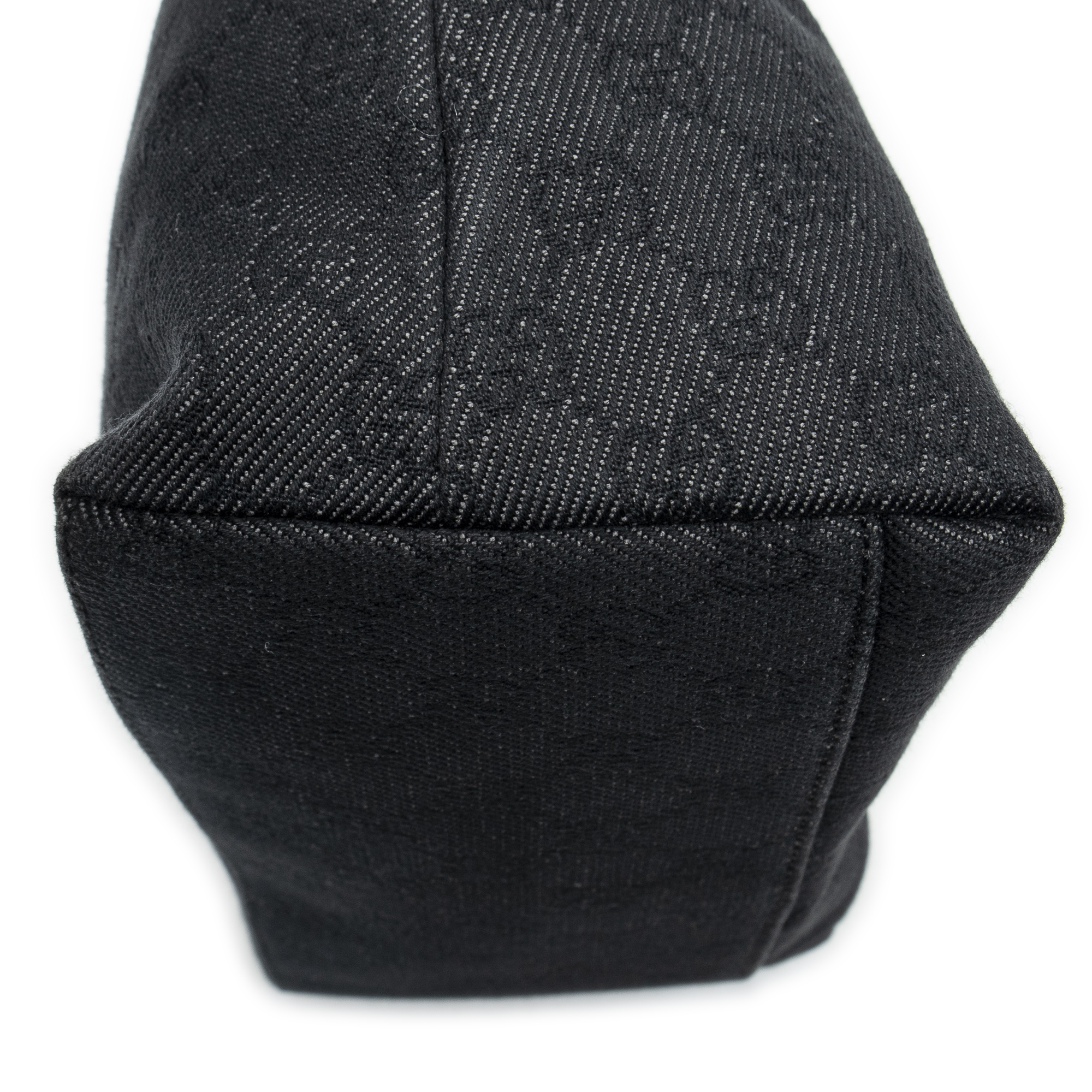 Gucci Shoulder Bag Front Pocket Zip Hobo in Black Monogrammed Denim Canvas and Gold hardware. The product is in Excellent Condition (A).