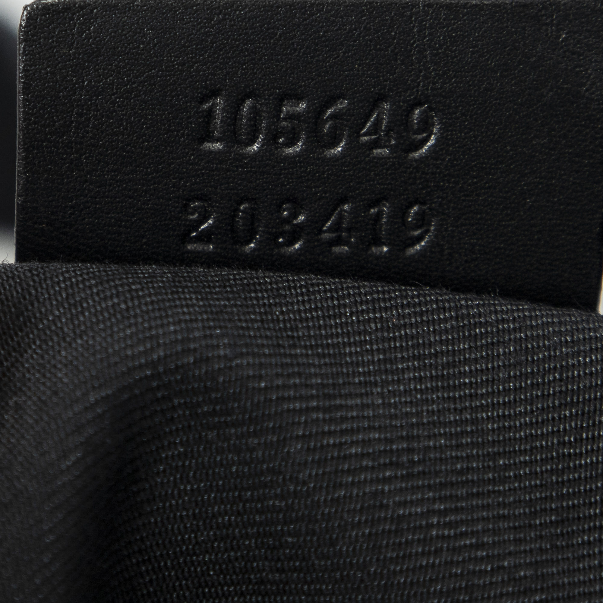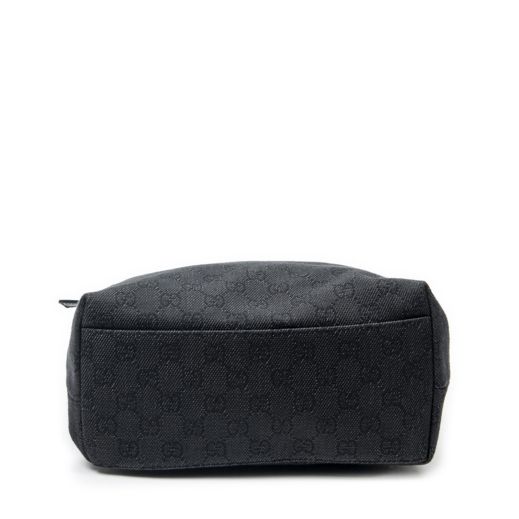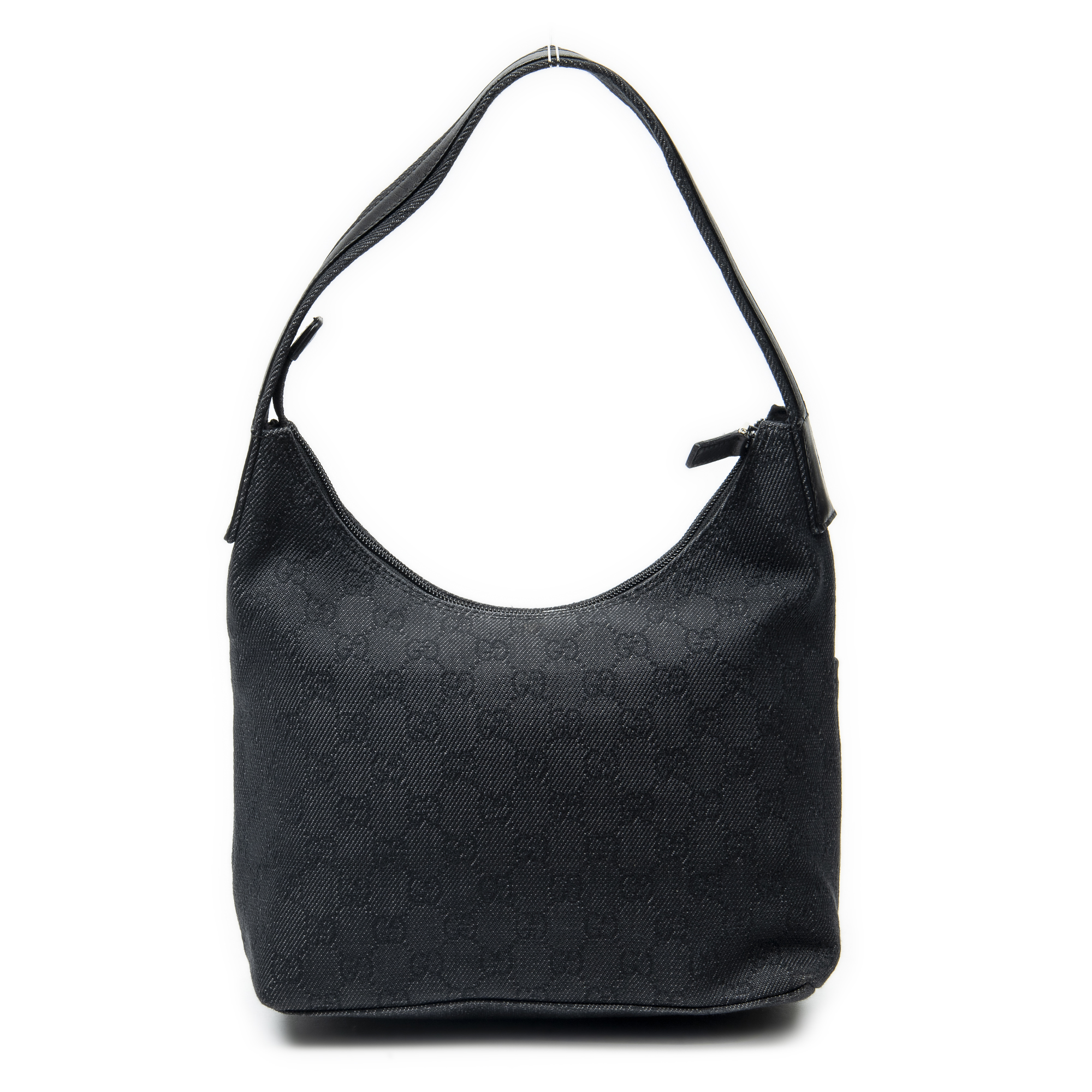 Gucci Shoulder Bag Front Pocket Zip Hobo in Black Monogrammed Denim Canvas and Gold hardware. The product is in Excellent Condition (A).