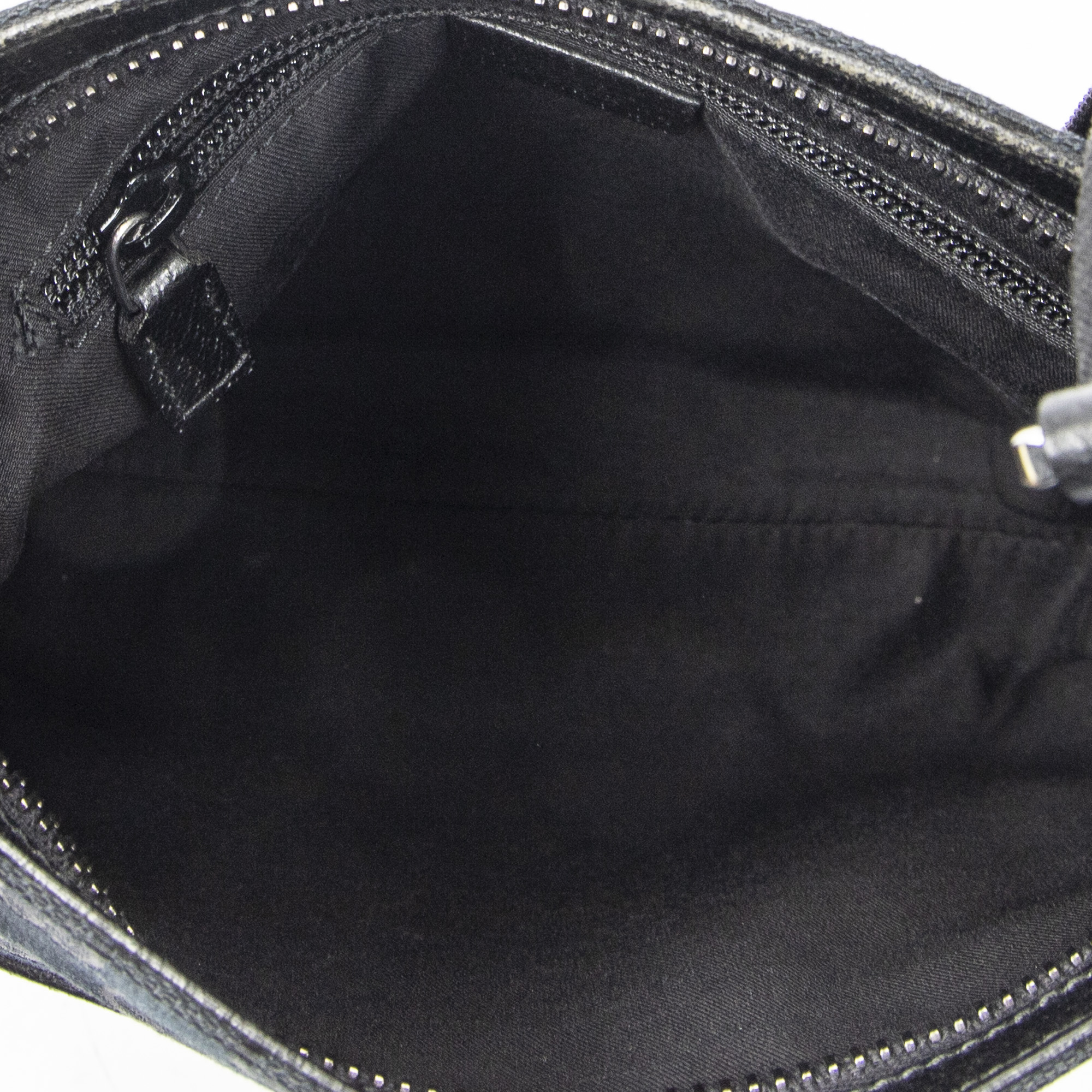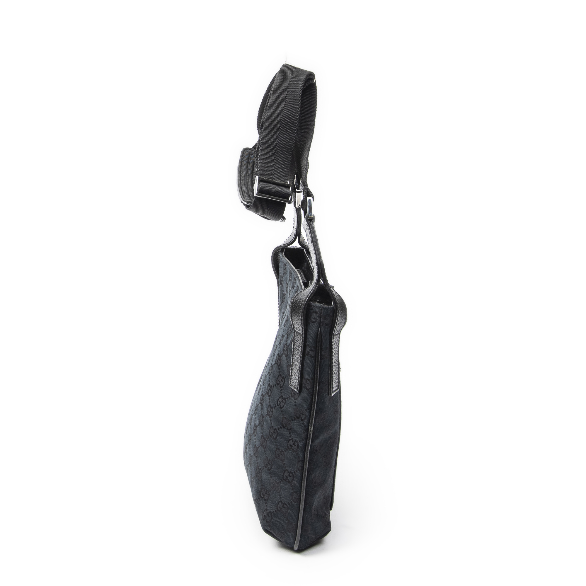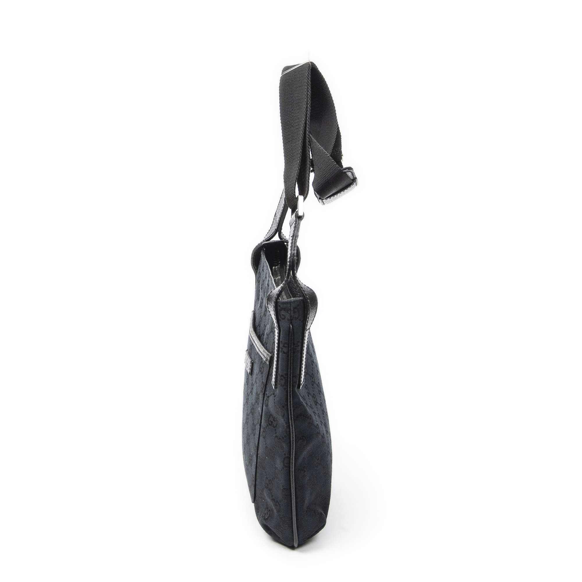 Gucci Shoulder Bag Front Slip Pocket Crossbody in Black Monogrammed Canvas and Silver hardware. The product is in Excellent Condition (A).