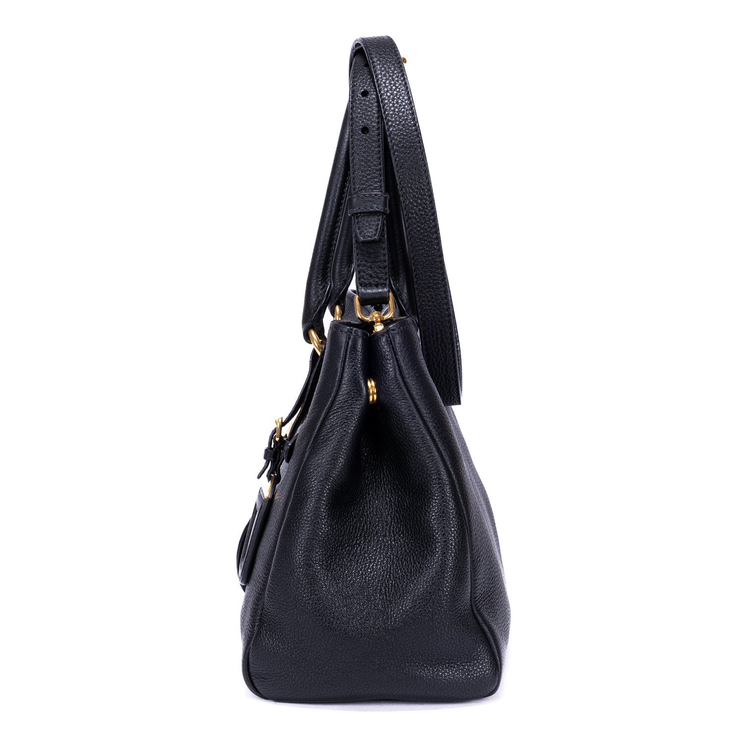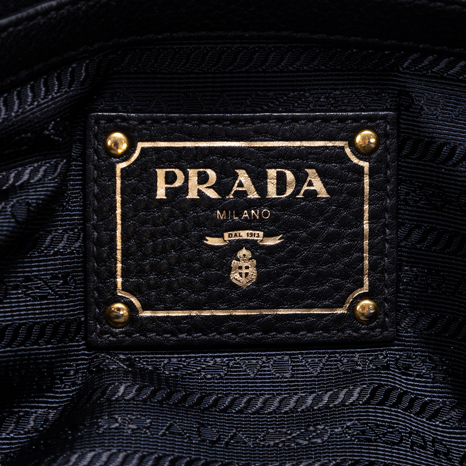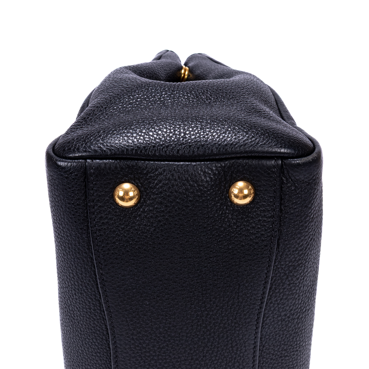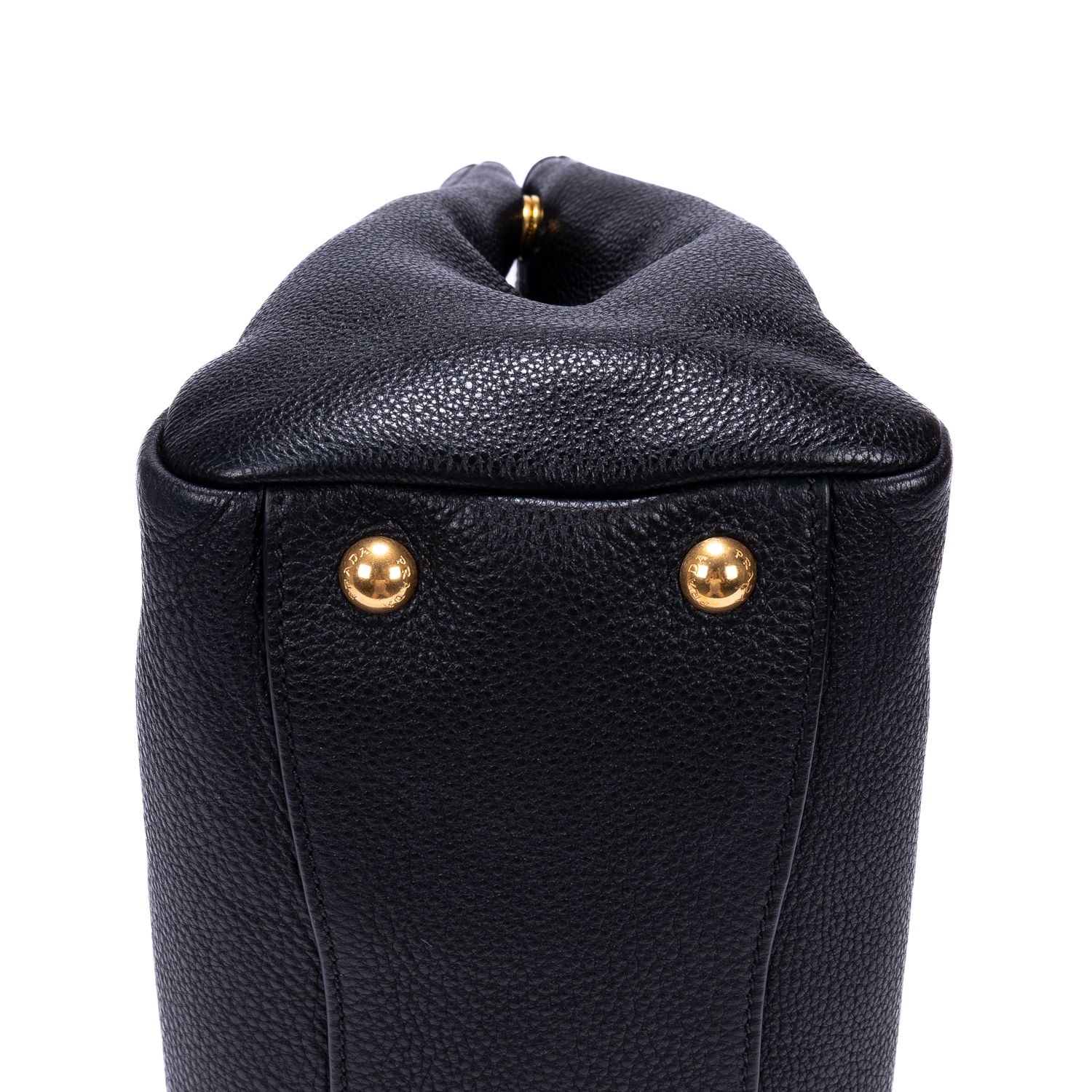 Prada Shoulder Bag Front Zip Pocket Shopping Tote in Black Vitello Phenix Leather and Gold hardware. The product is in Perfect Condition (AA).