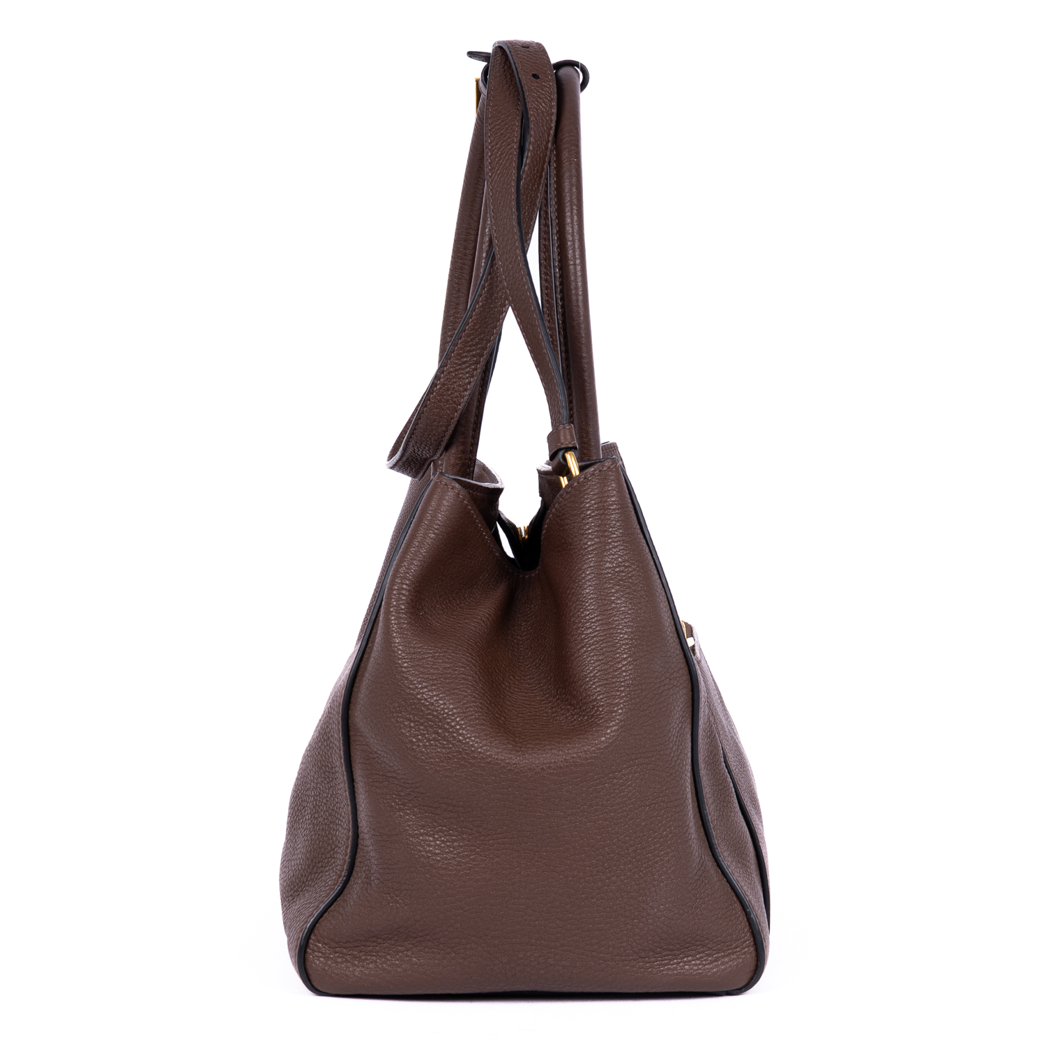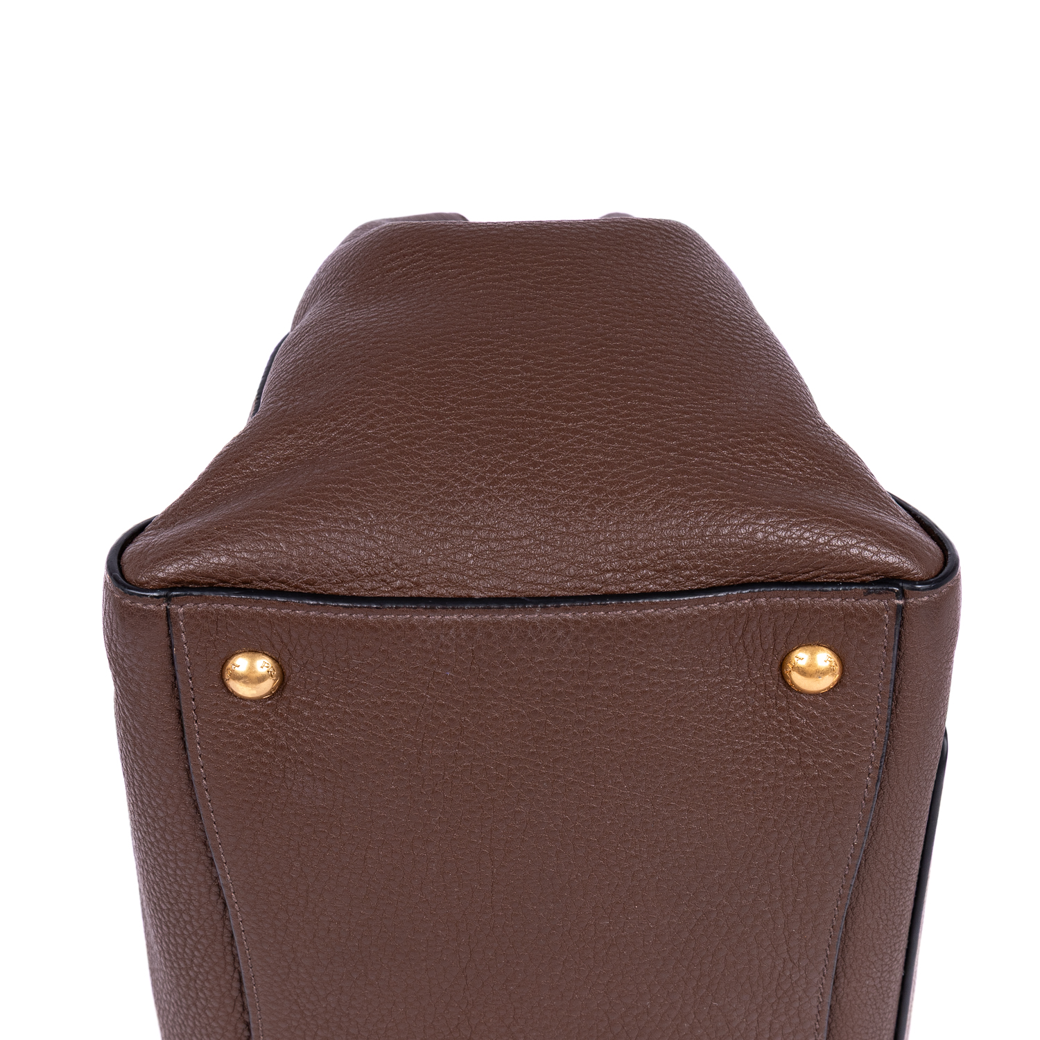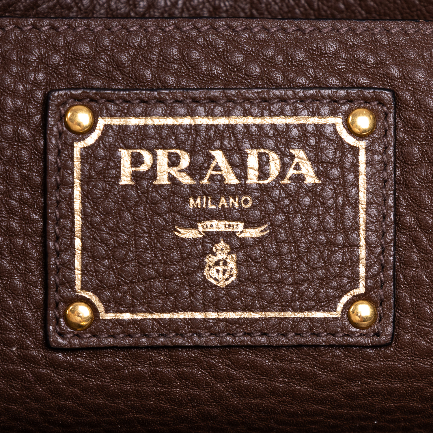Prada Shoulder Bag Front Zip Pocket Shopping Tote in Brown Vitello Daino Leather and Gold hardware. The product is in Excellent Condition (A).