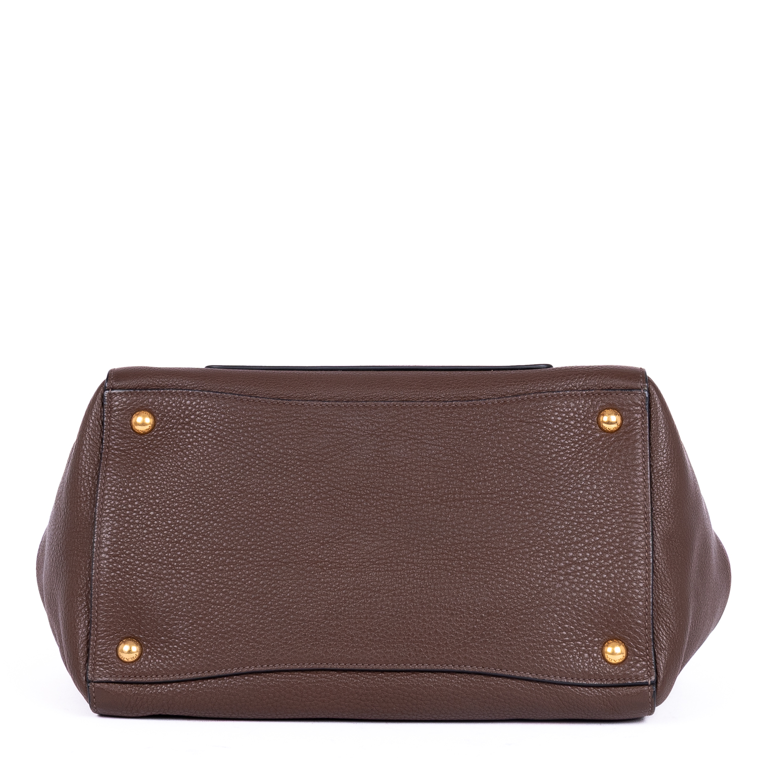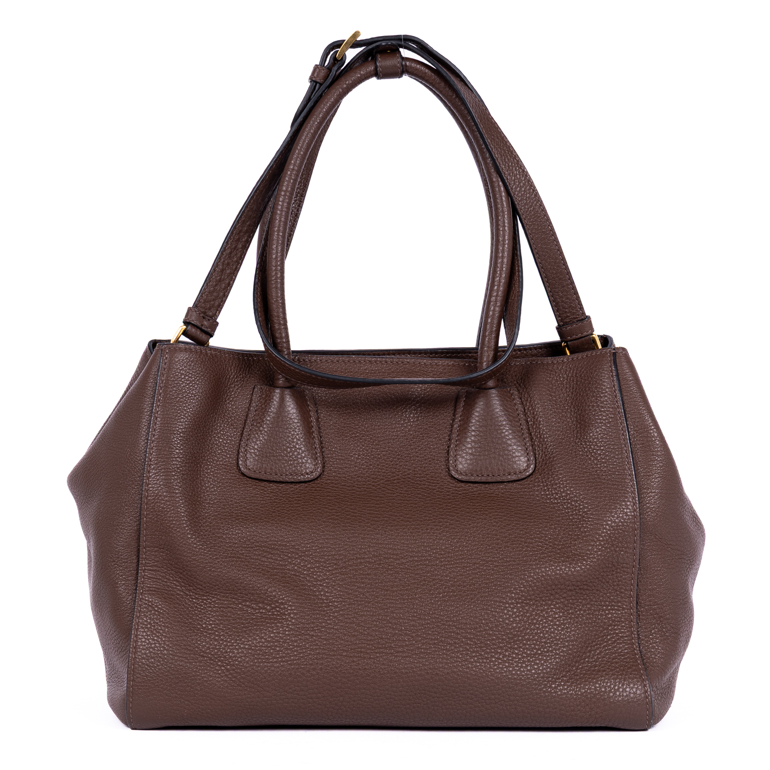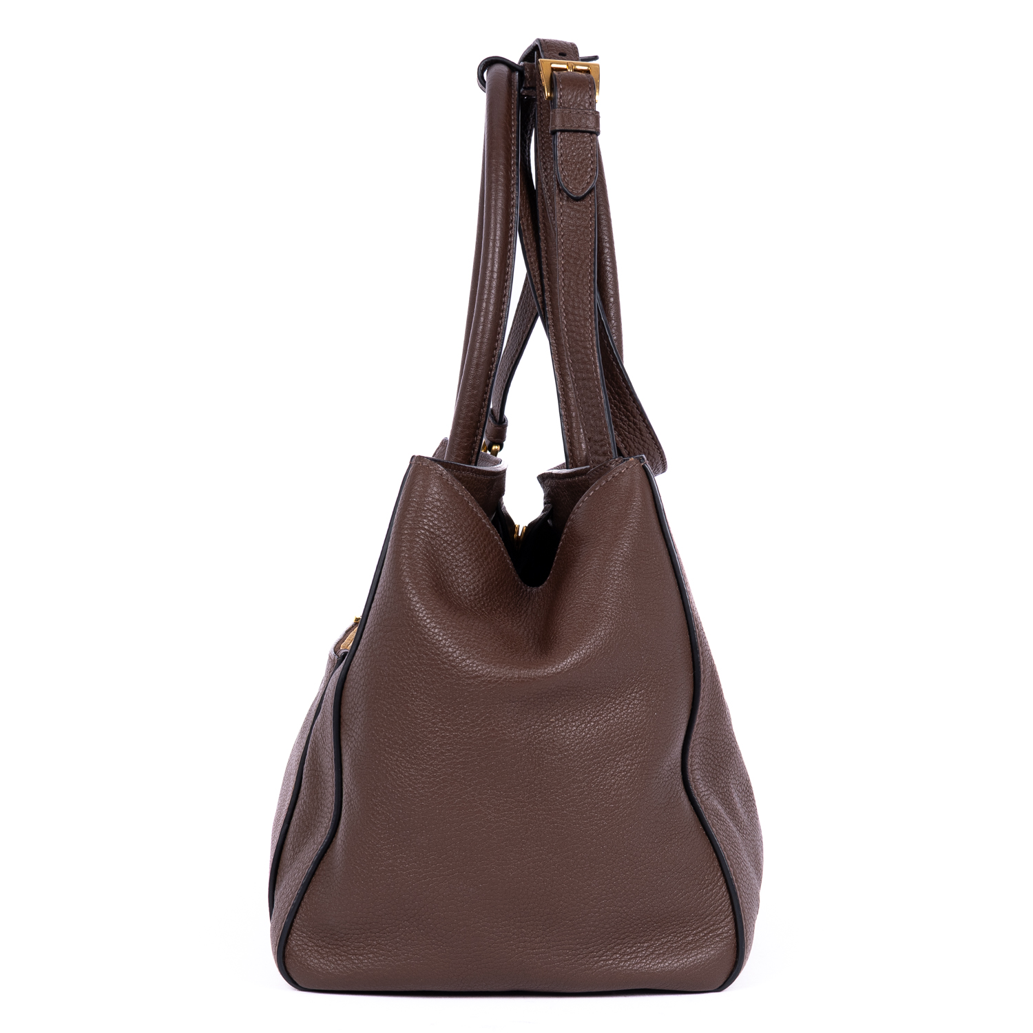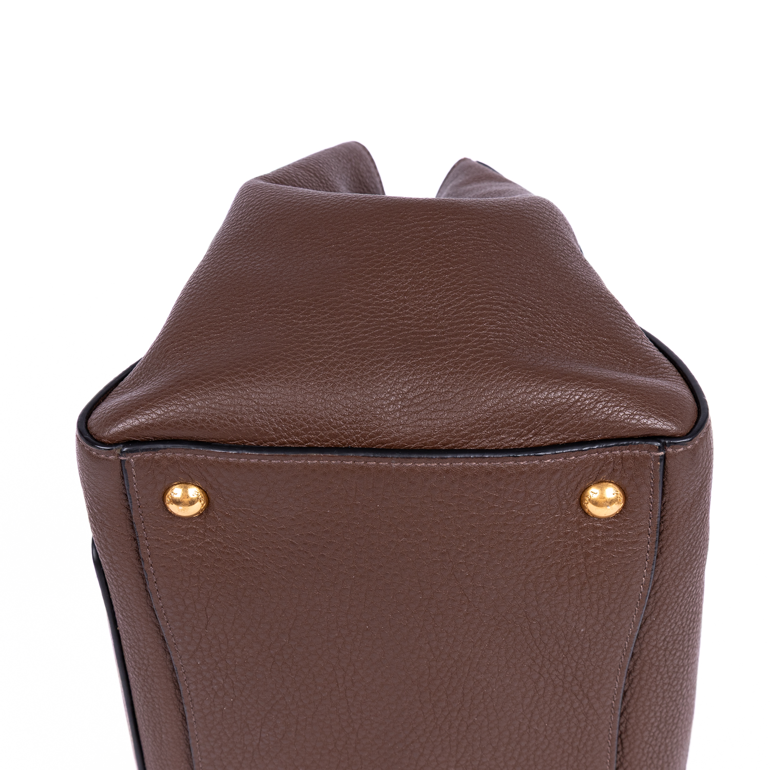 Prada Shoulder Bag Front Zip Pocket Shopping Tote in Brown Vitello Daino Leather and Gold hardware. The product is in Excellent Condition (A).