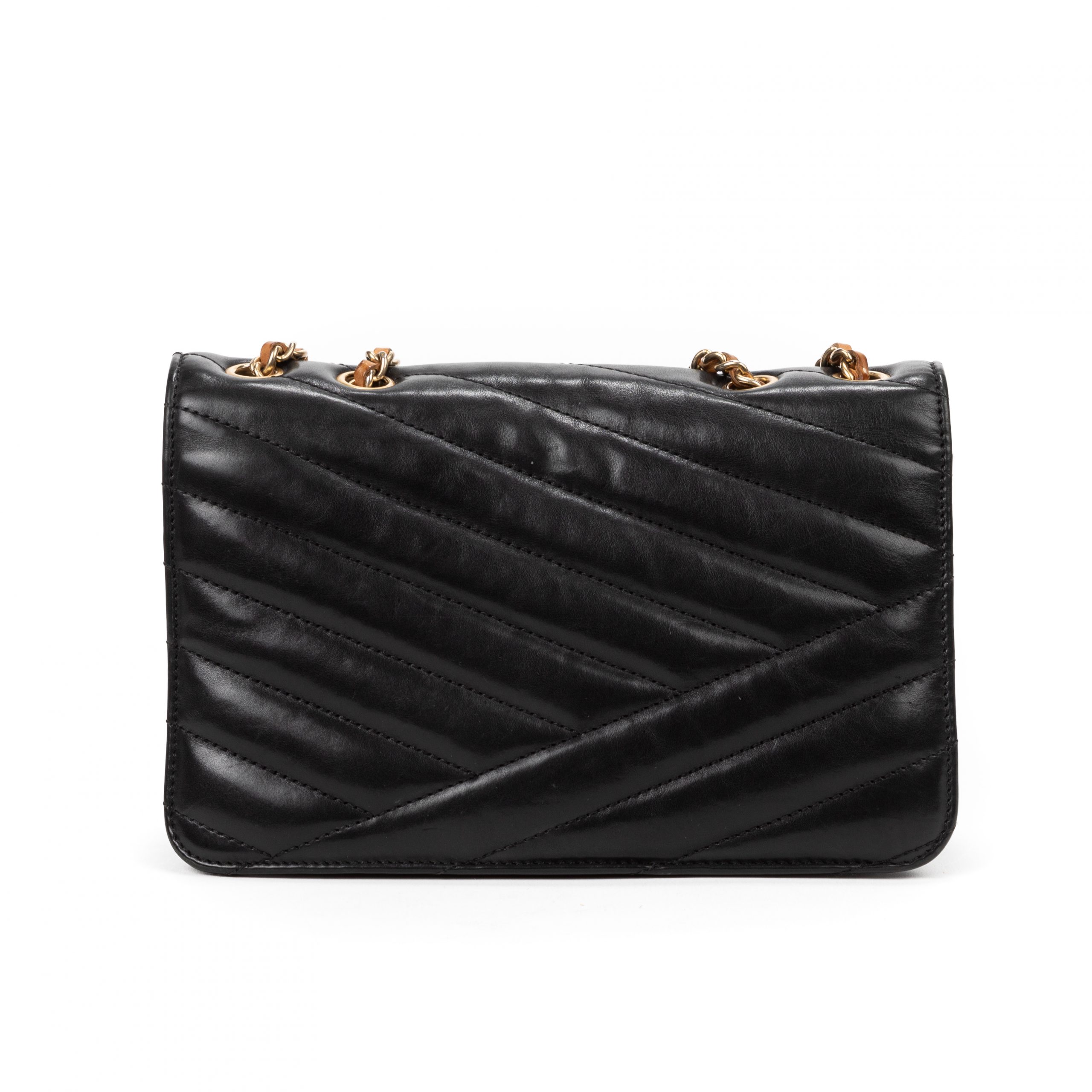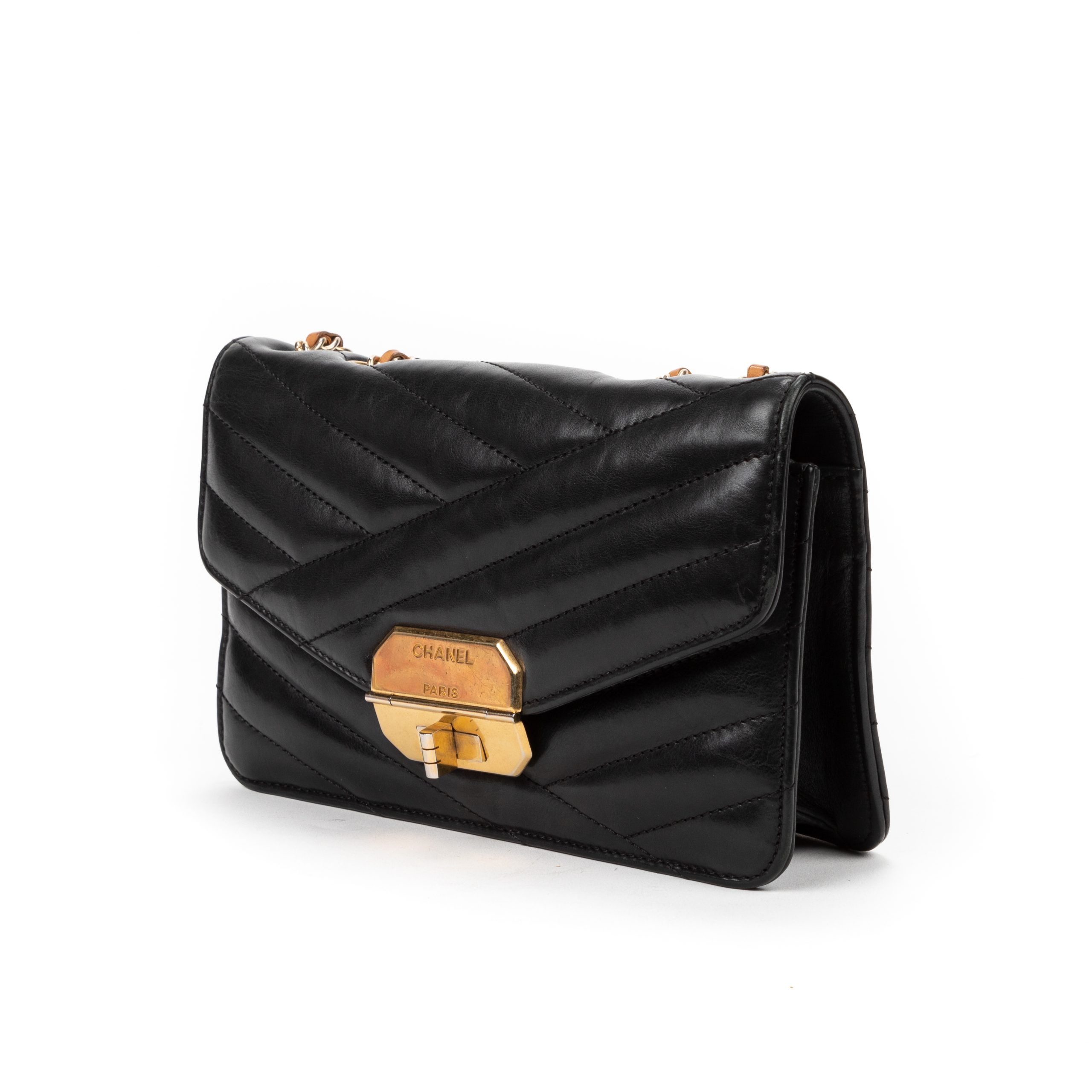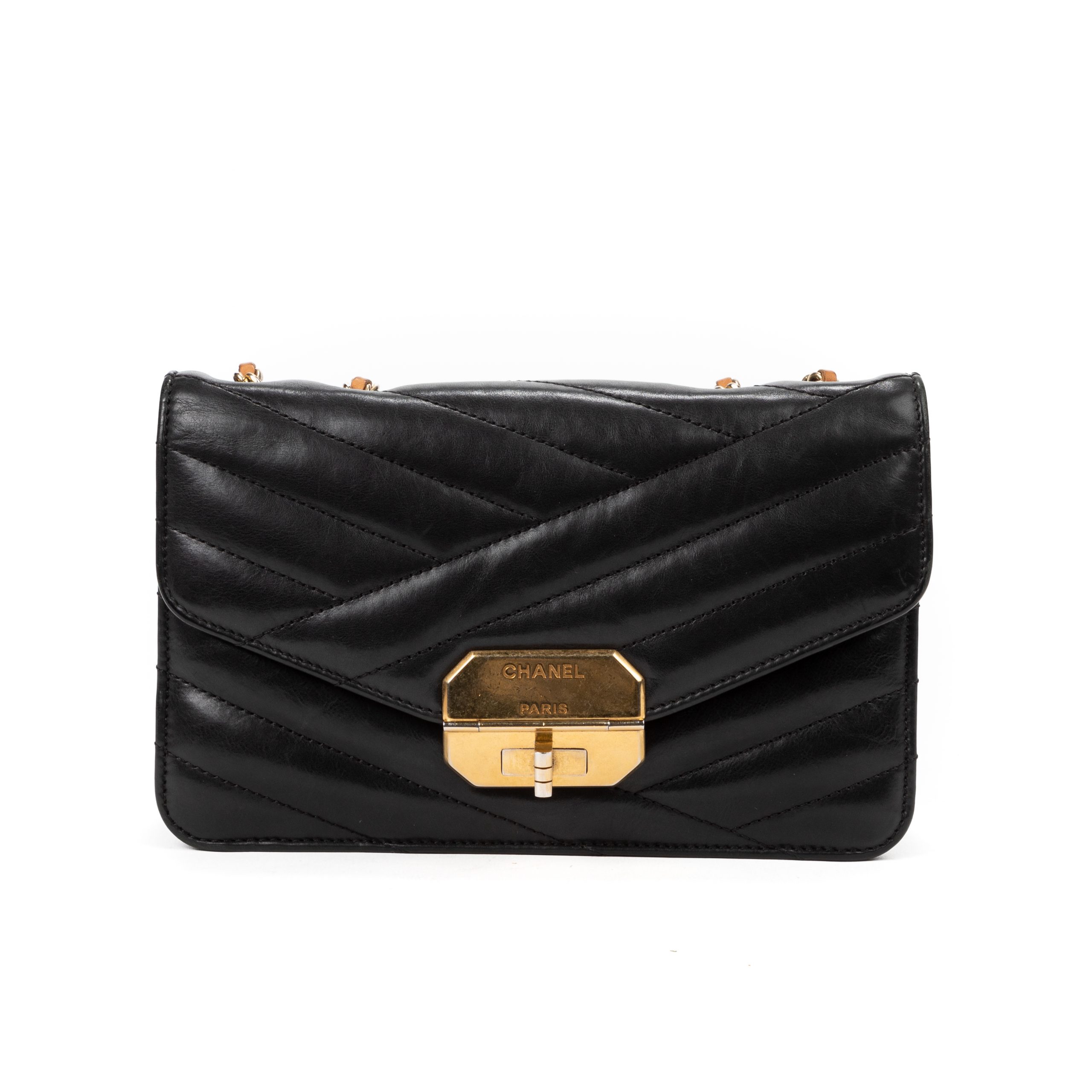 Chanel Shoulder Bag Gabrielle Flap Small in Black Chevron Leather and Gold hardware. The product is in Very Good Condition (AB).