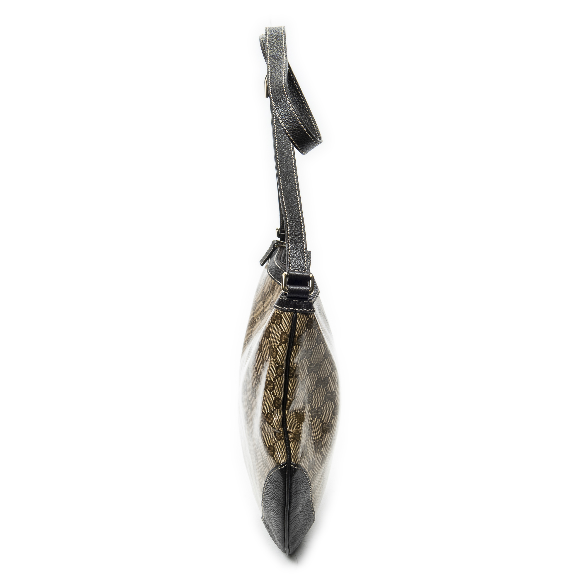 Gucci Shoulder Bag Half Moon Messenger in Dark Brown/Beige Monogrammed Crystal Coated Canvas and Gold hardware. The product is in Perfect Condition (AA).