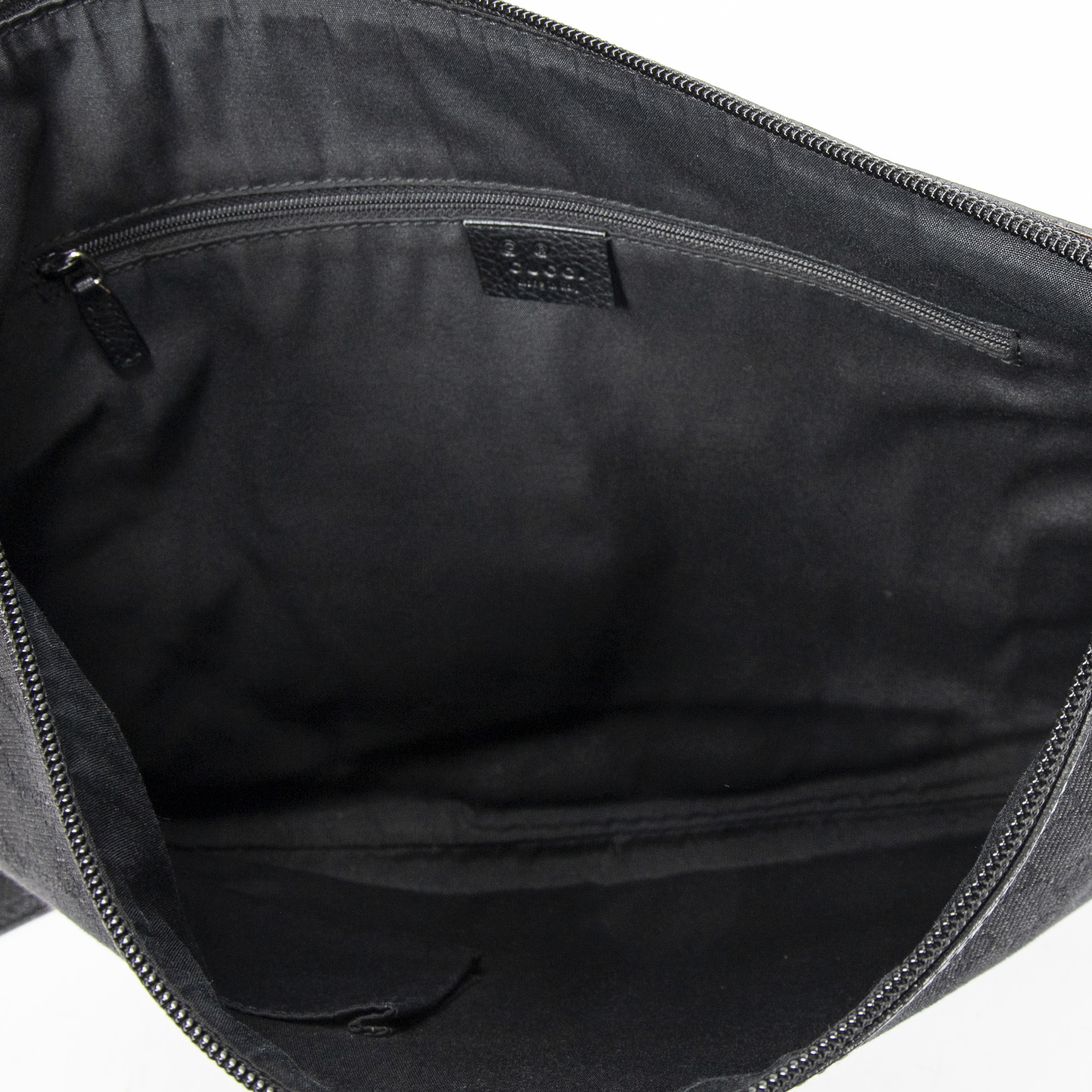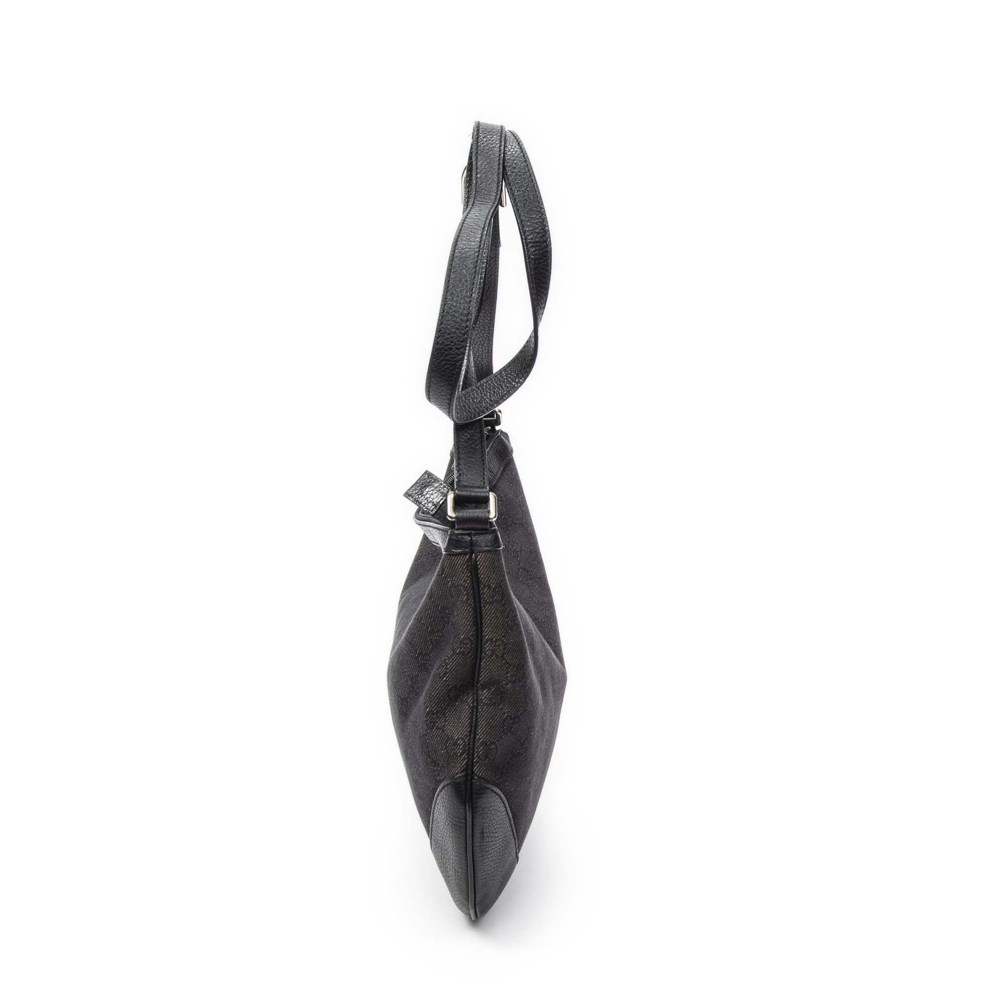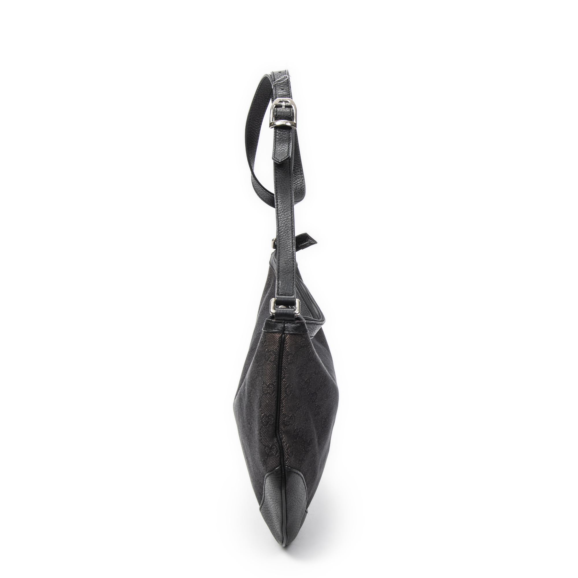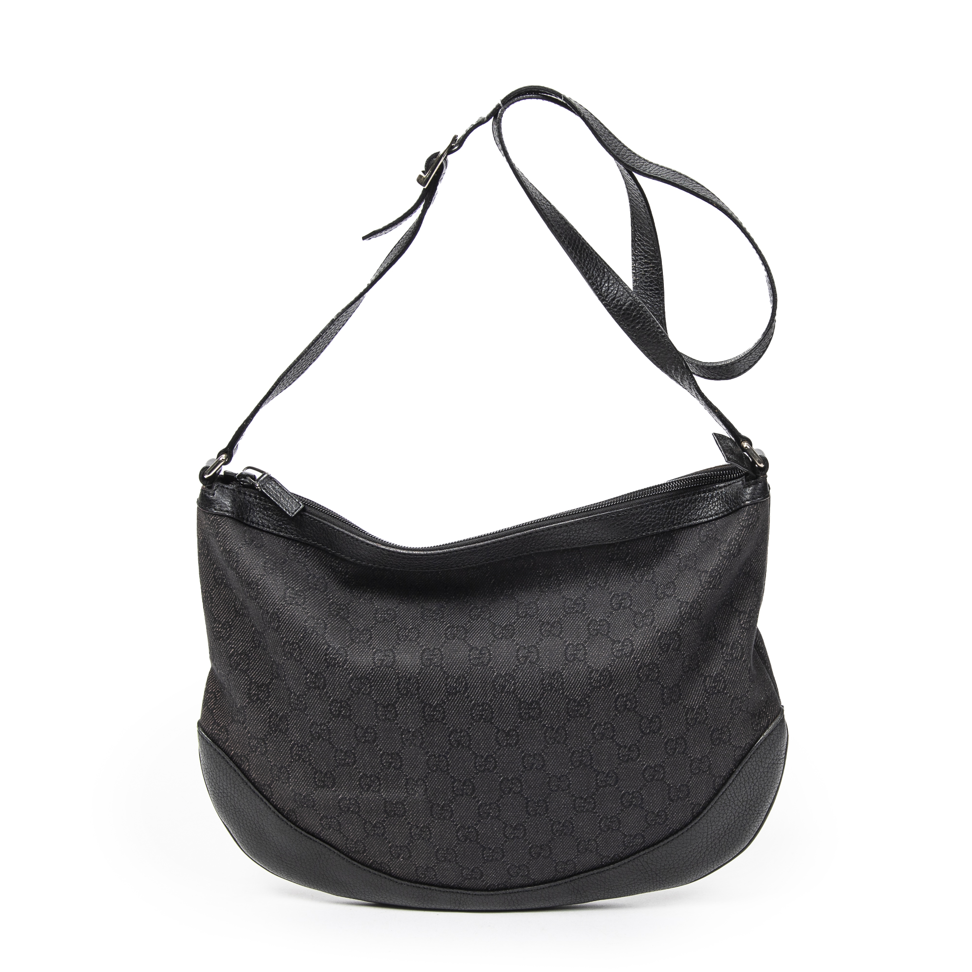 Gucci Shoulder Bag Half Moon Messenger in Black Monogrammed Denim Canvas and Silver hardware. The product is in Excellent Condition (A).