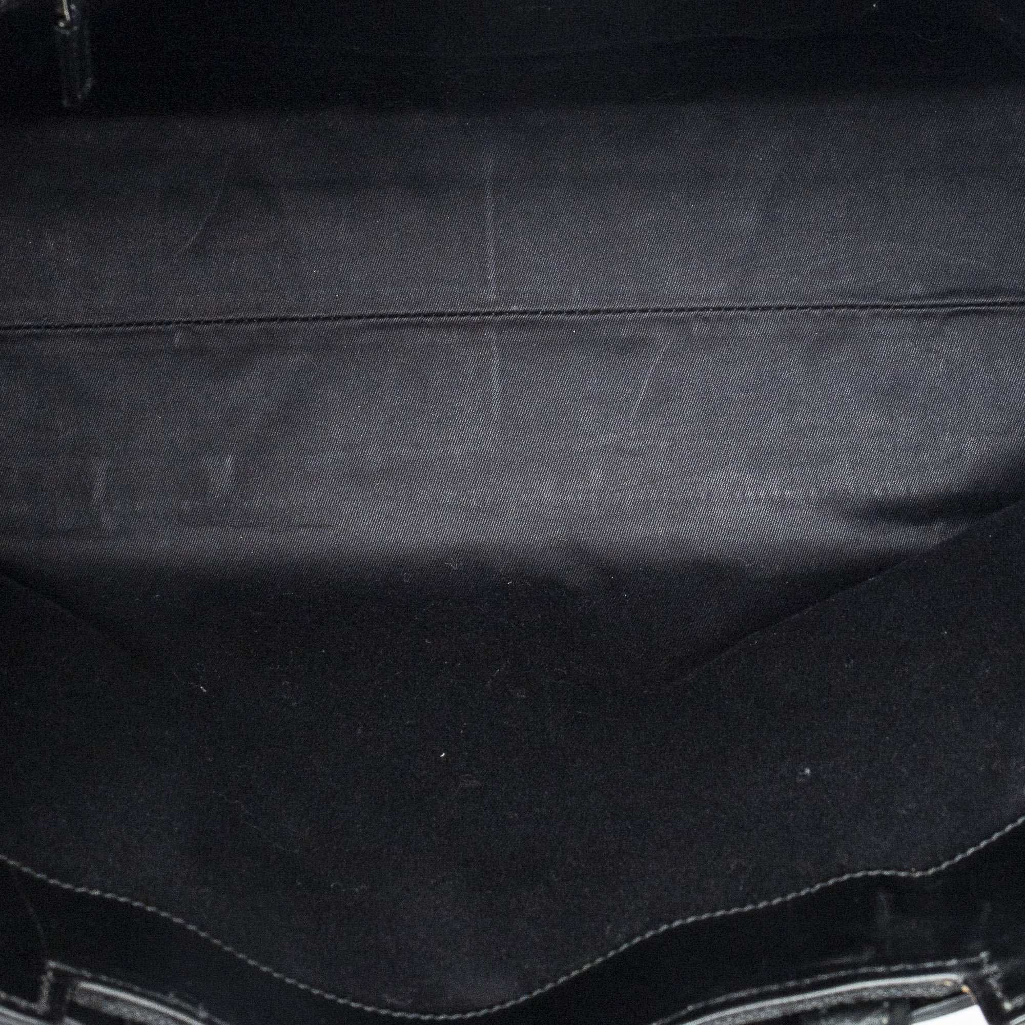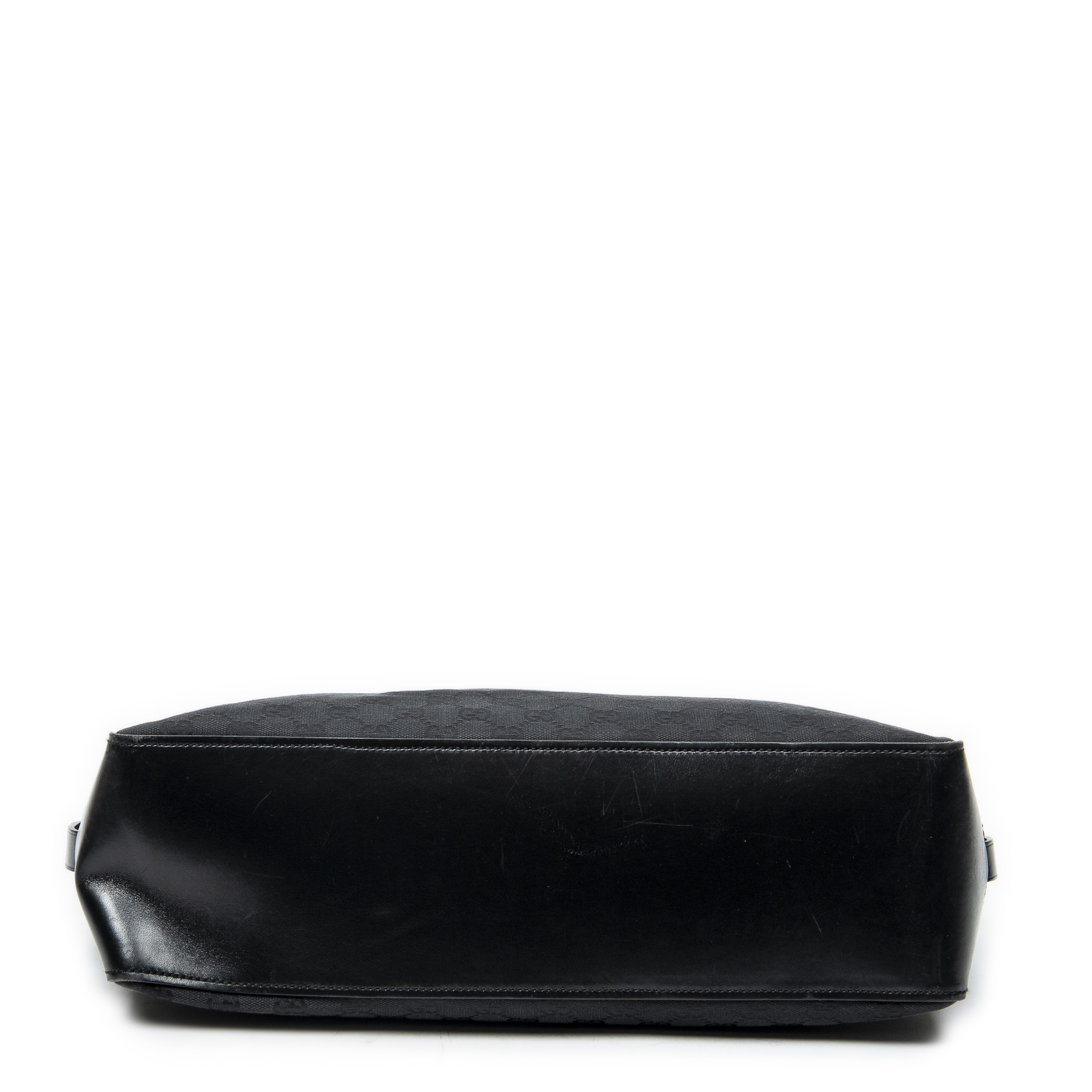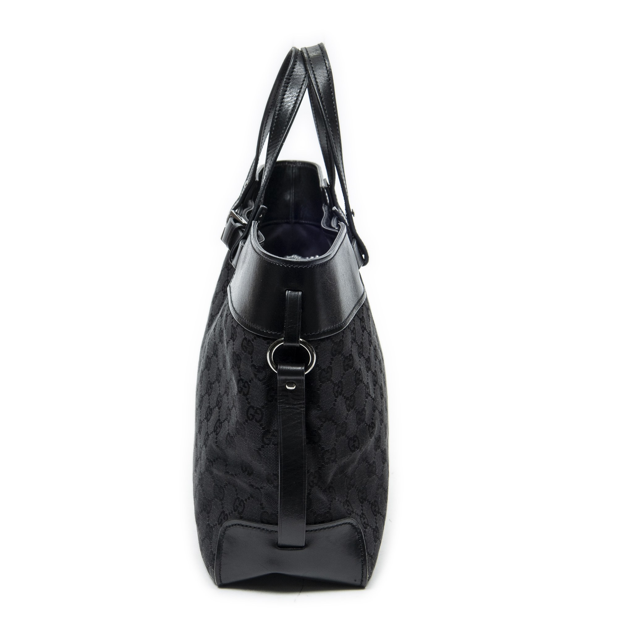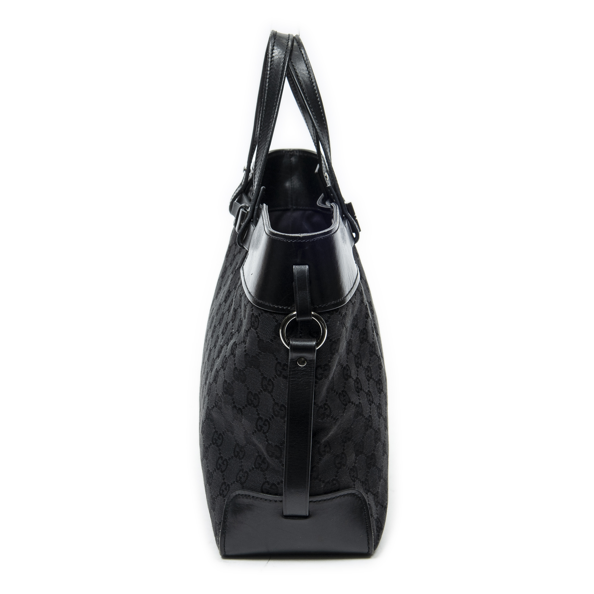 Gucci Shoulder Bag Horizontal Belt Tote in Black Monogrammed Canvas and Silver hardware. The product is in Excellent Condition (A).