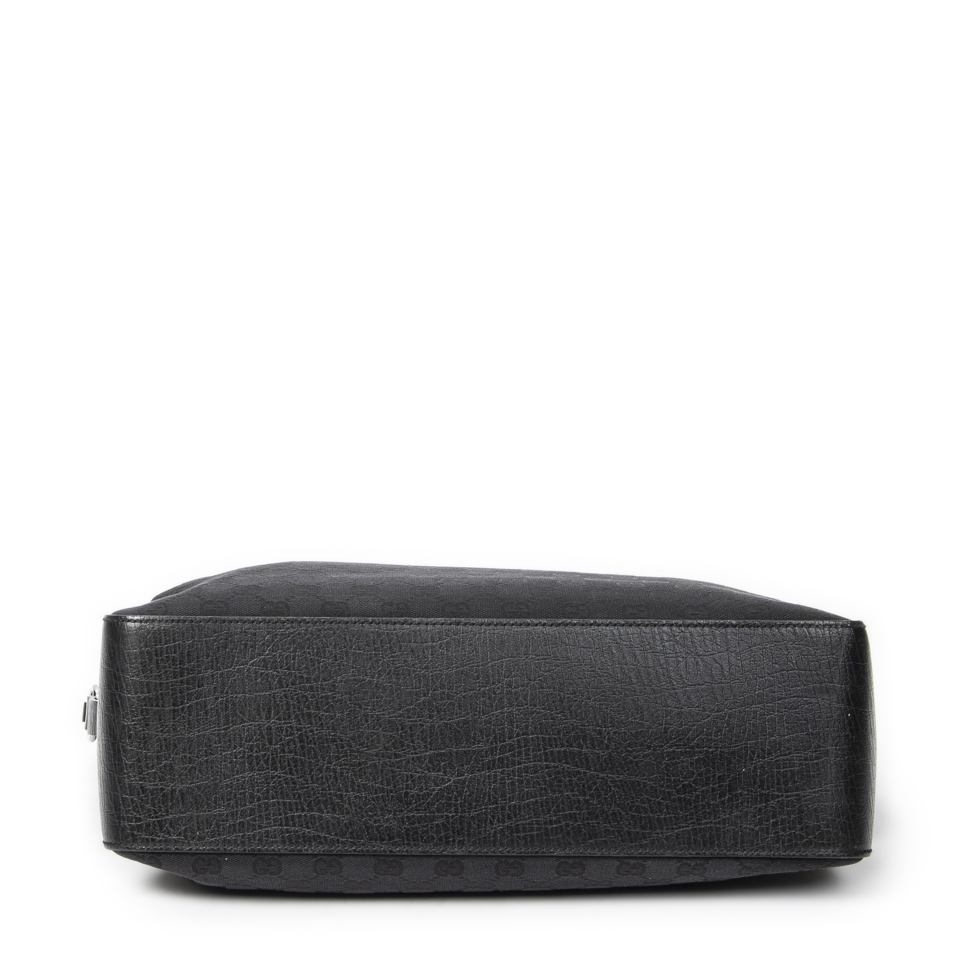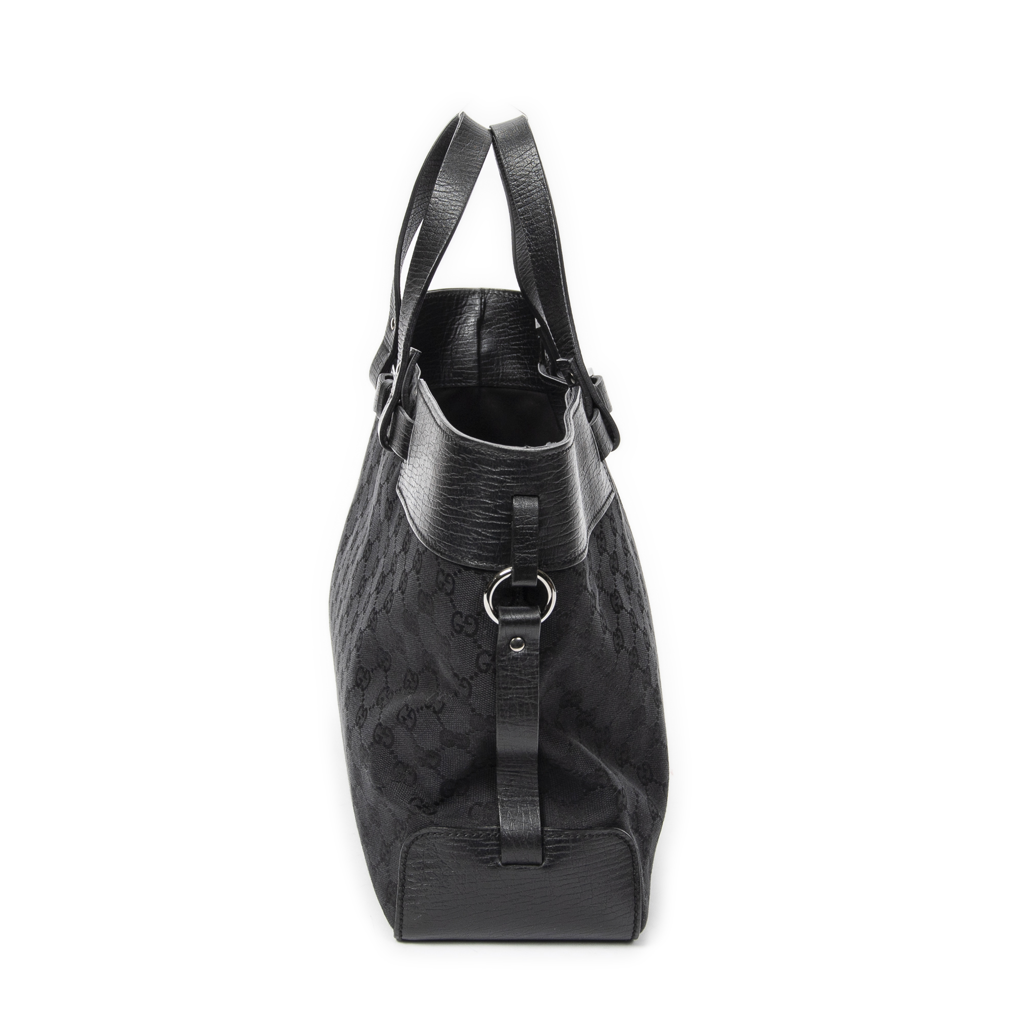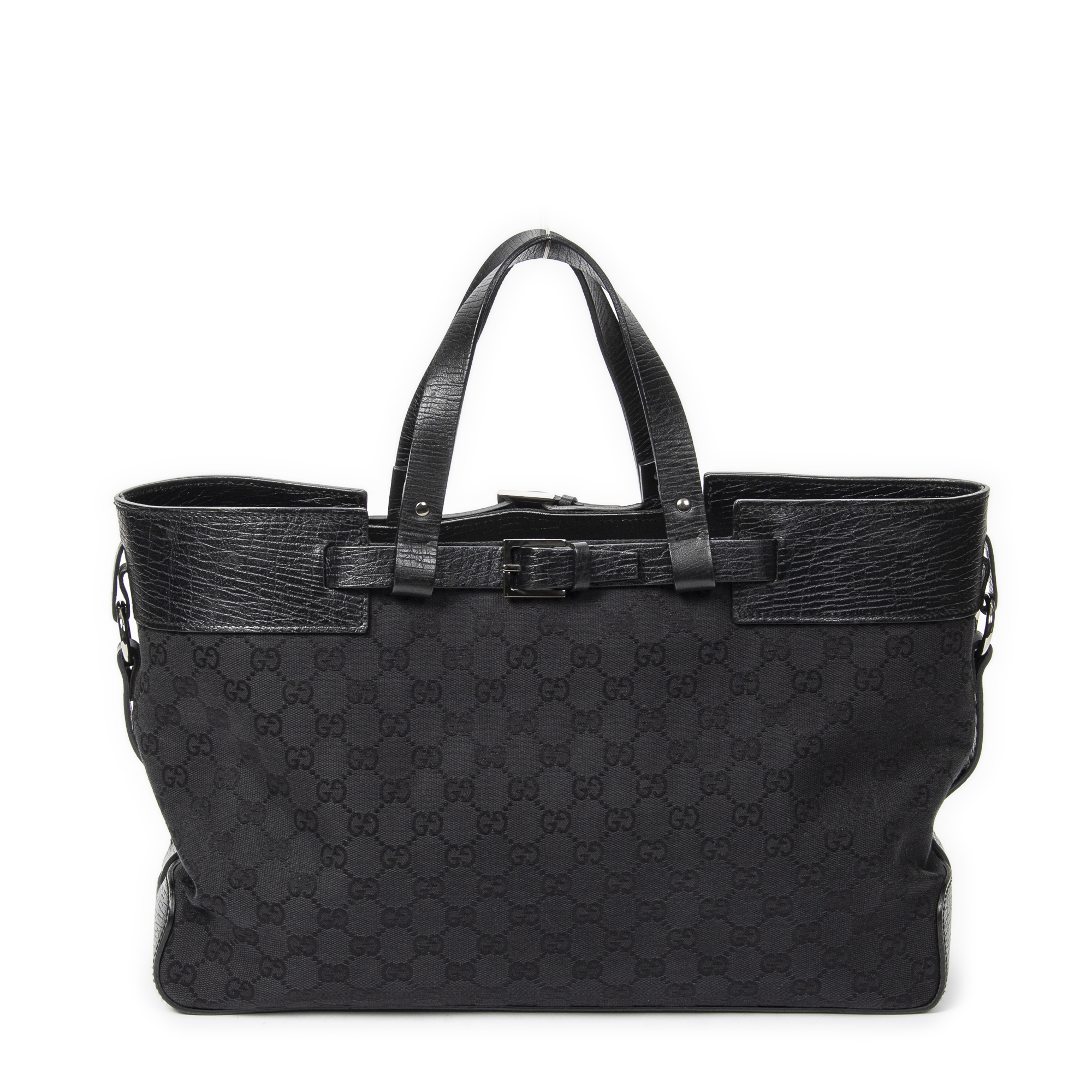 Gucci Shoulder Bag Horizontal Belt Tote in Black Monogrammed Canvas and Silver hardware. The product is in Excellent Condition (A).