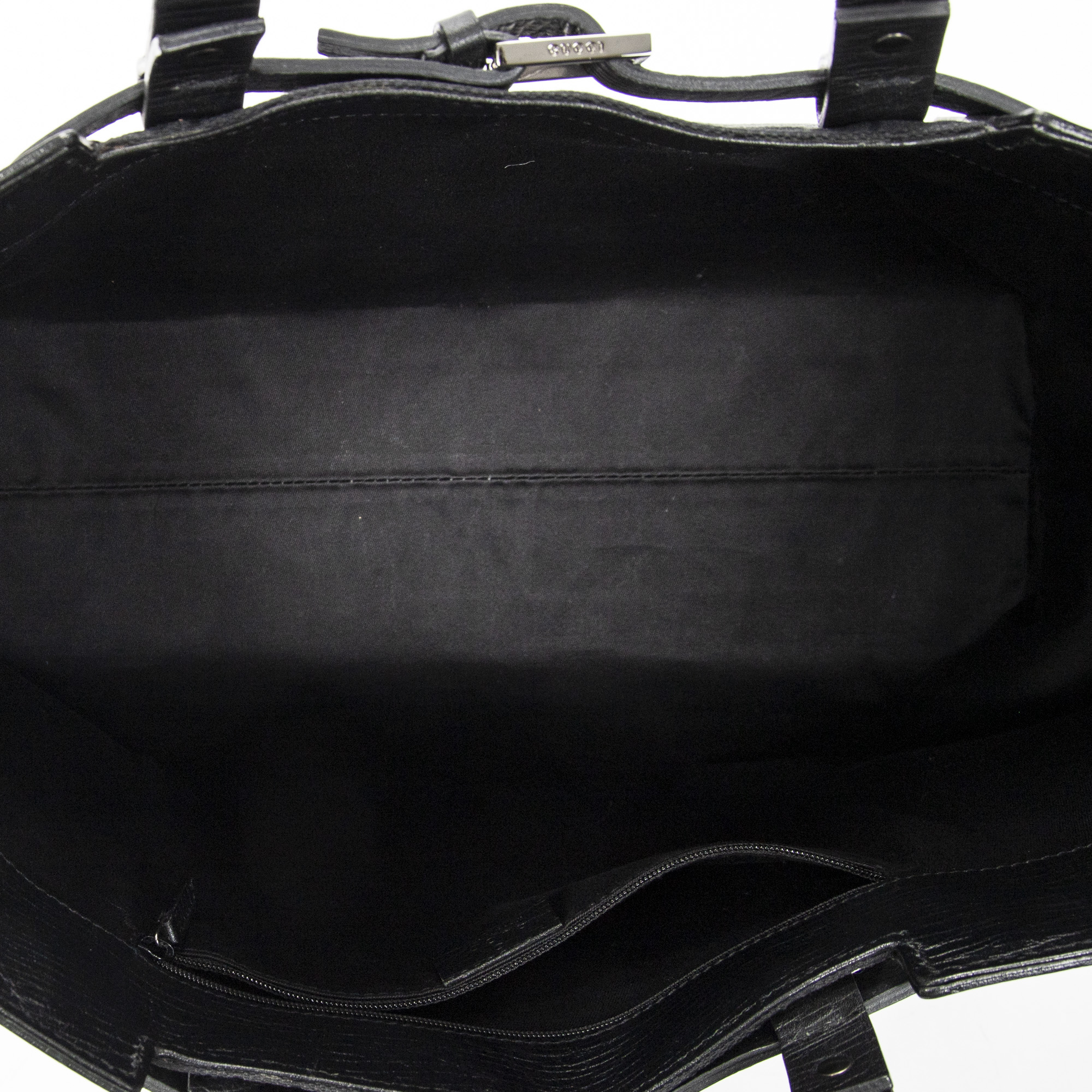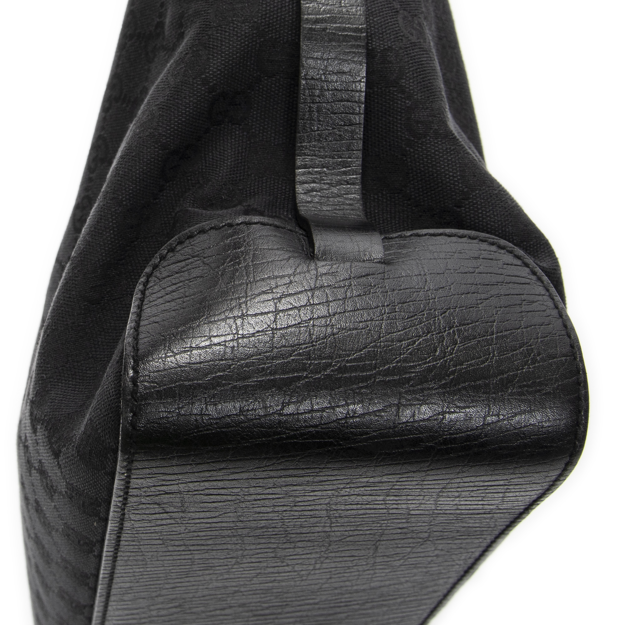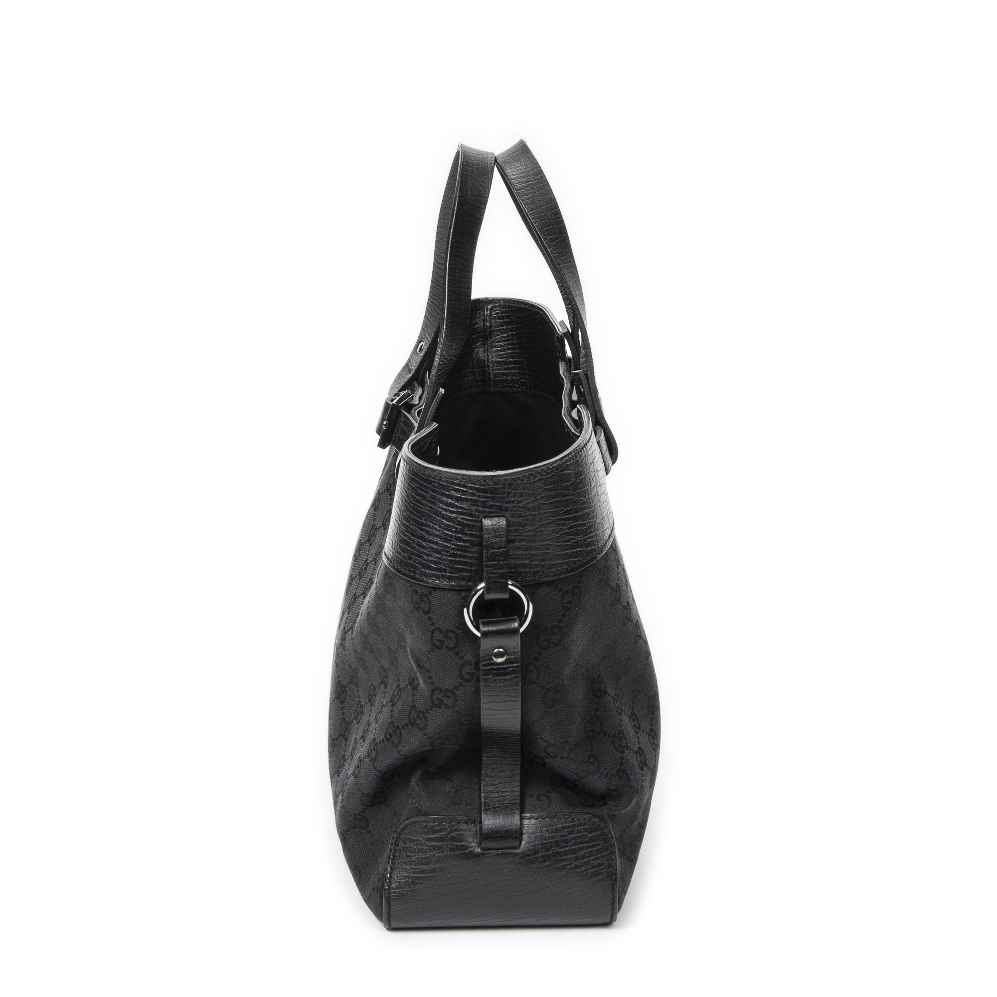 Gucci Shoulder Bag Horizontal Belt Tote in Black Monogrammed Canvas and Silver hardware. The product is in Excellent Condition (A).