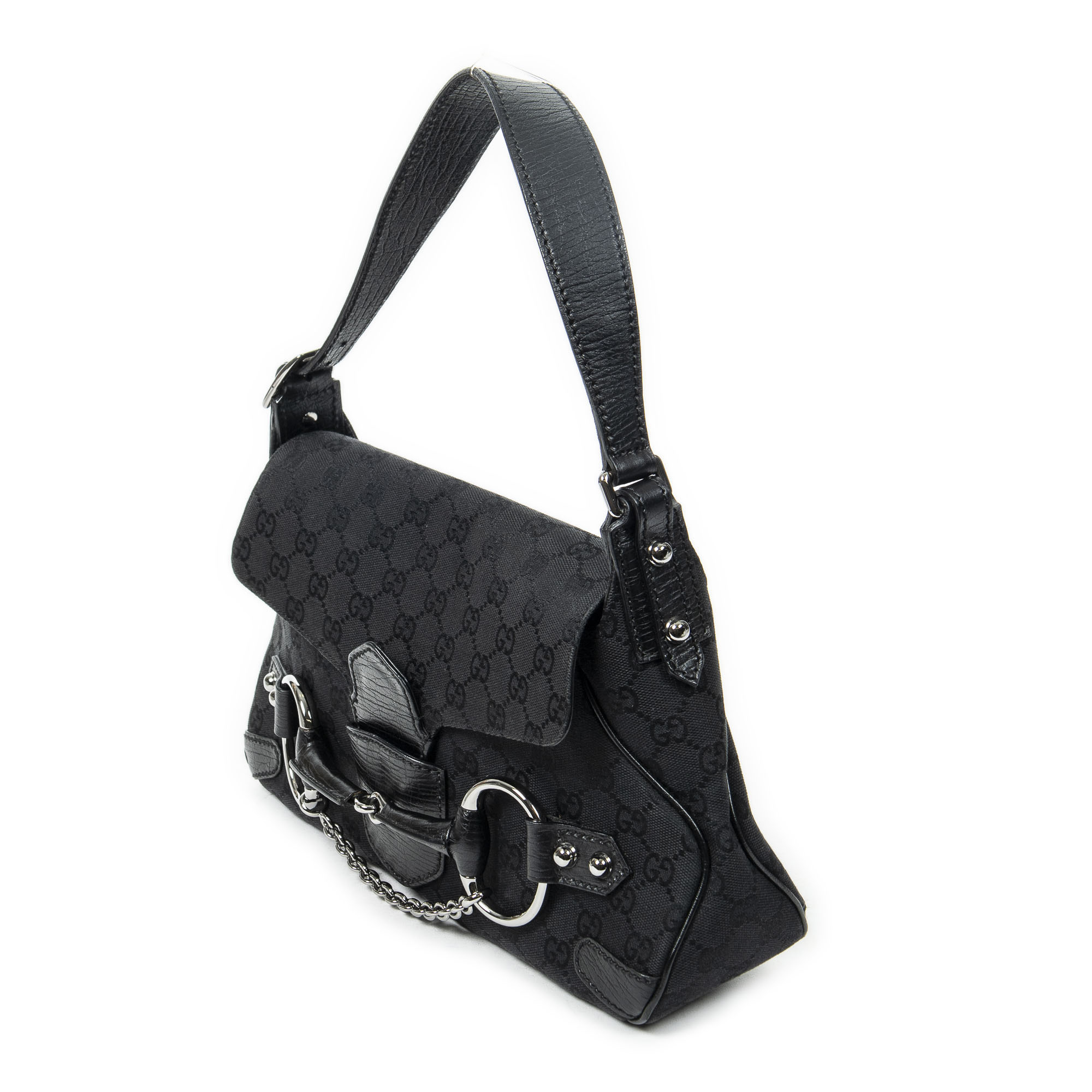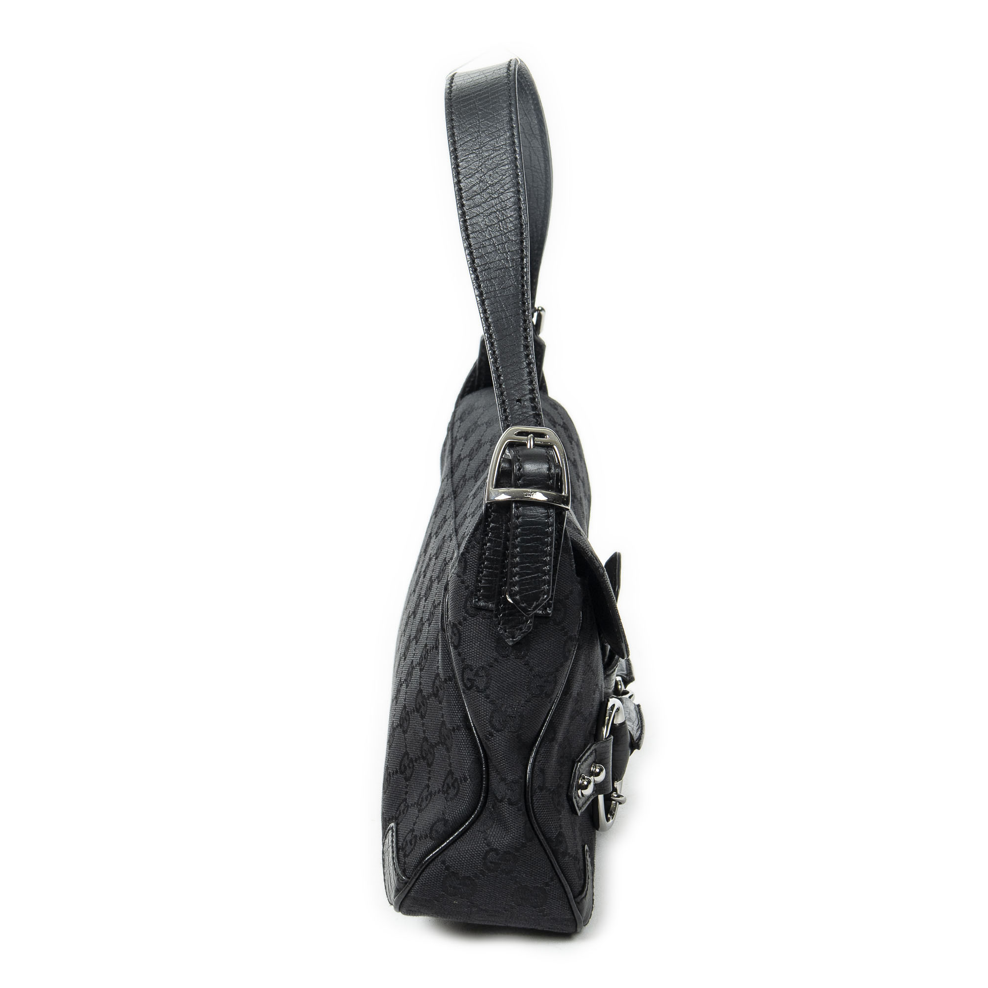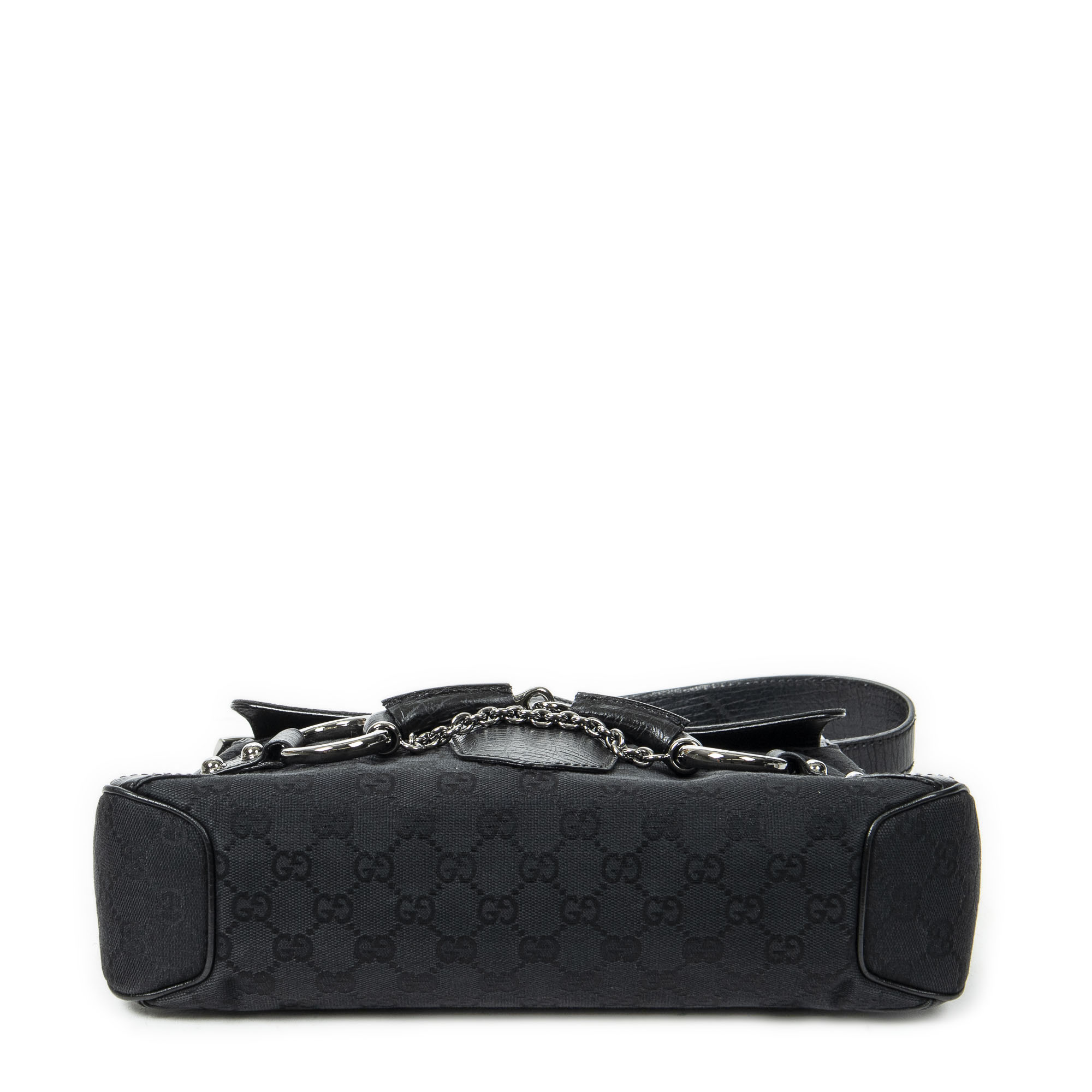 Gucci Shoulder Bag Horsebit Chain Shoulder Flap in Black Monogrammed Canvas and Ruthenium hardware. The product is in Excellent Condition (A).