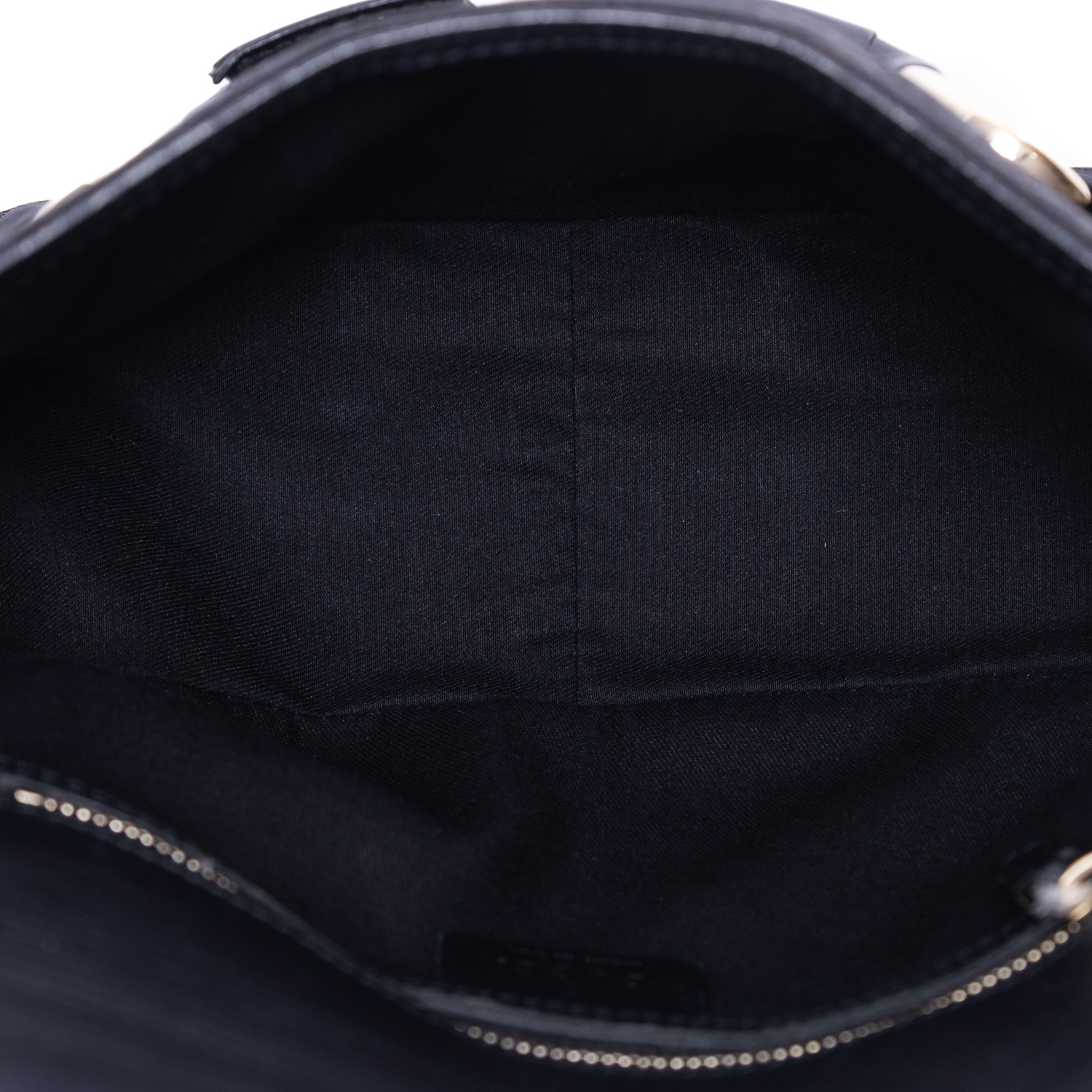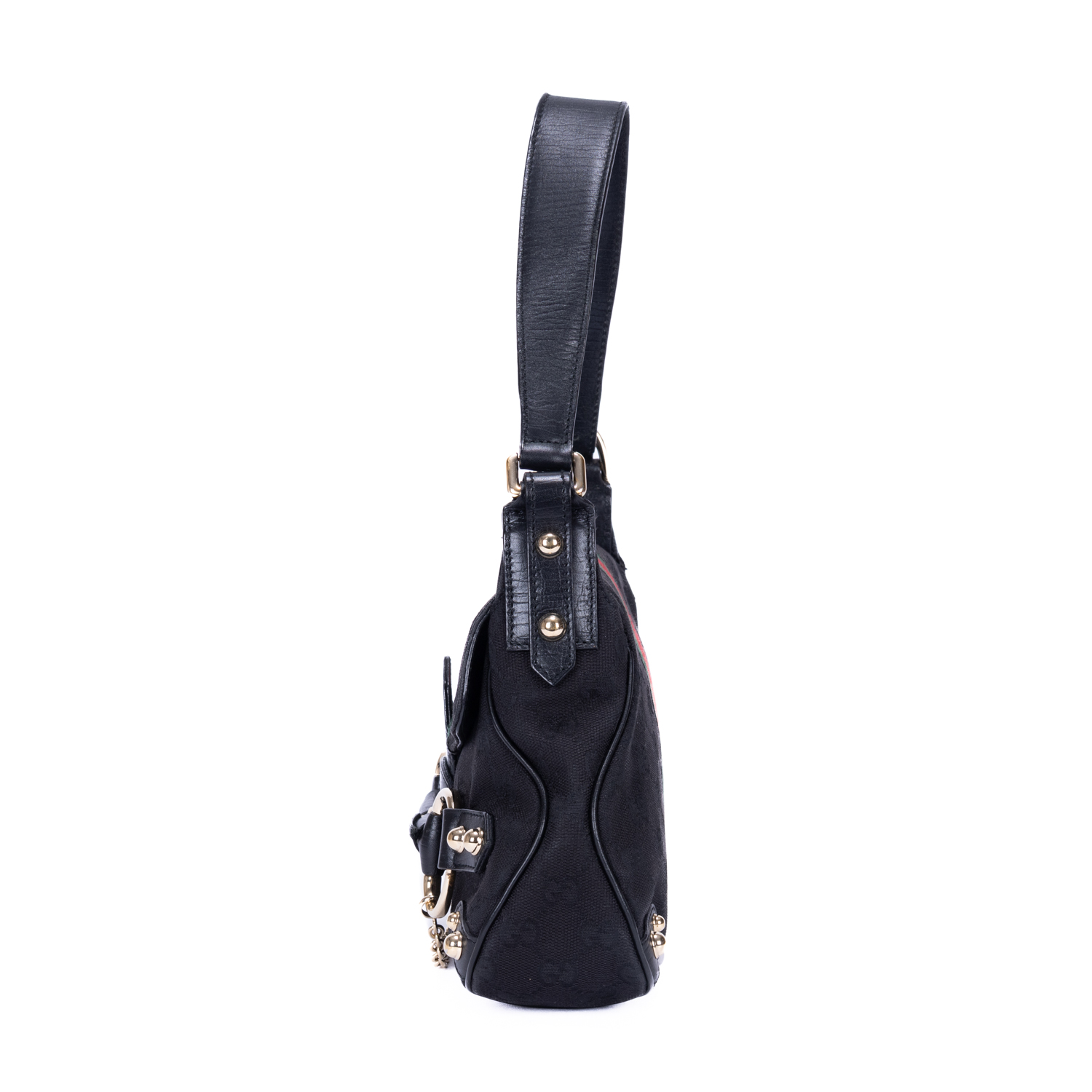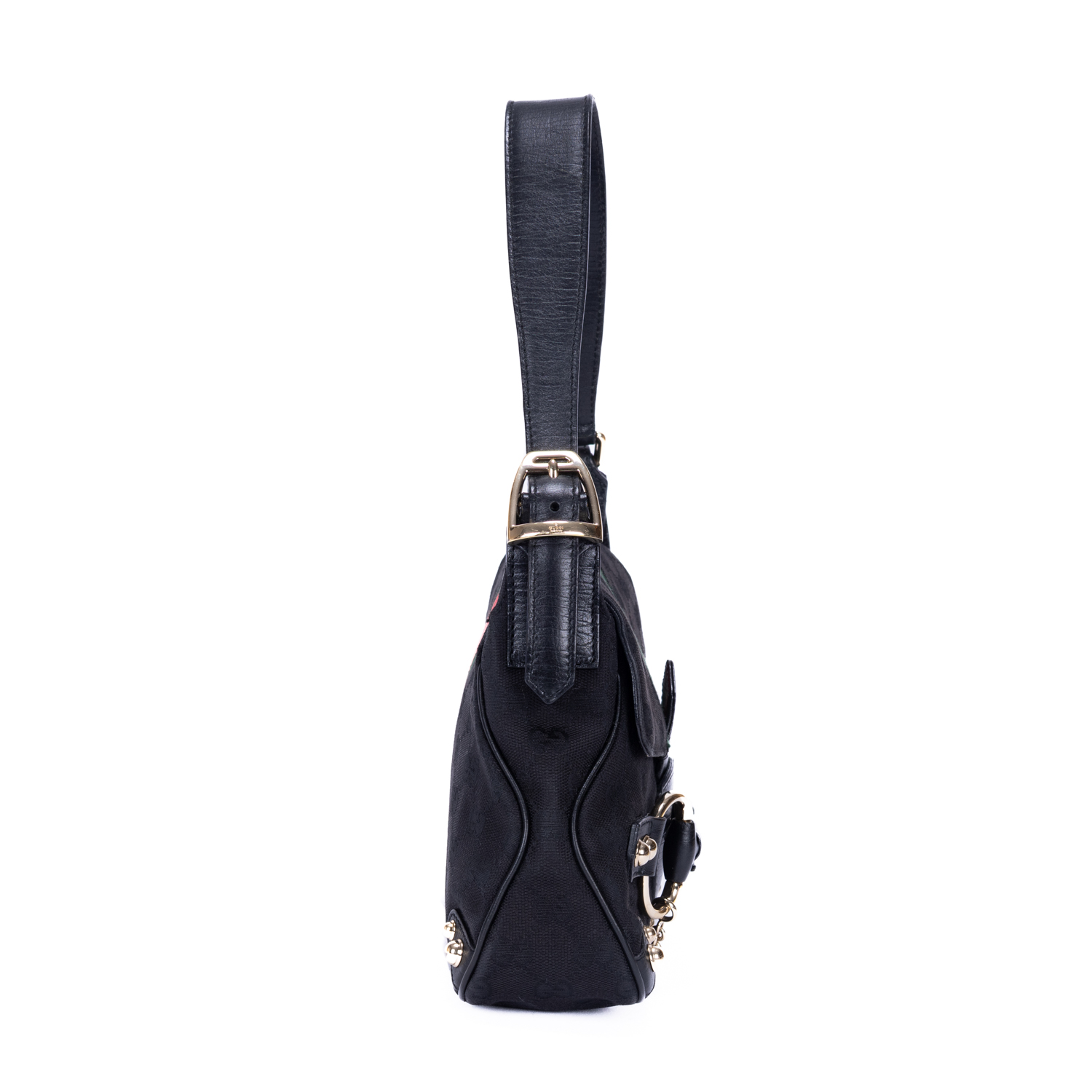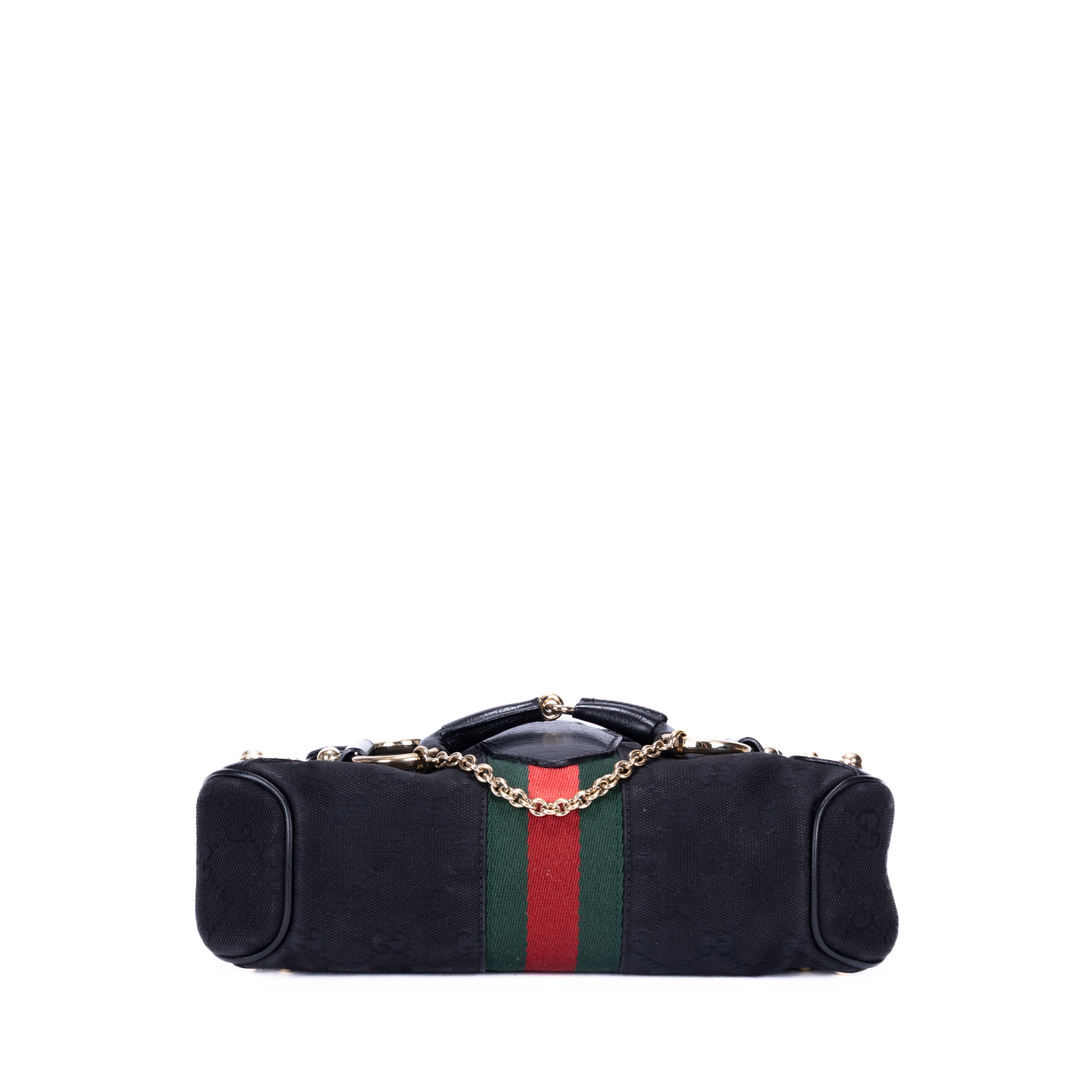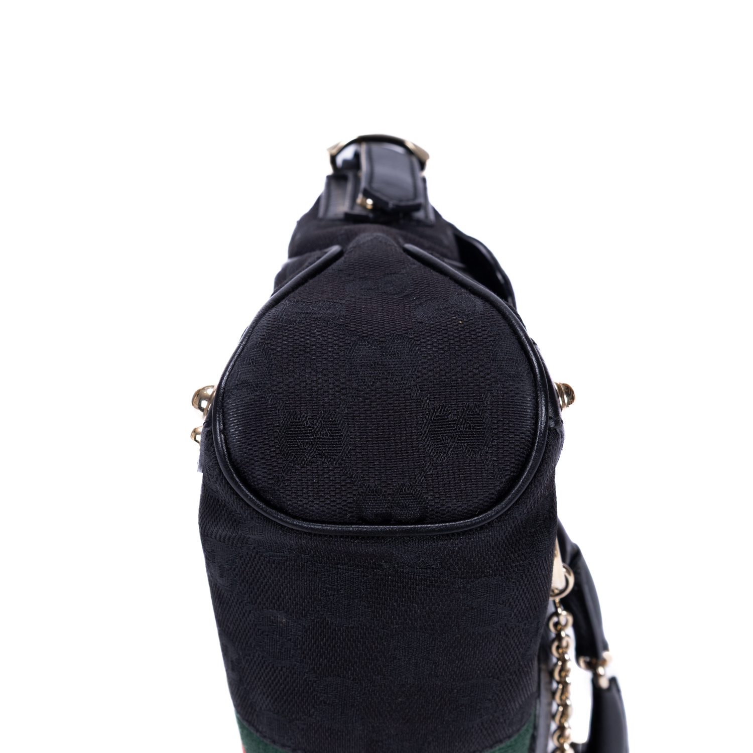 Gucci Shoulder Bag Horsebit Chain Web Flap in Black GG Monogram Canvas and Champagne Gold hardware. The product is in Excellent Condition (A).