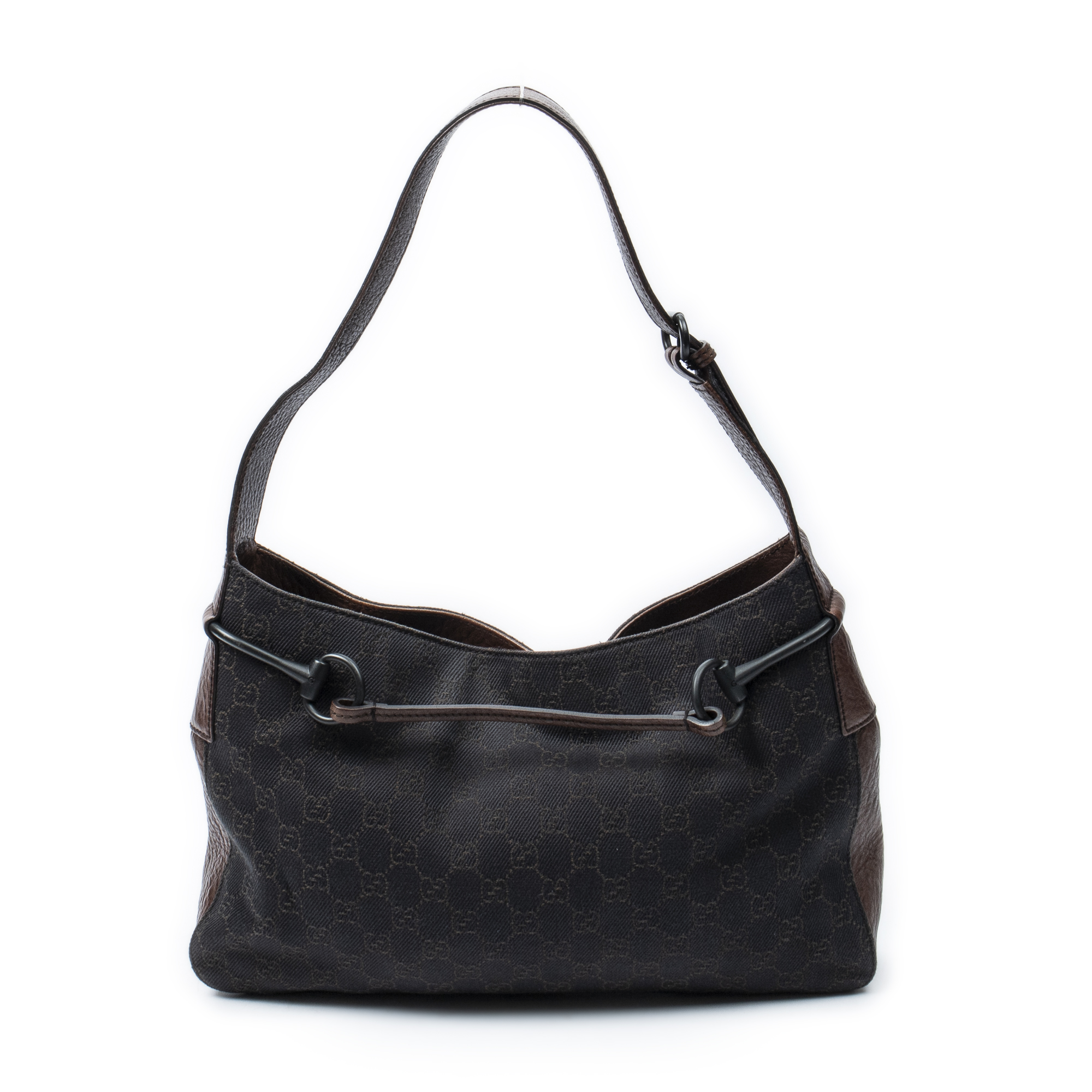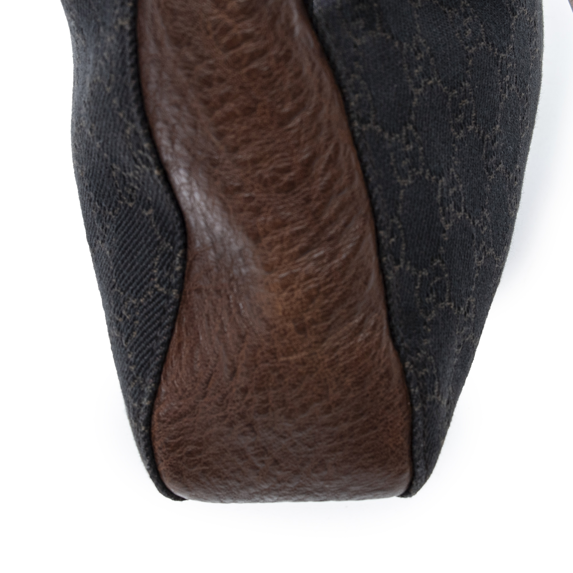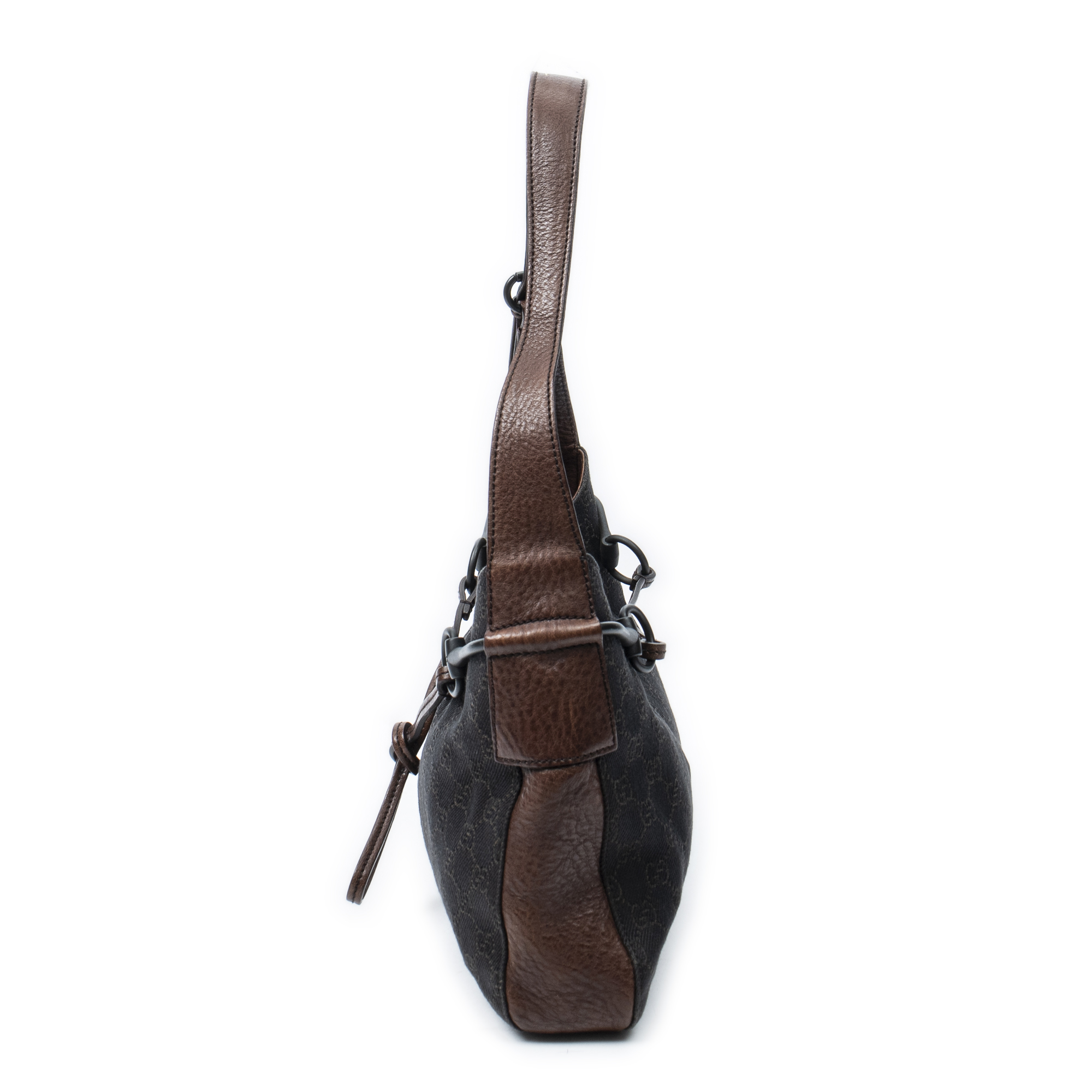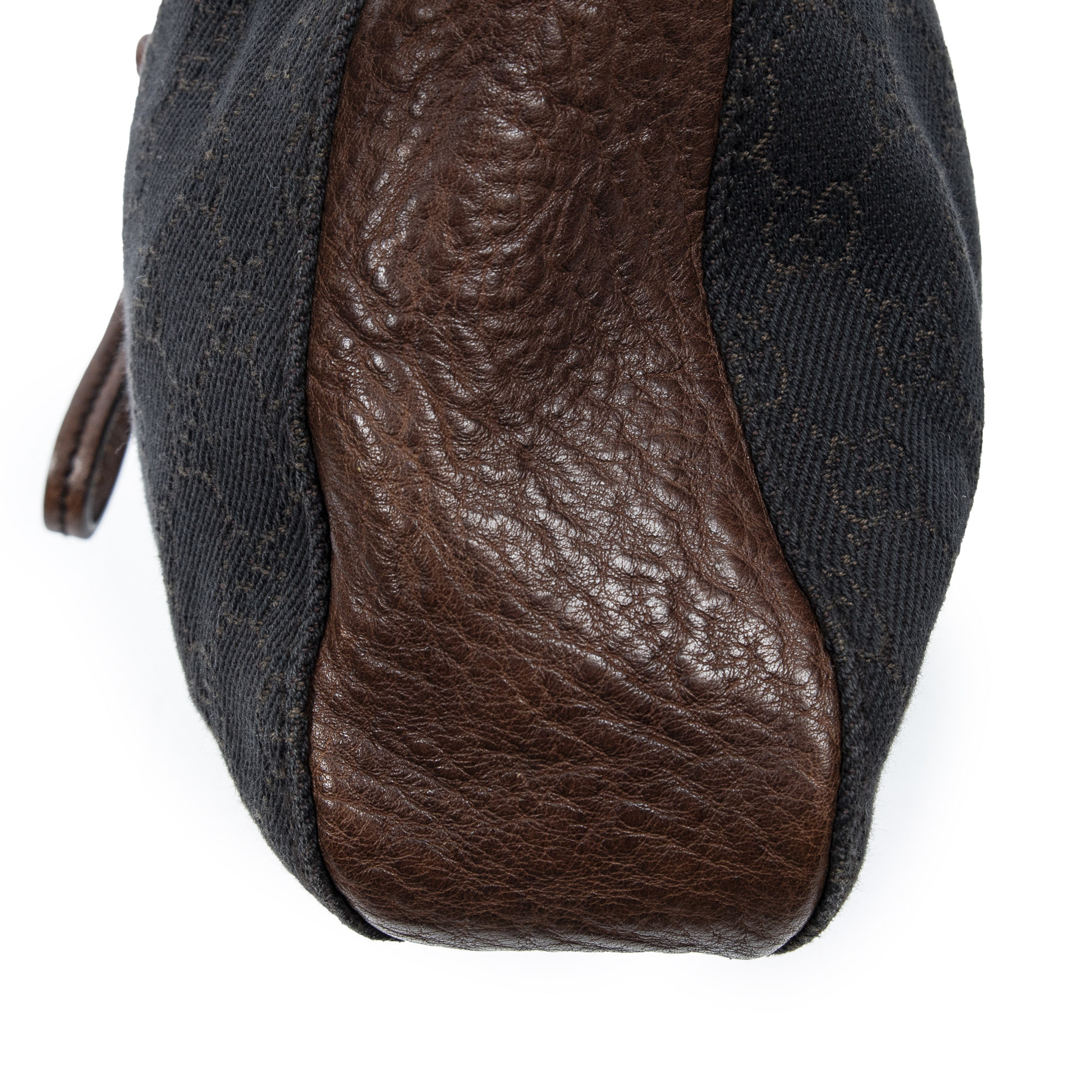 Gucci Shoulder Bag Horsebit Drawstring Hobo in Dark Brown Monogrammed Denim Canvas and Black Metal hardware. The product is in Excellent Condition (A).