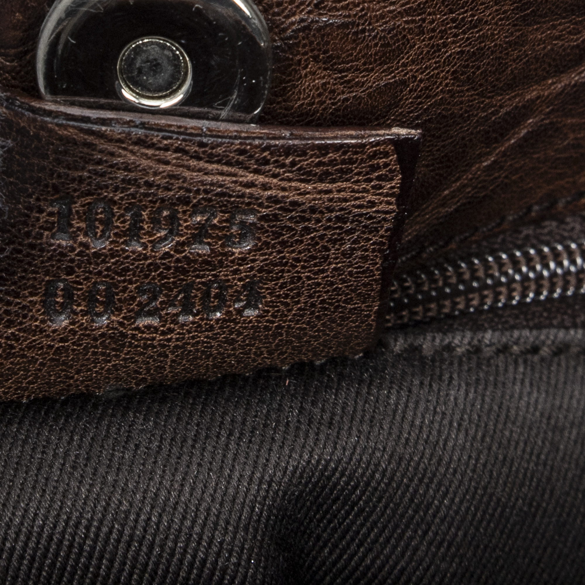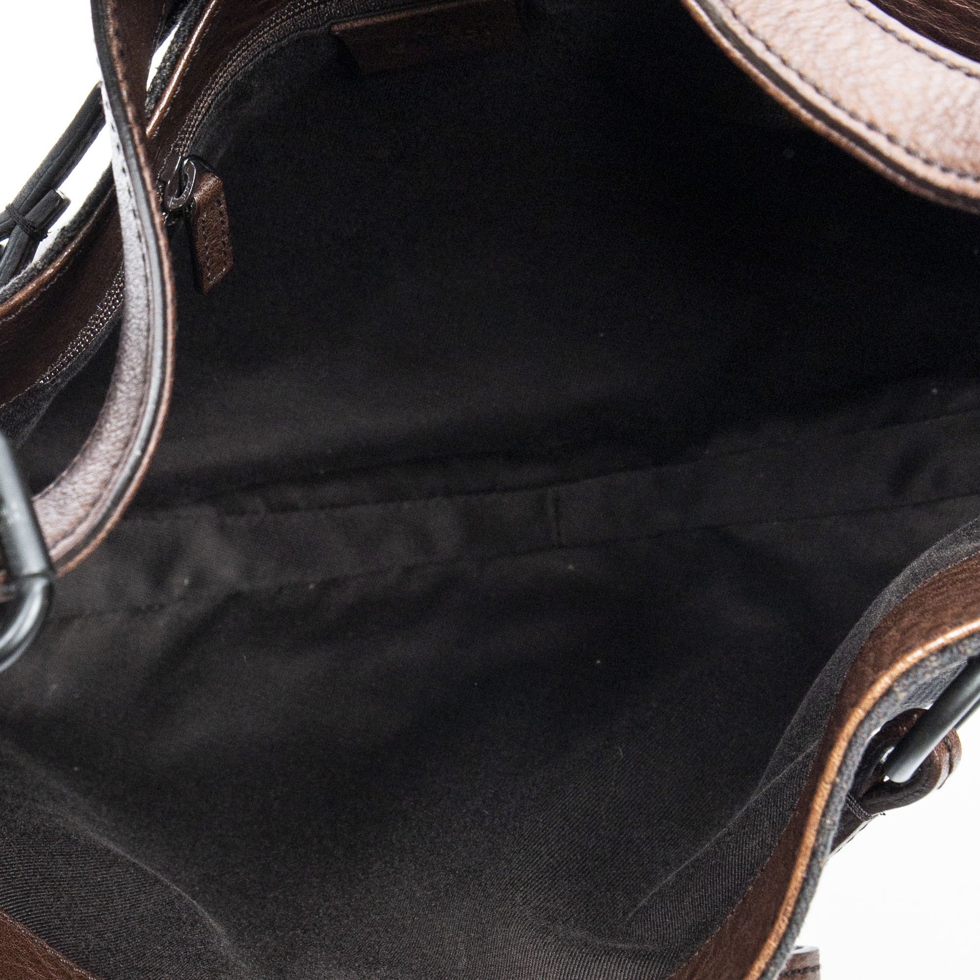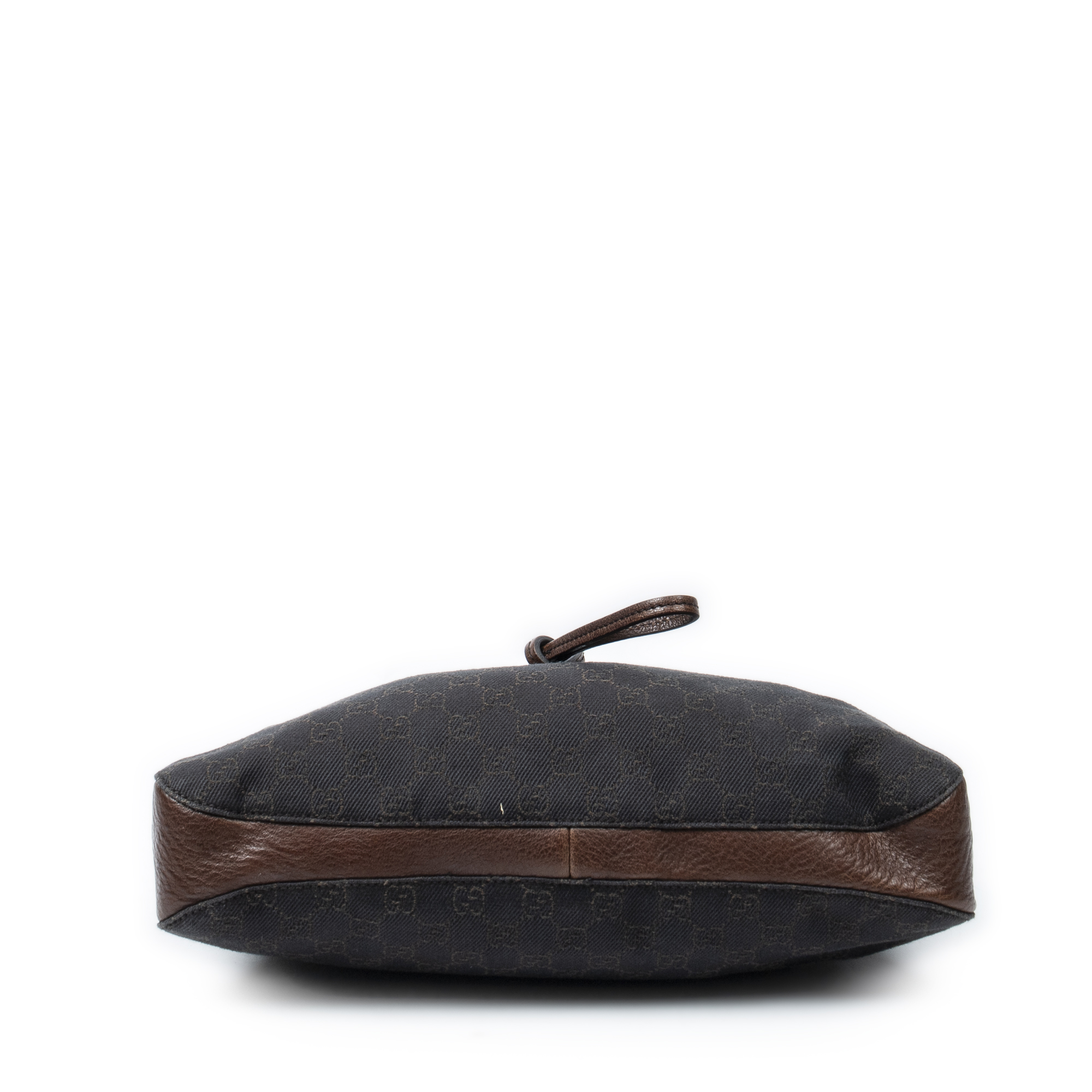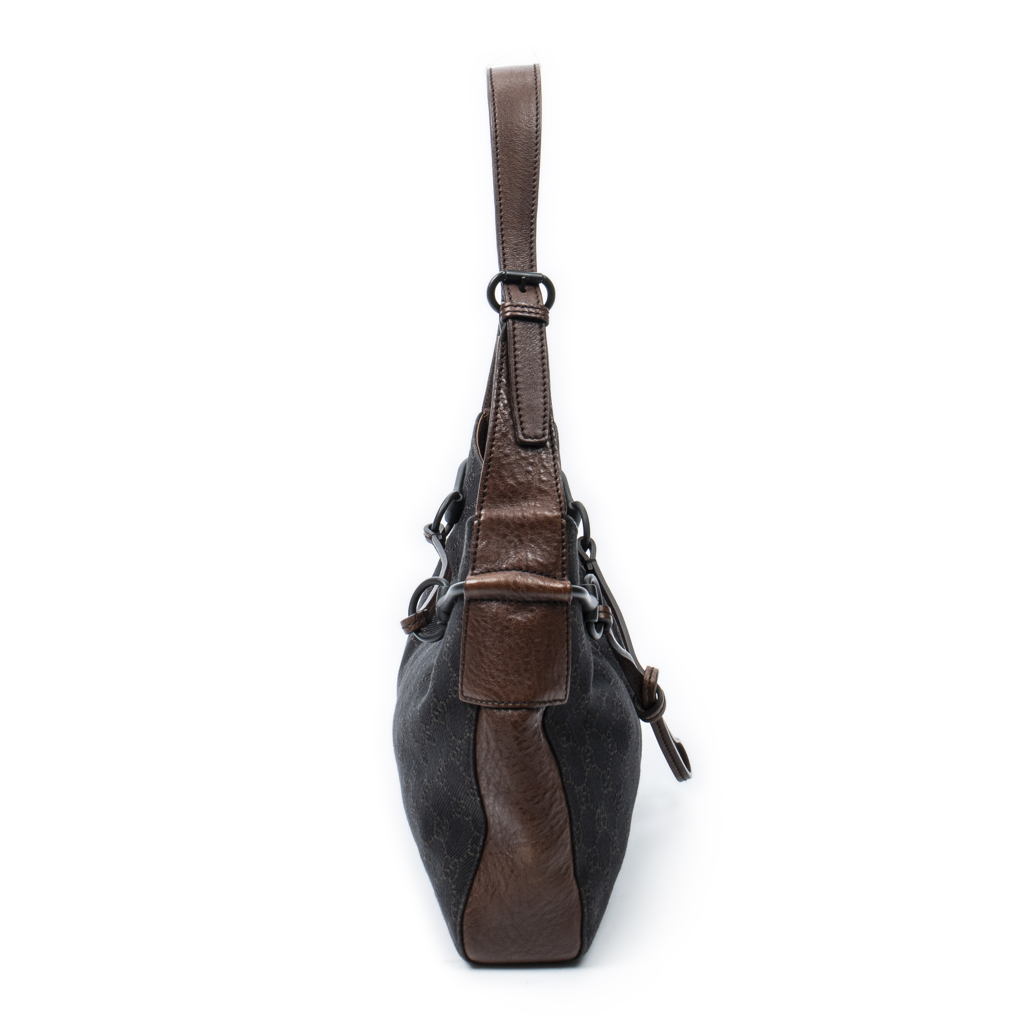 Gucci Shoulder Bag Horsebit Drawstring Hobo in Dark Brown Monogrammed Denim Canvas and Black Metal hardware. The product is in Excellent Condition (A).