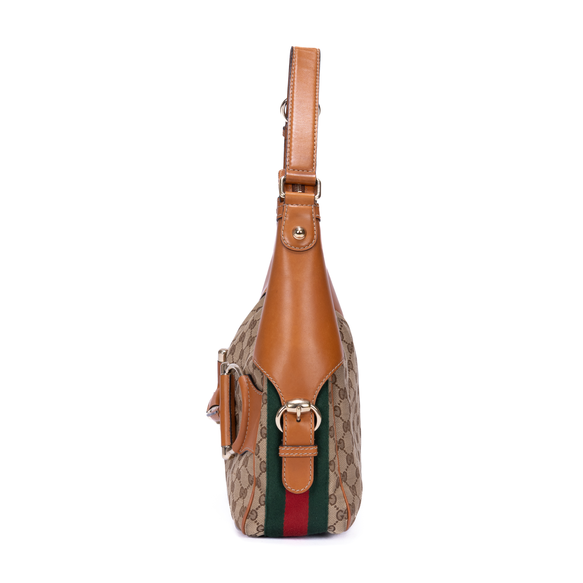Gucci Shoulder Bag Horsebit Sherry Line Hobo in Light Brown/ Beige GG Monogram Canvas and Champagne Gold hardware. The product is in Excellent Condition (A).