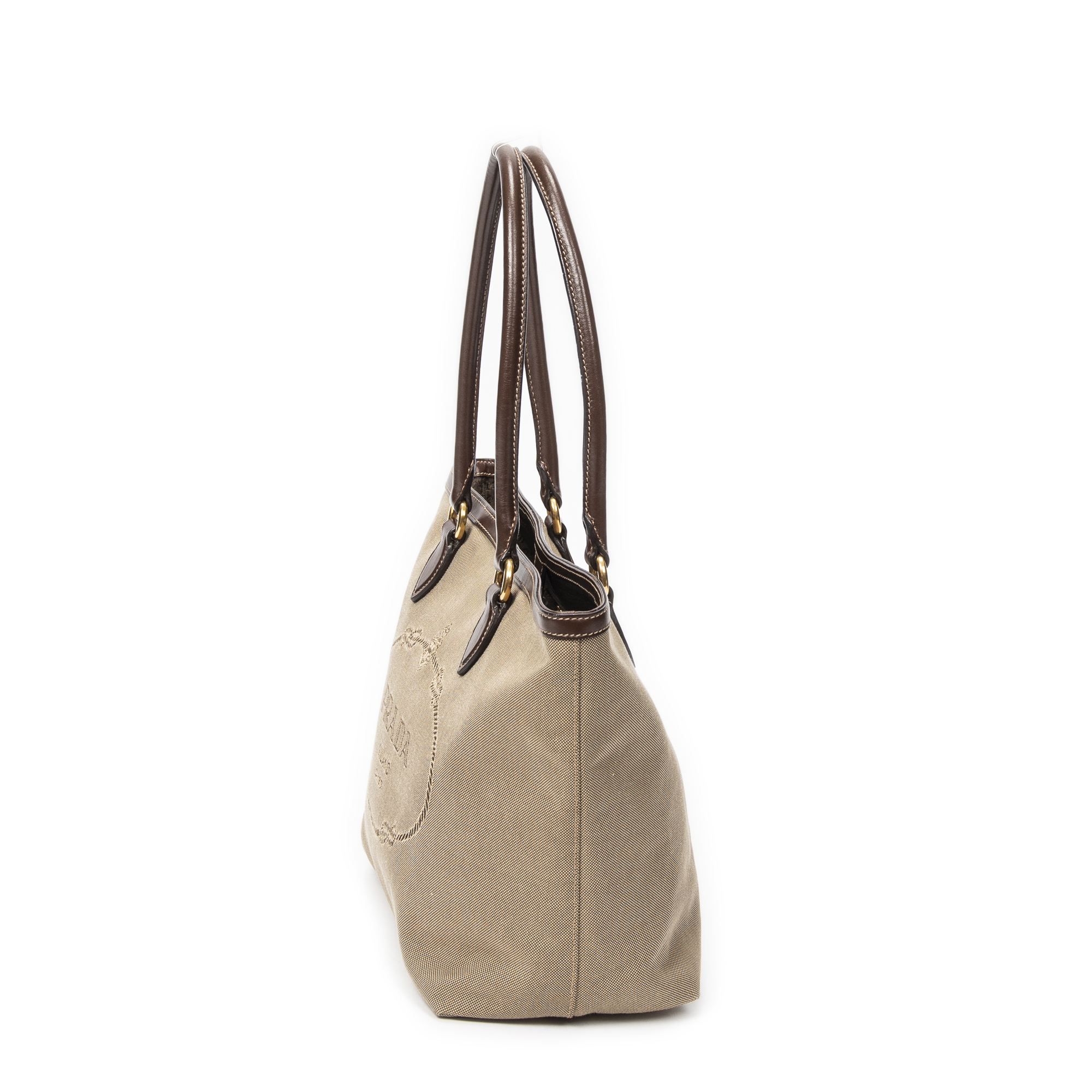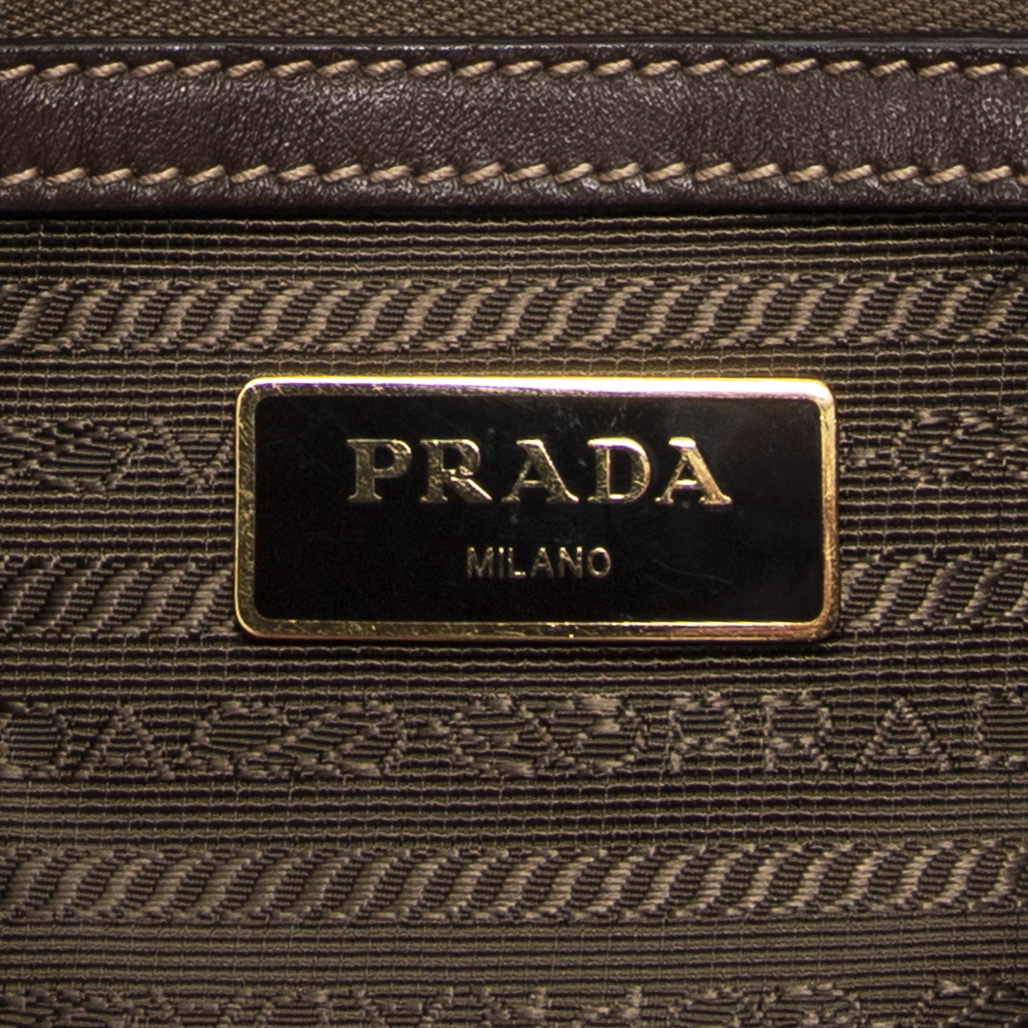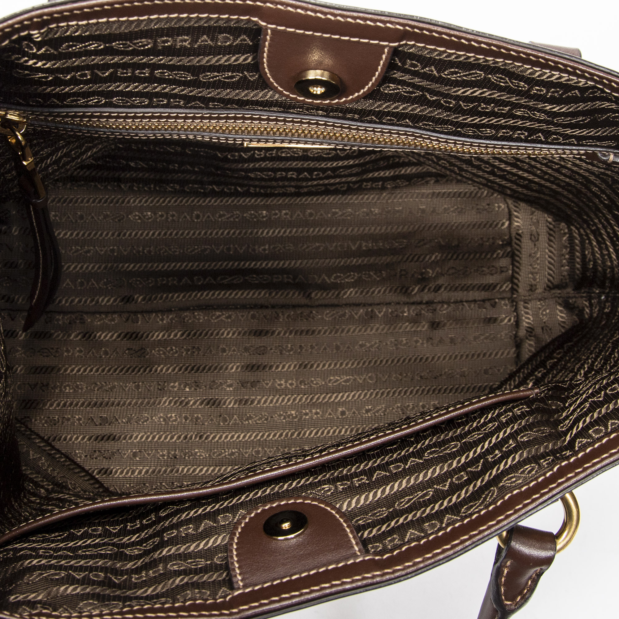 Prada Shoulder Bag Jacquard Shopping Tote in Brown Jacquard Canvas and Gold hardware. The product is in Excellent Condition (A).