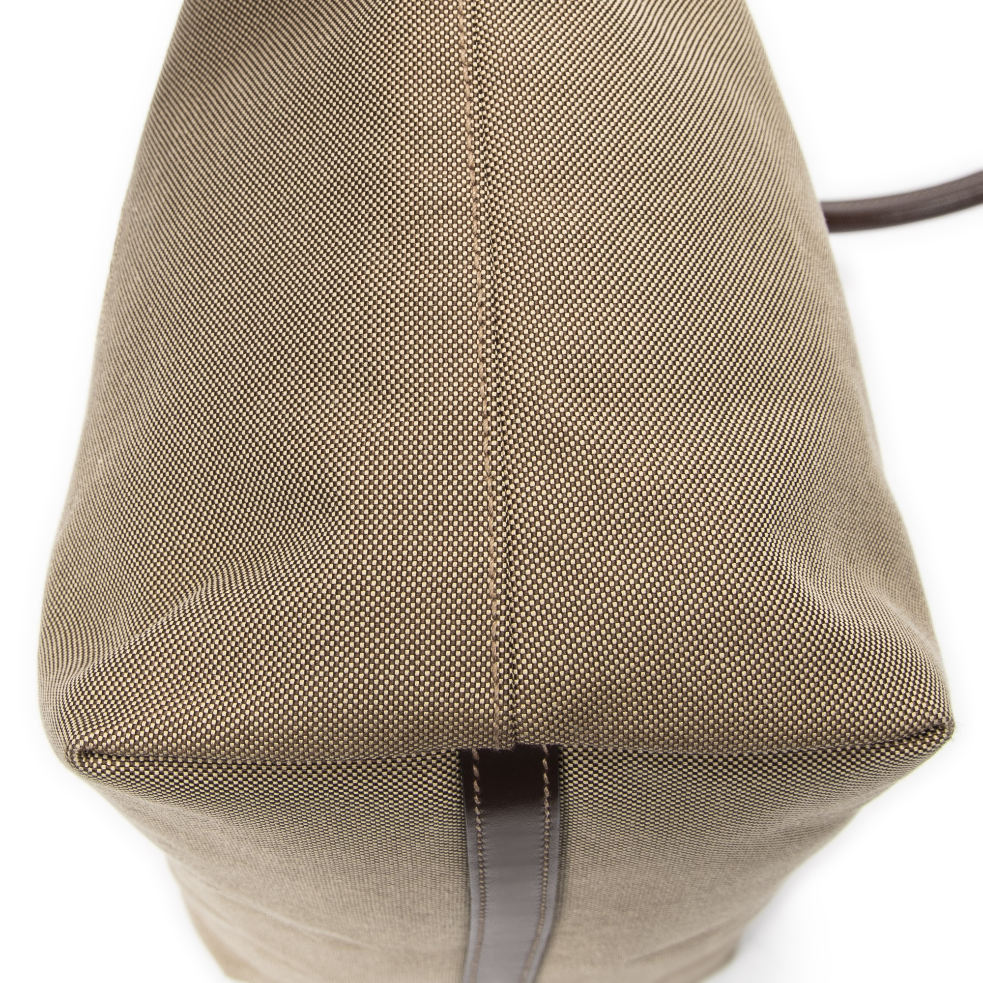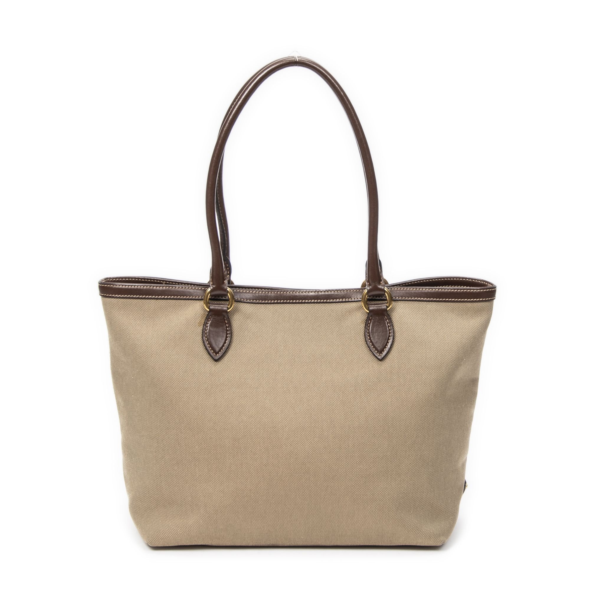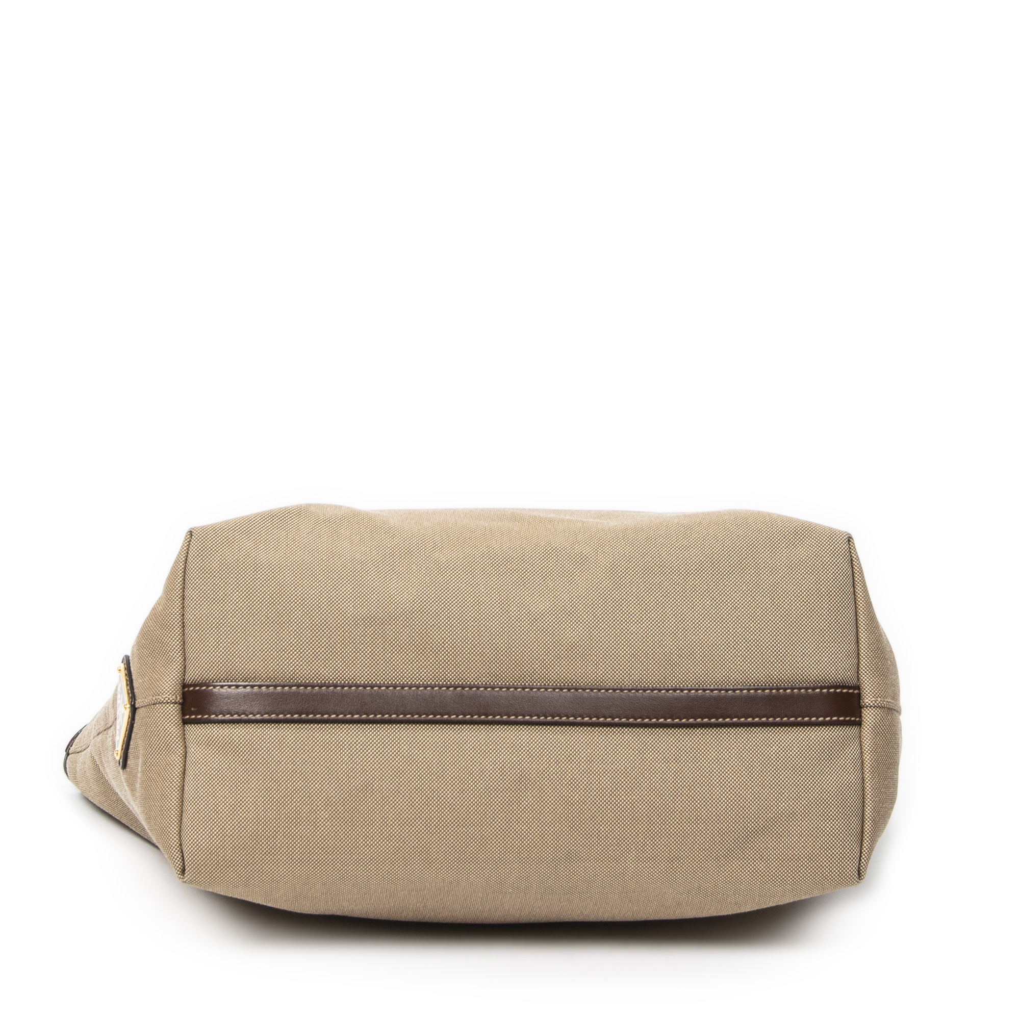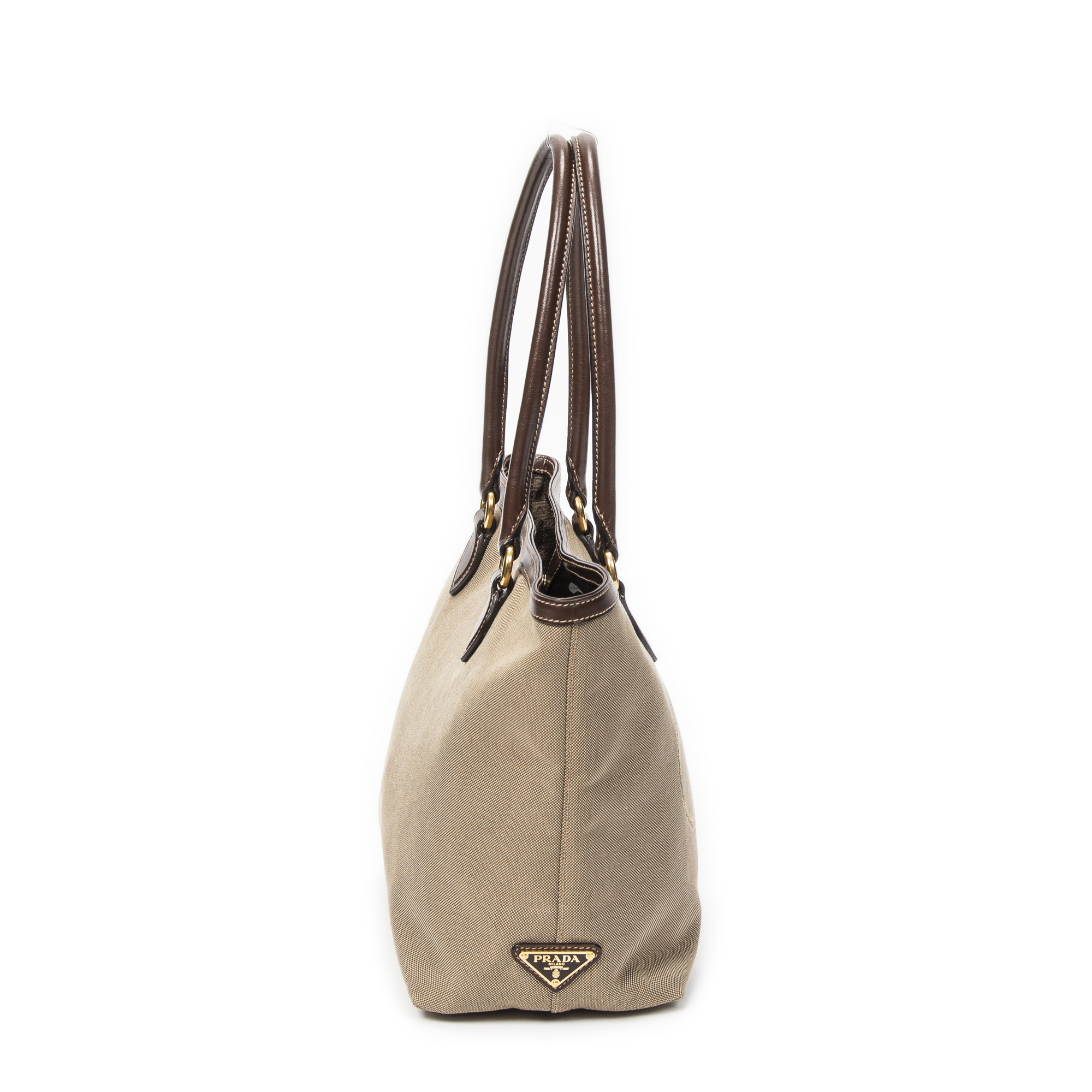 Prada Shoulder Bag Jacquard Shopping Tote in Brown Jacquard Canvas and Gold hardware. The product is in Excellent Condition (A).