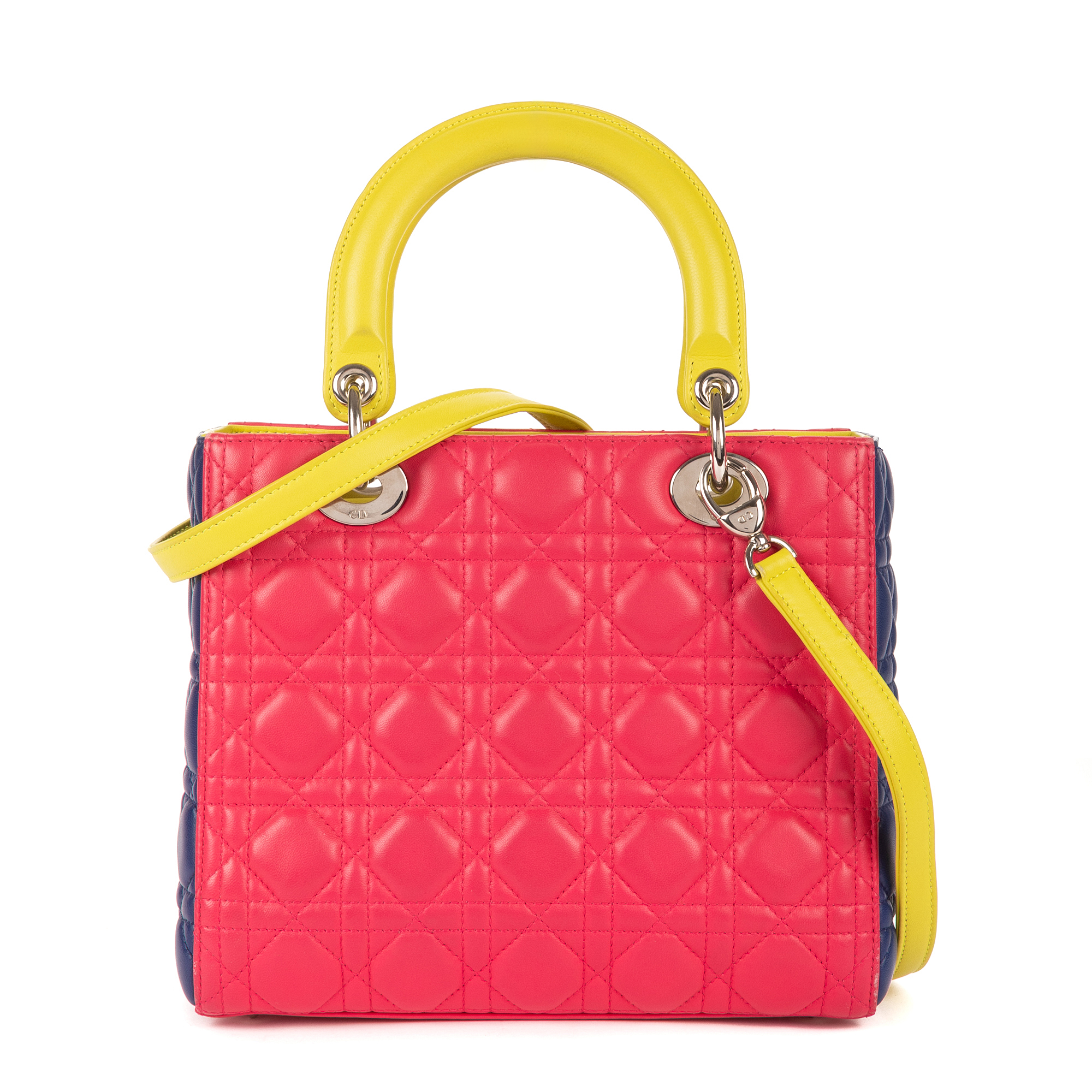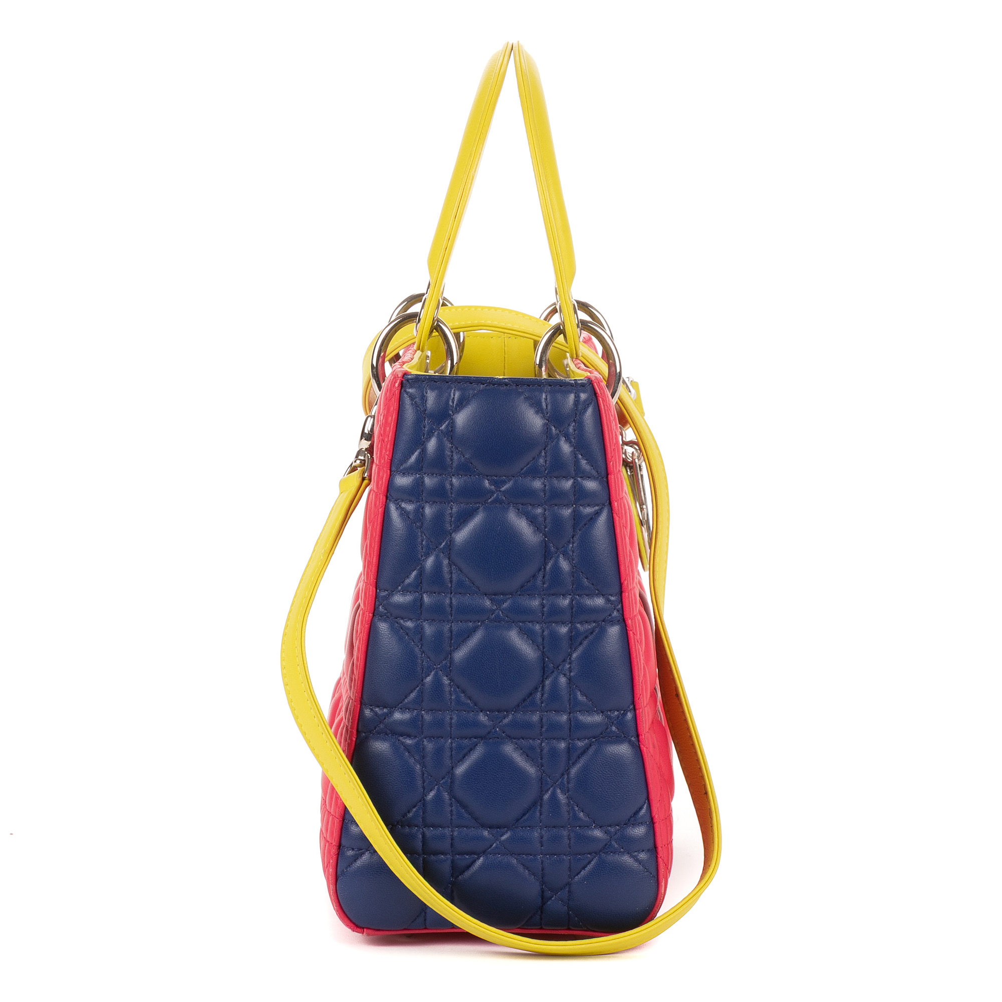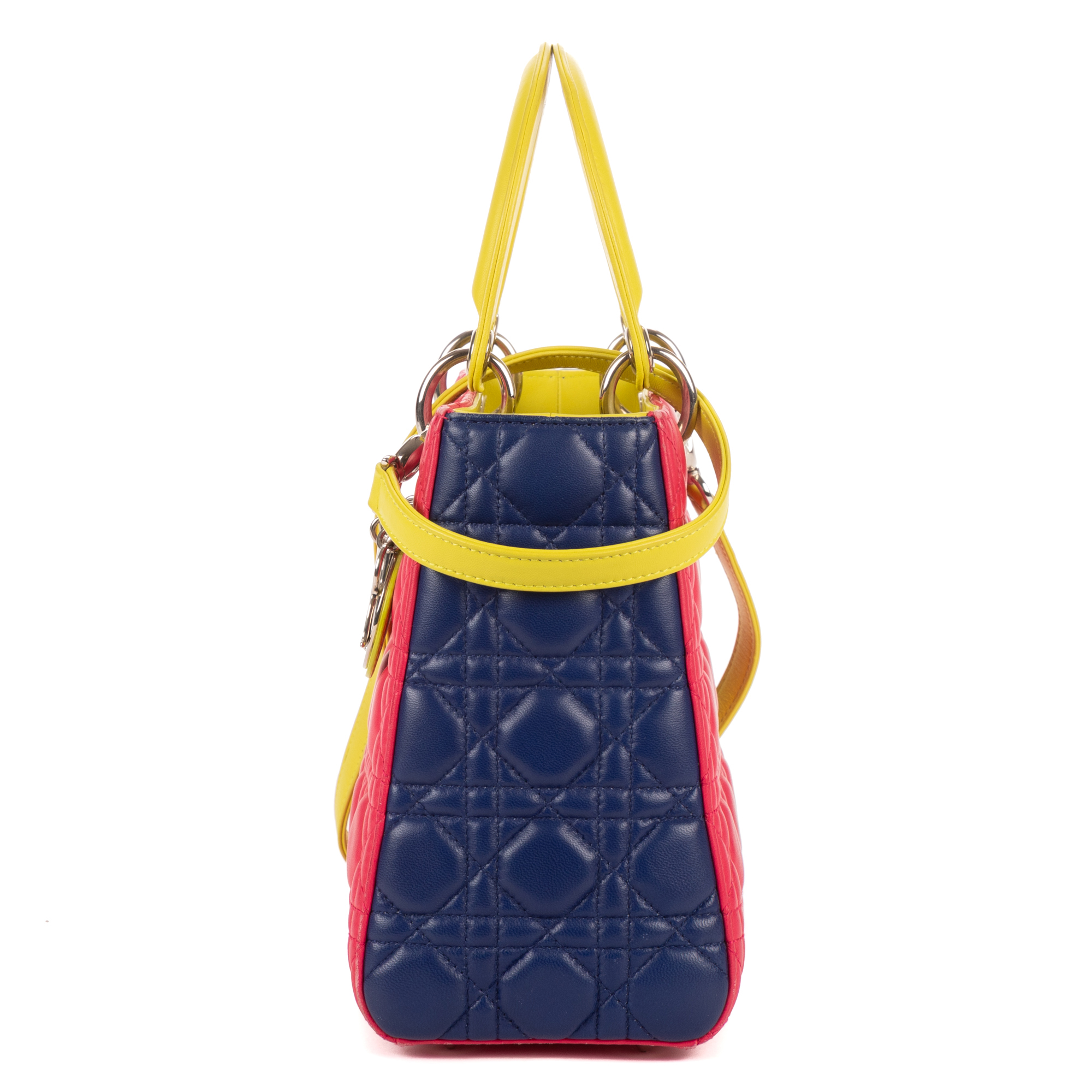 Christian Dior Shoulder Bag Lady Dior Tricolor Medium in Fushia/Yellow/Navy Cannage Leather and Silver hardware. The product is in Perfect Condition (AA).
