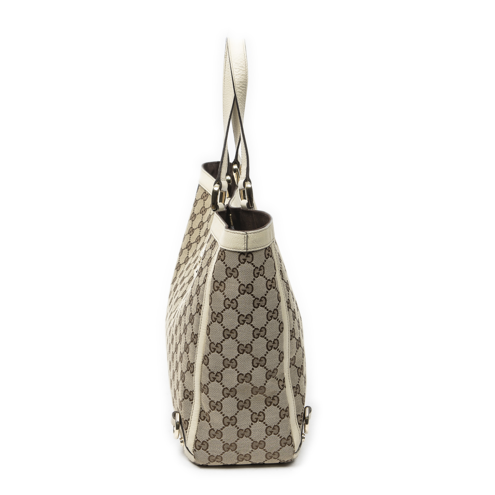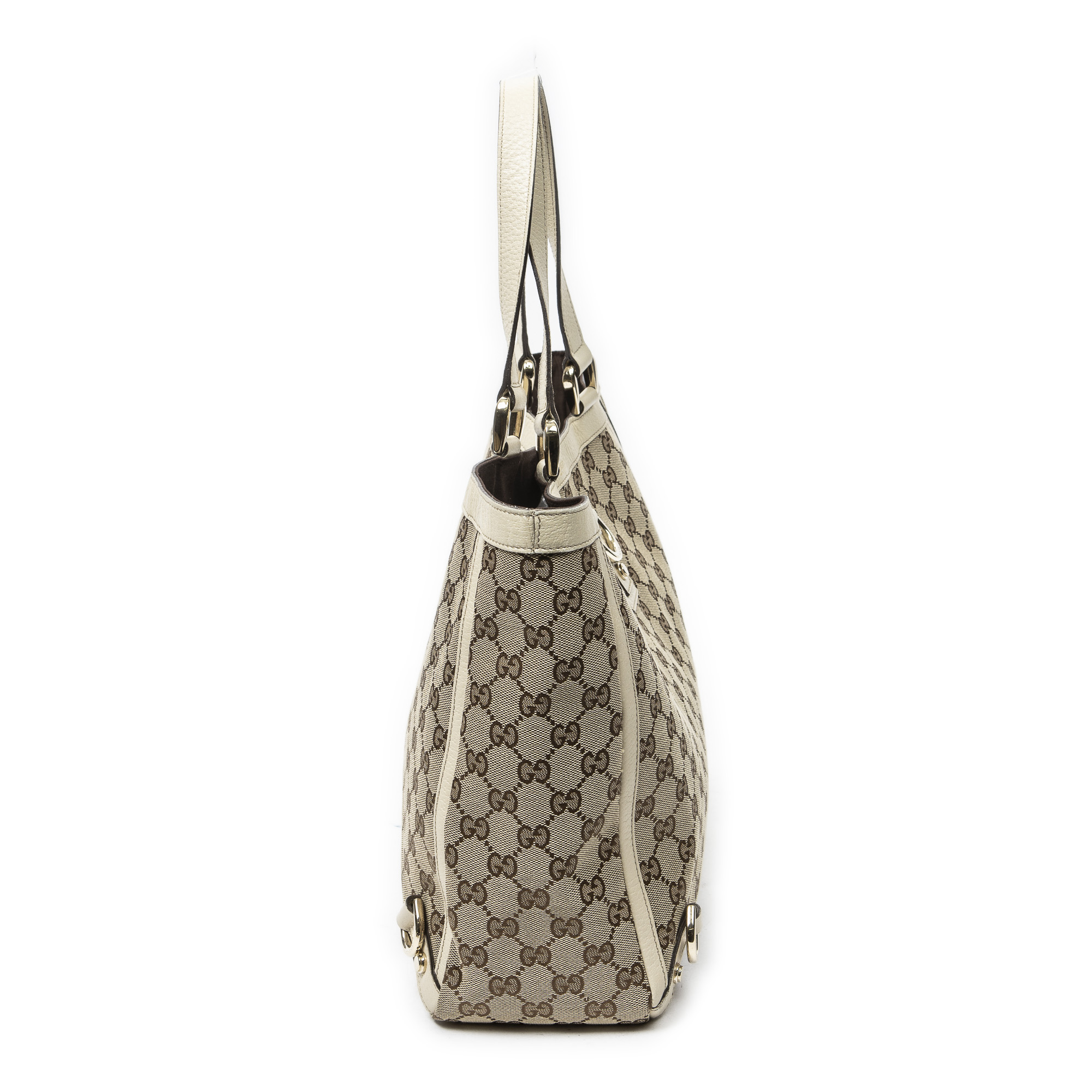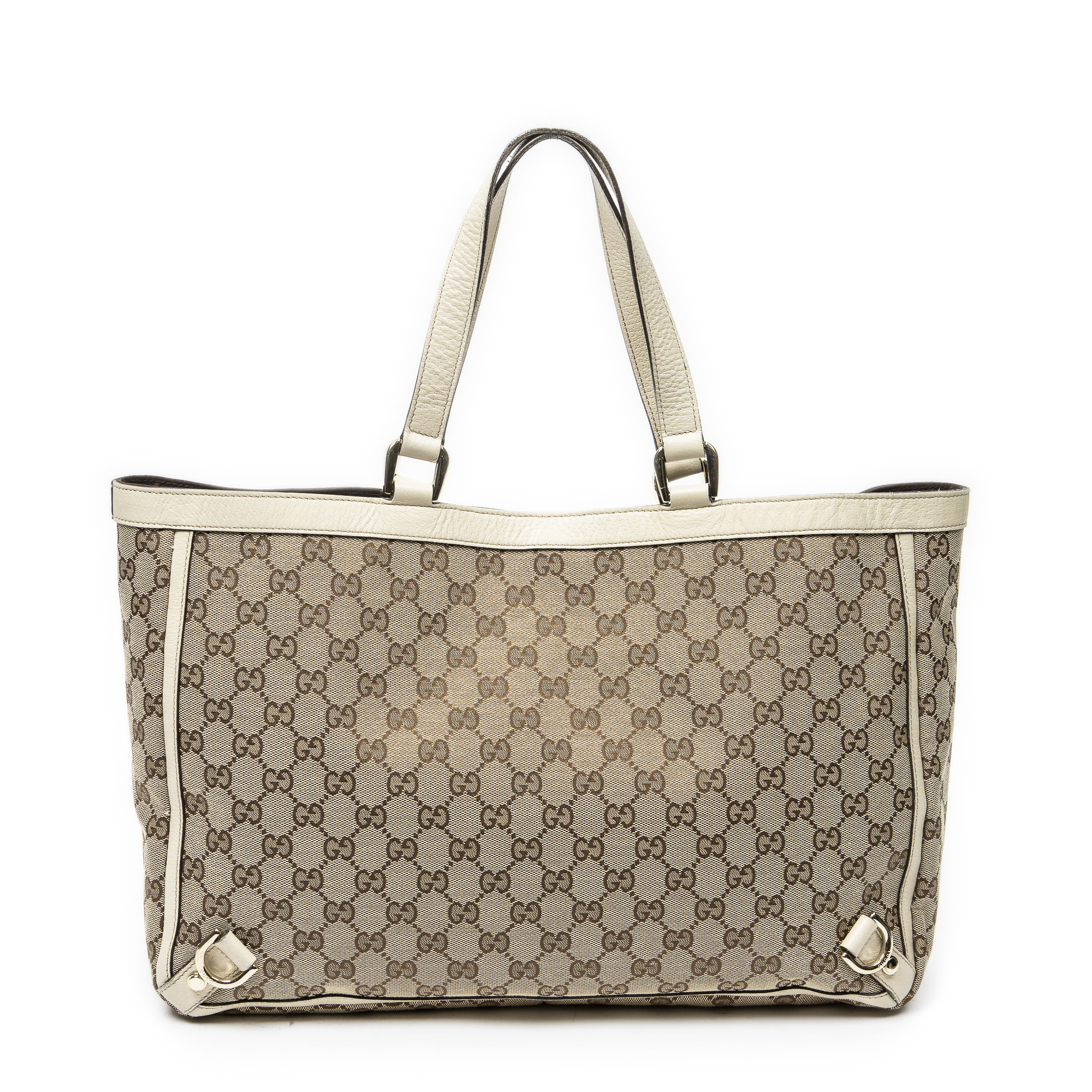 Gucci Shoulder Bag Large Abbey D-Ring Tote in Ivory/Beige Monogrammed Canvas and Silver hardware. The product is in Excellent Condition (A).