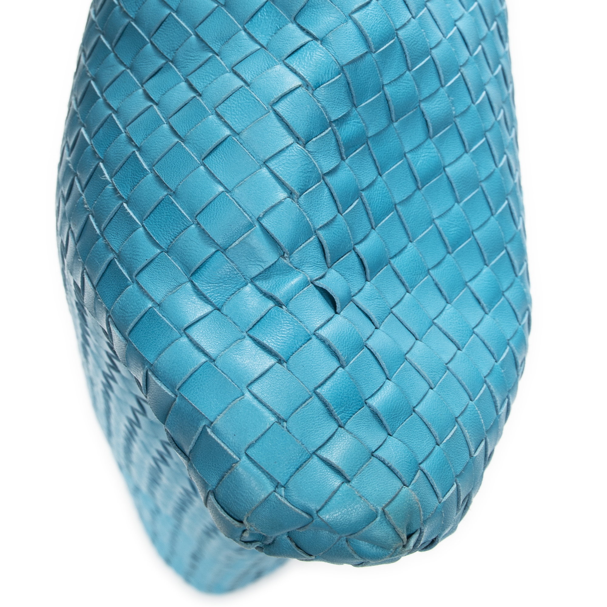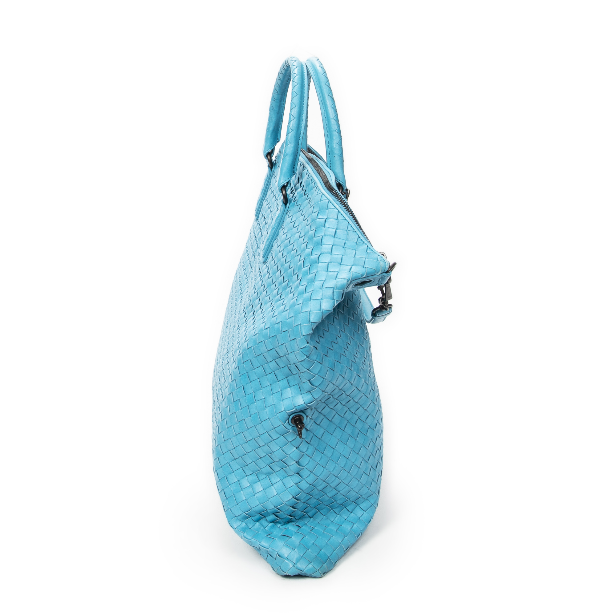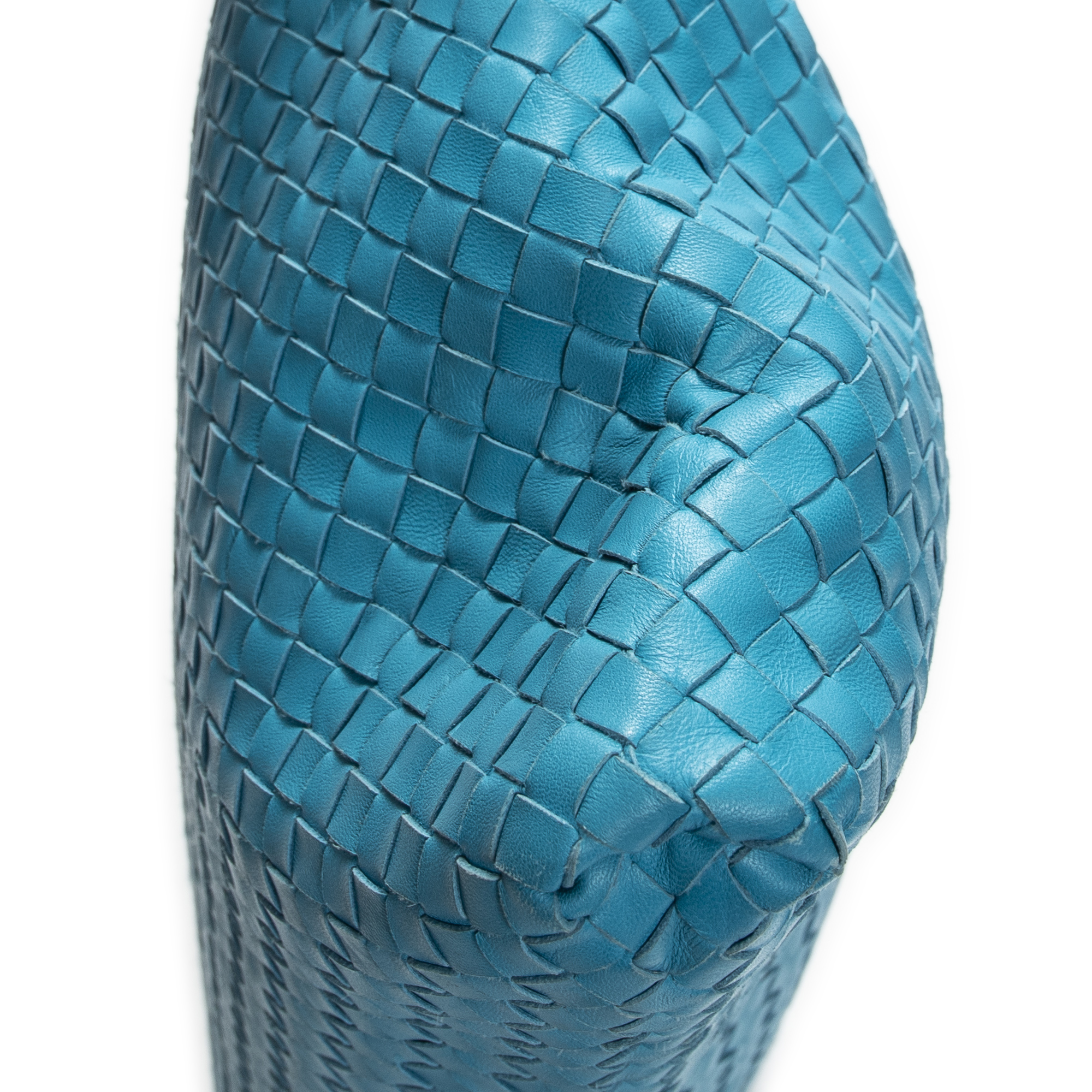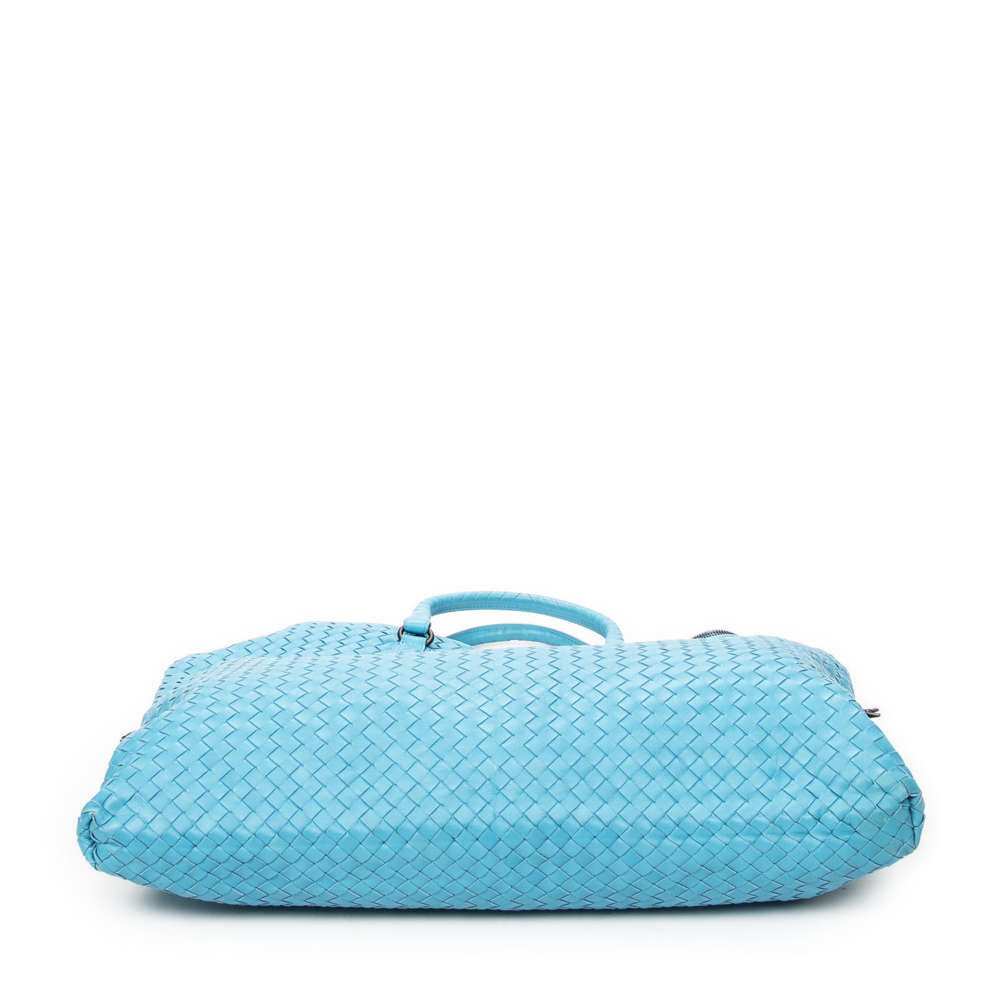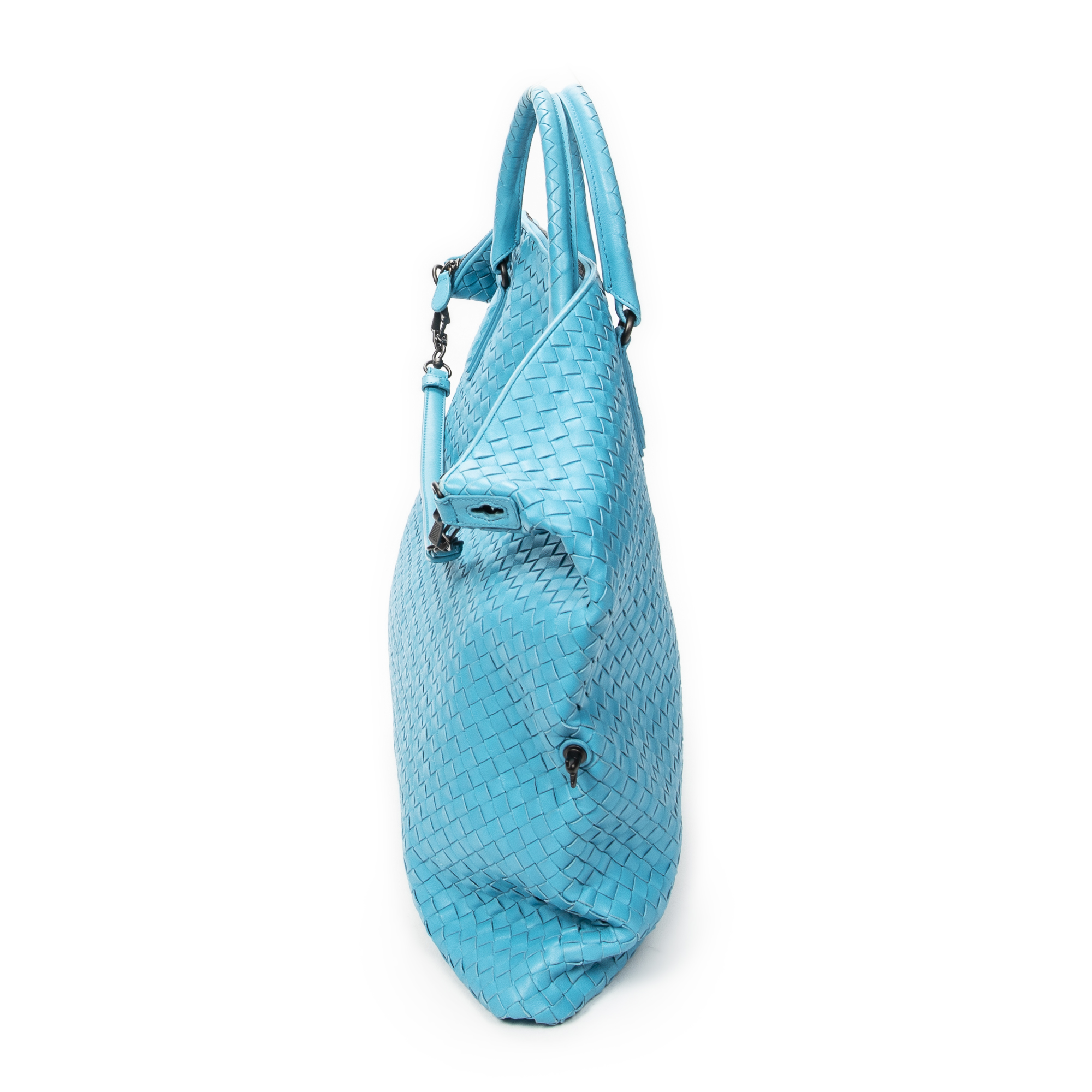 Bottega Veneta Shoulder Bag Large Convertible Tote in Turquoise Intrecciato Leather and Aged Brass hardware. The product is in Excellent Condition (A).