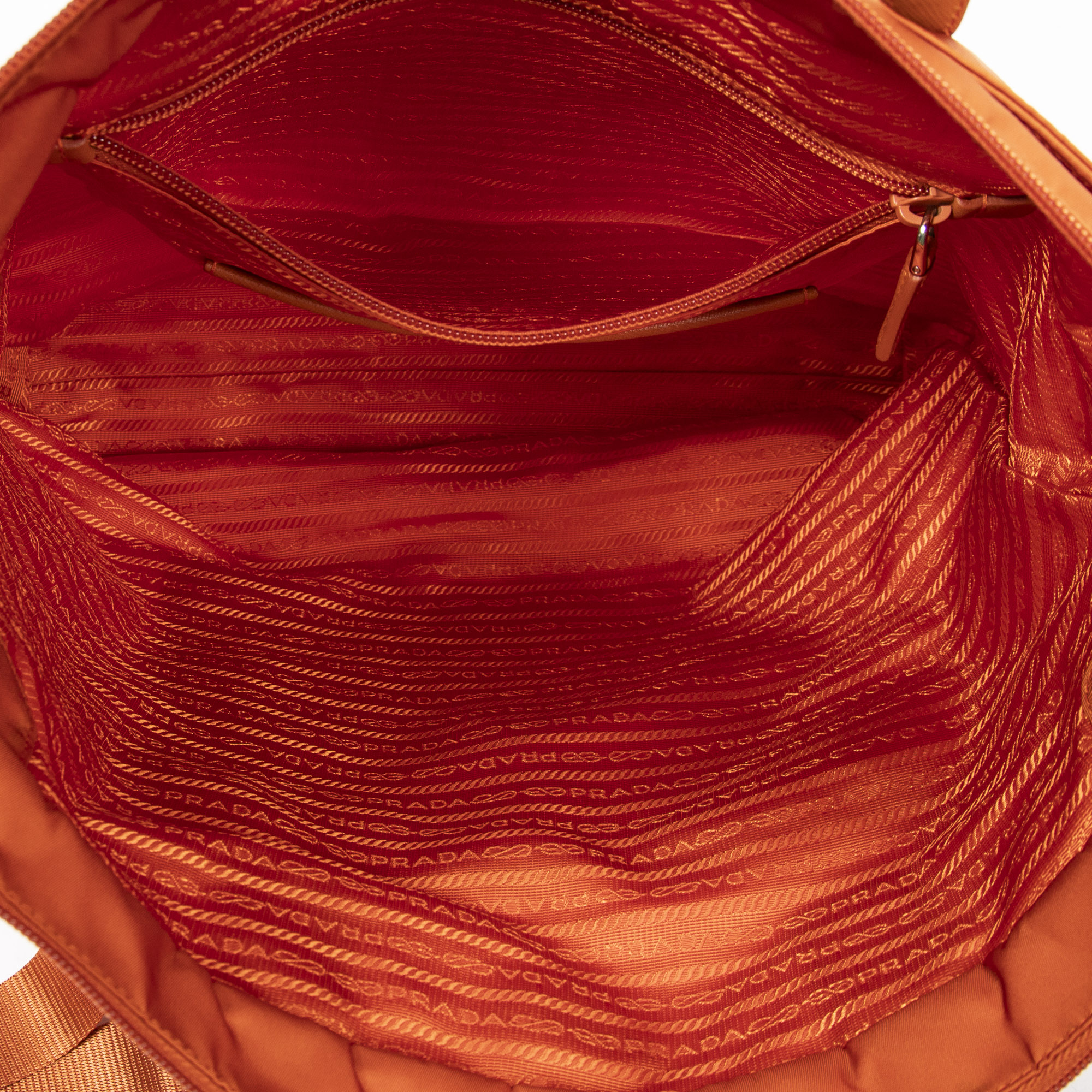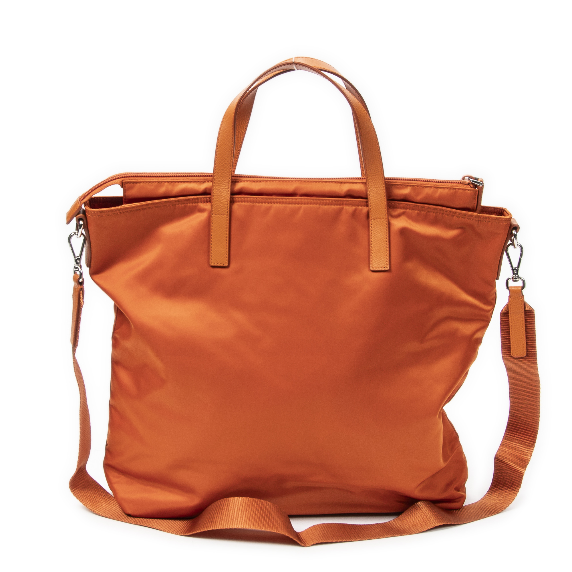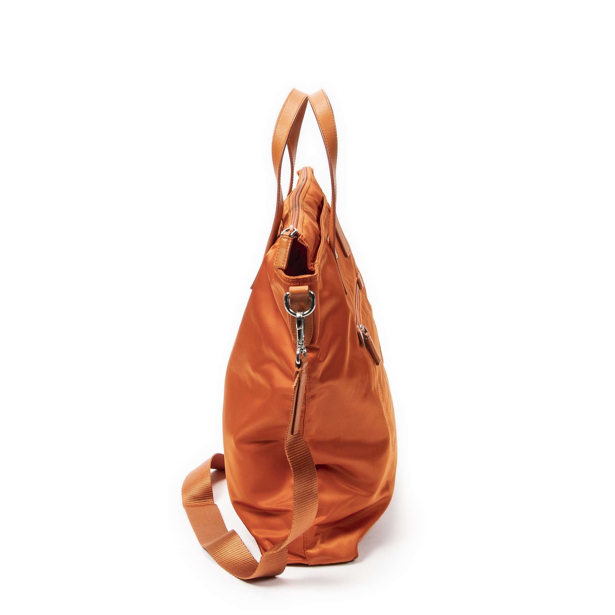 Prada Shoulder Bag Large Convertible Vertical Tote in Orange Nylon Canvas and Silver hardware. The product is in Excellent Condition (A).