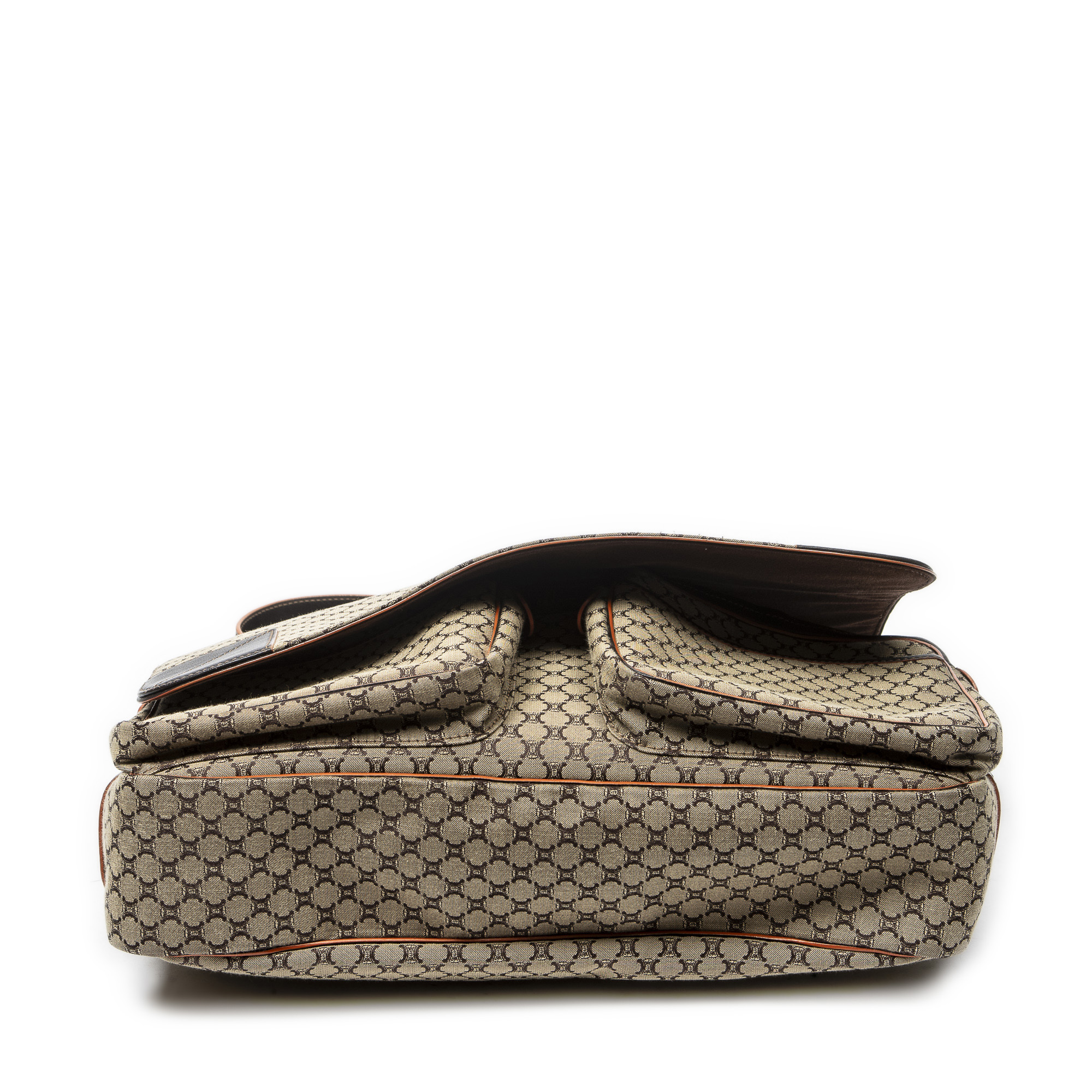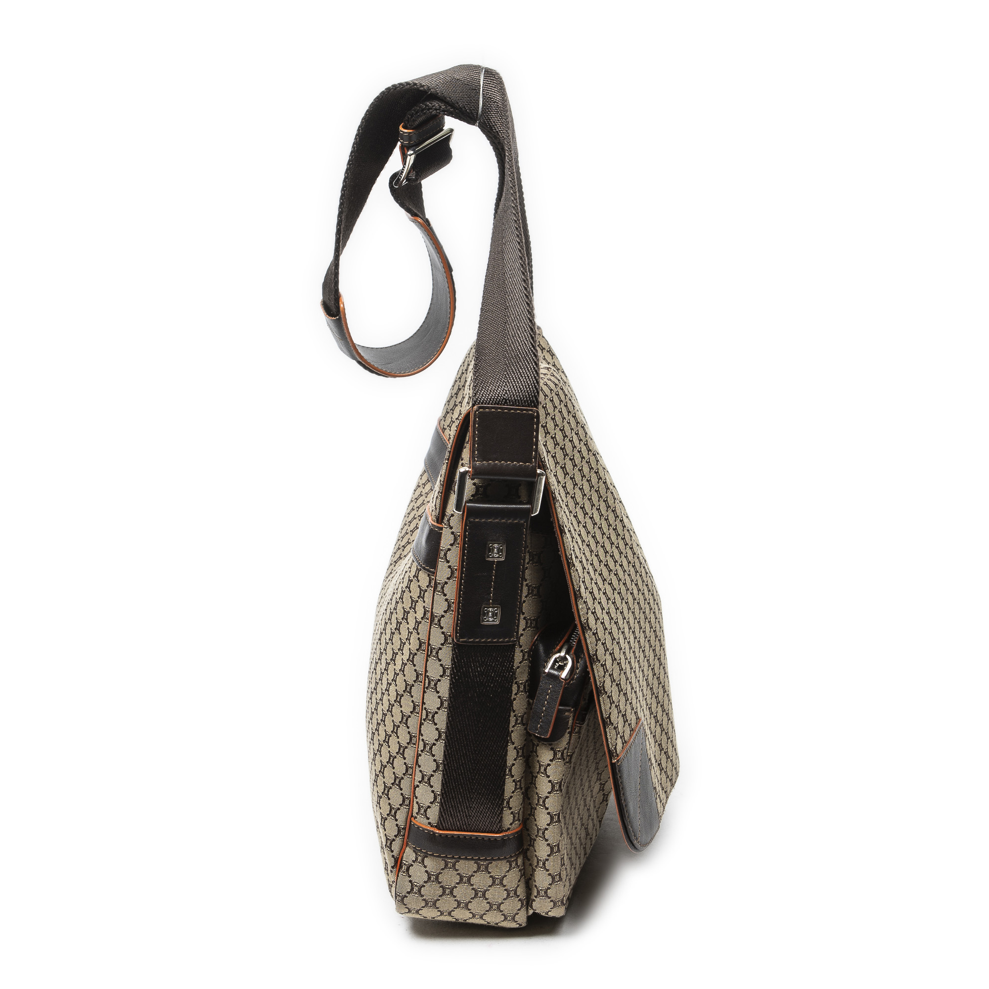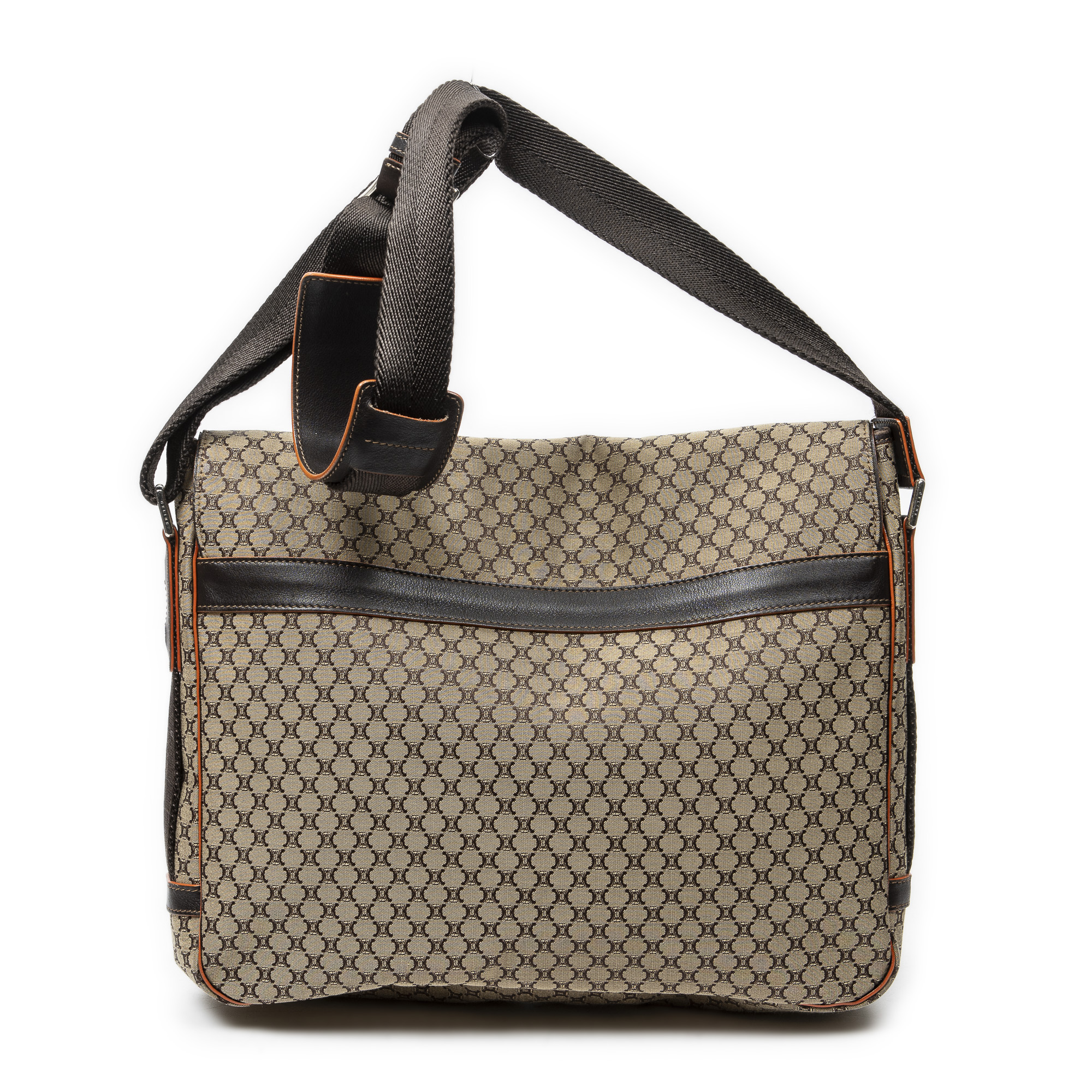 Celine Shoulder Bag Large Flap Messenger in Beige/Dark Brown/Orange Macadam Canvas and Silver hardware. The product is in Excellent Condition (A).