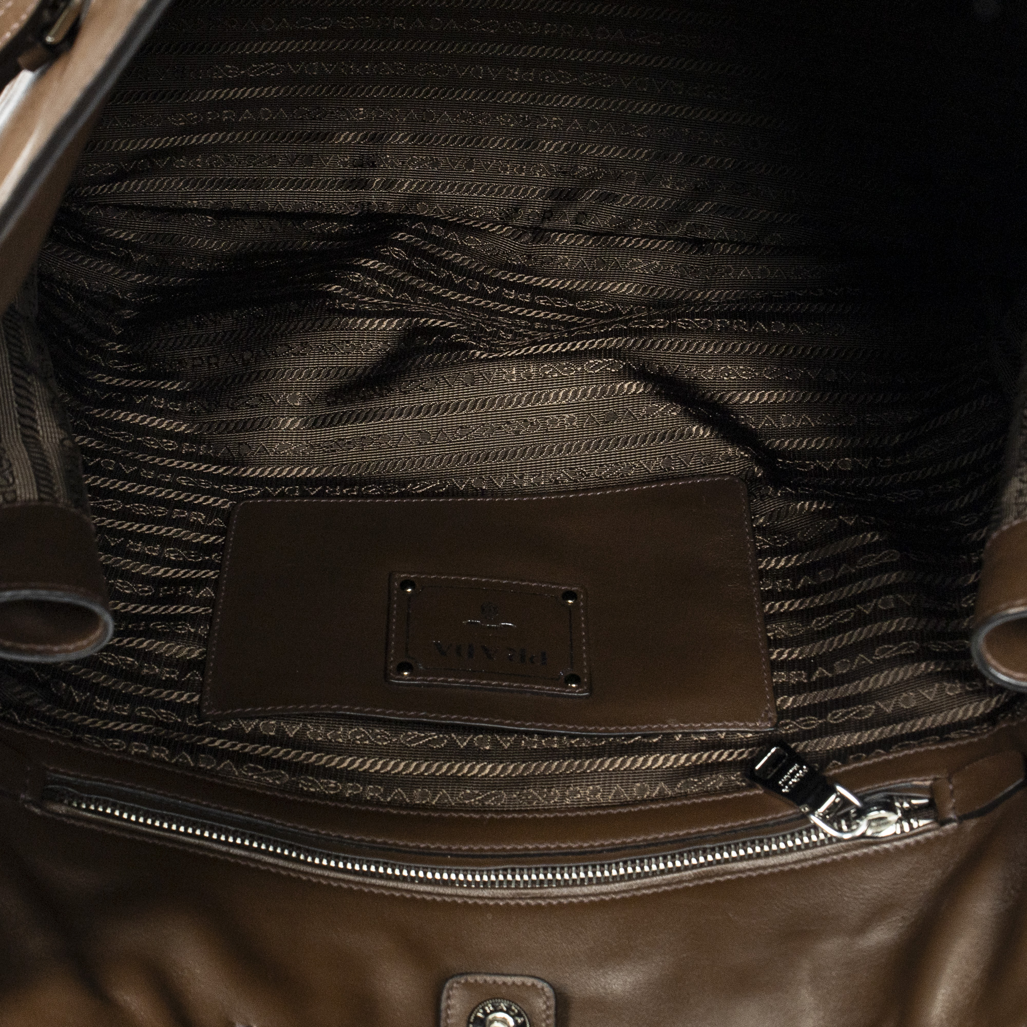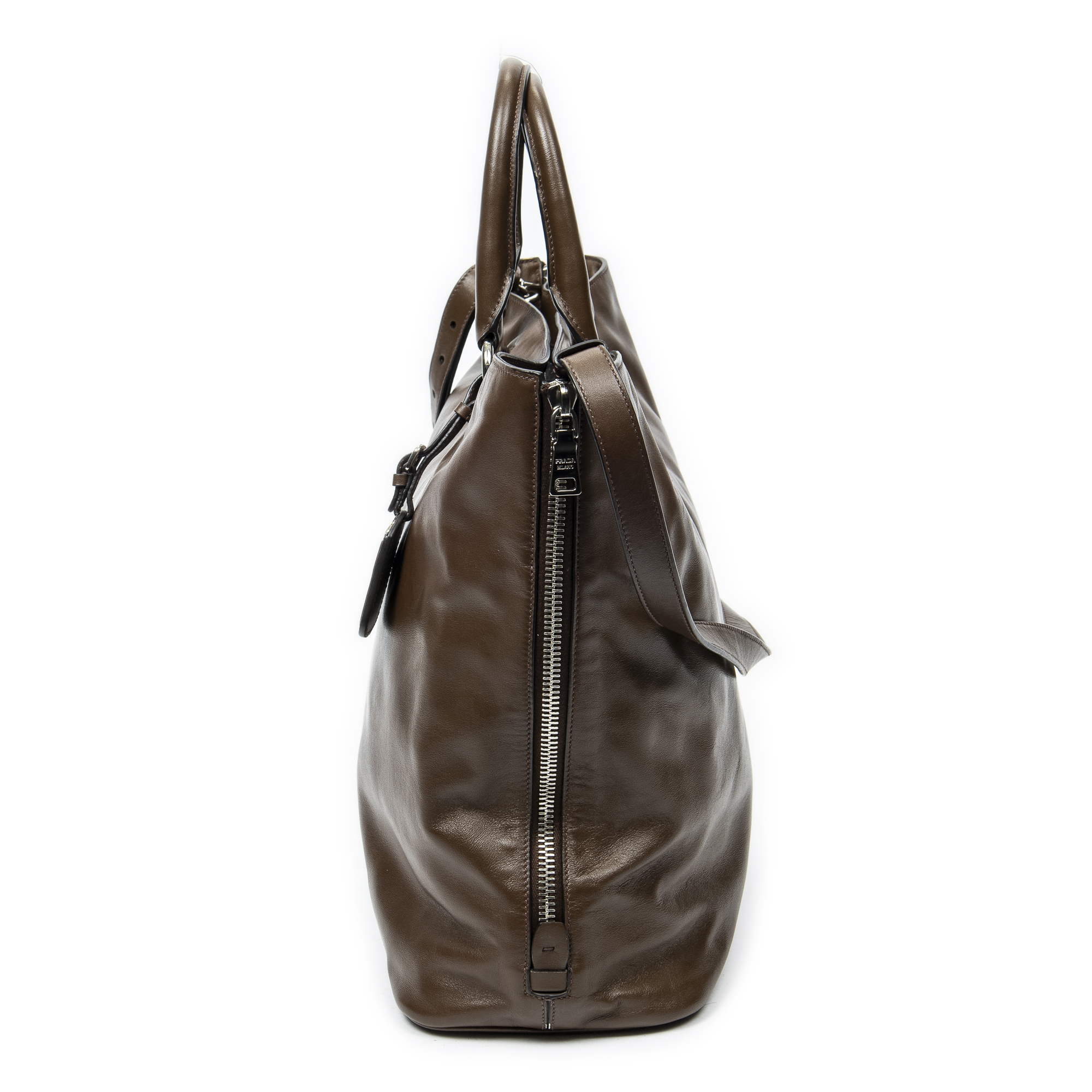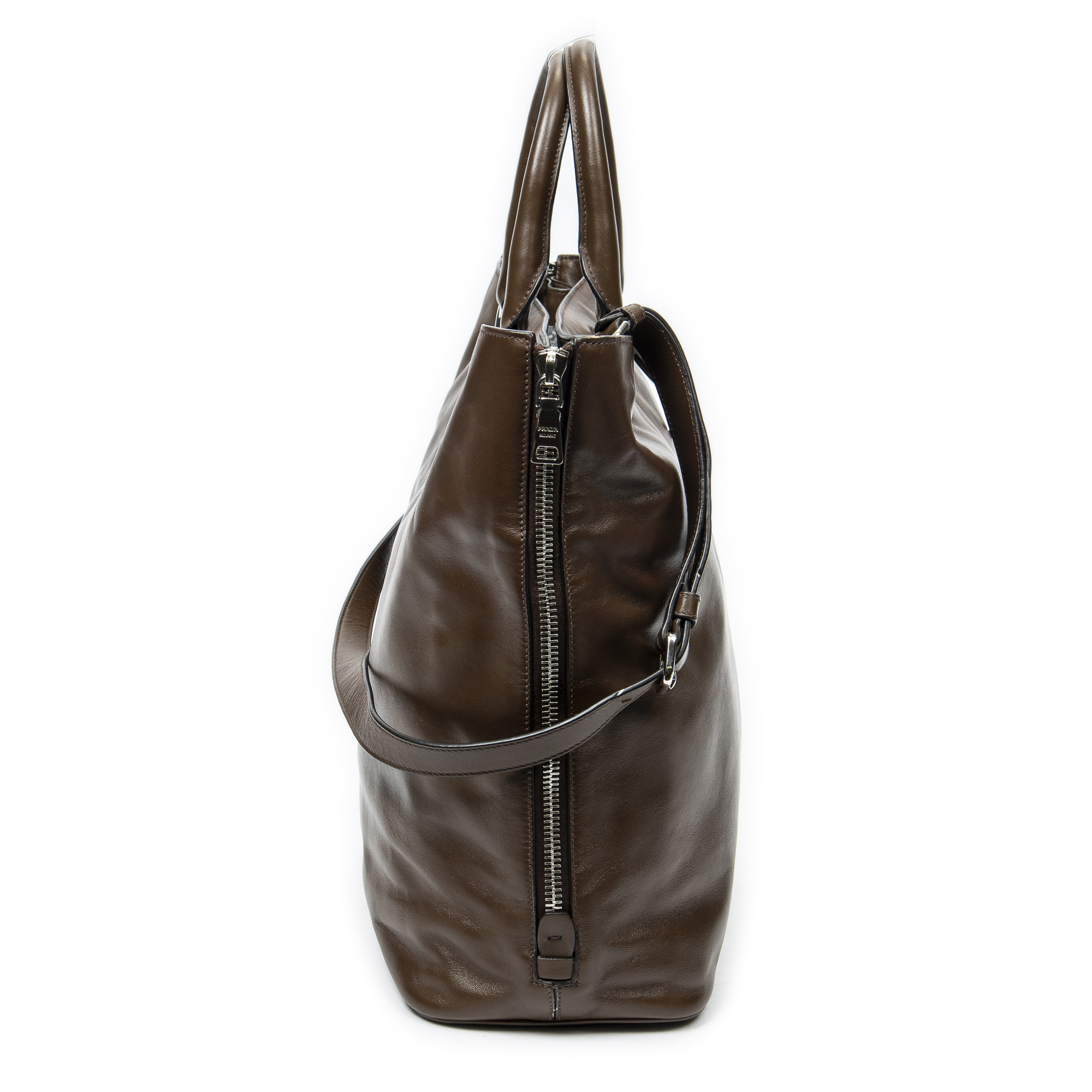 Prada Shoulder Bag Large Side Zip Tote in Brown Calfskin Leather and Silver hardware. The product is in Excellent Condition (A).