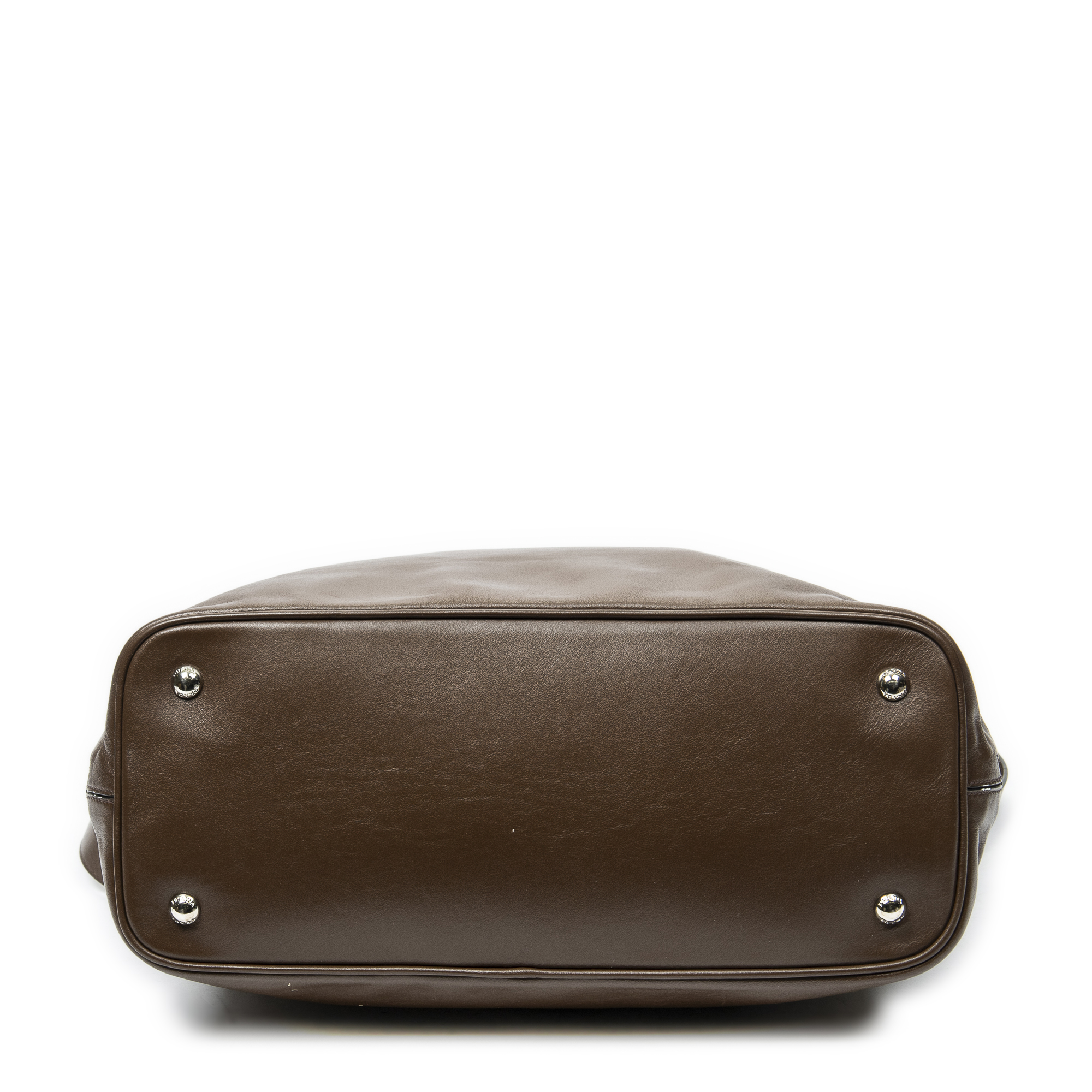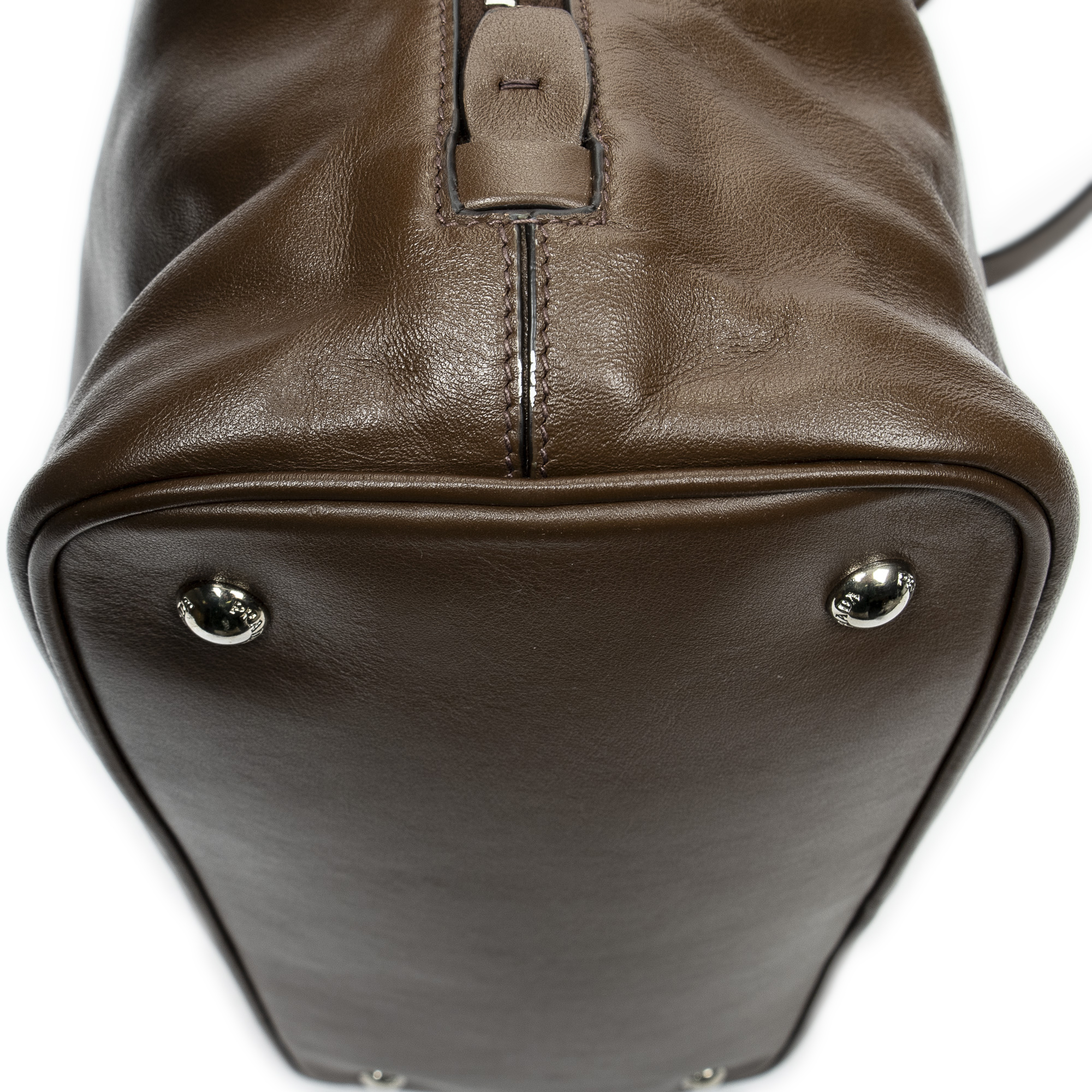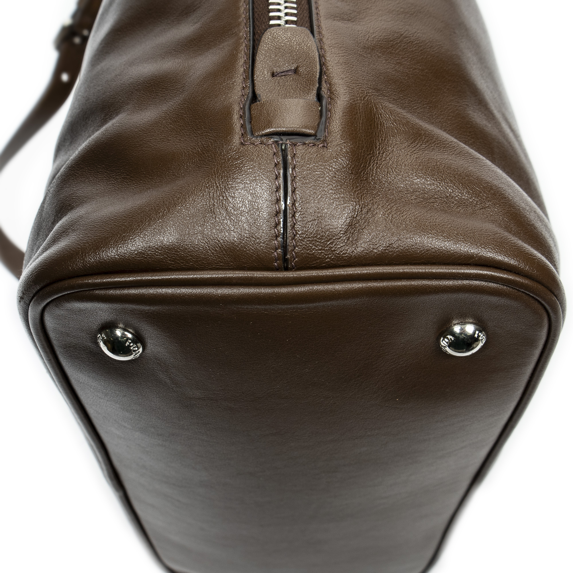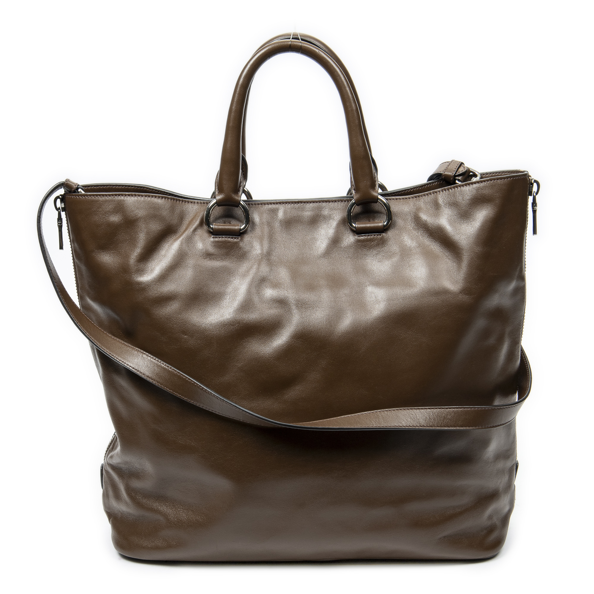 Prada Shoulder Bag Large Side Zip Tote in Brown Calfskin Leather and Silver hardware. The product is in Excellent Condition (A).