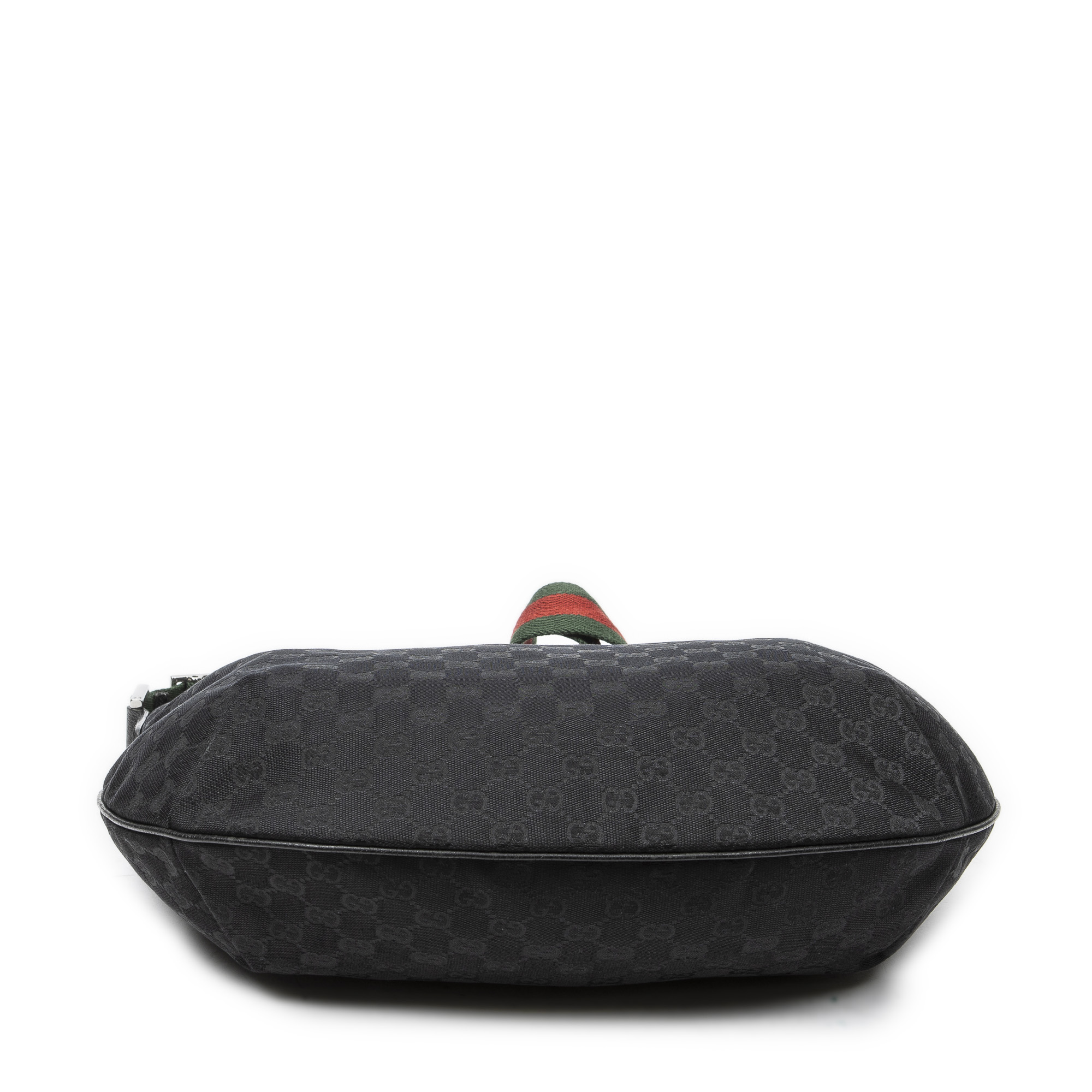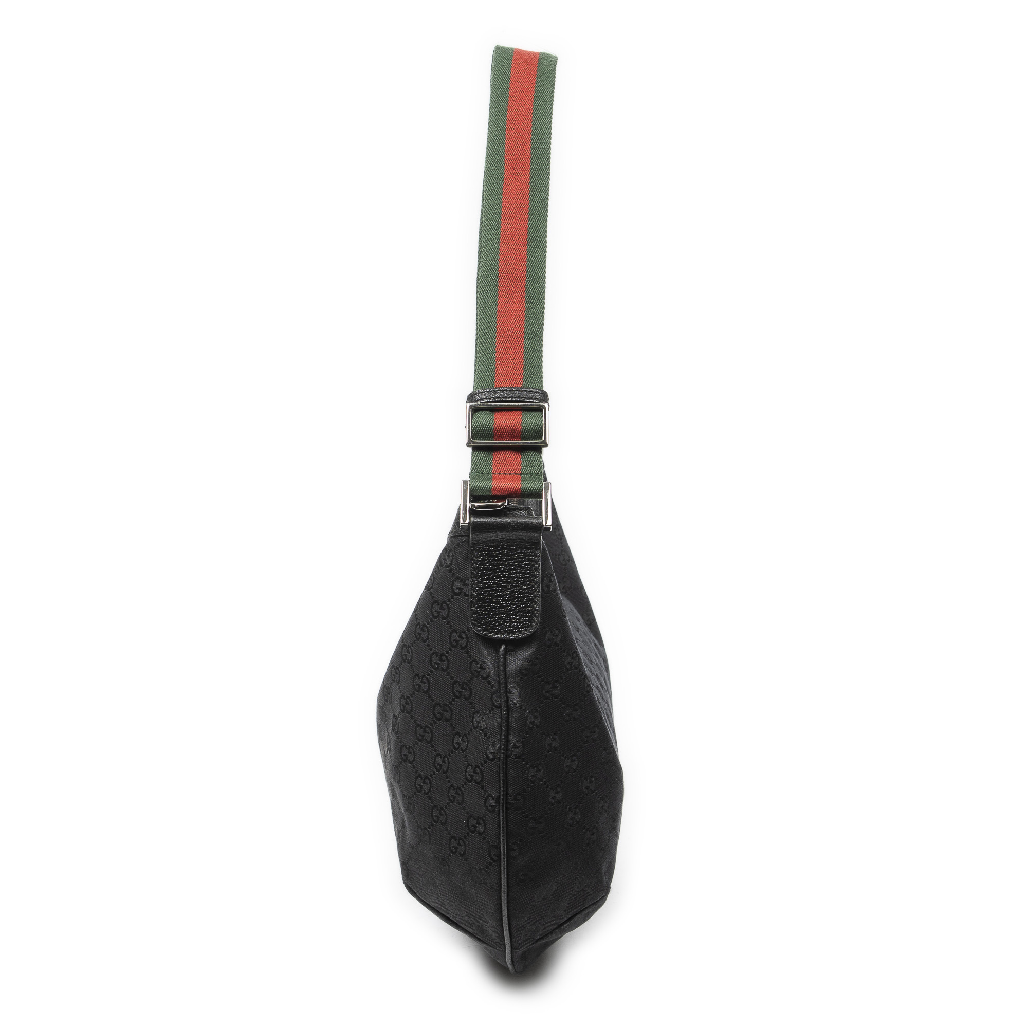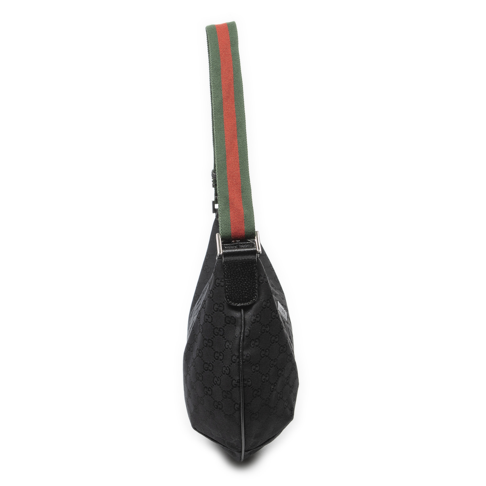 Gucci Shoulder Bag Large Web Half Moon Hobo in Black Monogrammed Canvas and Silver hardware. The product is in Excellent Condition (A).