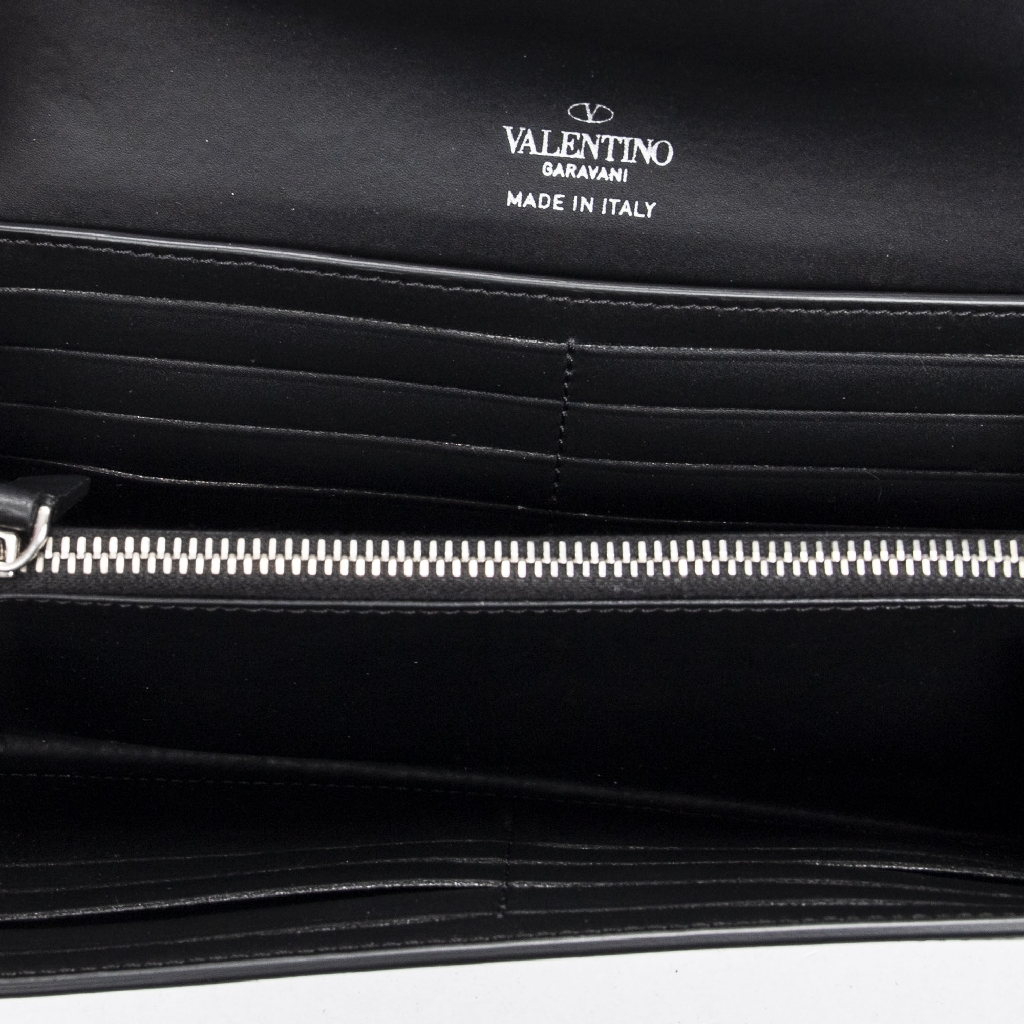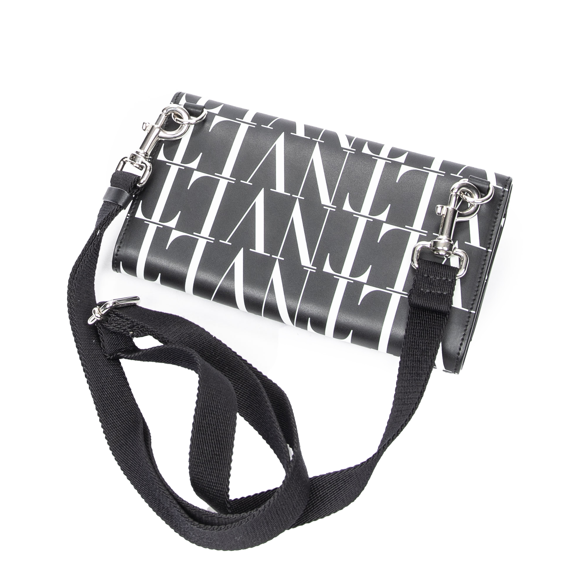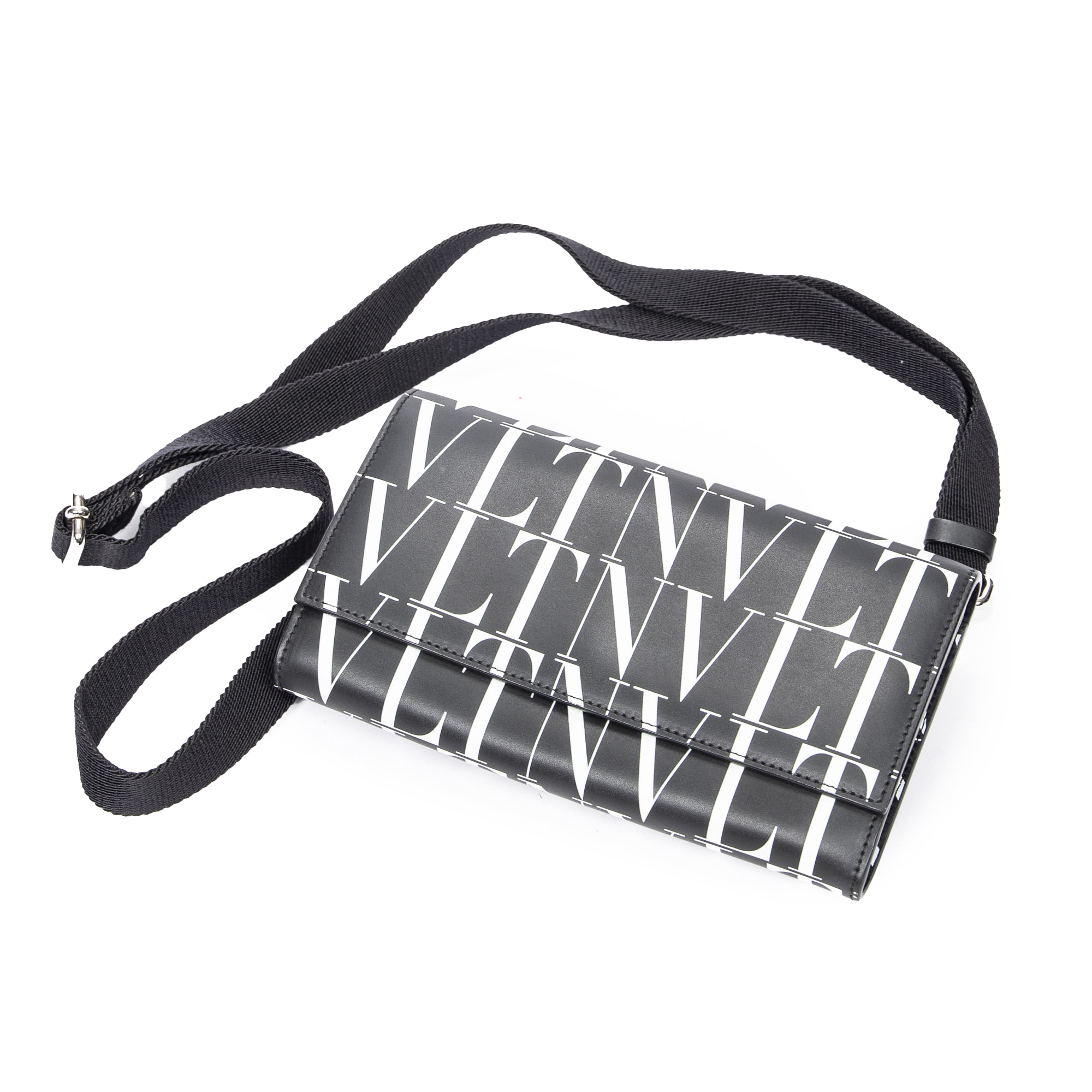 Valentino Shoulder Bag Logo Wallet on Strap in Black/White Logo Print Calfskin Leather and Silver hardware. The product is in Perfect Condition (AA).