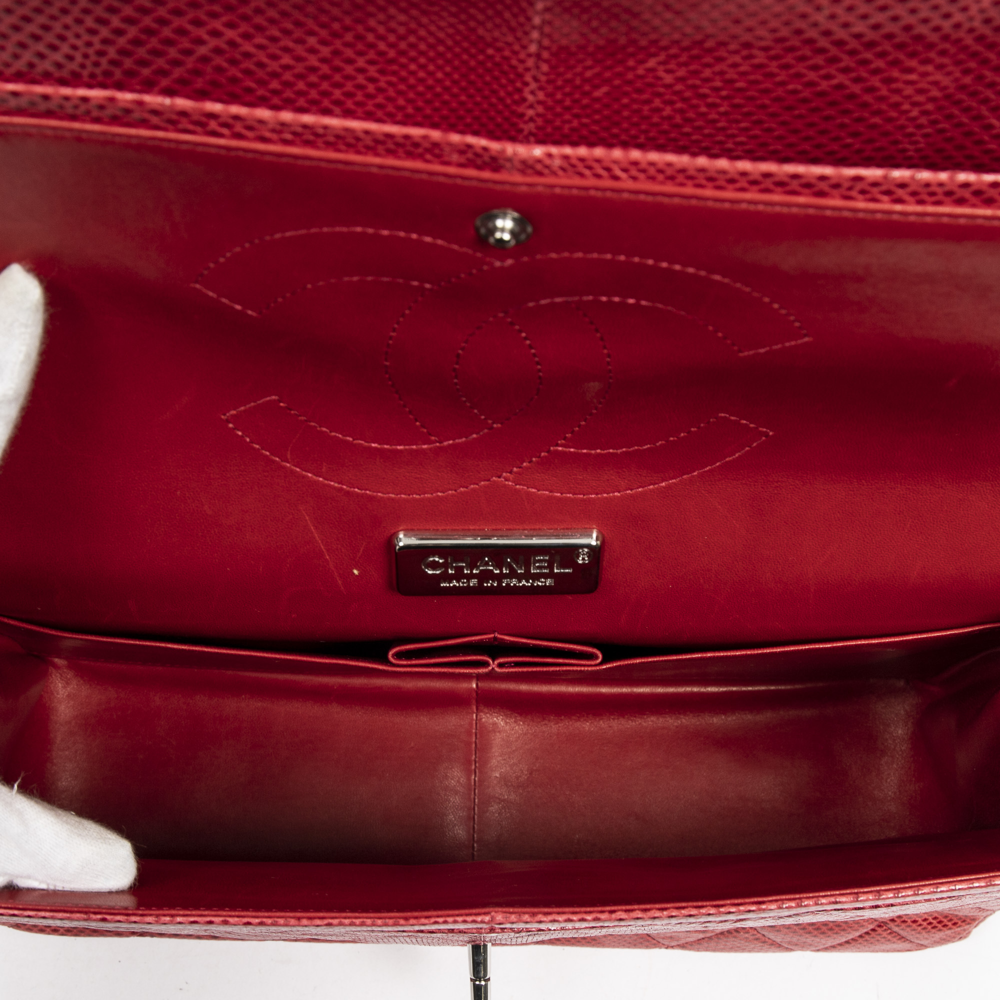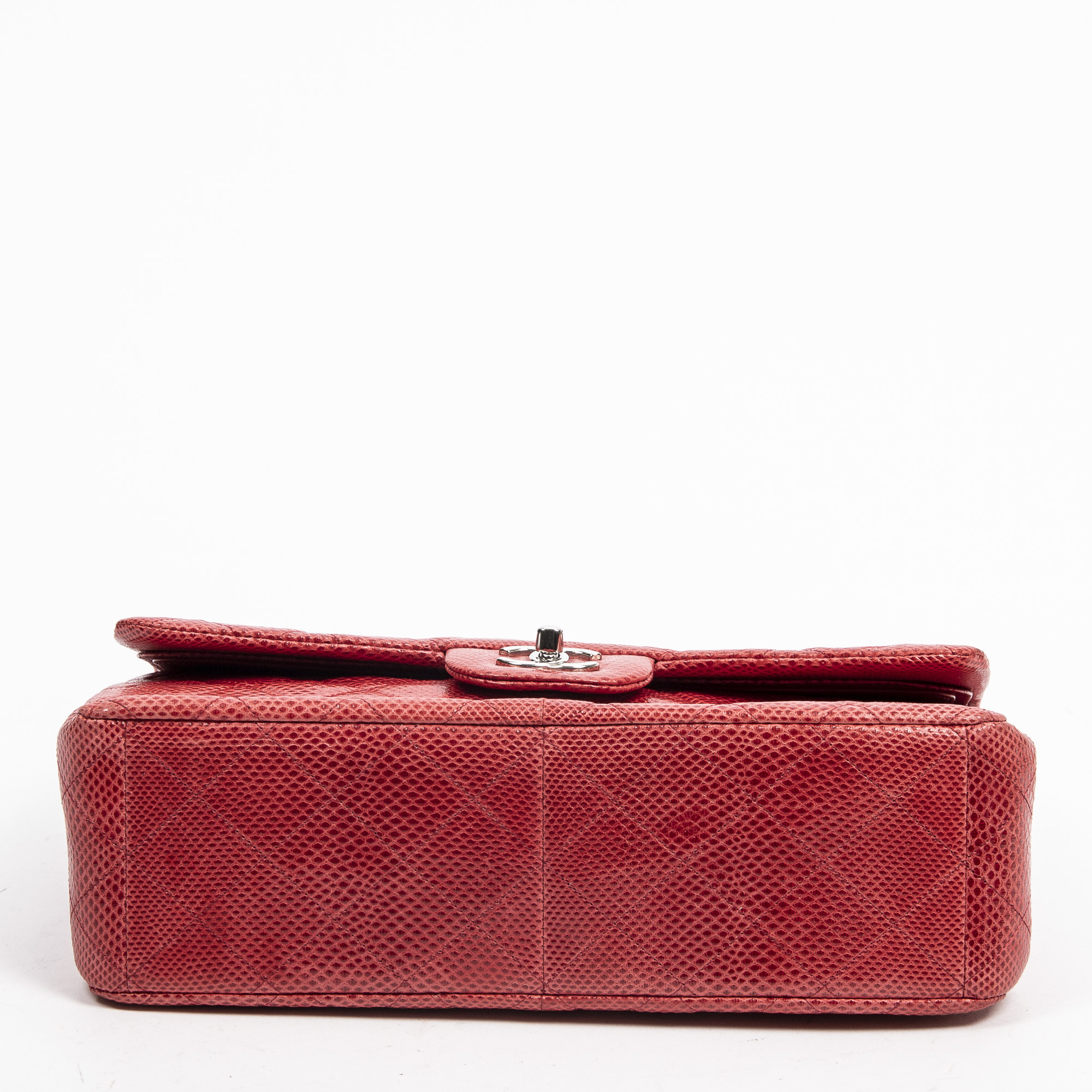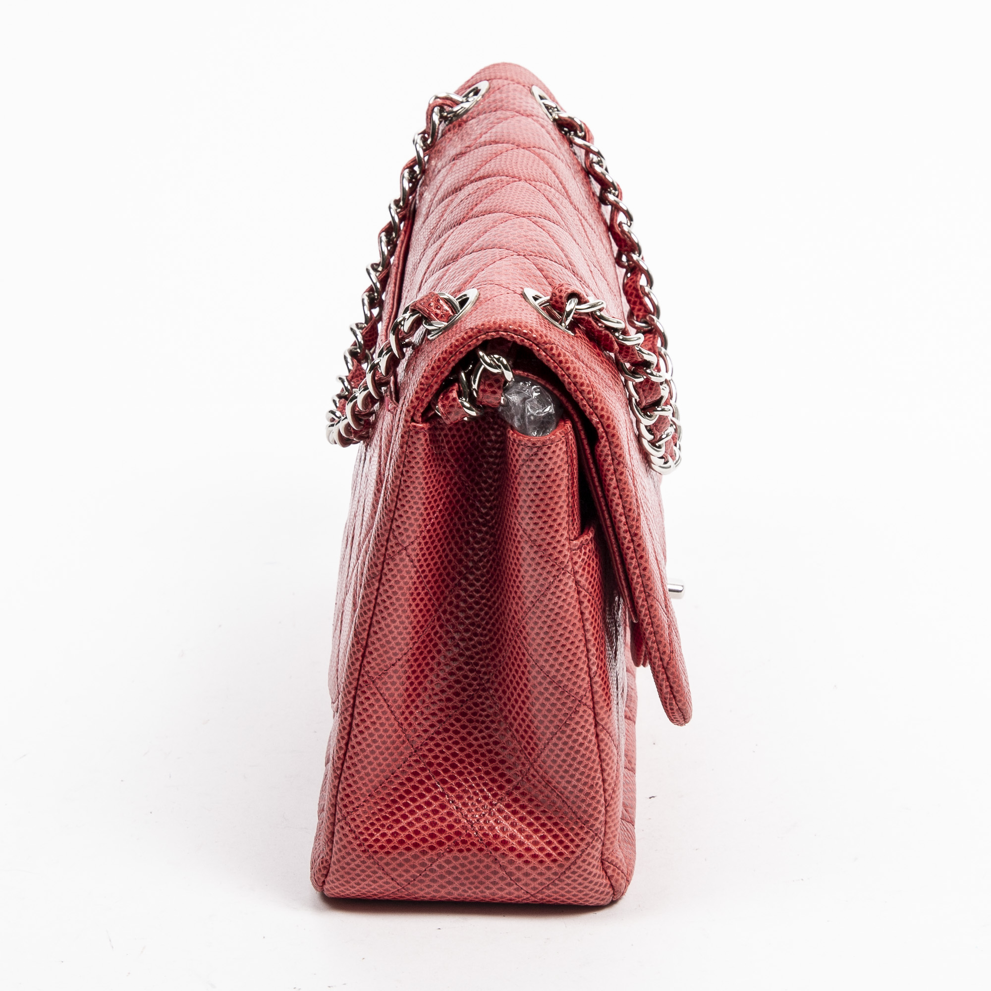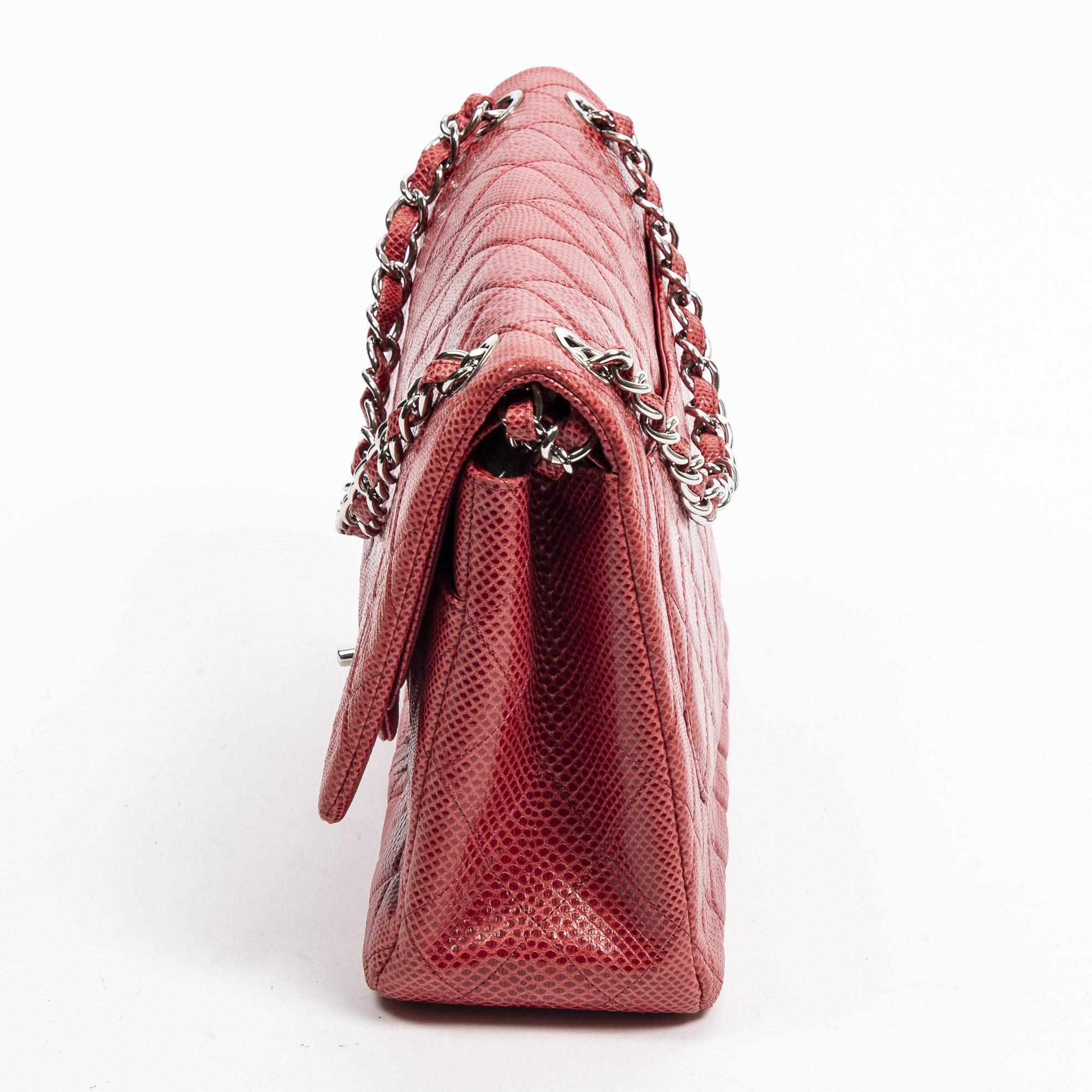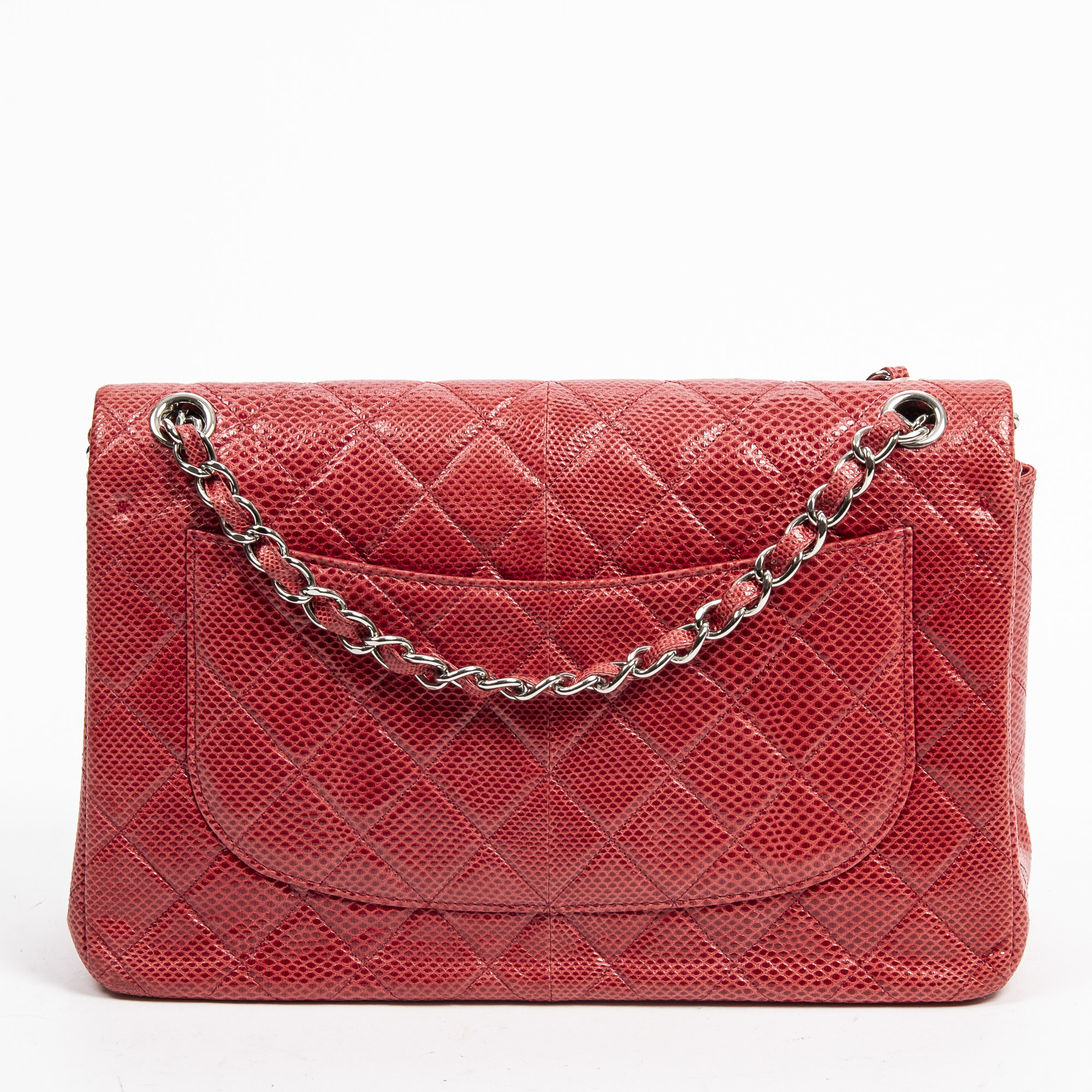 Chanel Shoulder Bag Ltd. Ed. Lizard Skin Jumbo Classic Double Flap in Red Quilted Lizard Embossed Leather and Silver hardware. The product is in Excellent Condition (A).