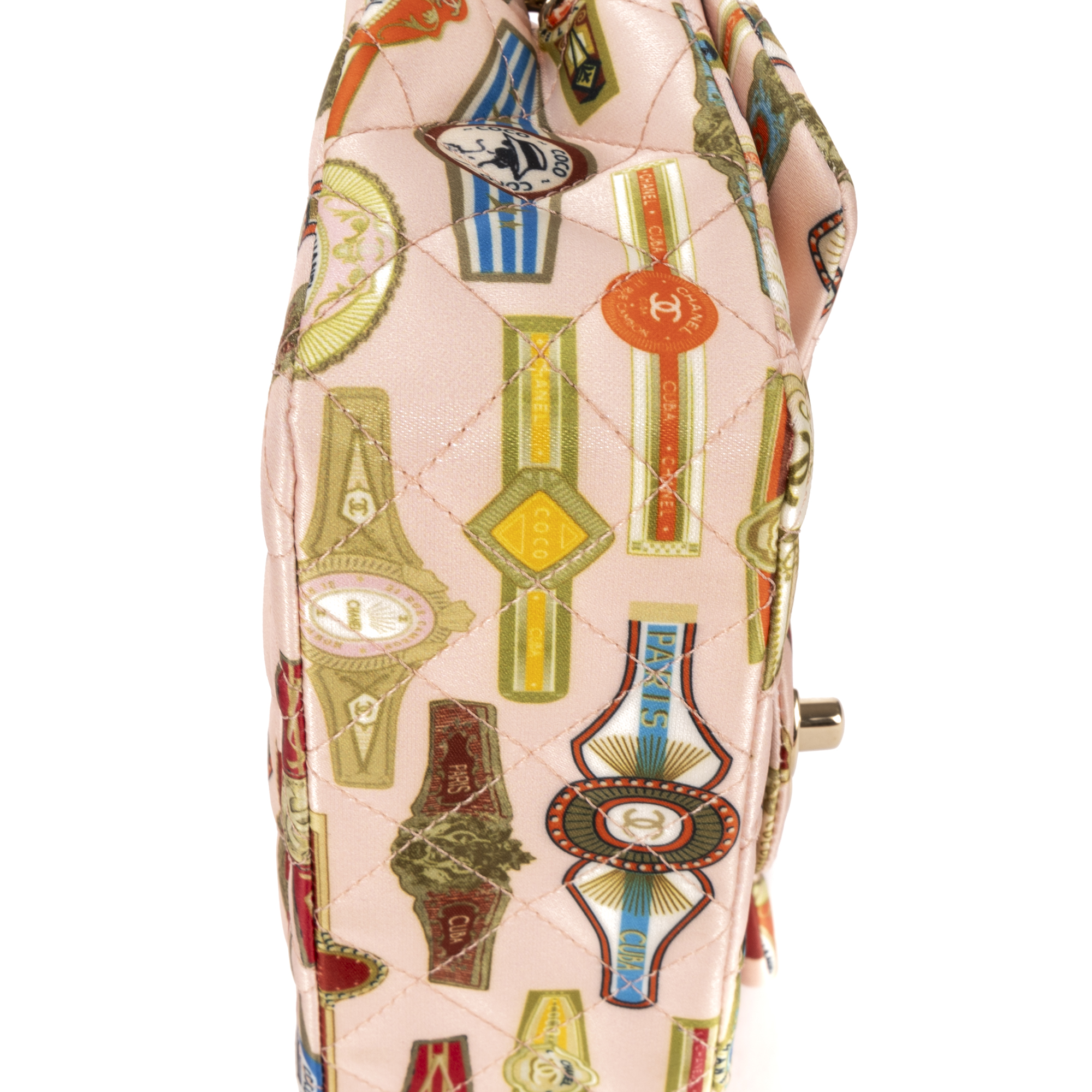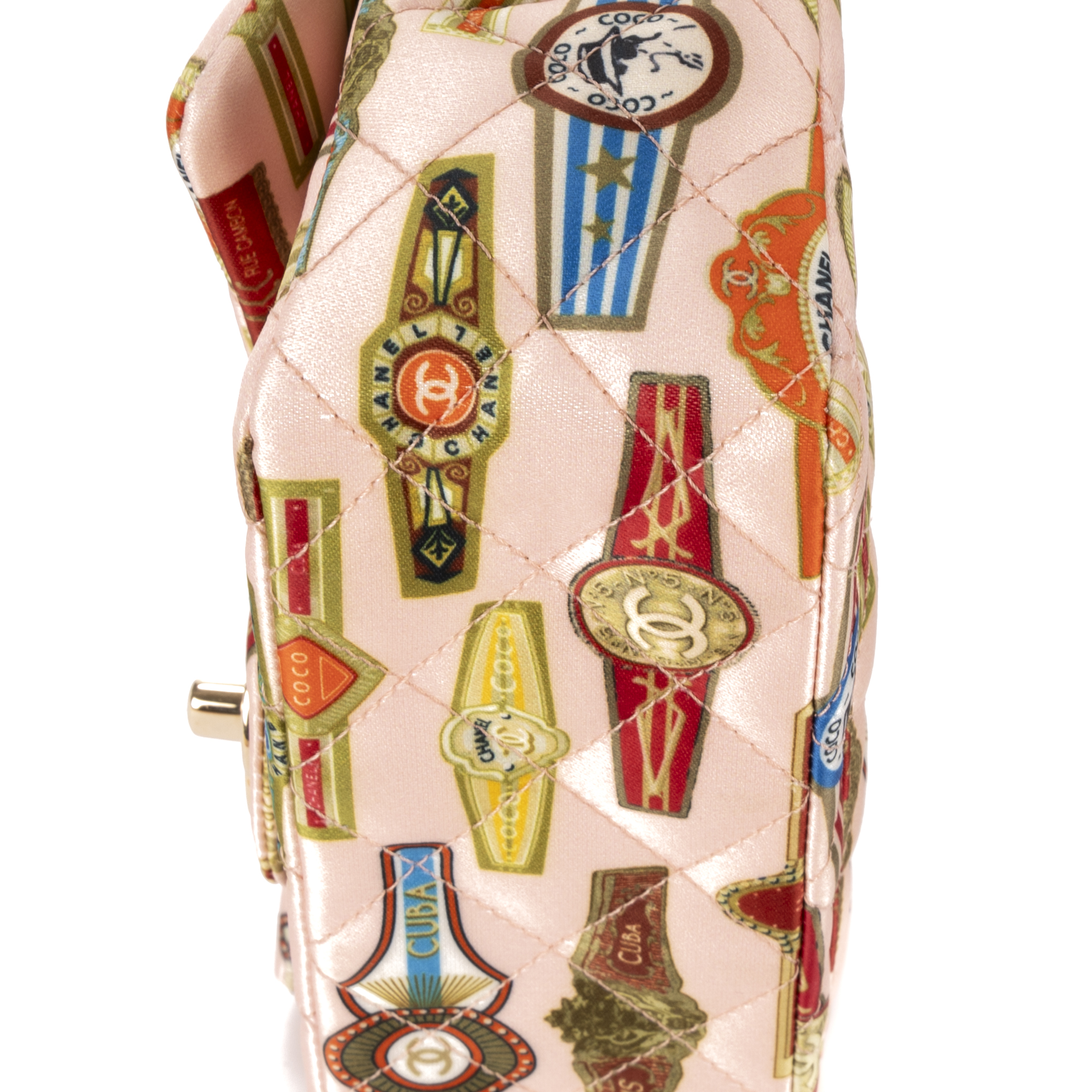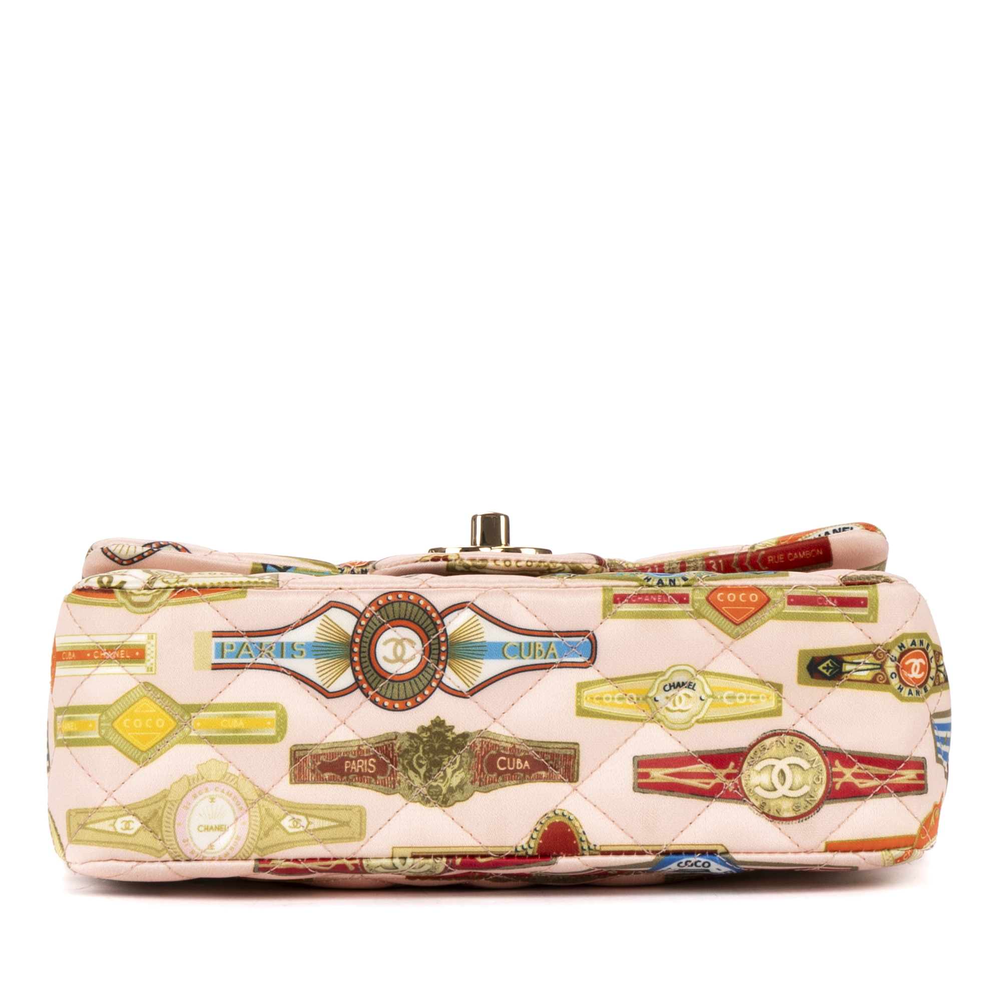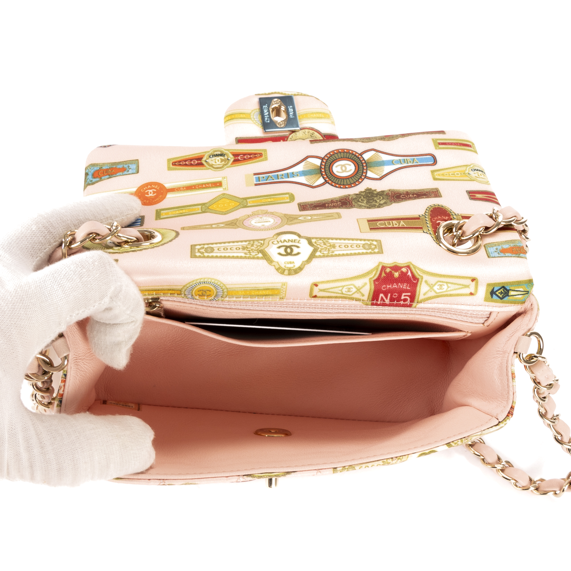 Chanel Shoulder Bag Ltd. Ed. Paris Cuba Cigar Label Printed Rectangular Mini Classic Flap in Pink/Gold Cigar Label Printed Quilted Satin Canvas and Gold hardware. The product is in Perfect Condition (AA).