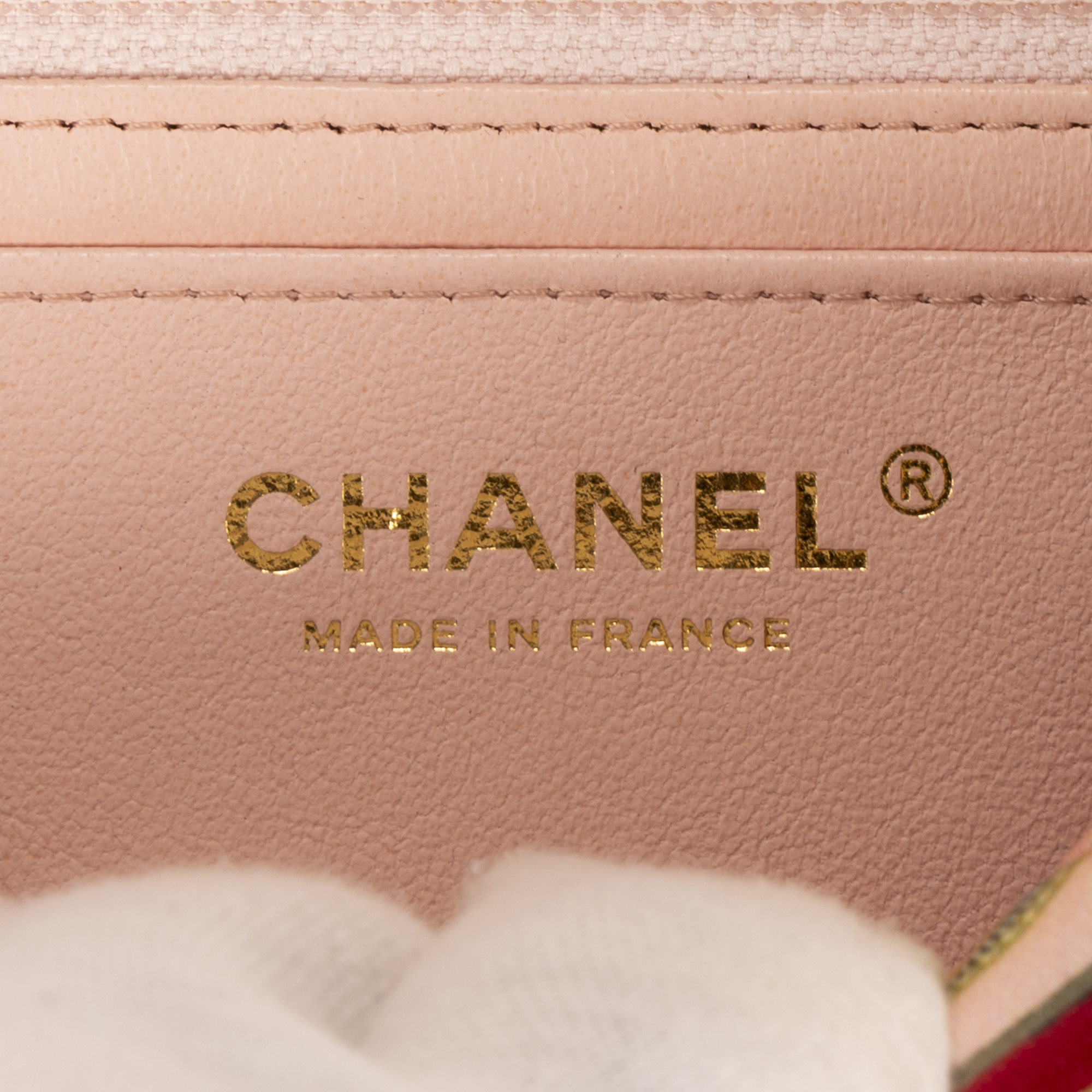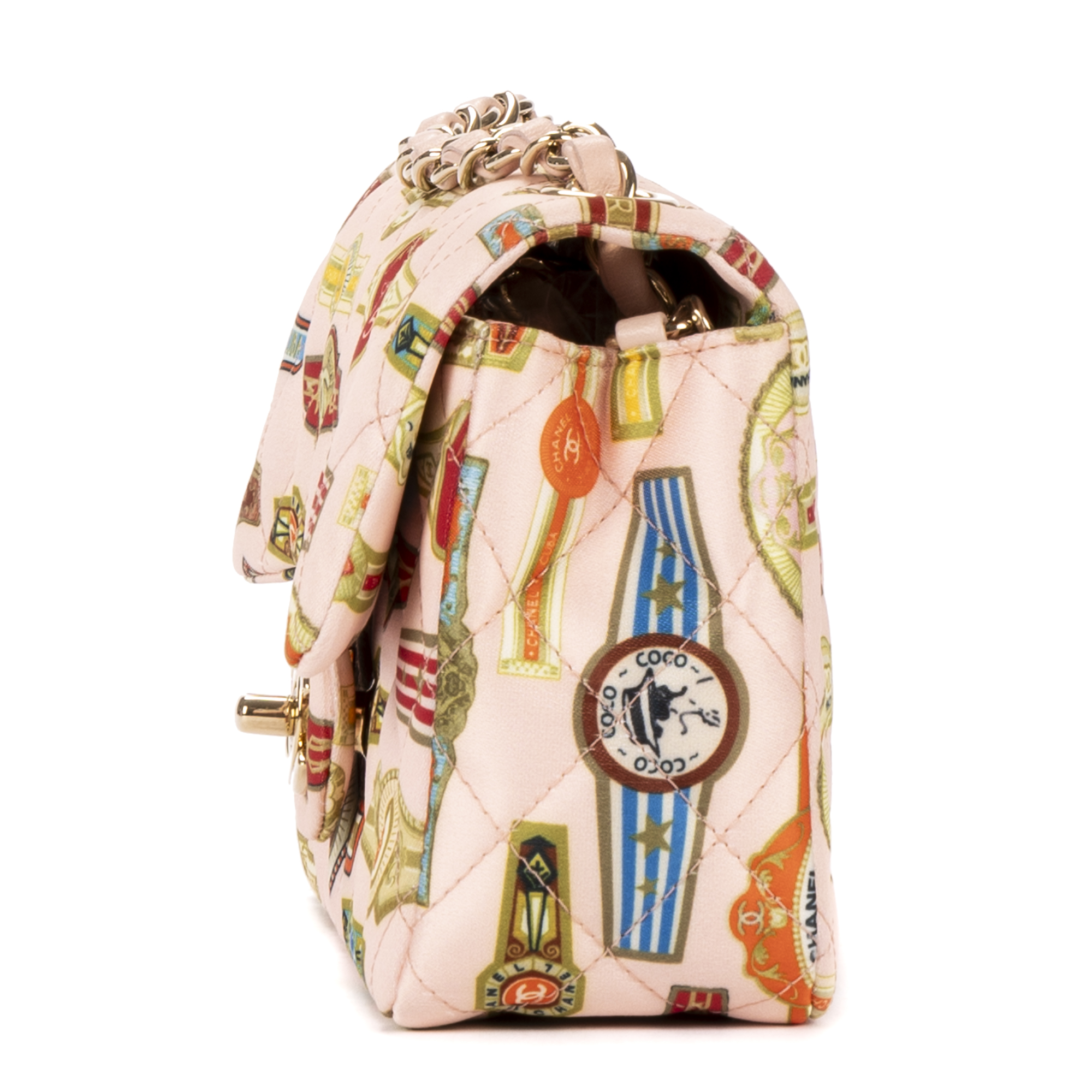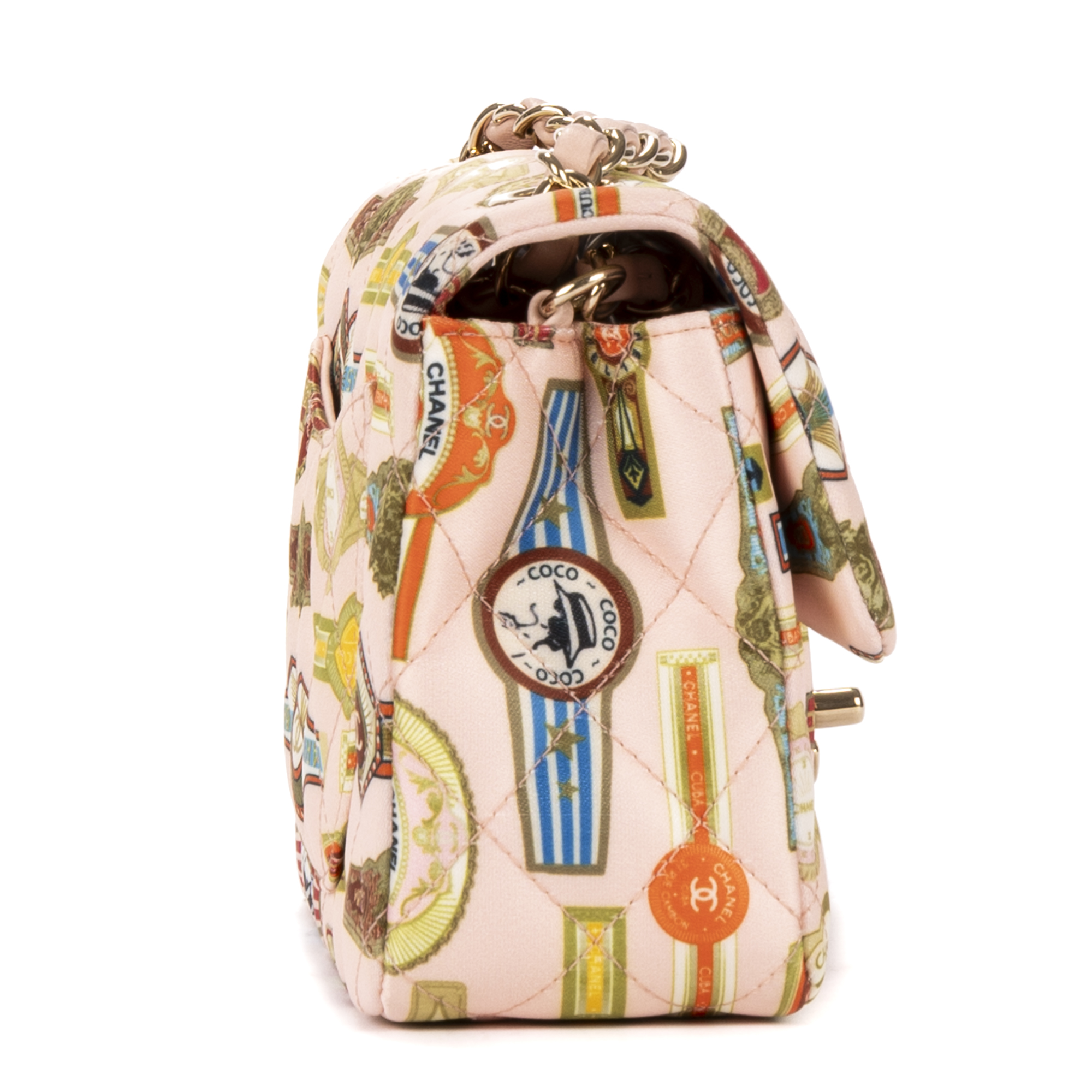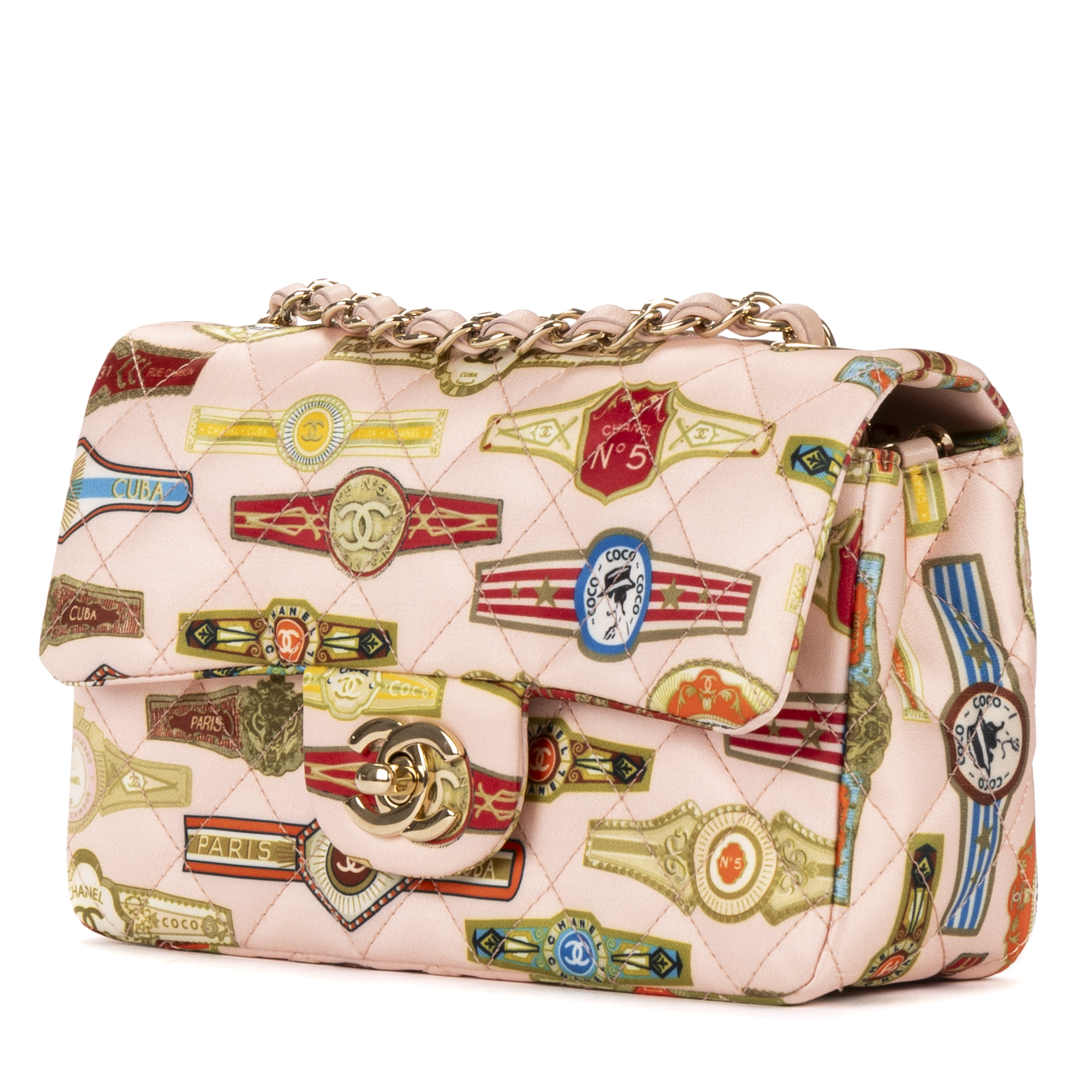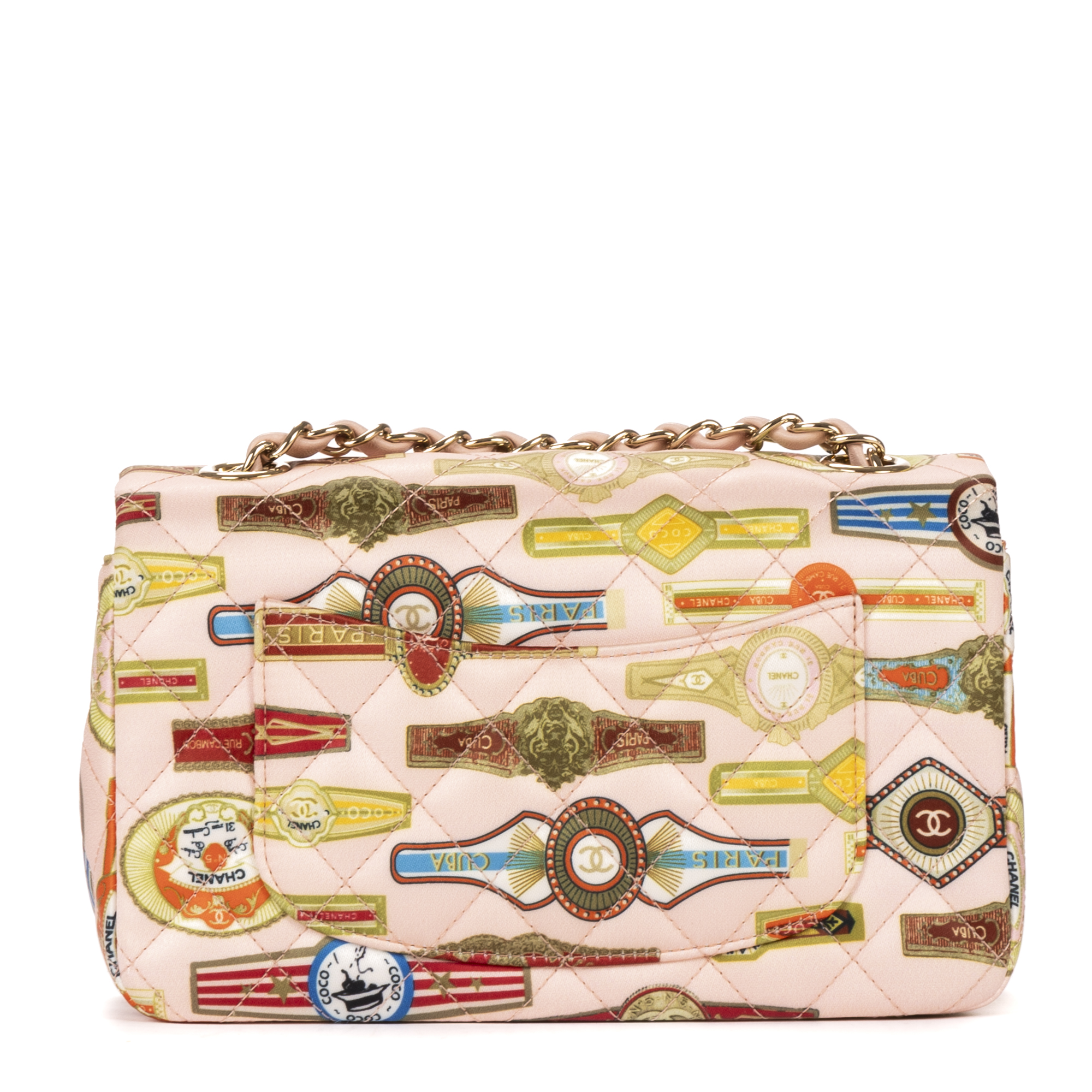 Chanel Shoulder Bag Ltd. Ed. Paris Cuba Cigar Label Printed Rectangular Mini Classic Flap in Pink/Gold Cigar Label Printed Quilted Satin Canvas and Gold hardware. The product is in Perfect Condition (AA).