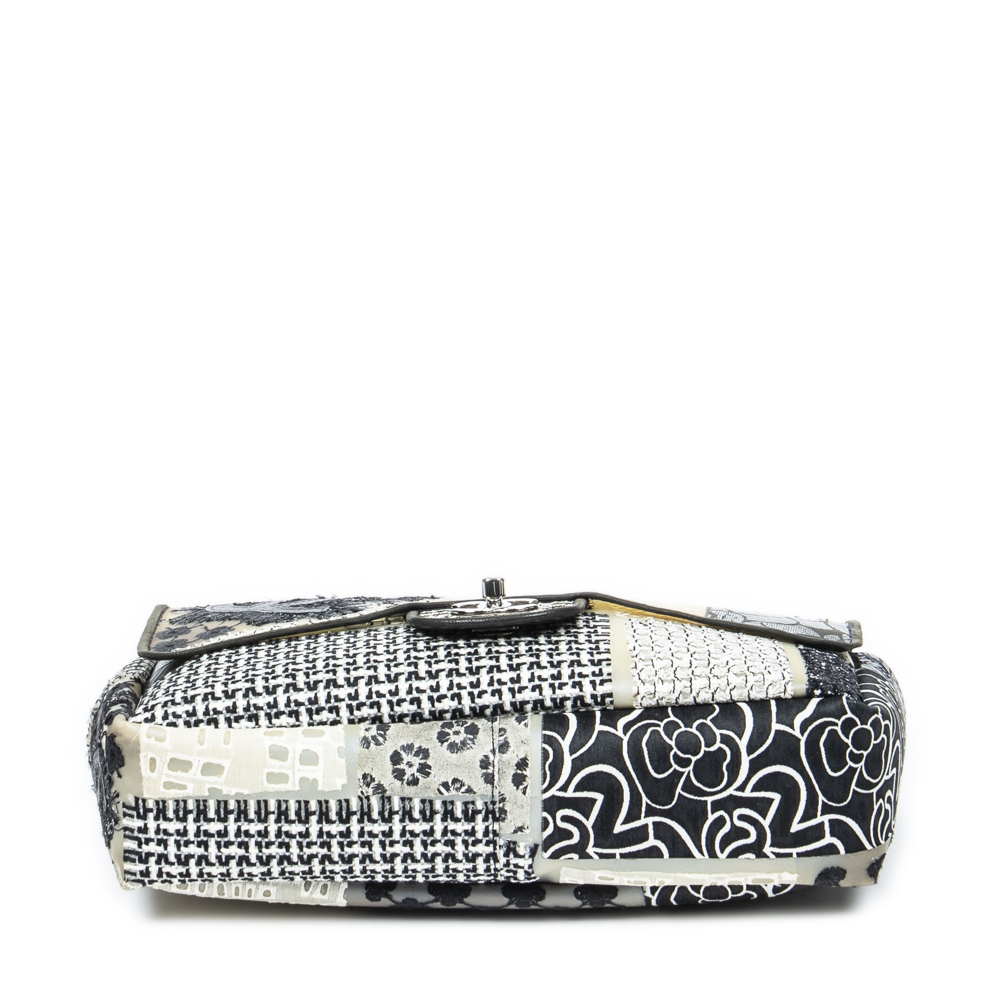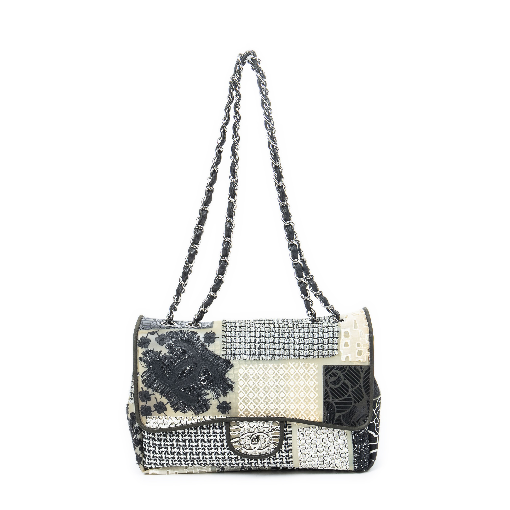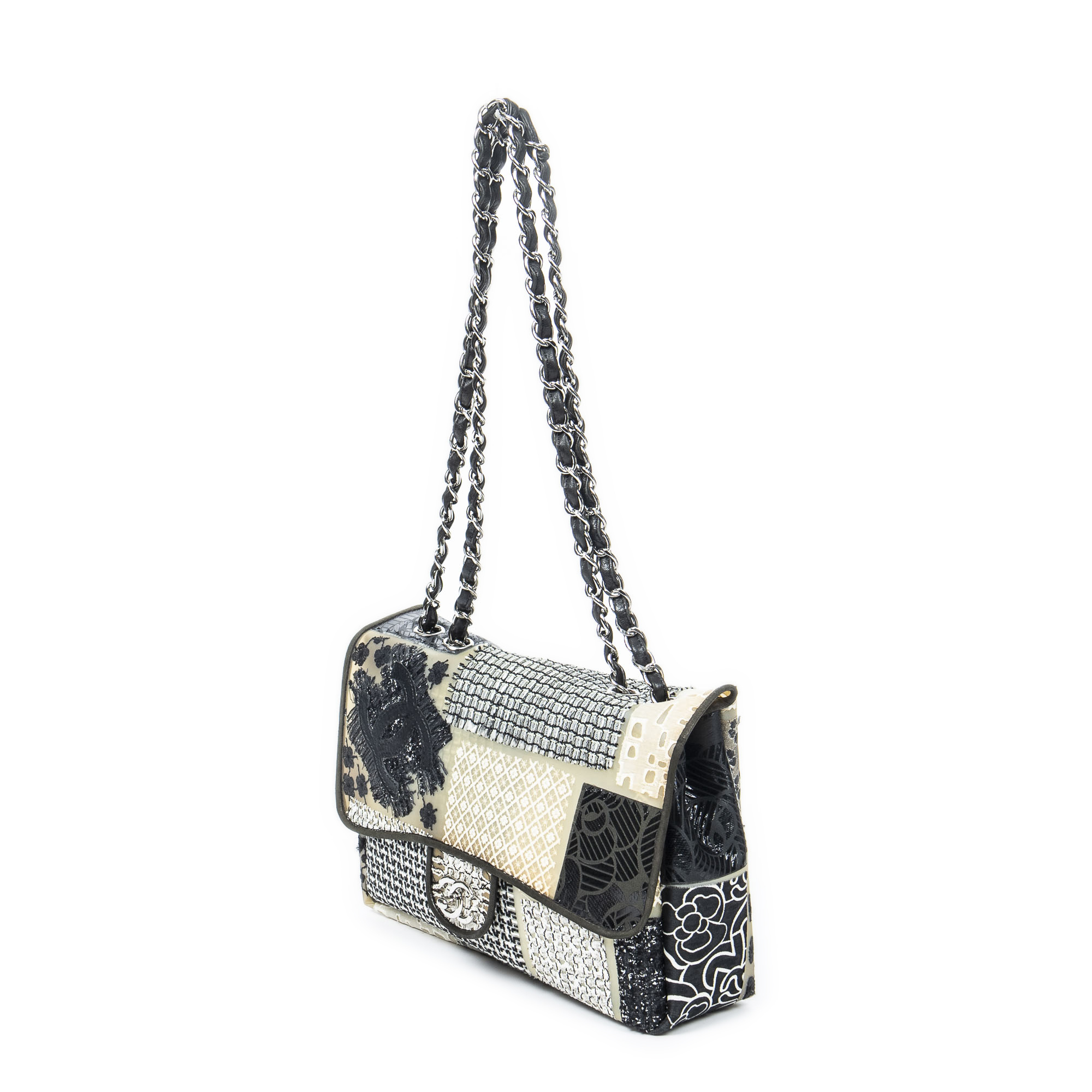 Chanel Shoulder Bag Ltd. Ed. Patchwork Jumbo Single Flap in Black/Beige/Ivory Patchwork Resin Canvas and Silver hardware. The product is in Excellent Condition (A).