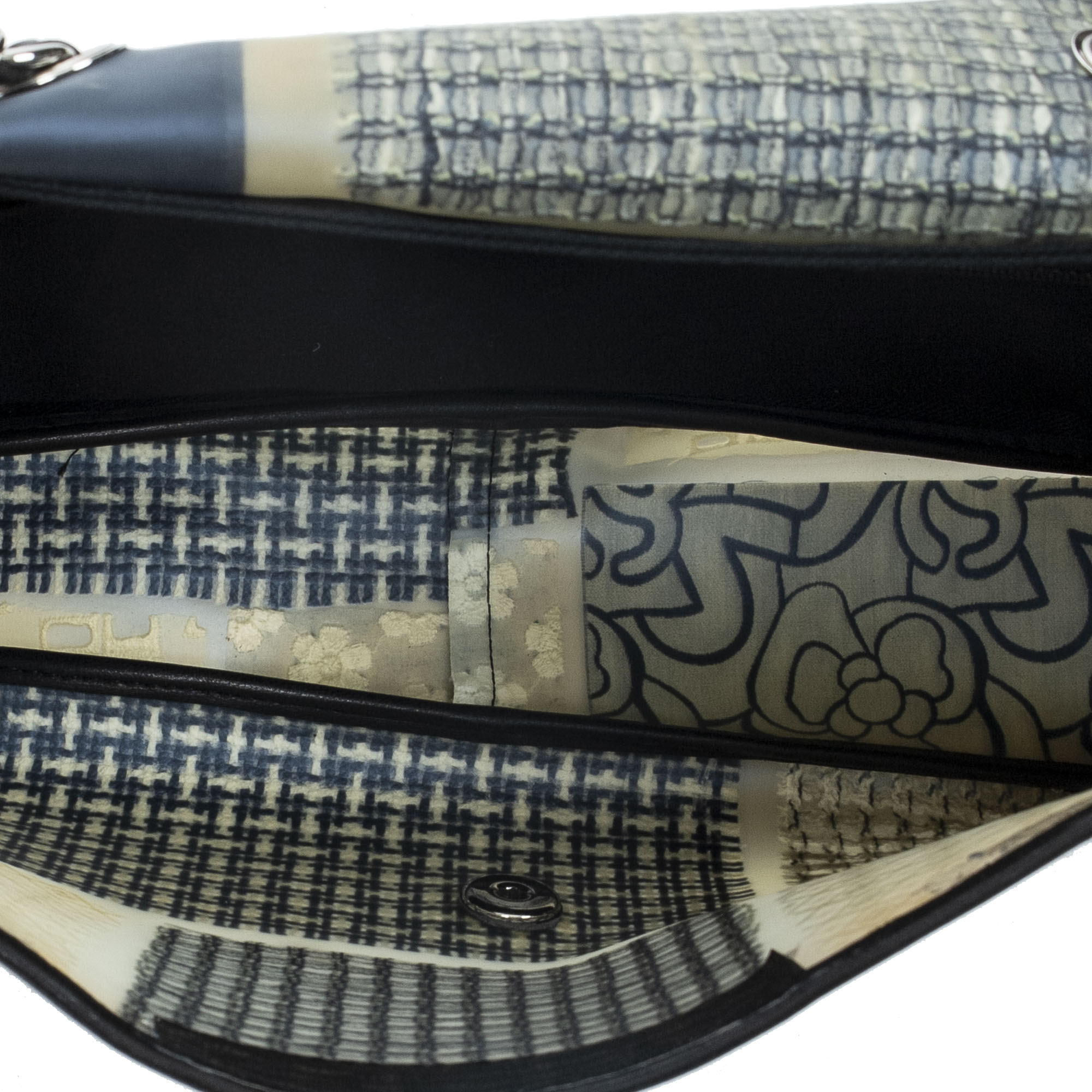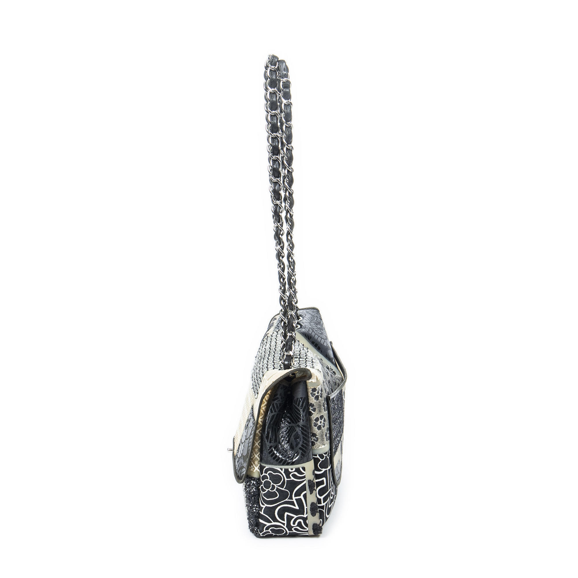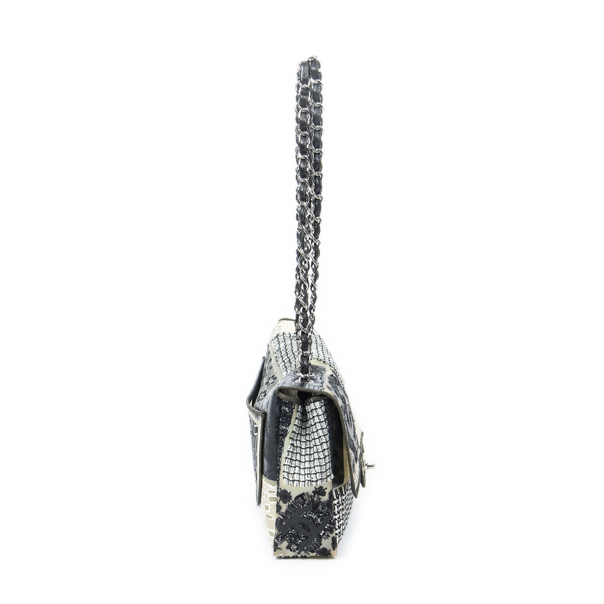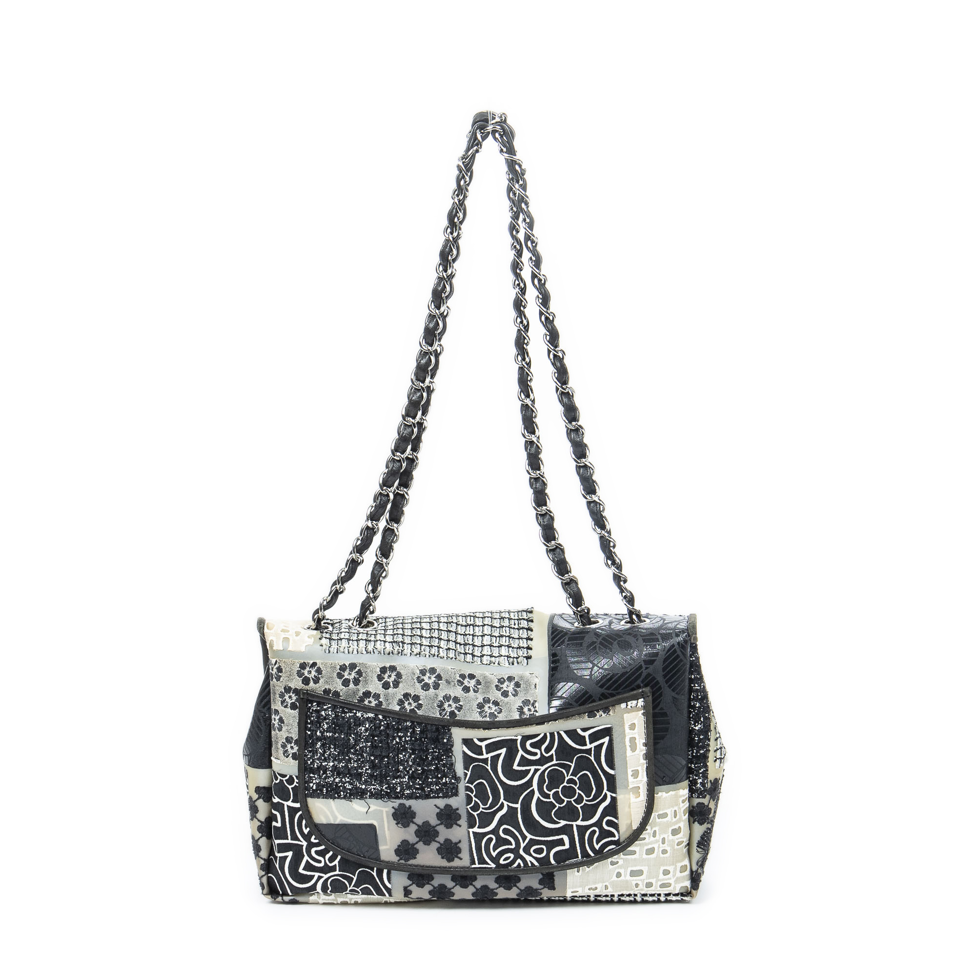 Chanel Shoulder Bag Ltd. Ed. Patchwork Jumbo Single Flap in Black/Beige/Ivory Patchwork Resin Canvas and Silver hardware. The product is in Excellent Condition (A).