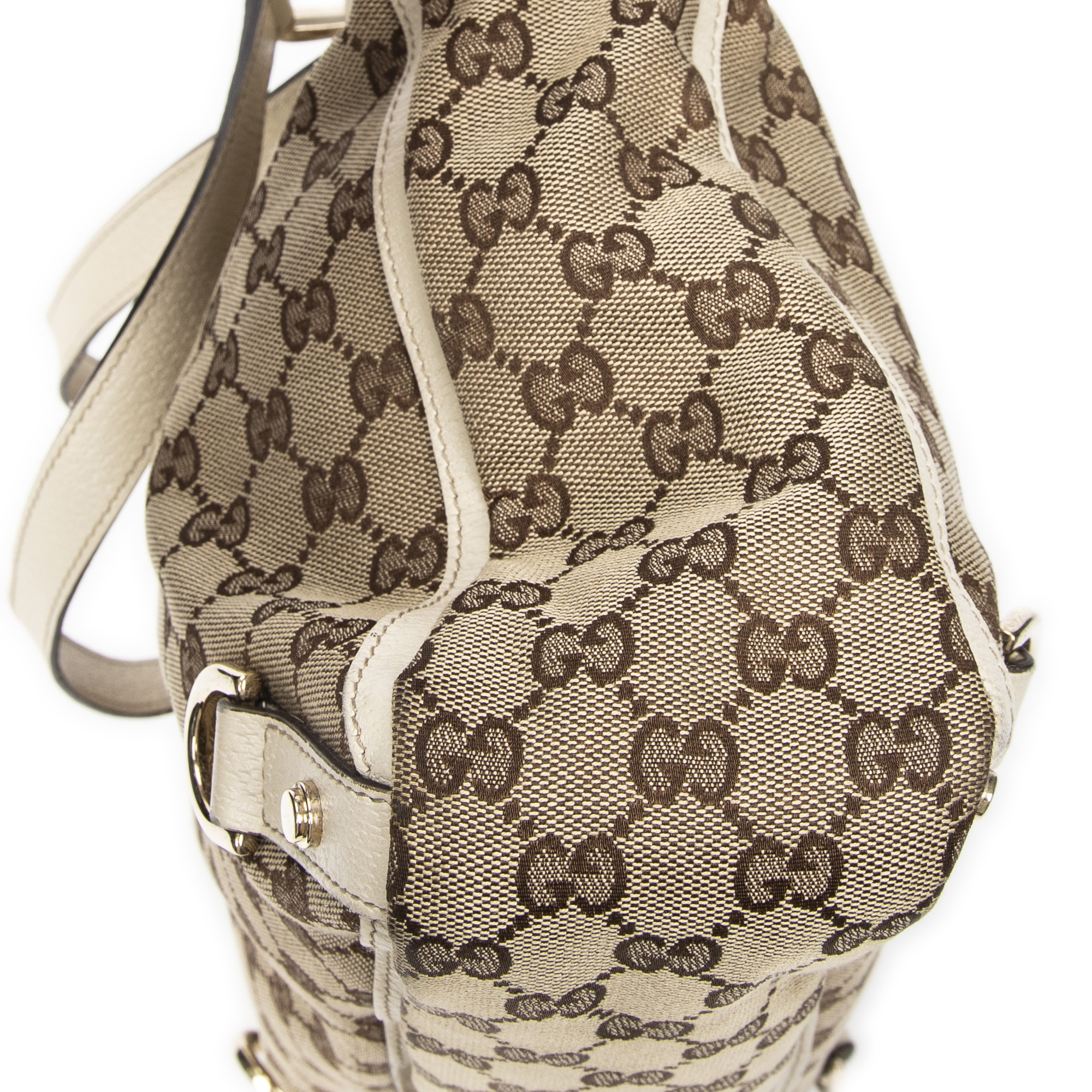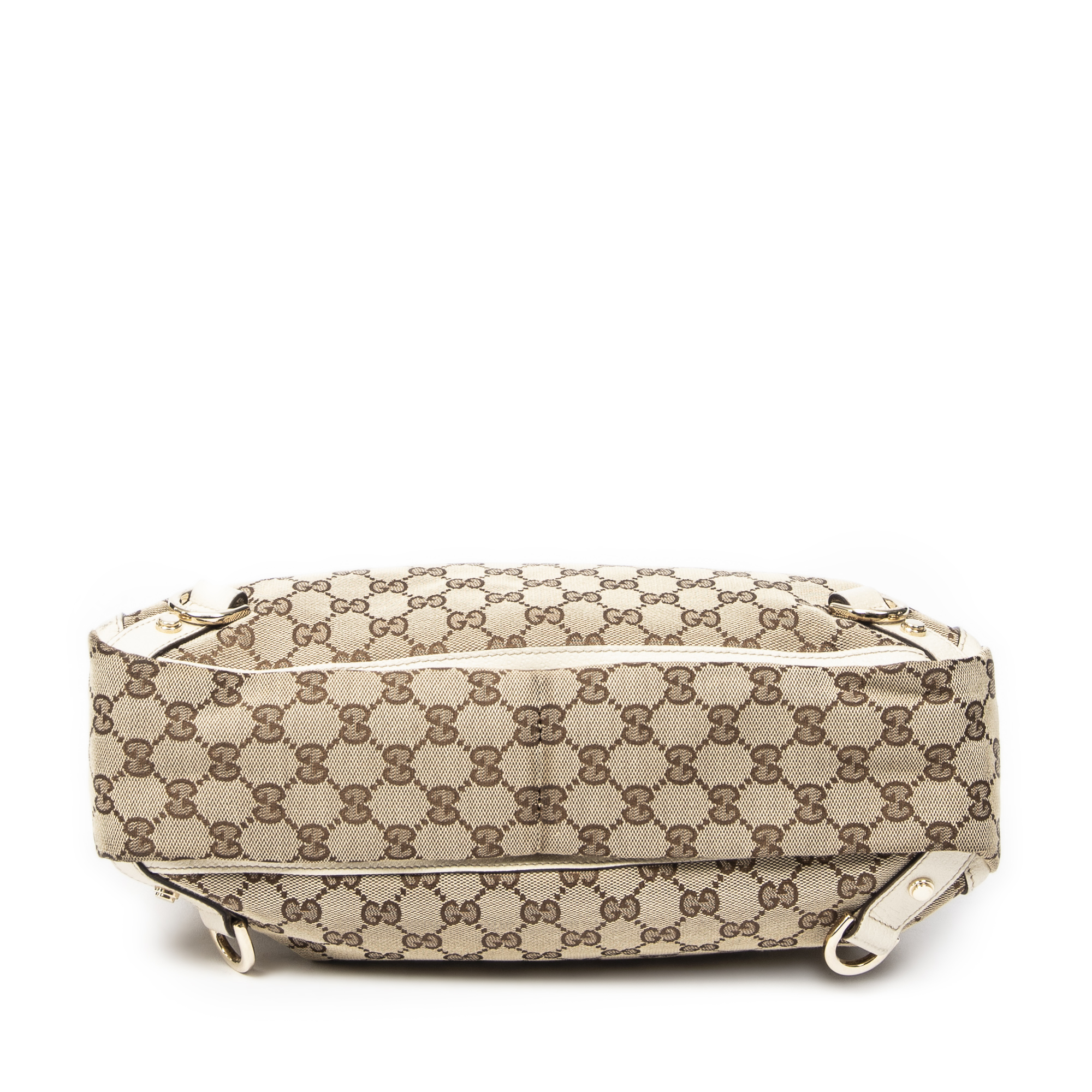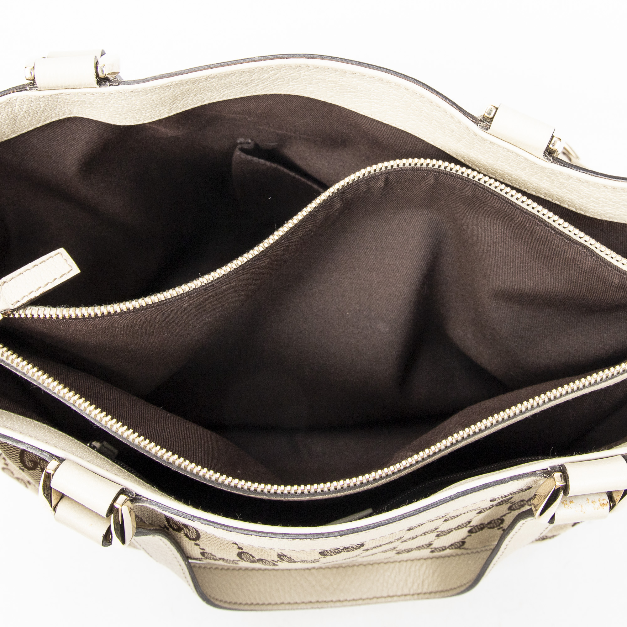 Gucci Shoulder Bag Medium Abbey D-Ring Tote in Beige/Ivory Monogrammed Canvas and Gold hardware. The product is in Very Good Condition (AB).